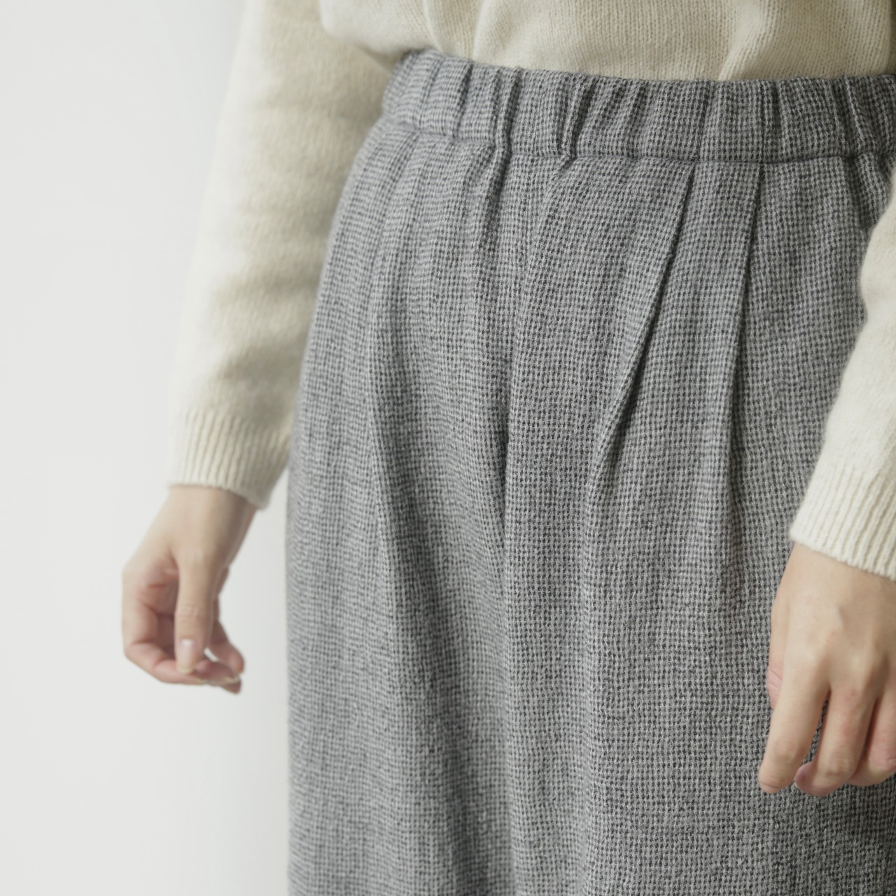 縦横3色の糸を合わせて織り上げたウール生地は、起毛がかかり、ふわりと柔らかな風合いに。細かな凹凸が浮かぶように現れ、千鳥格子のような奥行きのある表情を見せてくれます。冬の光の中で見るその質感は、見た目からしてあたたかく、触れるとほっとするやさしさがあります。