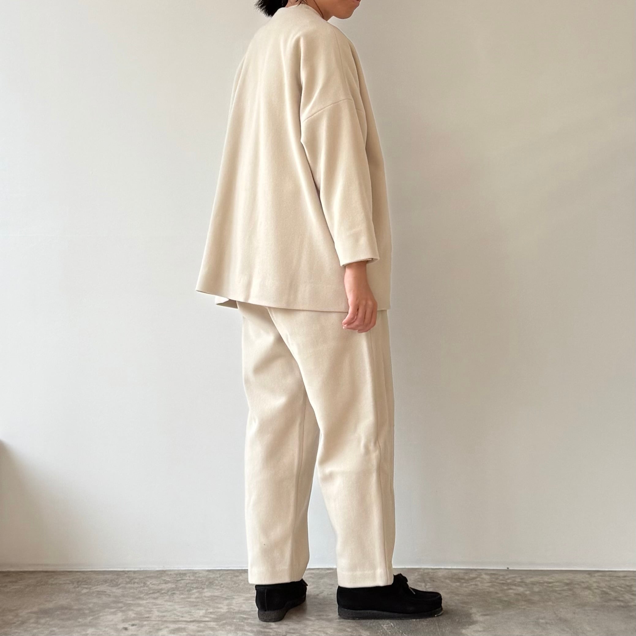 冬のアウターとして愛され続けるメルトン生地。特にウール100%で仕立てた生地は、ふんわりと柔らかく、まるでブランケットのように身体を包み込んでくれます。風を通しにくく、保温性が高く、それでいて重さを感じさせない軽やかさ。フェルトのように毛羽が整った、しっとりと艶のある表面もメルトンならではの美しさです。