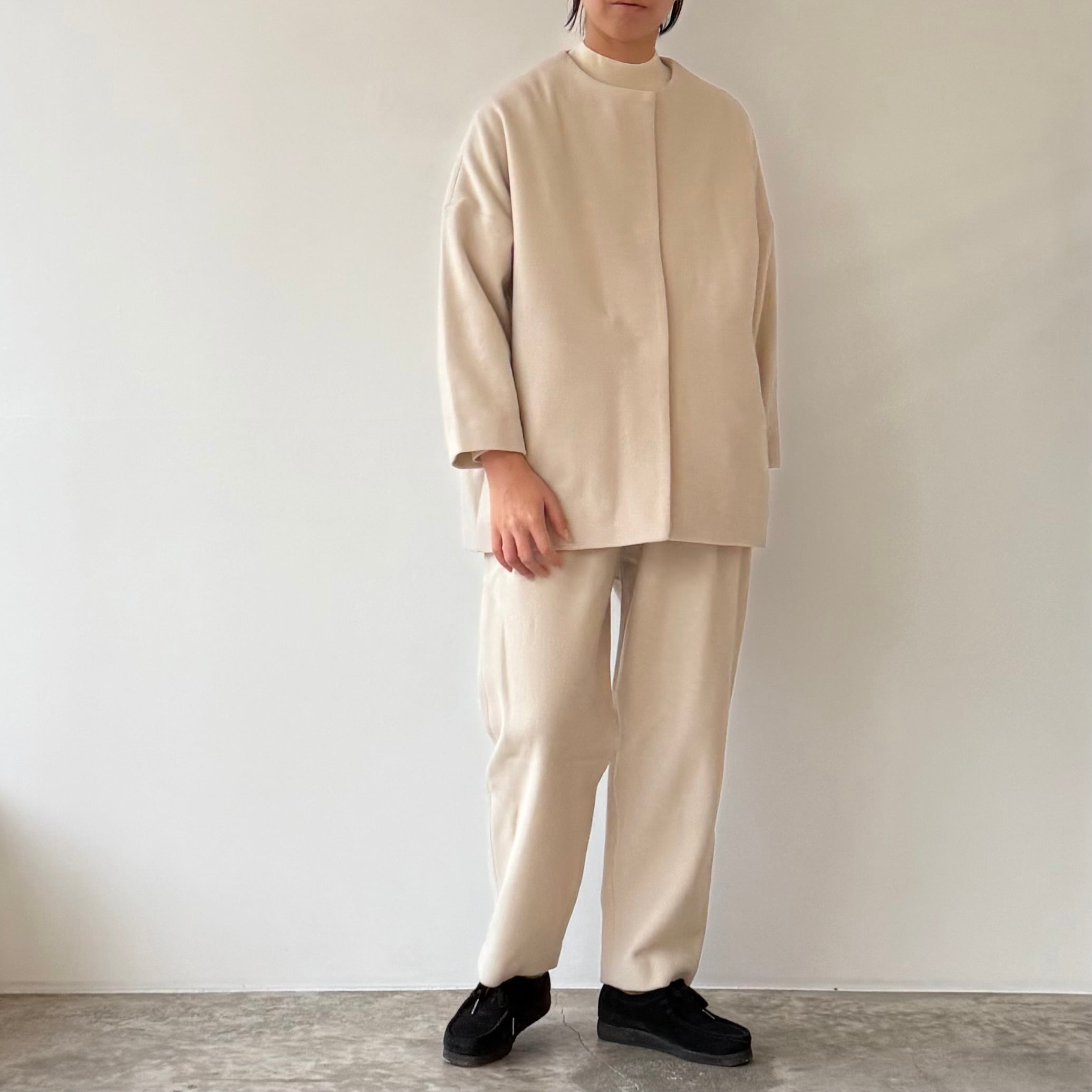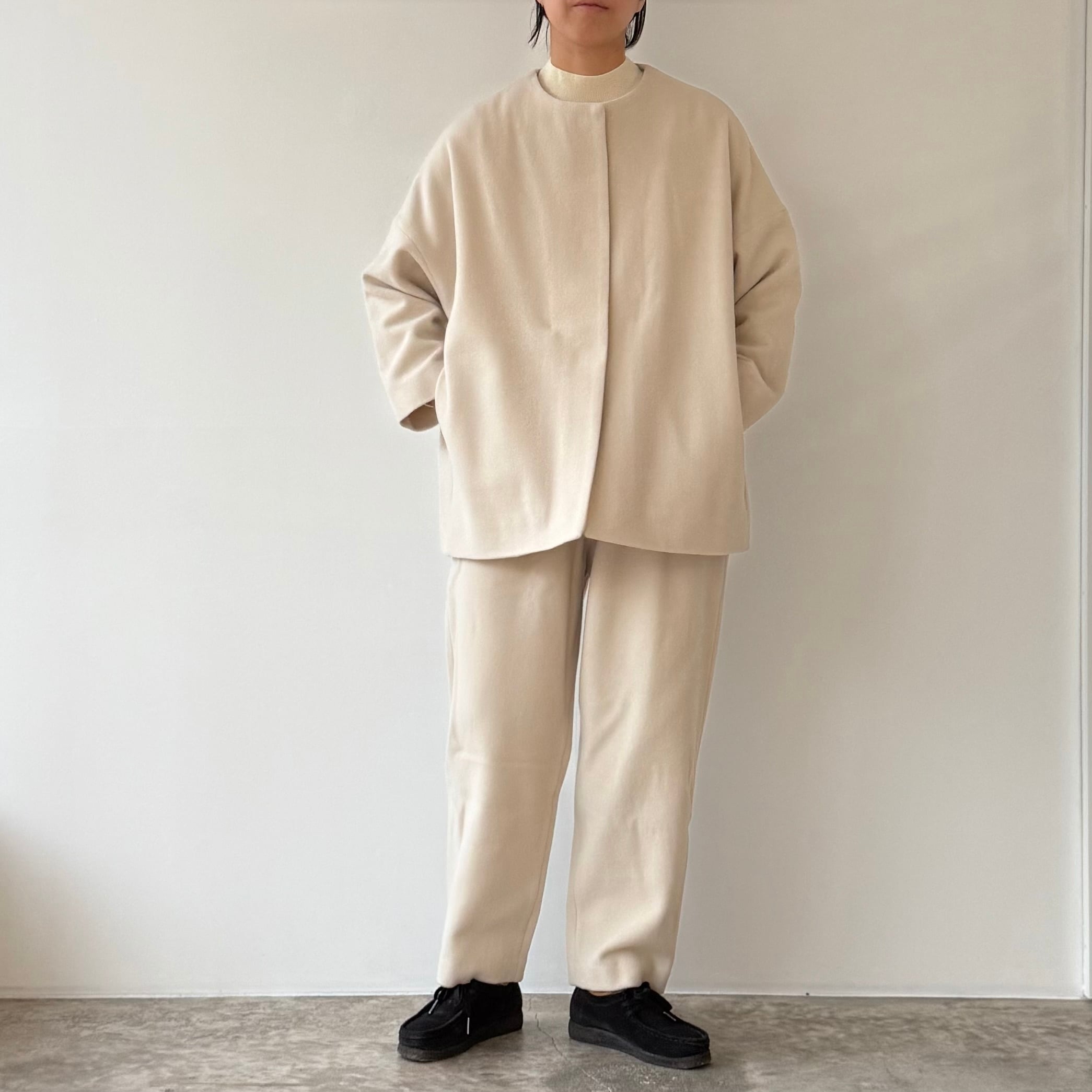 このショートコートは、そんな素材の魅力をそのまま感じられる一枚。裏地をつけずに生地の柔らかさを活かし、少し丸みのある優しいシルエットに仕上げられています。着た瞬間に“生地の良さがそのまま形になった”という、安心とぬくもりが広がります。動きやすいショート丈は車移動の多い方にも嬉しいつくり。寒さの厳しい日には、インナーダウンを忍ばせてももたつかず、しっかり温かく過ごせます。