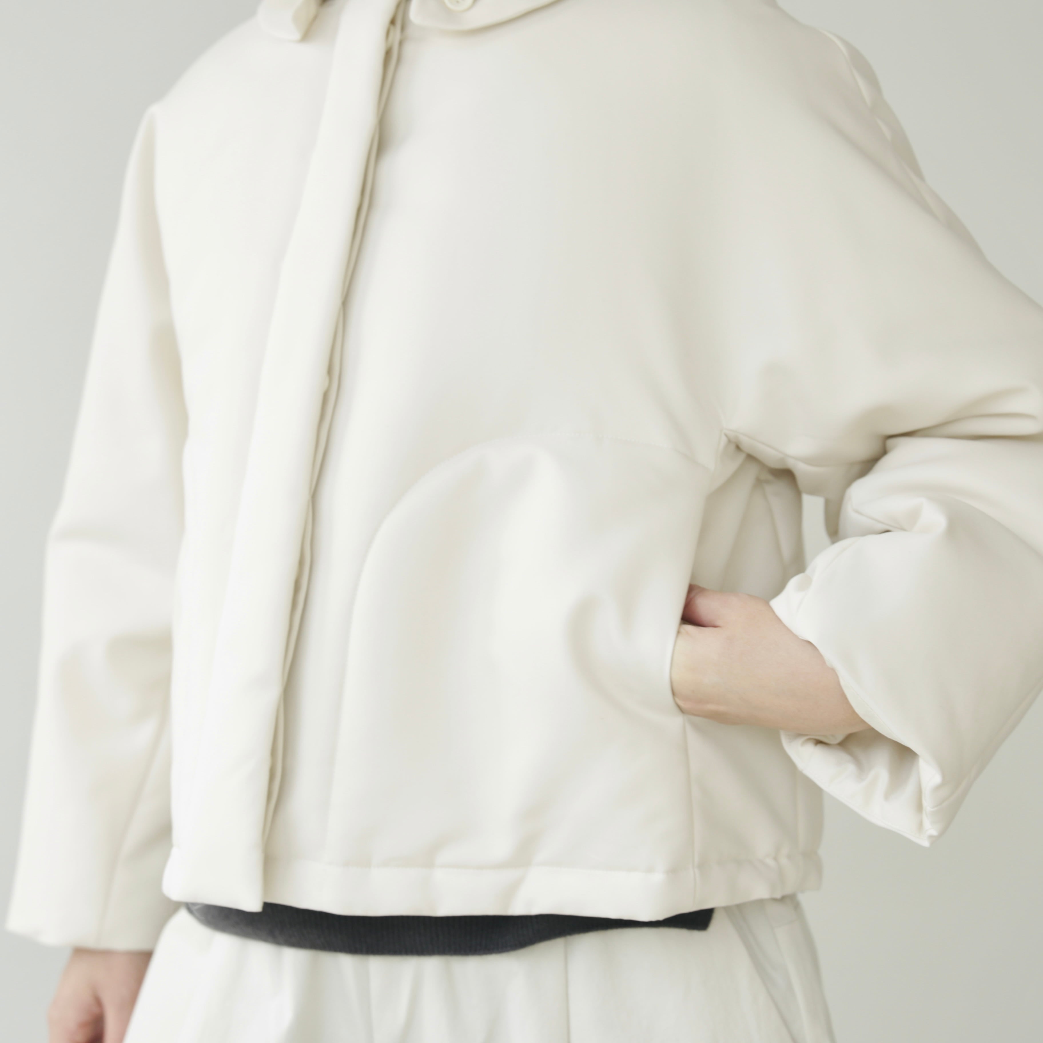 丈も短めとなっているのでワンピースやボリュームのあるボトムスと合わせやすすく、光沢もあるので品のよい装いになります。