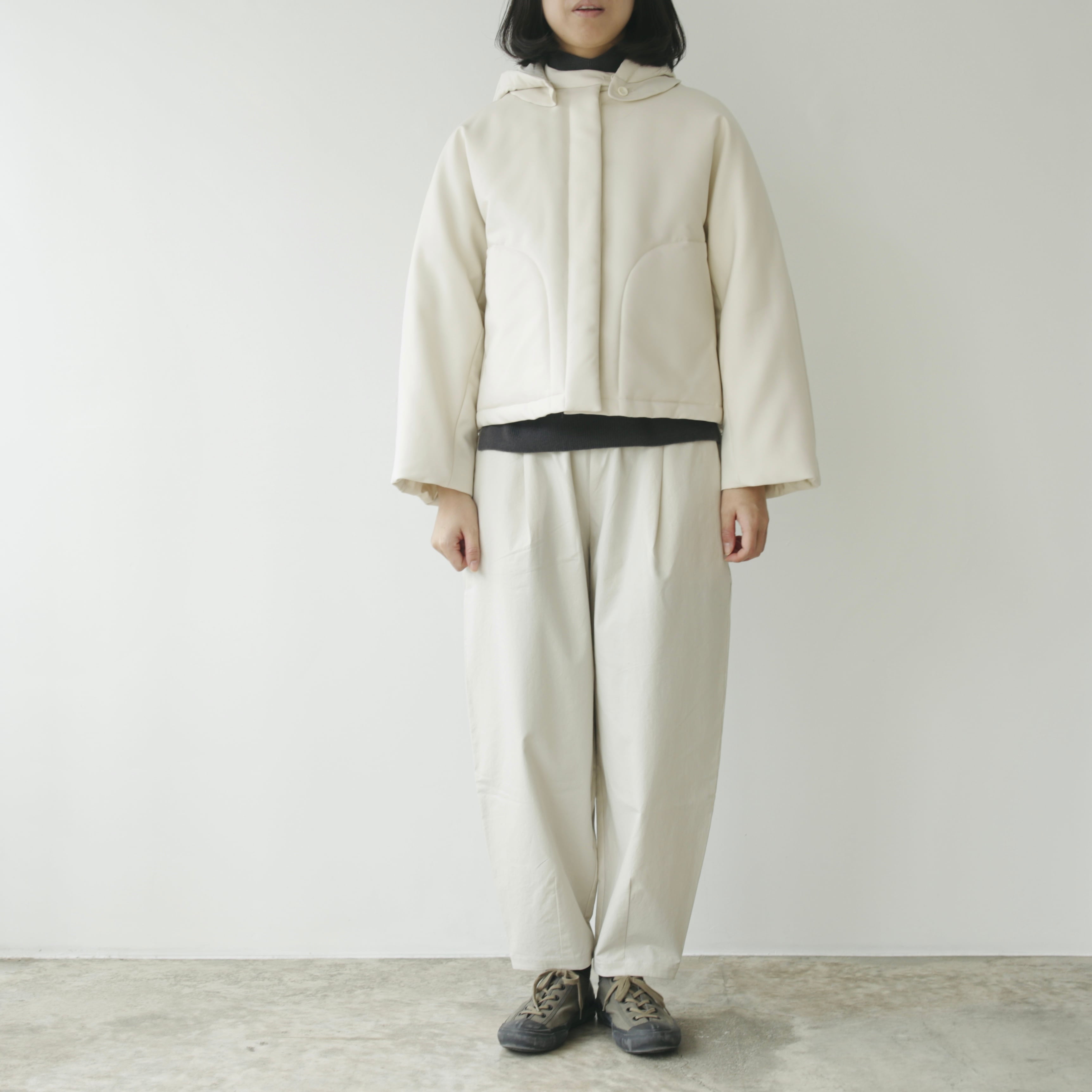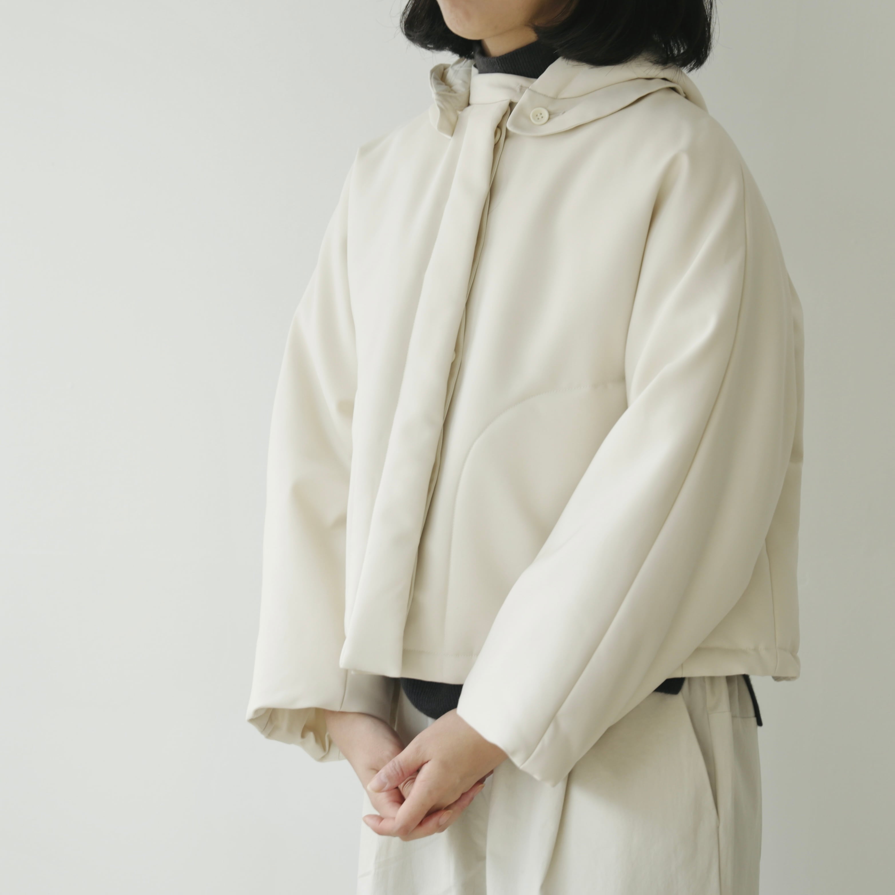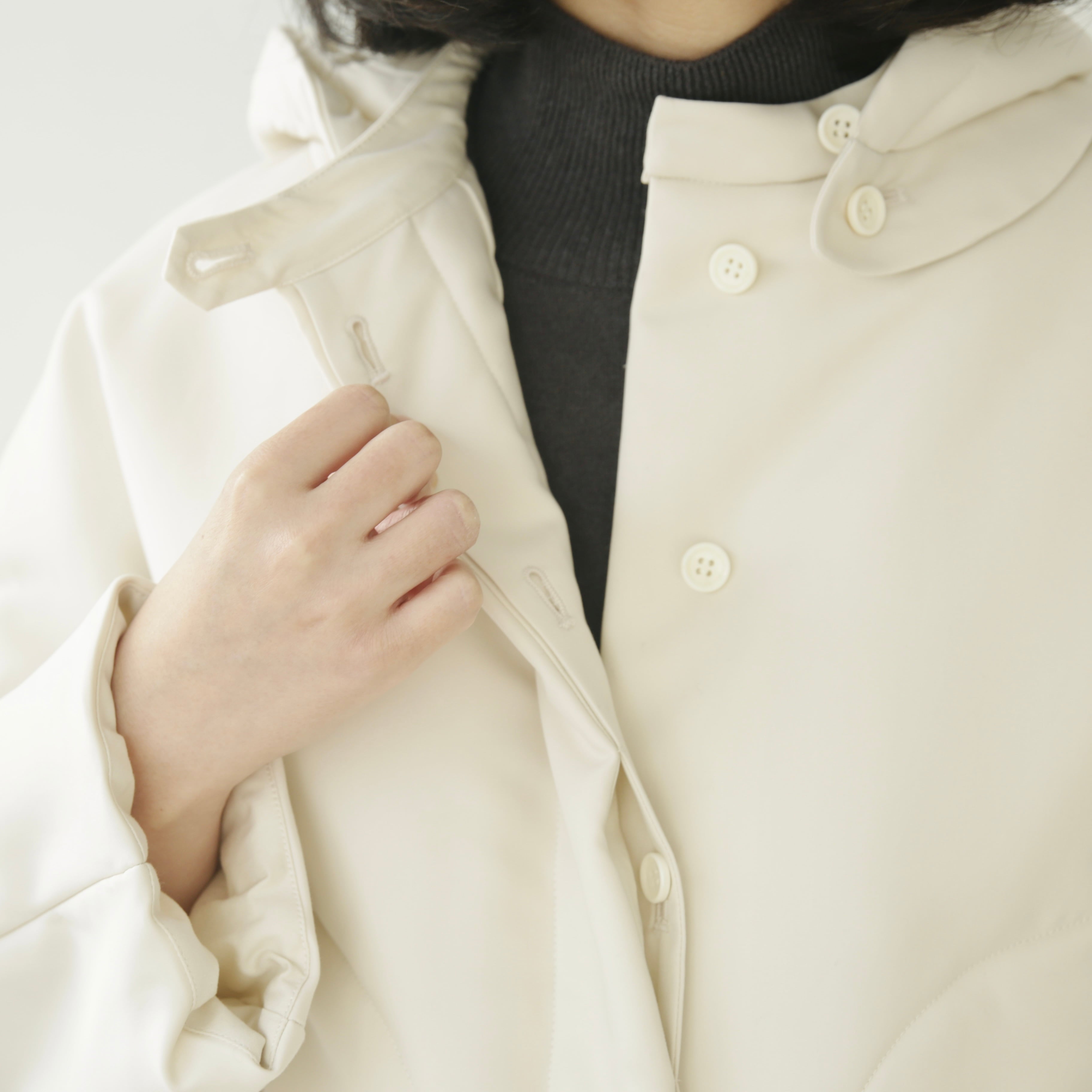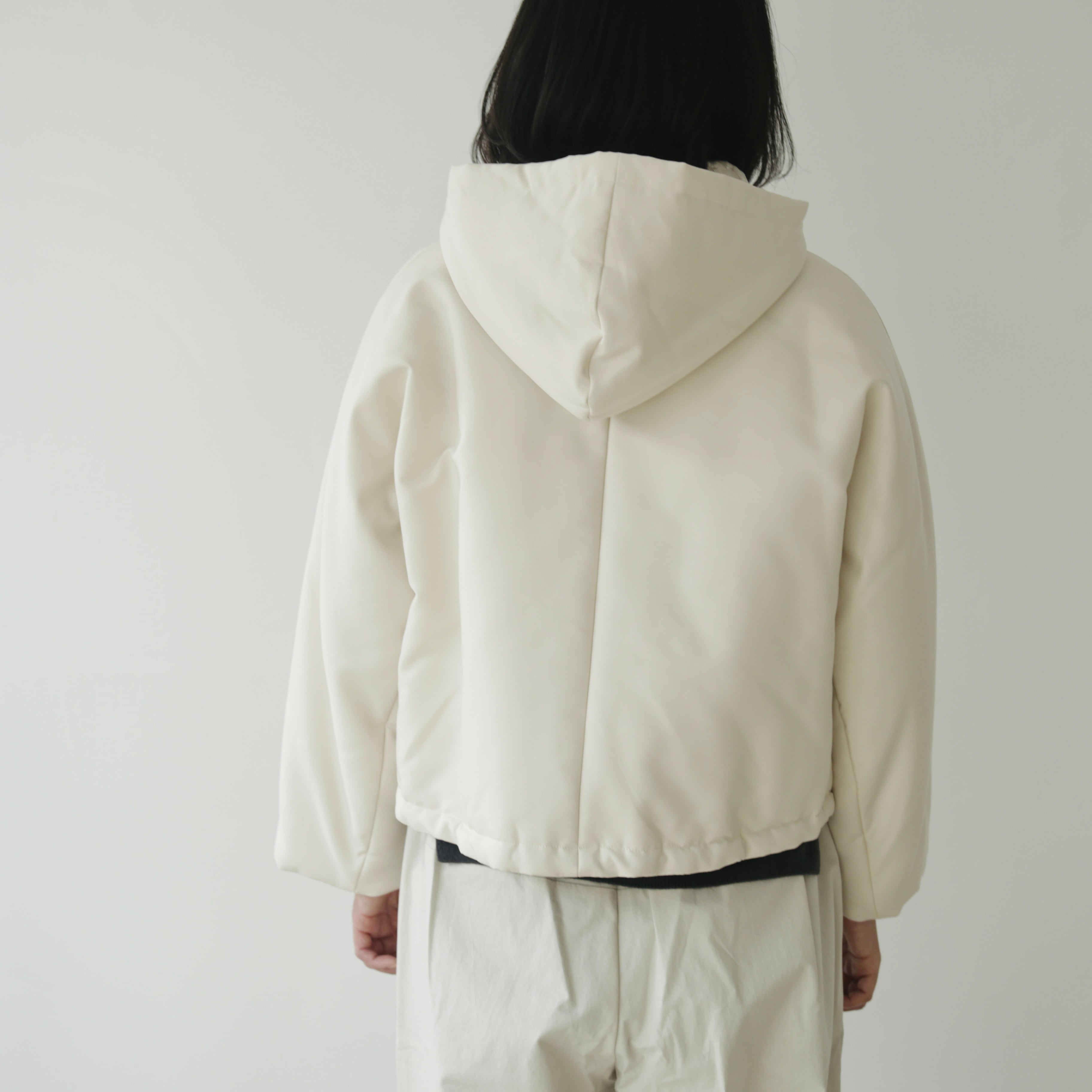 フードは取り外しが可能な仕様となっています。取り外しても残るボタンが良いアクセントとなっておりますが、立体的なフードの形がとてもきれいなので付けたまま着用して頂くのもオススメ。その日の気分や合わせるものによってアレンジを愉しめます。裾内側にコードがついているので着丈やシルエットも変えることが可能です。絞って頂くと丸みのあるより可愛らしいシルエットに。