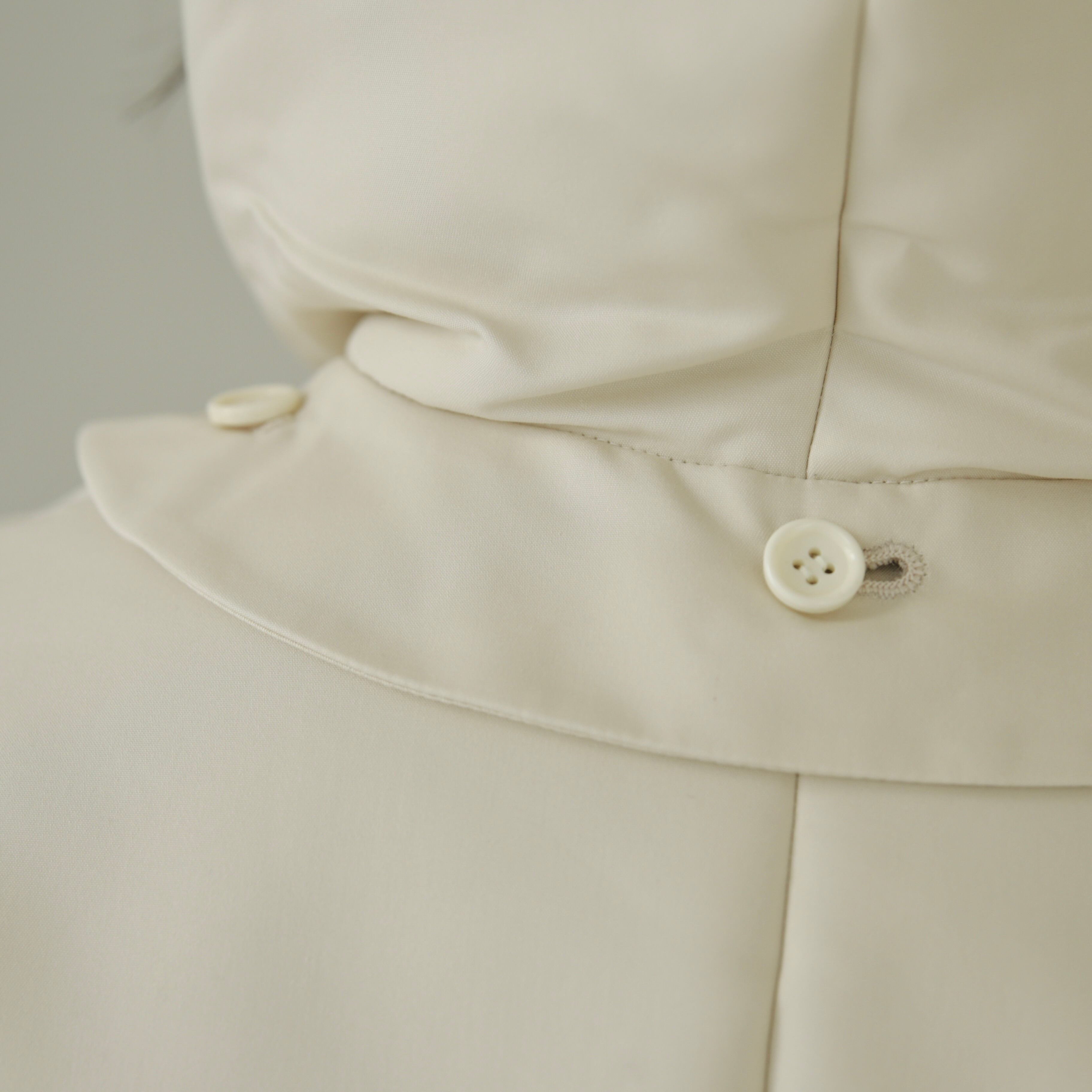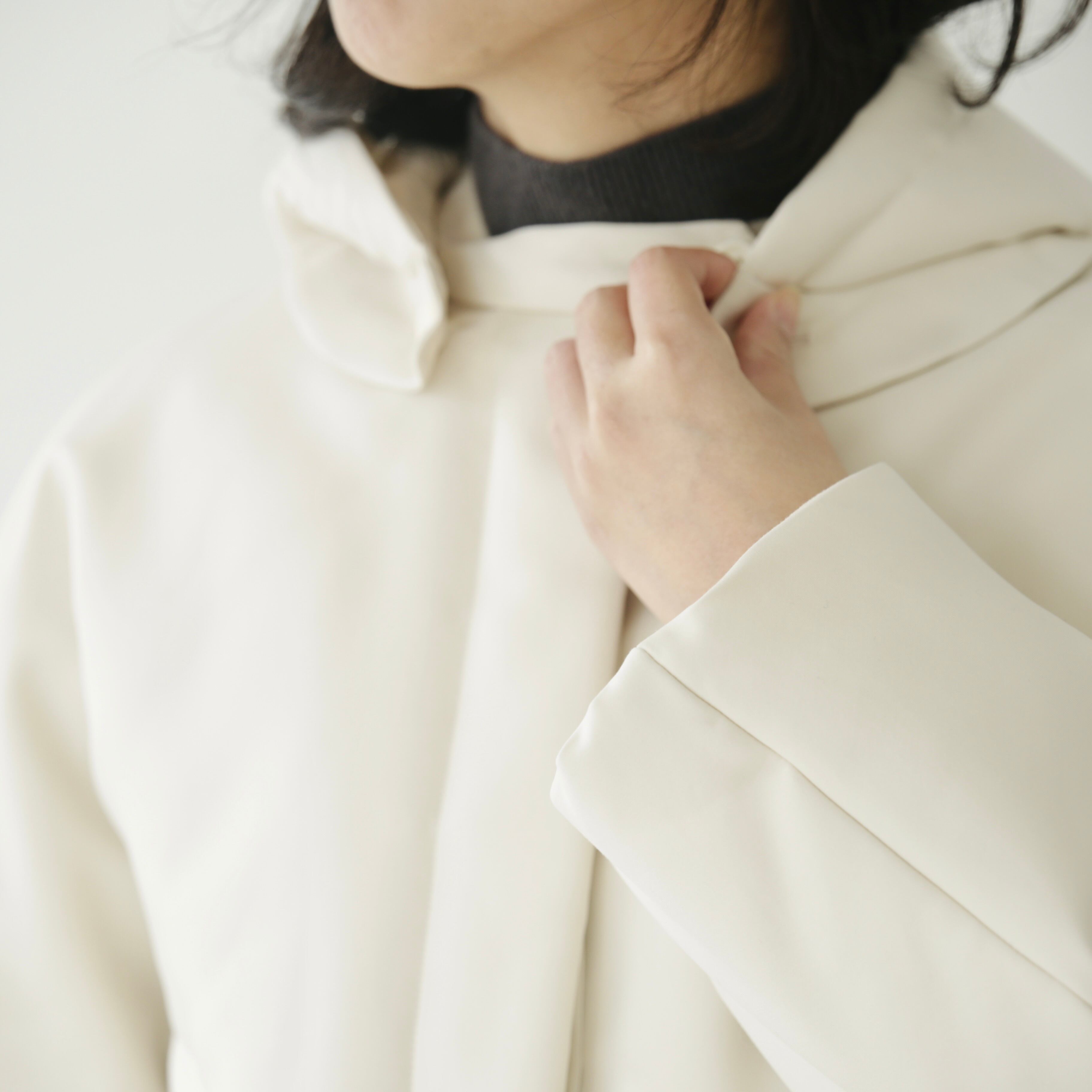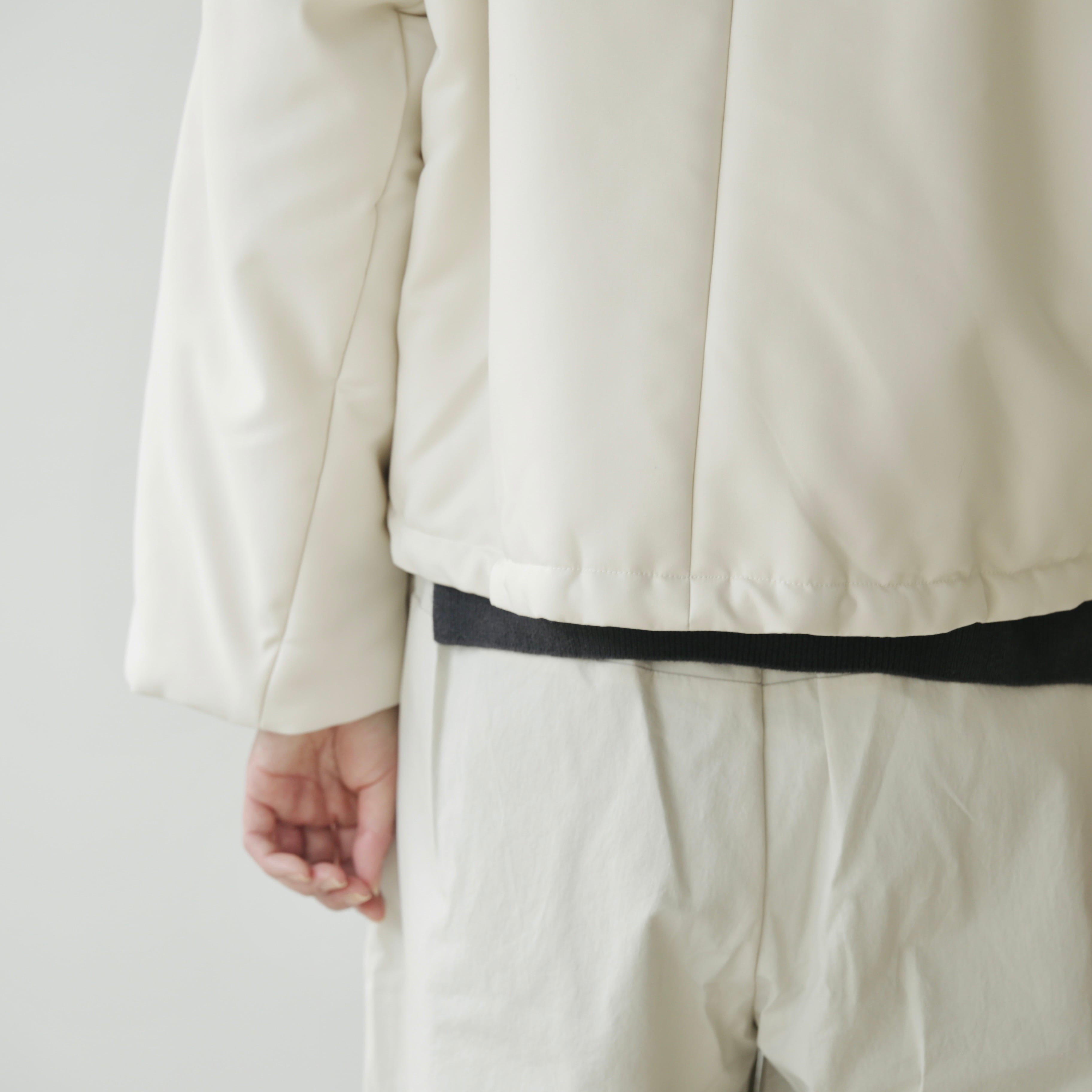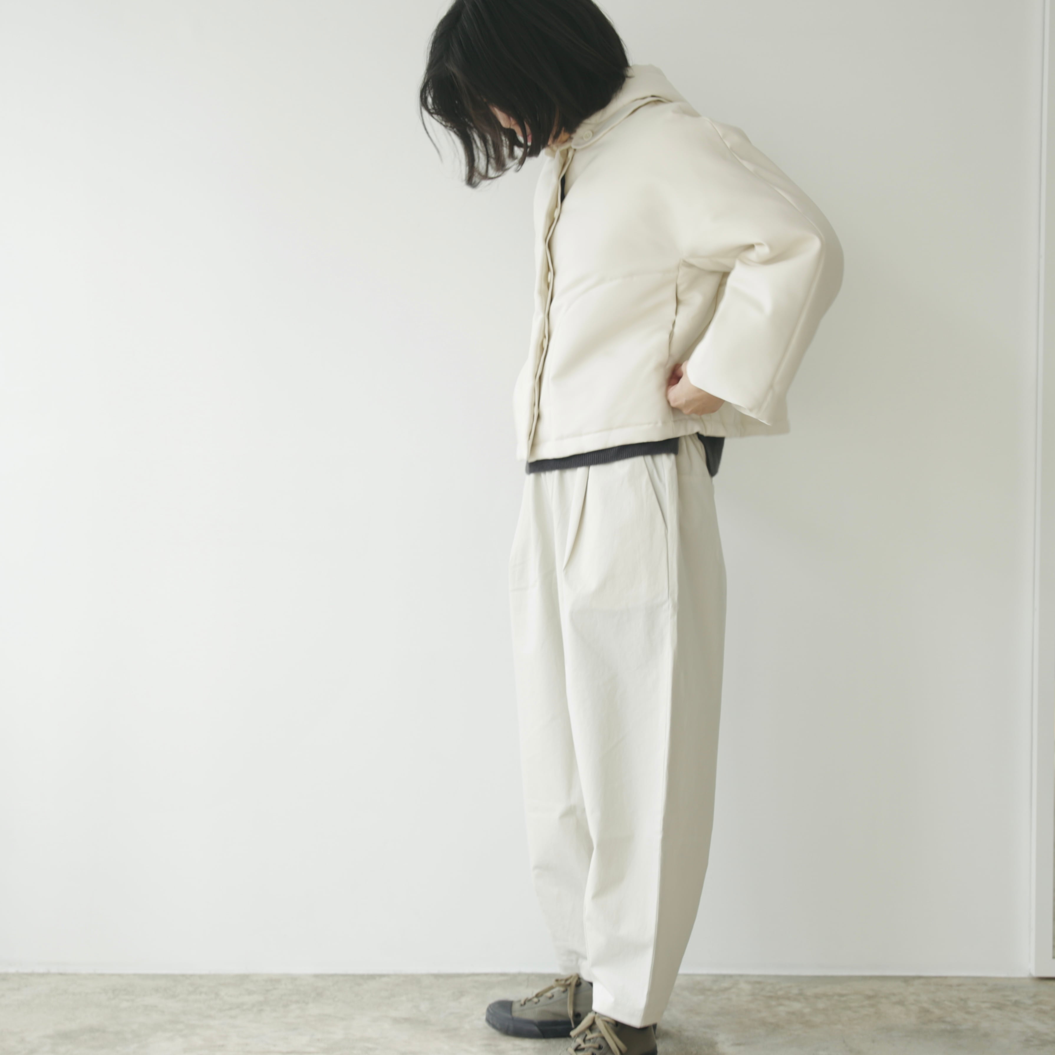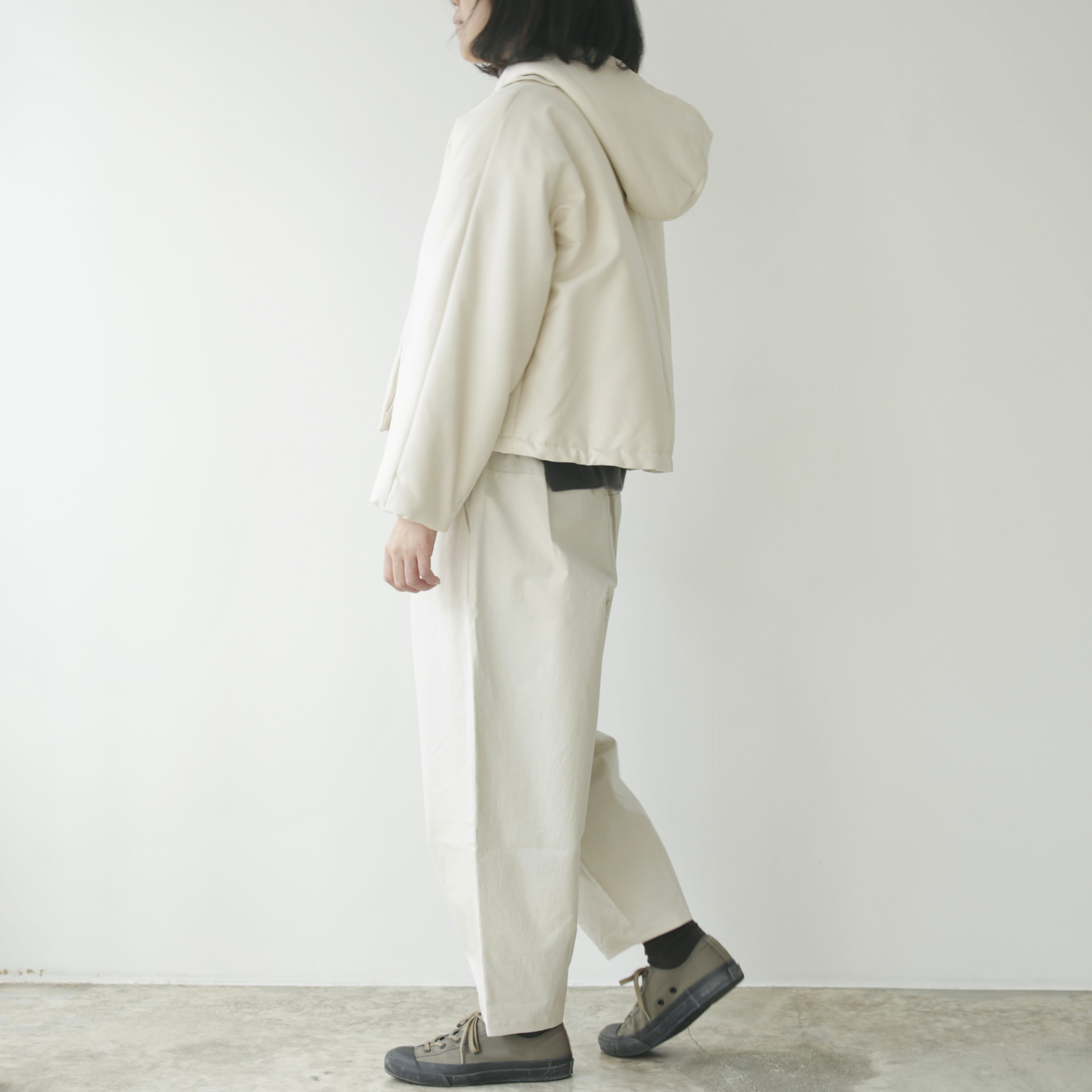 フードは取り外しが可能な仕様となっています。取り外しても残るボタンが良いアクセントとなっておりますが、立体的なフードの形がとてもきれいなので付けたまま着用して頂くのもオススメ。その日の気分や合わせるものによってアレンジを愉しめます。裾内側にコードがついているので着丈やシルエットも変えることが可能です。絞って頂くと丸みのあるより可愛らしいシルエットに。