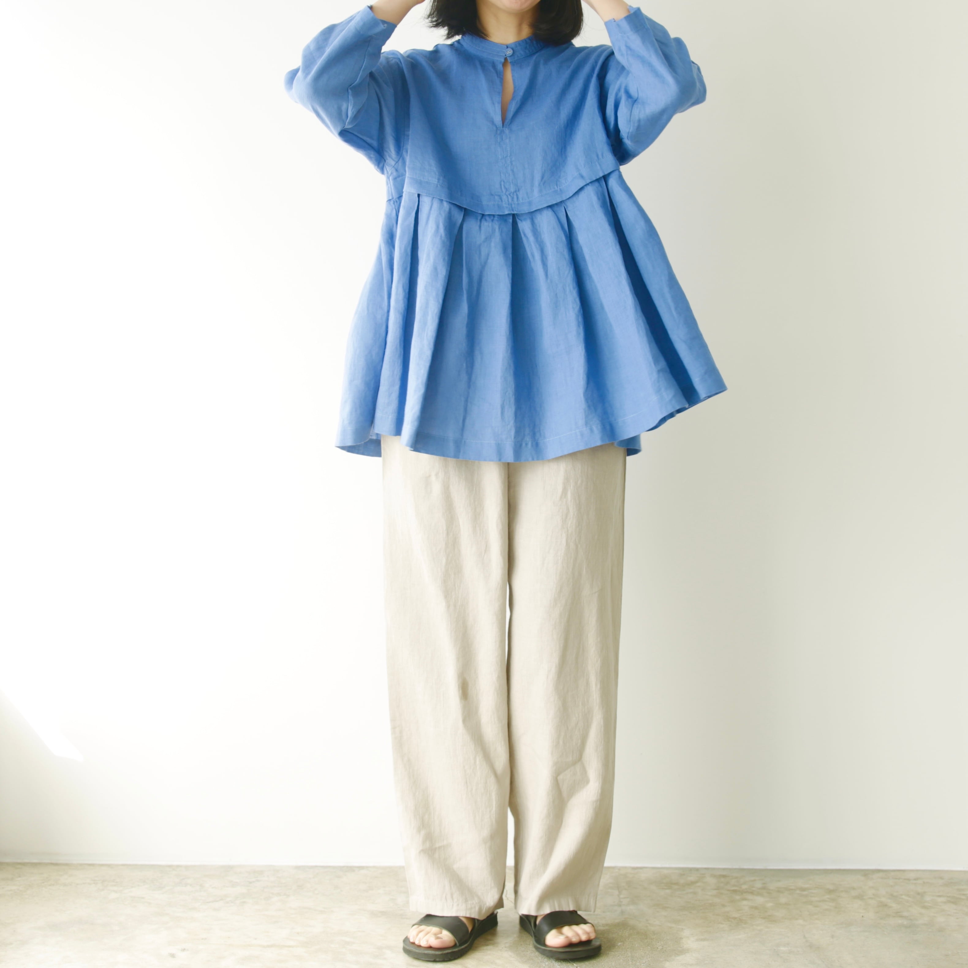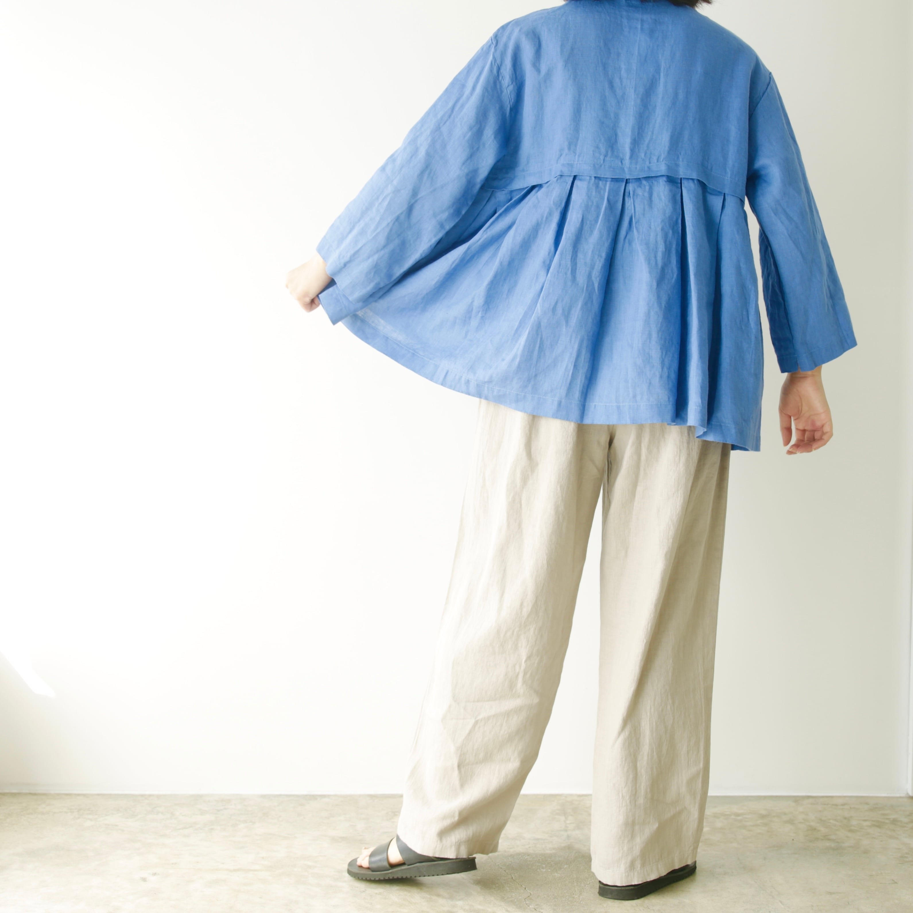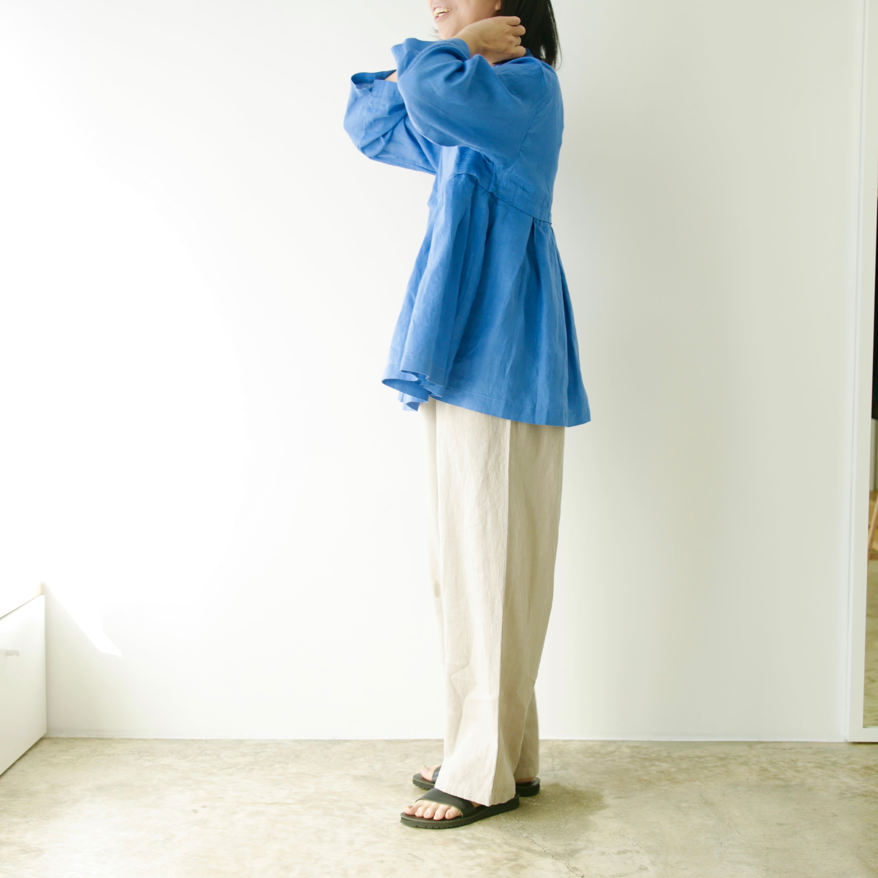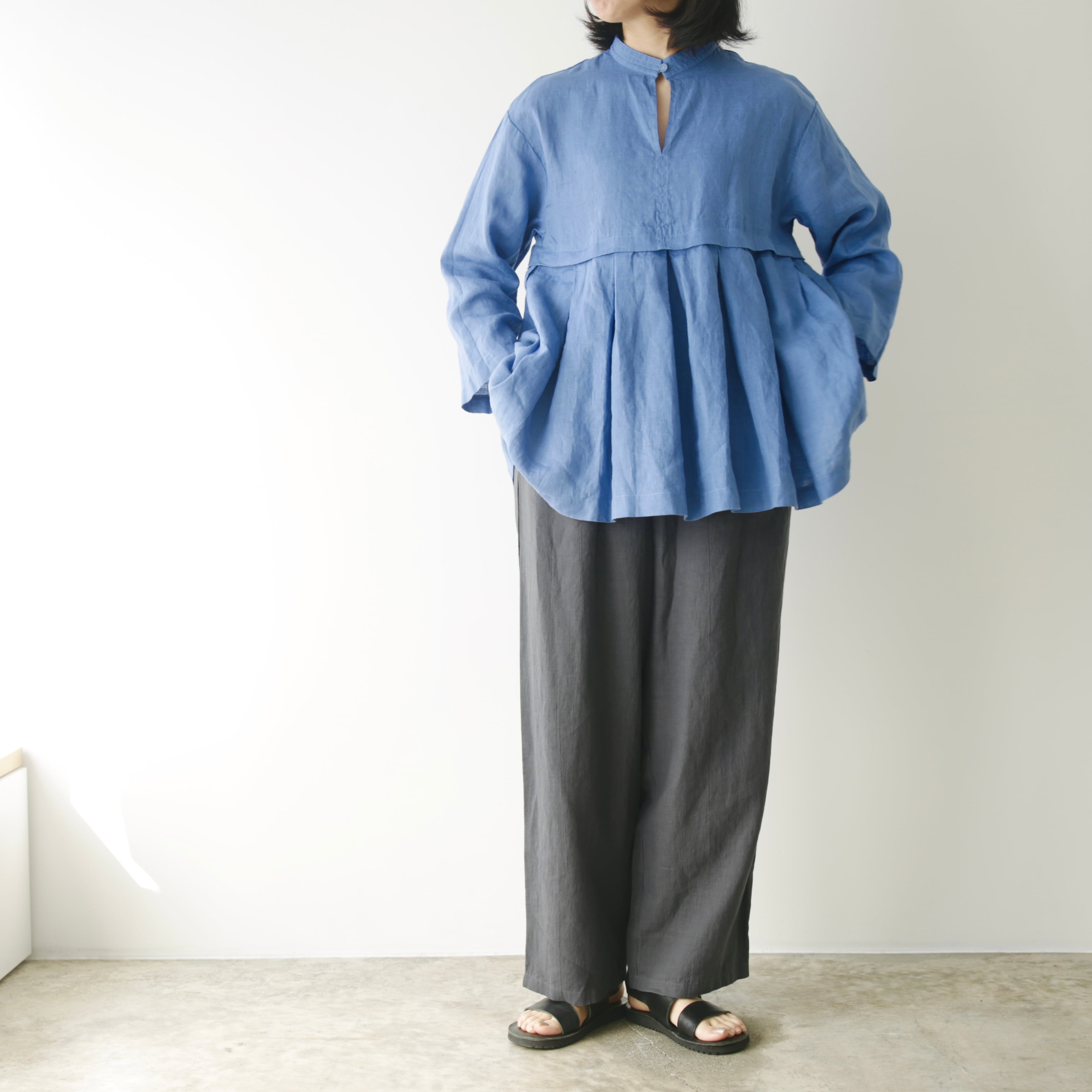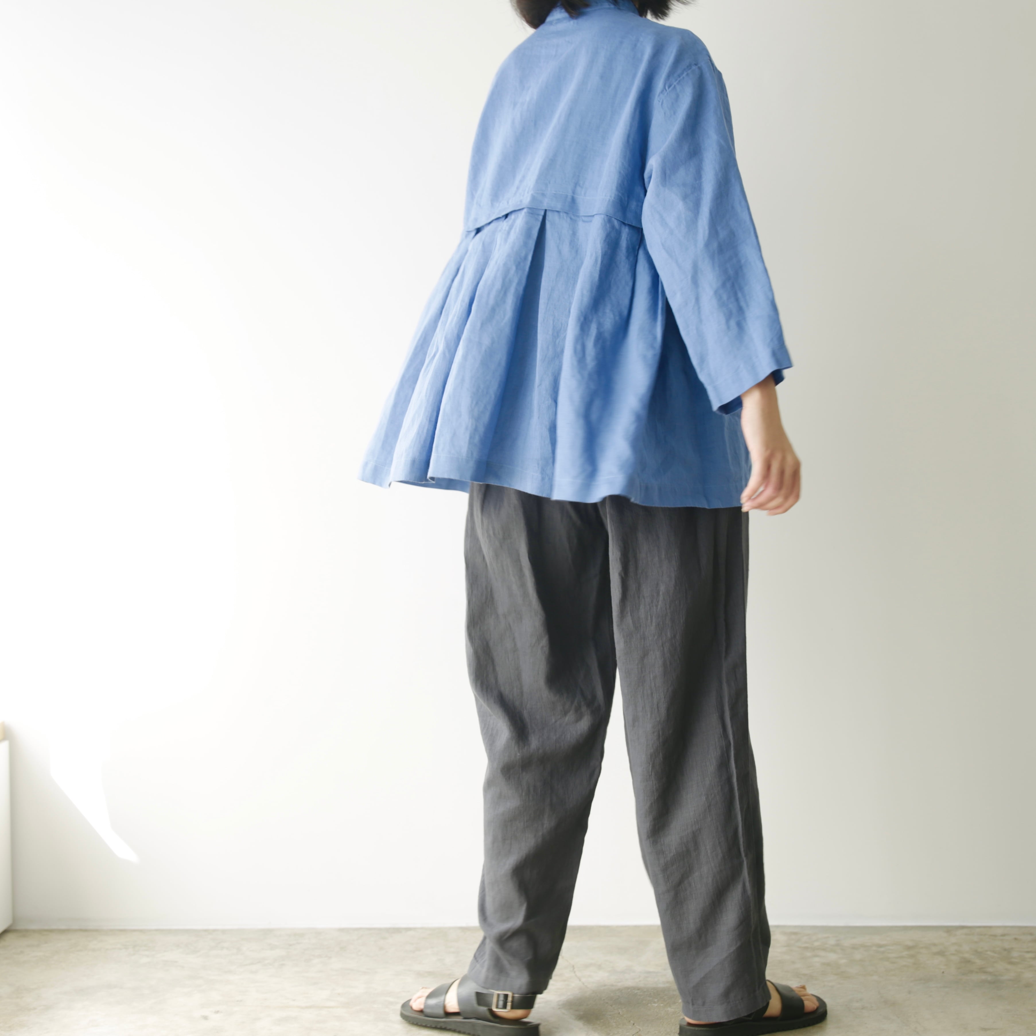 フォグリネンワークのリネンは、厳選されたリトアニア産の素材を使用。ご自宅で気負わずお洗濯ができ、洗うたびに少しずつ柔らかく、くたっと暮らしに馴染んでいきます。服と一緒に、日々の時間も重ねていけたら嬉しいブラウスです。