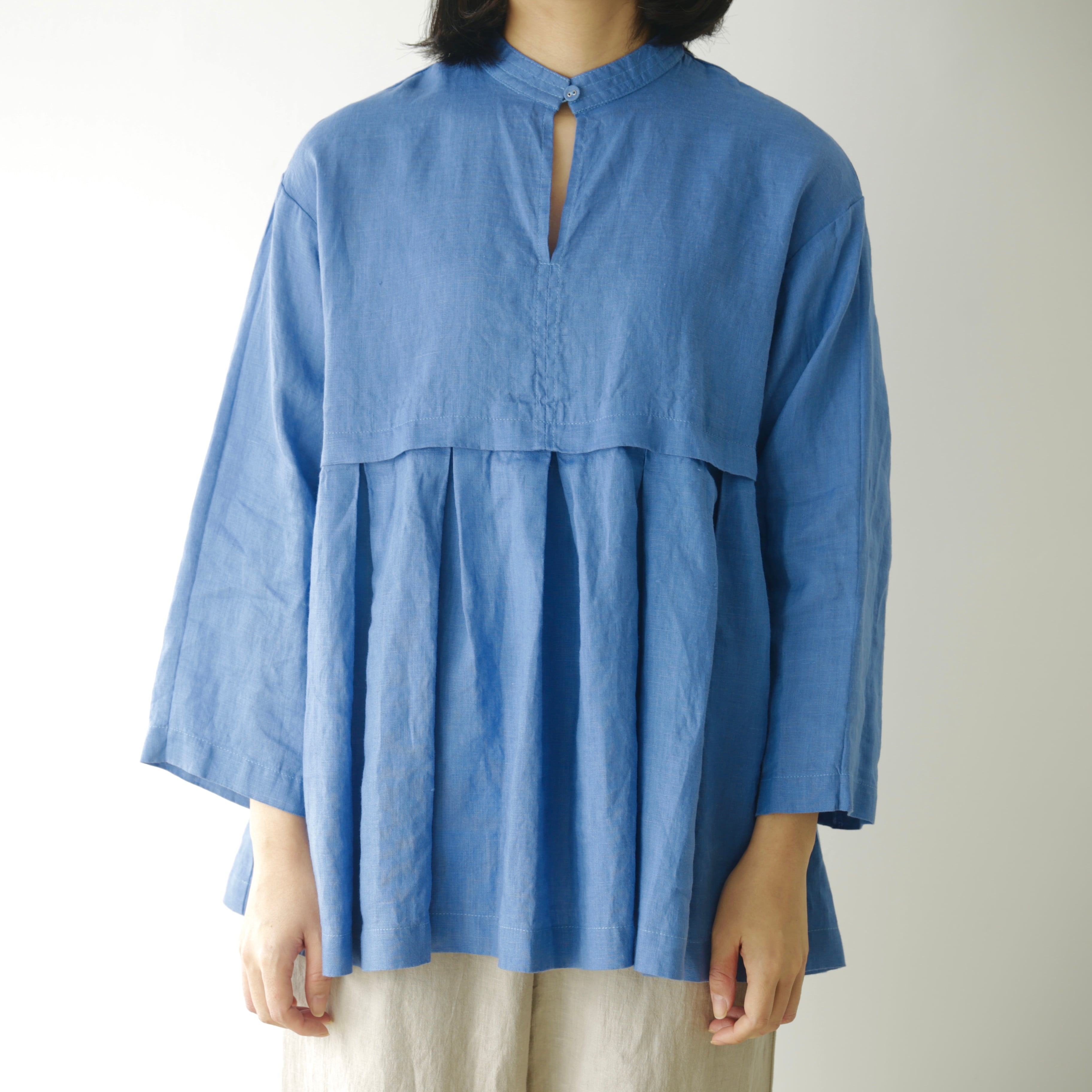 ぱっと目を引くブルーですが、実際に袖を通してみると、不思議と落ち着く。そんな印象のブラウスです。