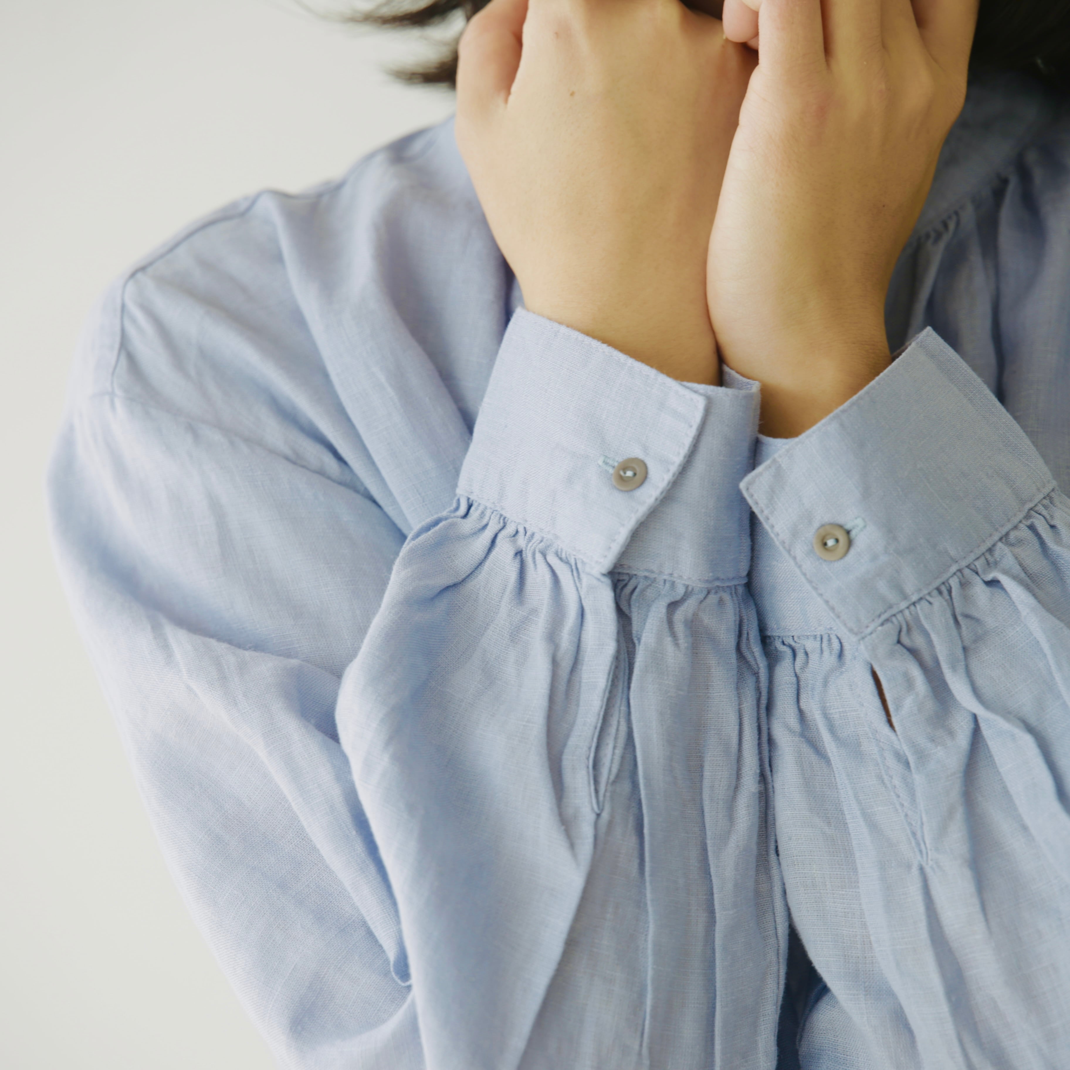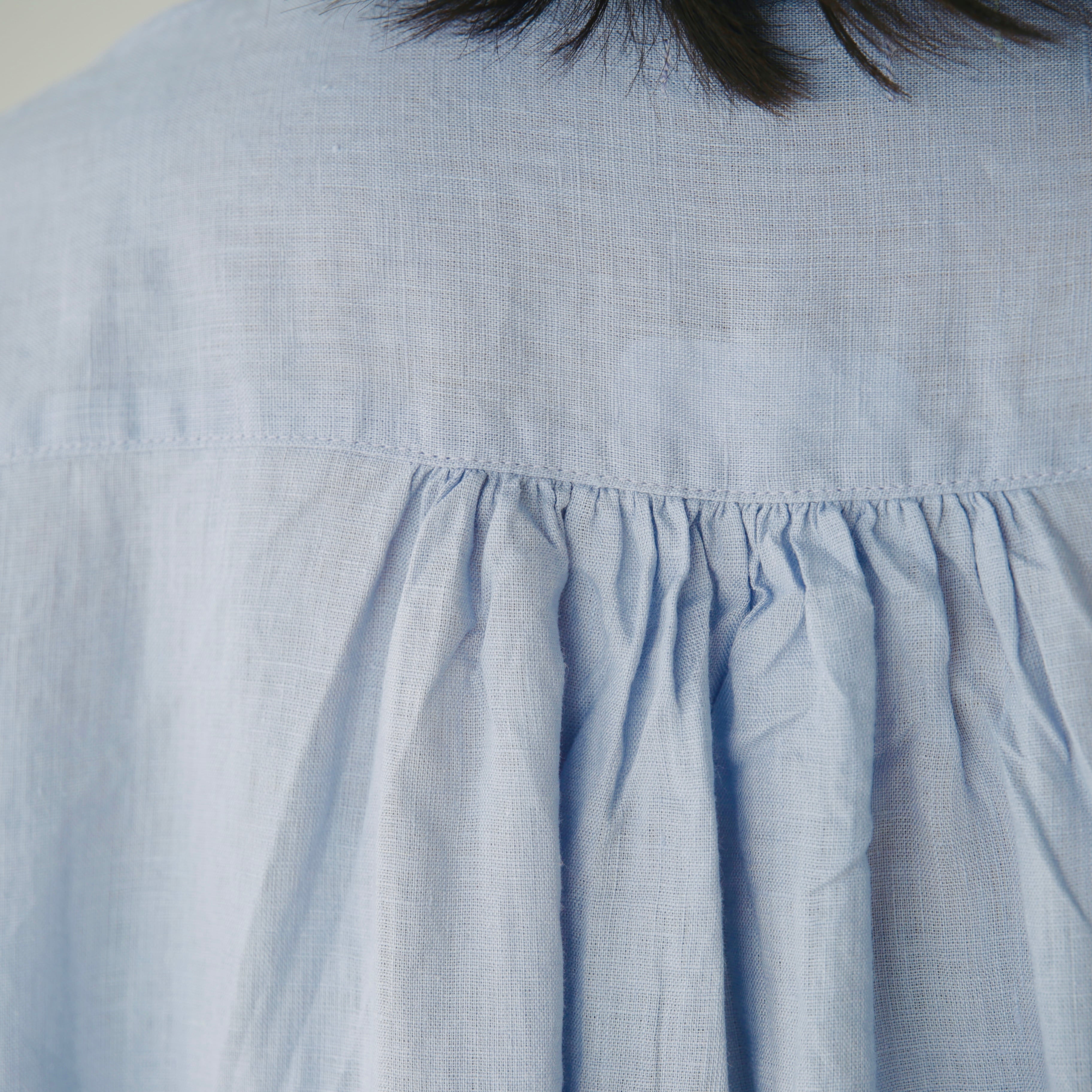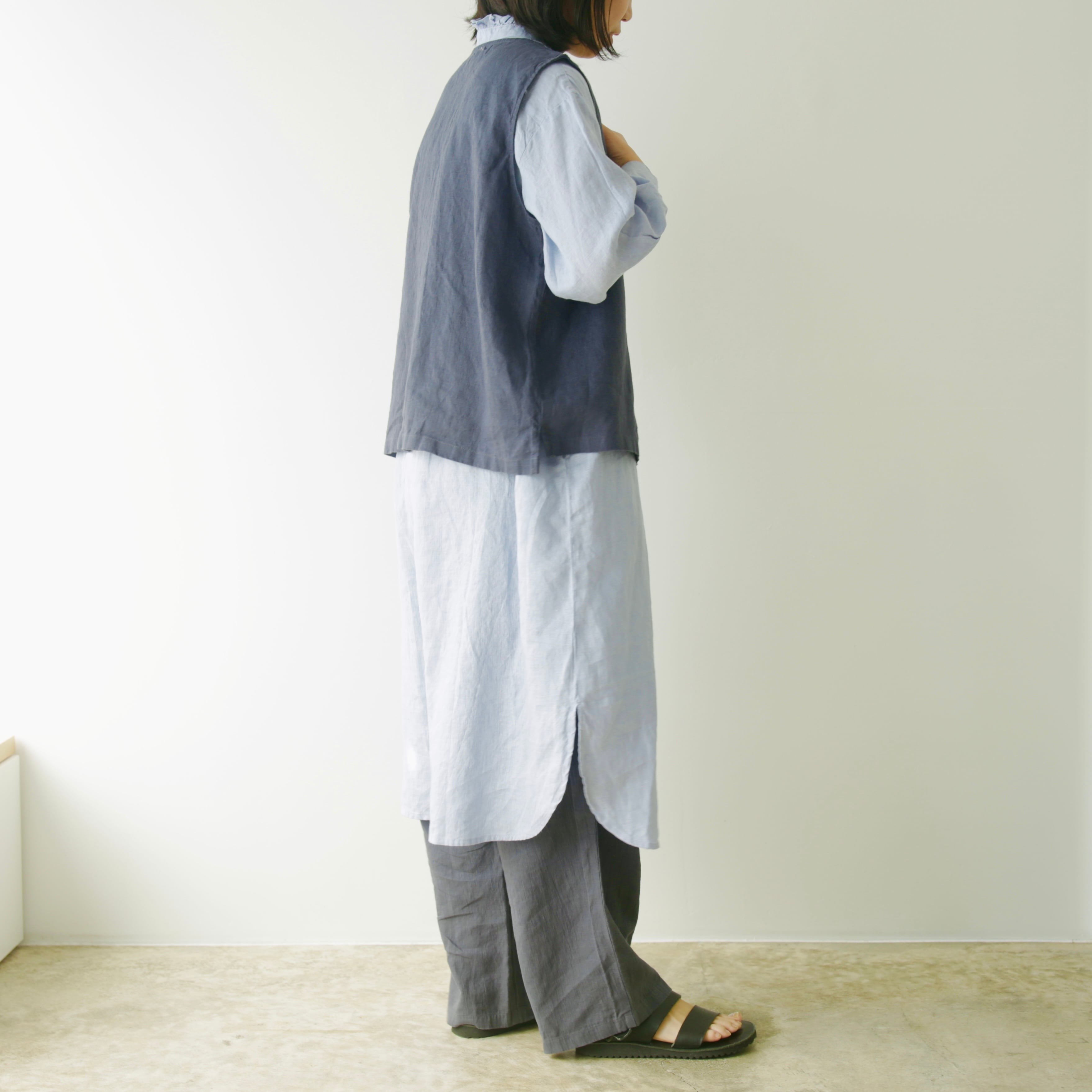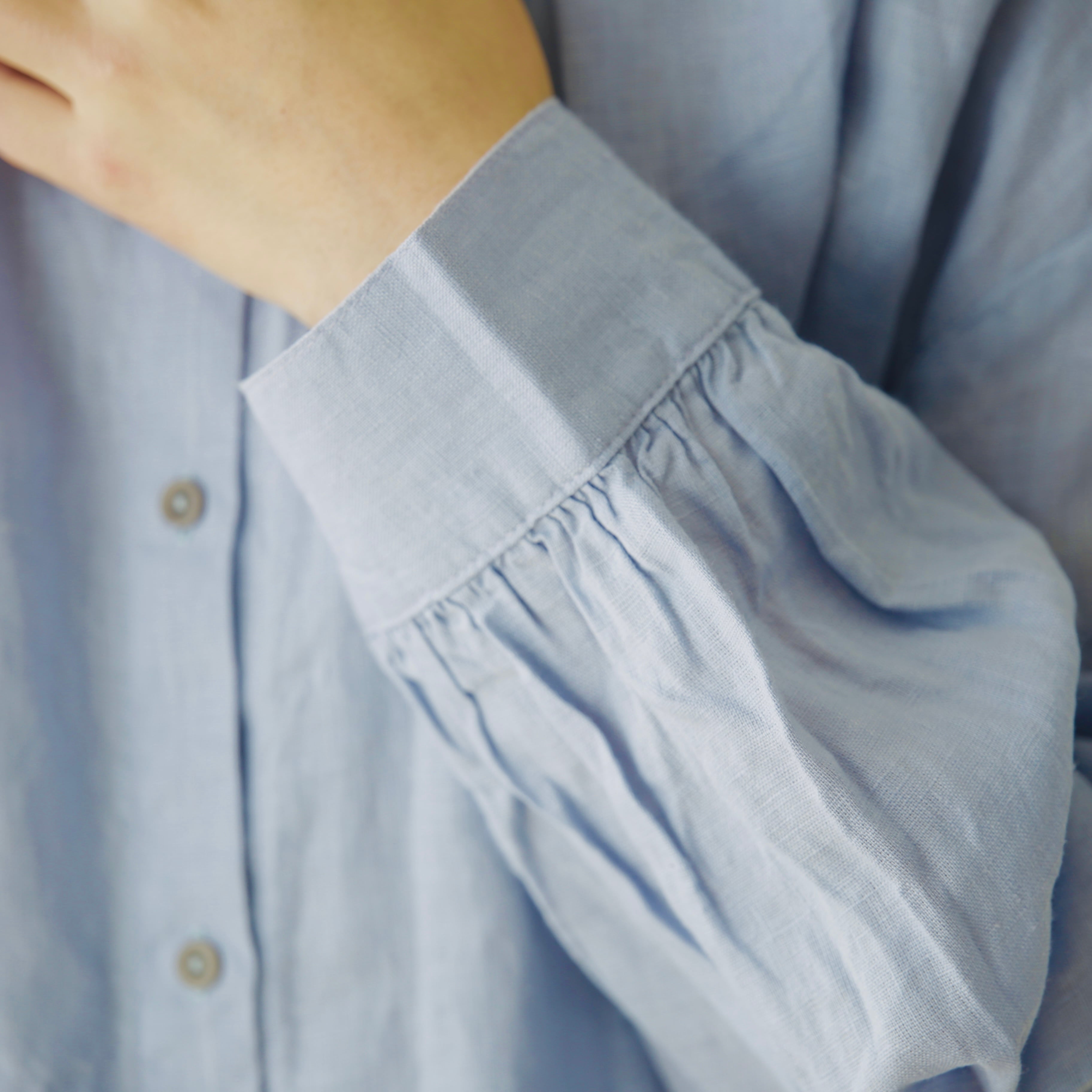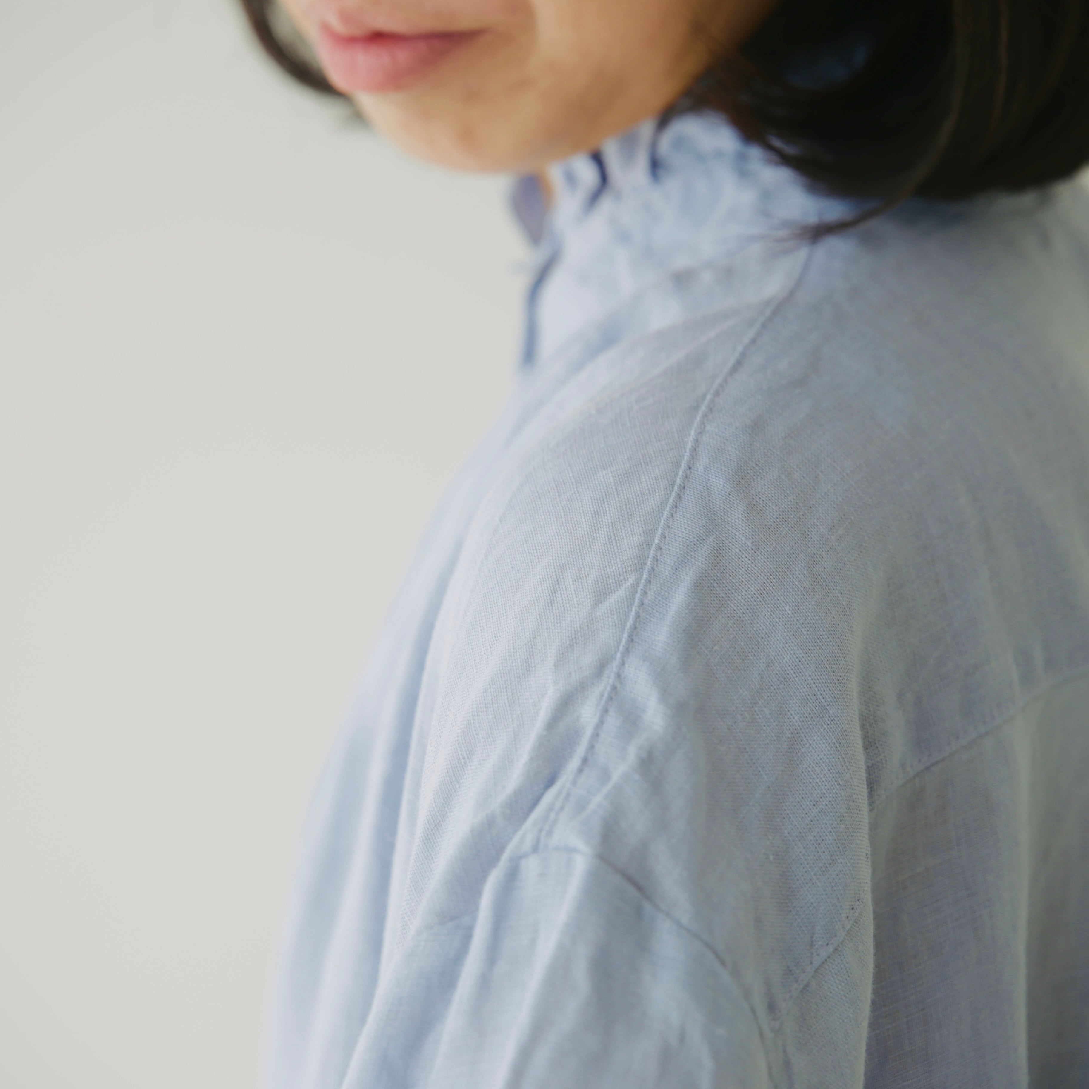 フォグリネンワークのリネンは、厳選されたリトアニア産の素材を使用。ご自宅で気負わずお洗濯ができ、洗うたびに少しずつ柔らかく、くたっと暮らしに馴染んでいきます。服と一緒に、日々の時間も重ねていけたら嬉しいブラウスです。