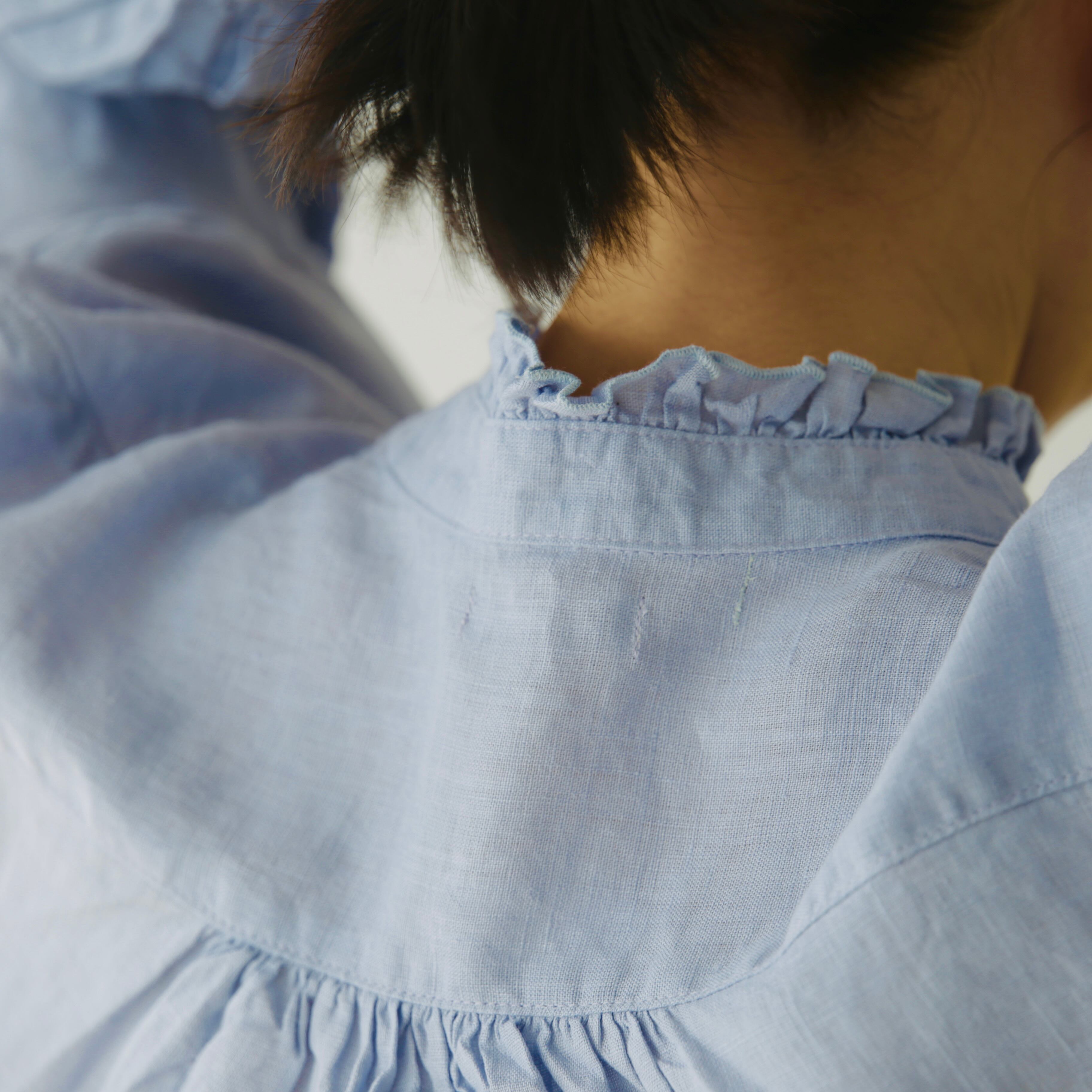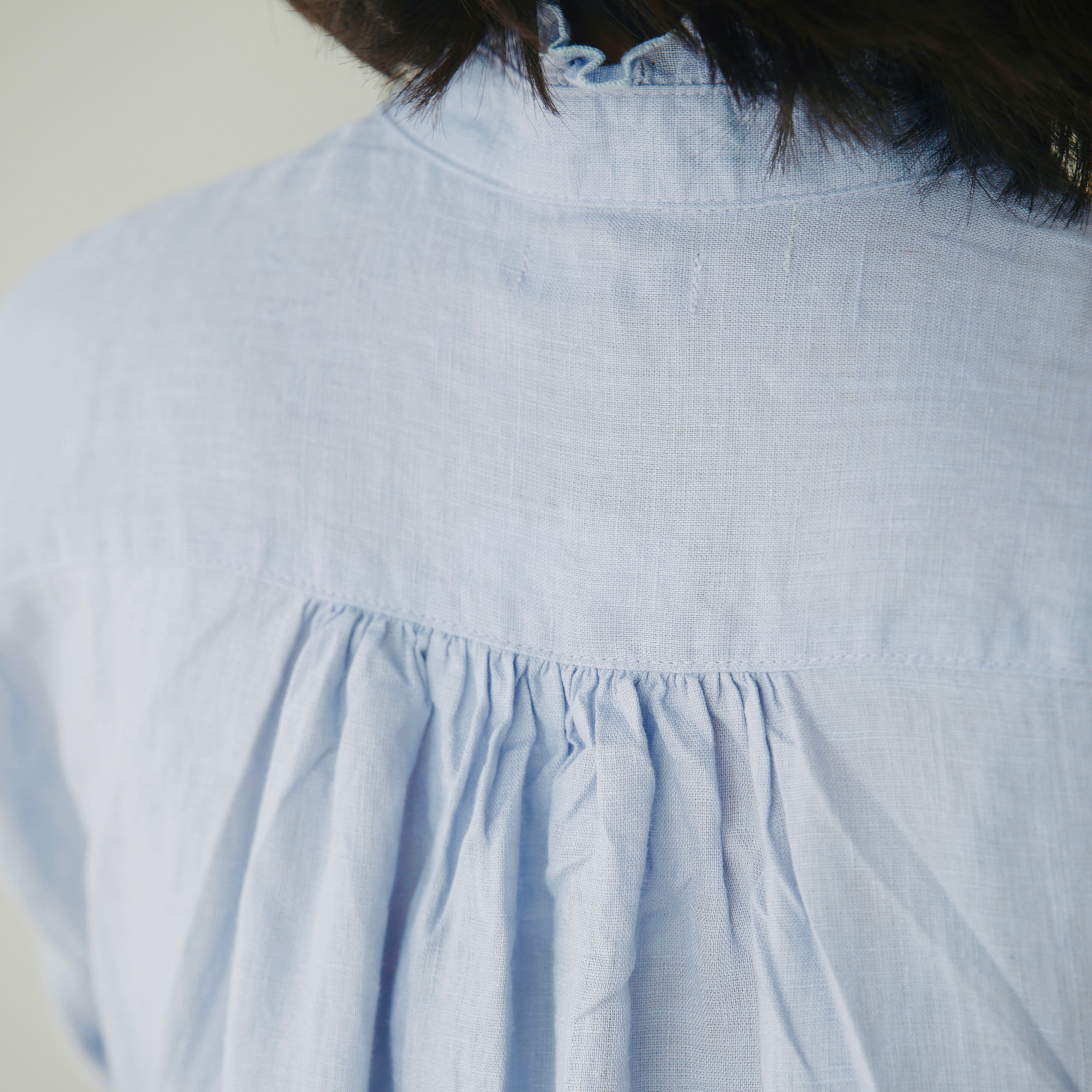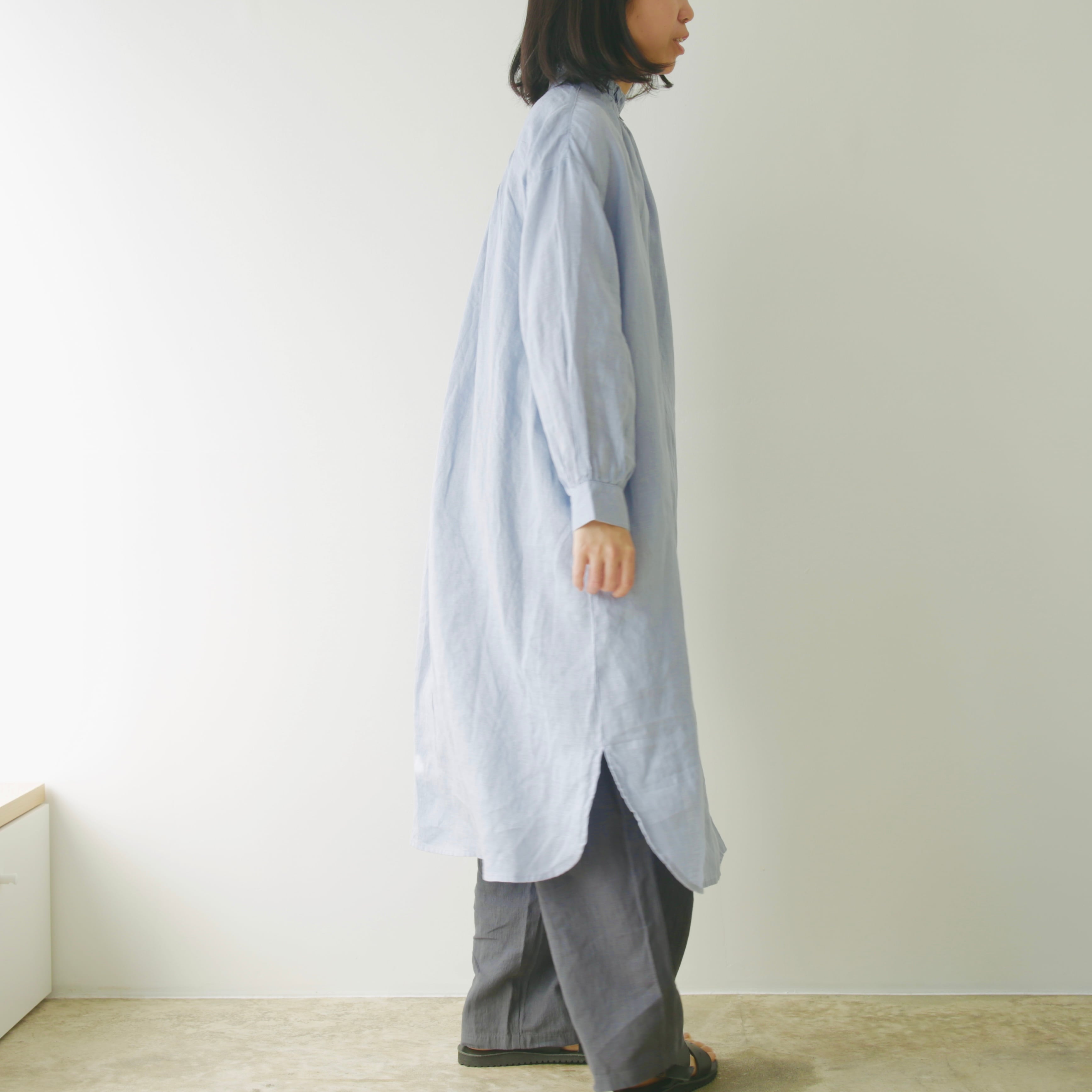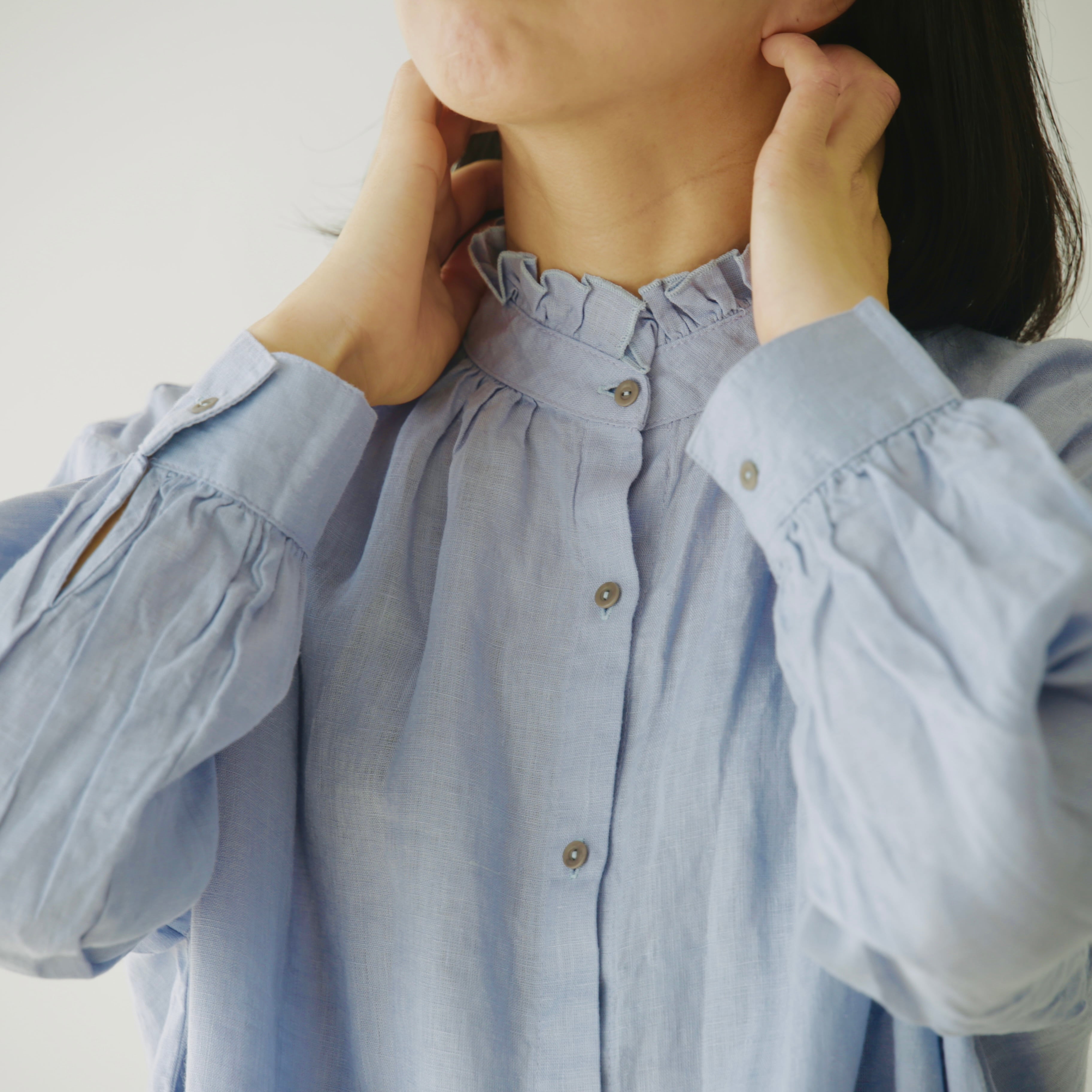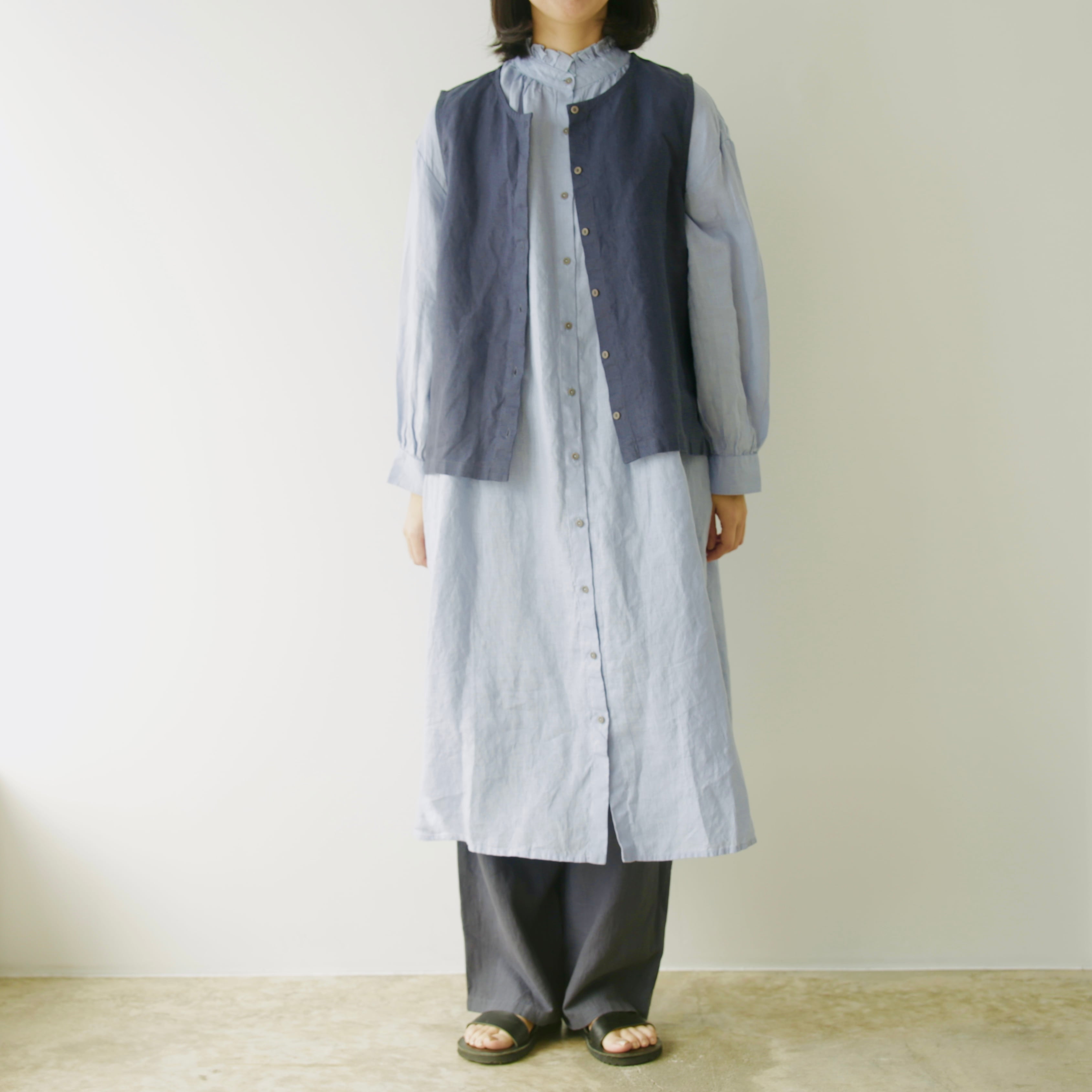 フォグリネンワークのリネンは、厳選されたリトアニア産の素材を使用。ご自宅で気負わずお洗濯ができ、洗うたびに少しずつ柔らかく、くたっと暮らしに馴染んでいきます。服と一緒に、日々の時間も重ねていけたら嬉しいブラウスです。