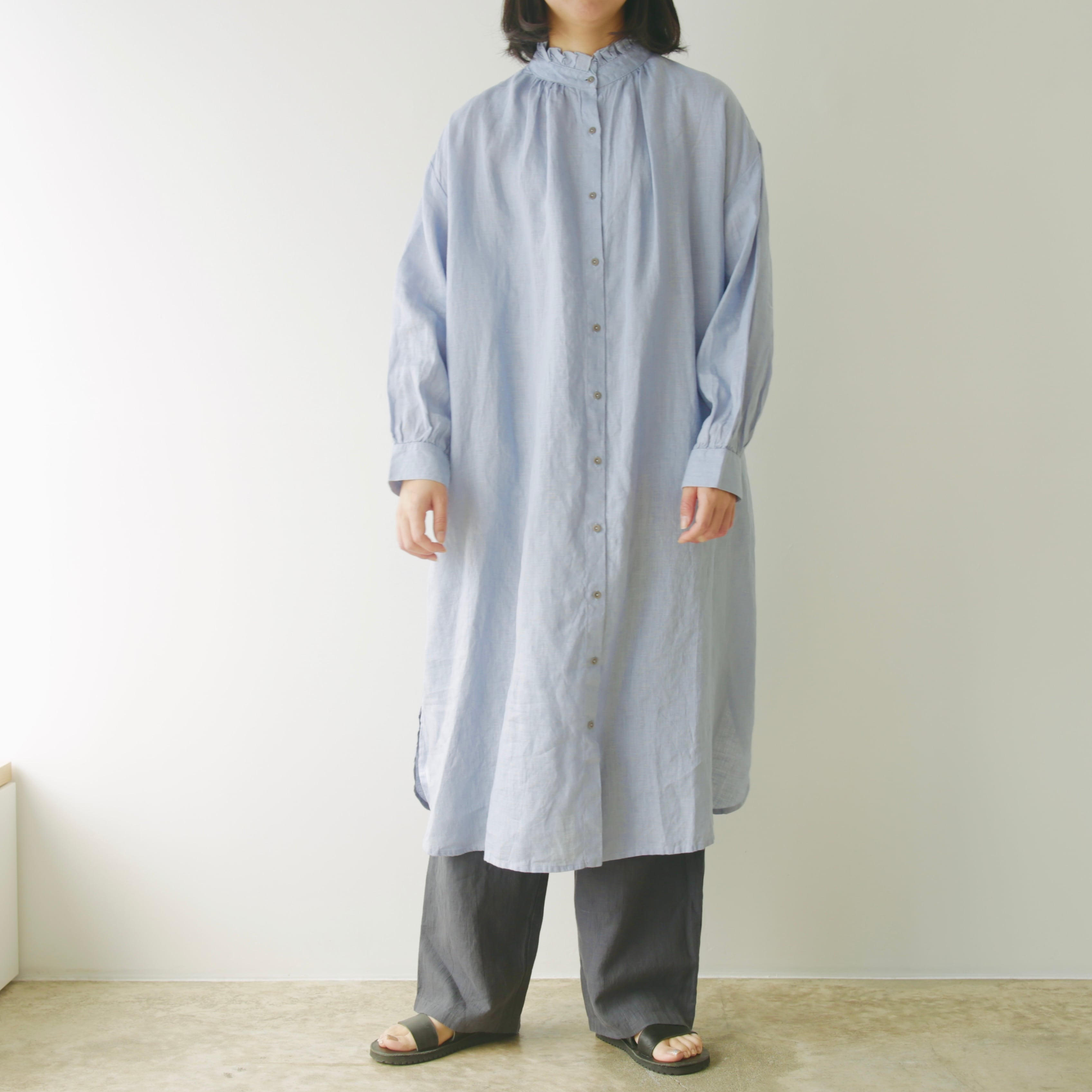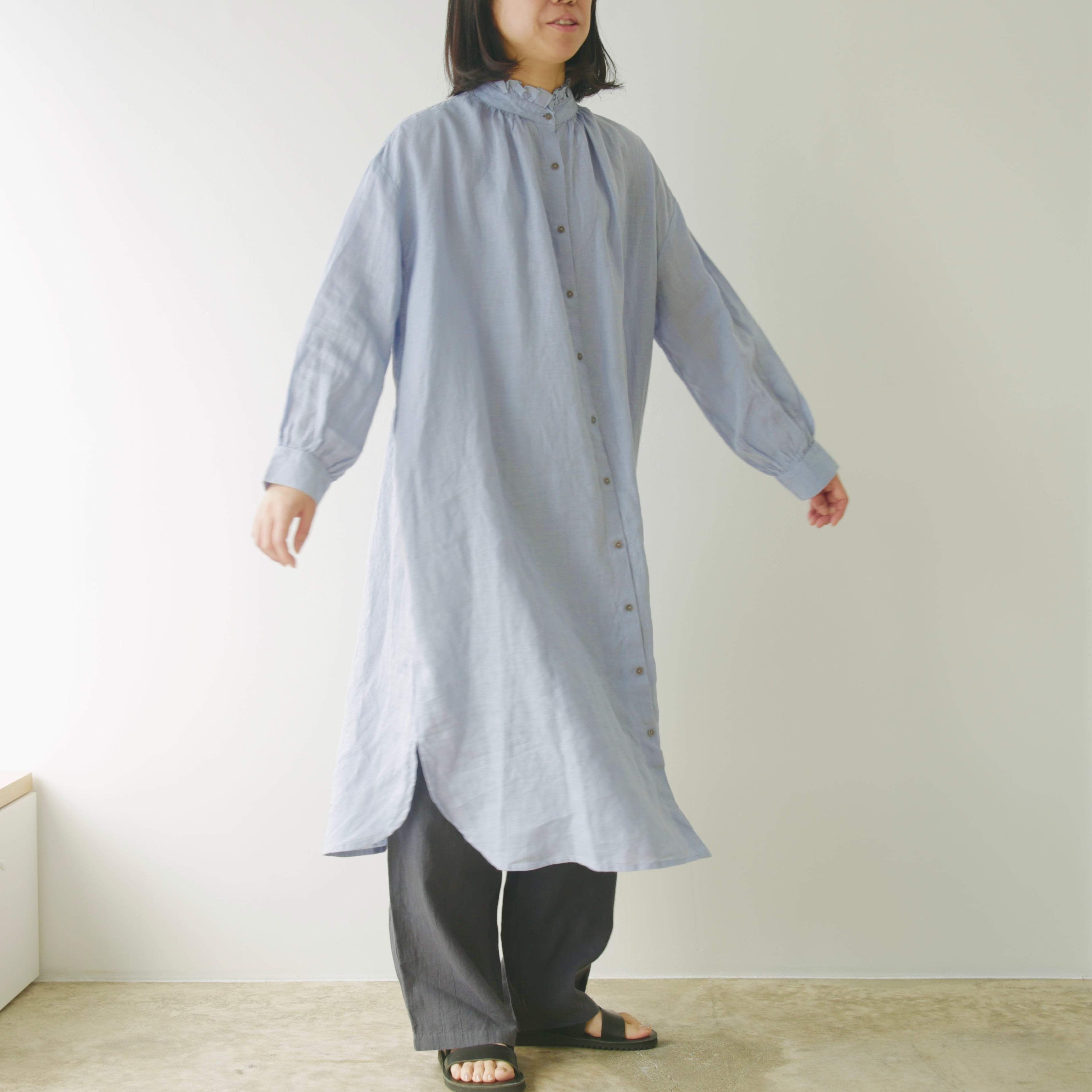 最近なぜかフリルブラウスを探している自分がいます。ただ甘いだけのブラウスは少し気が引ける気がしてこのワンピースは甘さと大人ぽさのバランスが丁度良い1枚です。ドロップショルダーでゆったりとした使用に、袖口にはたっぷりのギャザーも入っています。前を開けてTシャツやパンツの上からさらりと羽織っても、今の時期にはゆったりとしたニットやスウエットを重ねて、除くフリルがまた良い佇まいです。