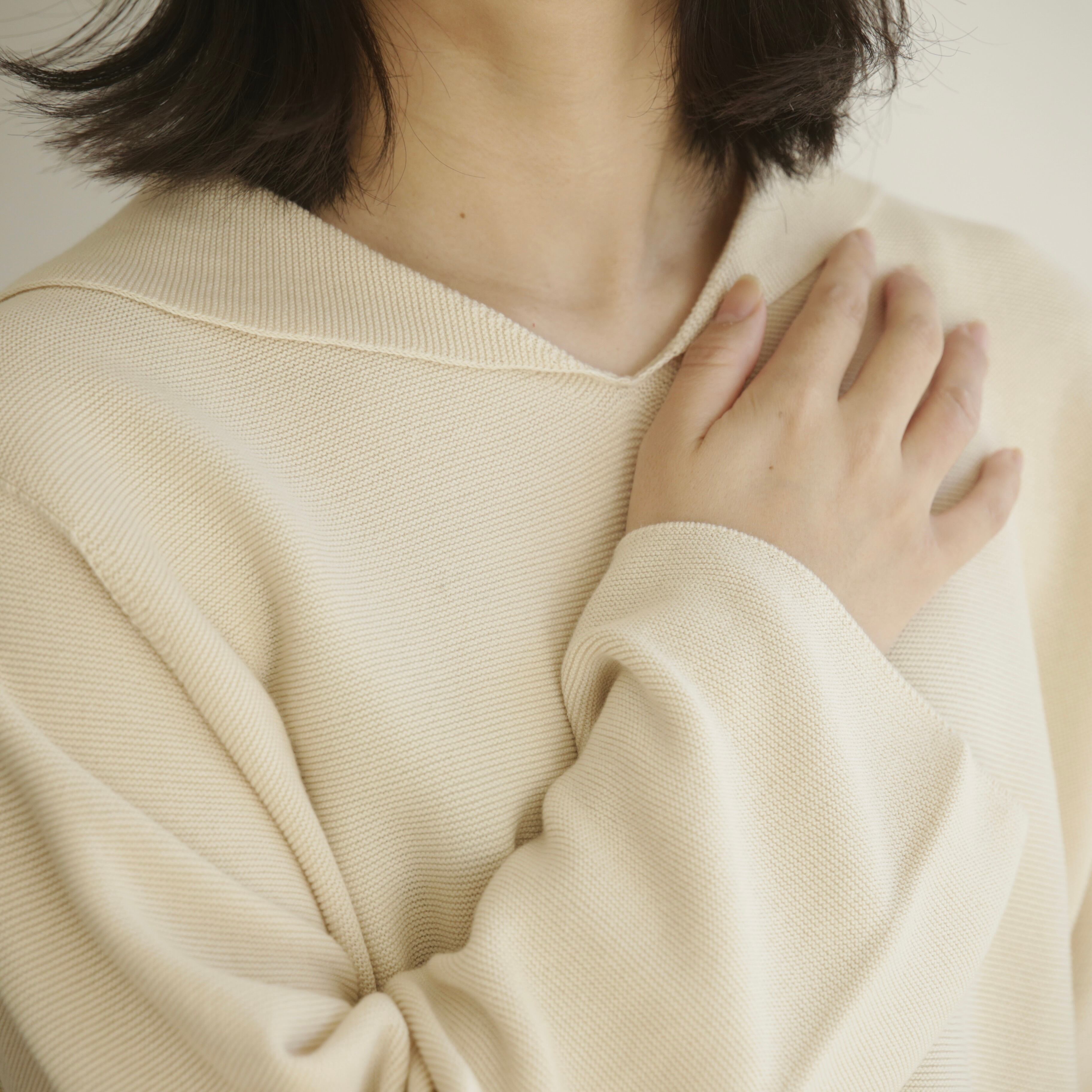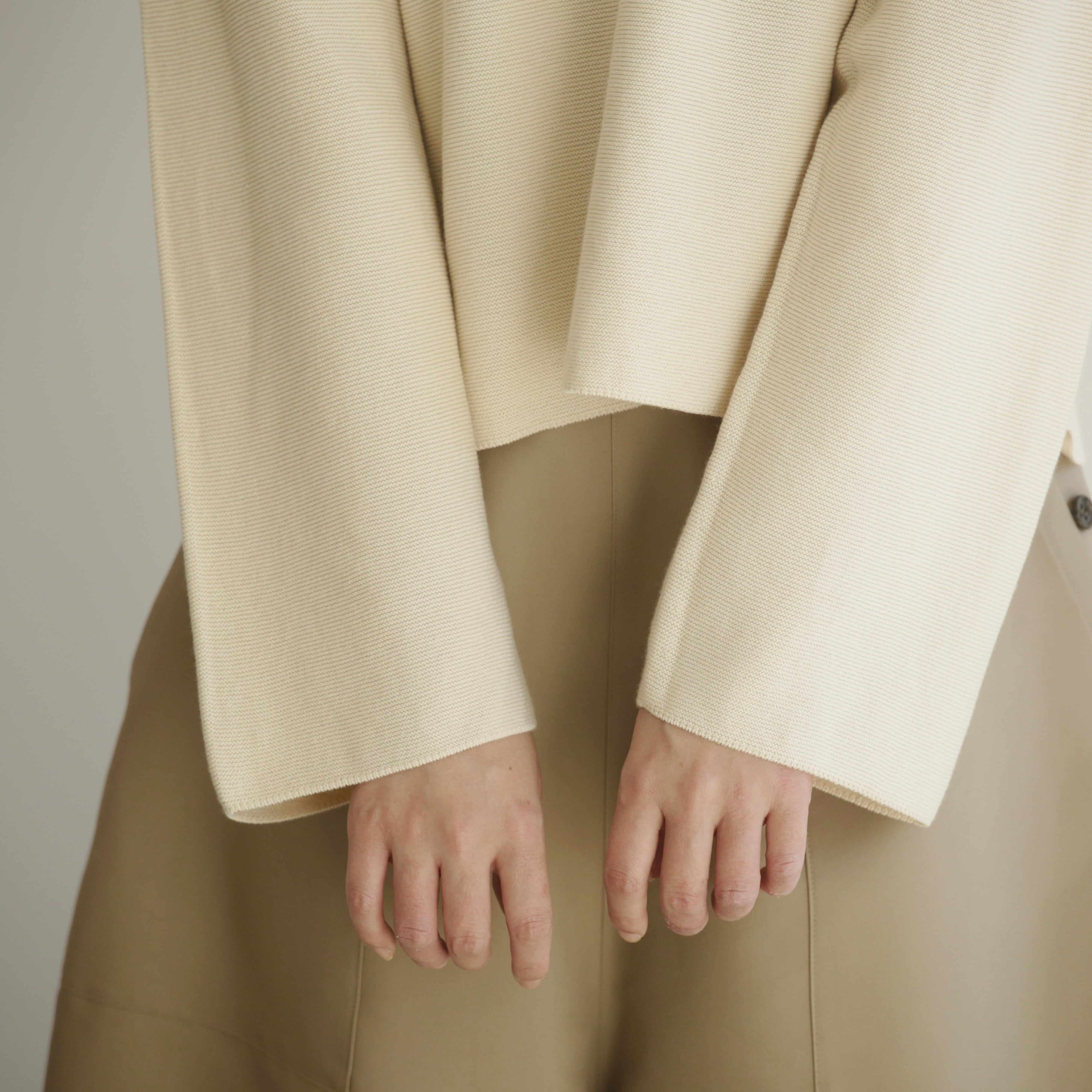 素材はコットンにカシミヤを少しだけ。 さらりとした軽やかさの中に、カシミヤならではのなめらかな肌触りが重なります。特殊な編み方により、裏側まで表のようになめらかで、素肌に触れてもとても心地よい素材です。