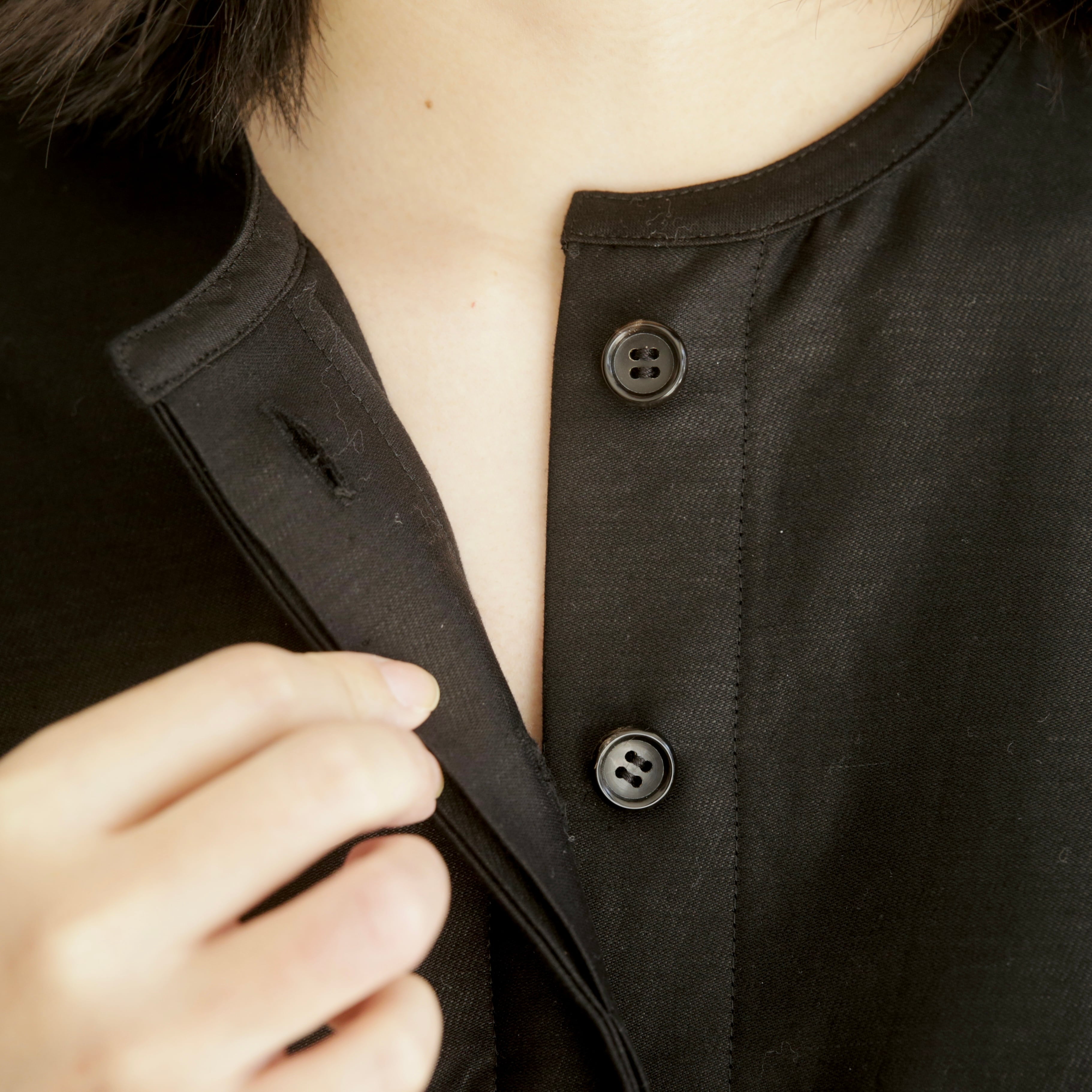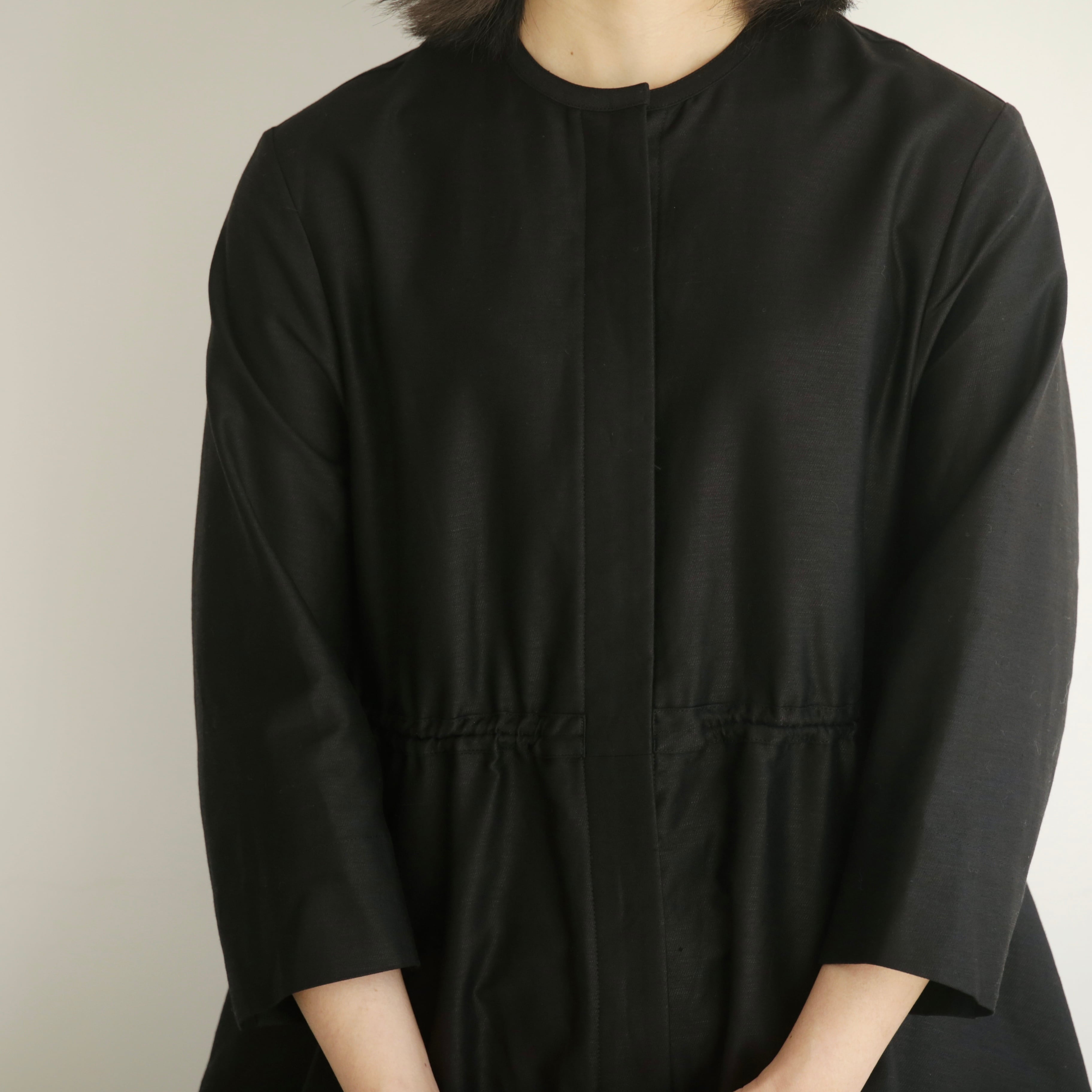 素材にはコットンリネンを使用。程よい厚みがありながら、リネンならではの軽やかさと、ほんのりとした光沢を感じる上品な表情の生地です。しなやかな風合いと適度な張り、落ち感が合わさることで、バレルシルエットの立体的な丸みを美しく保ってくれます。