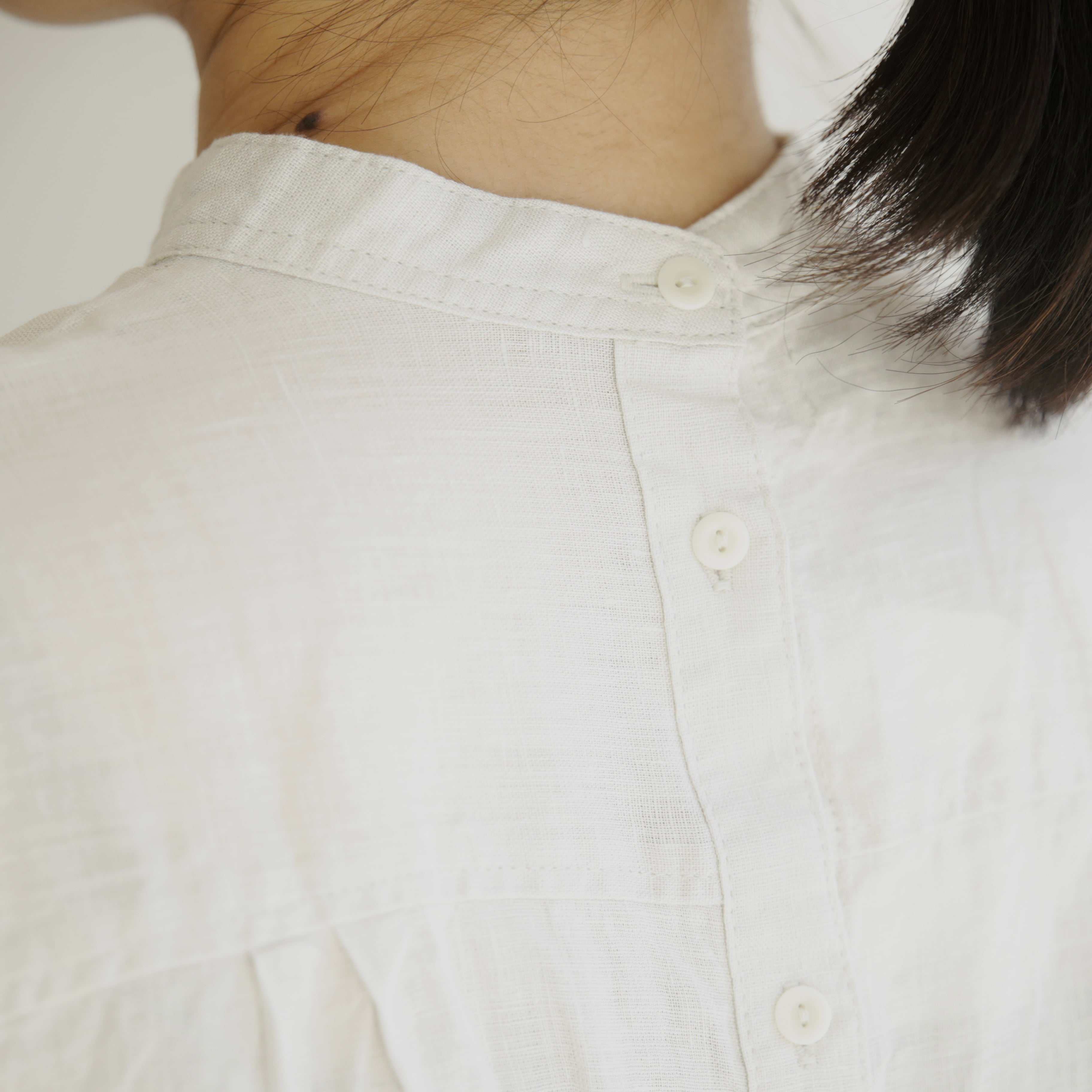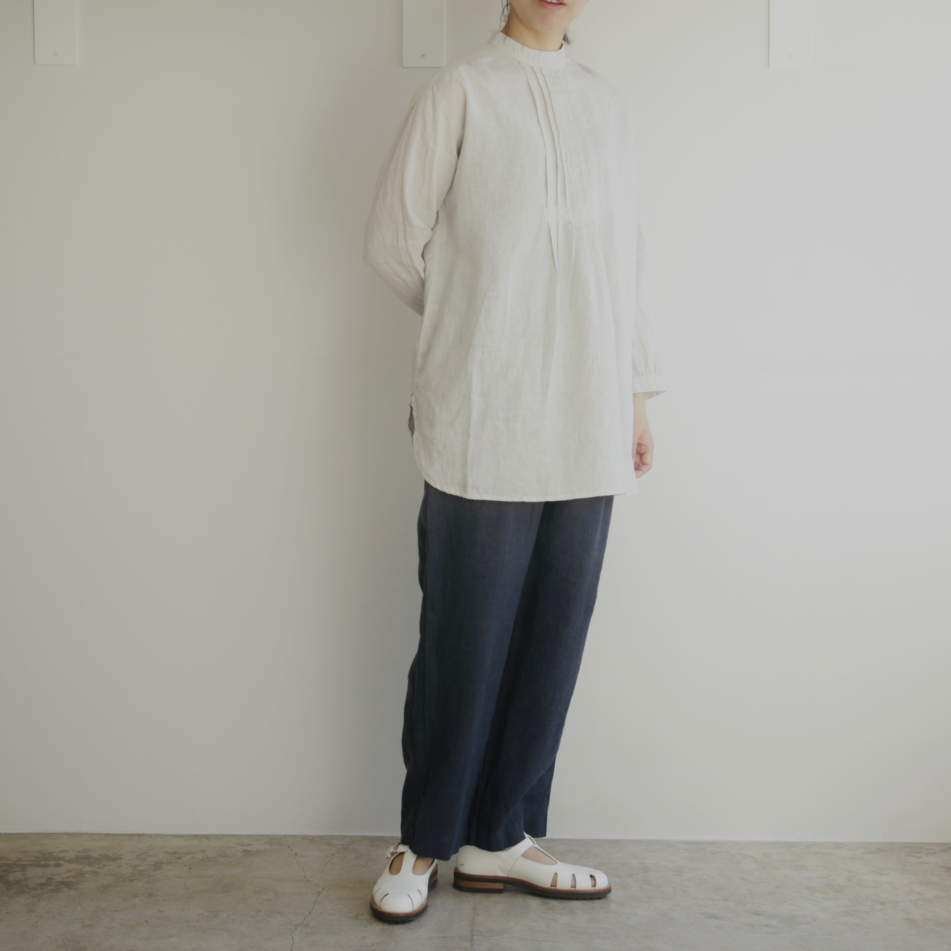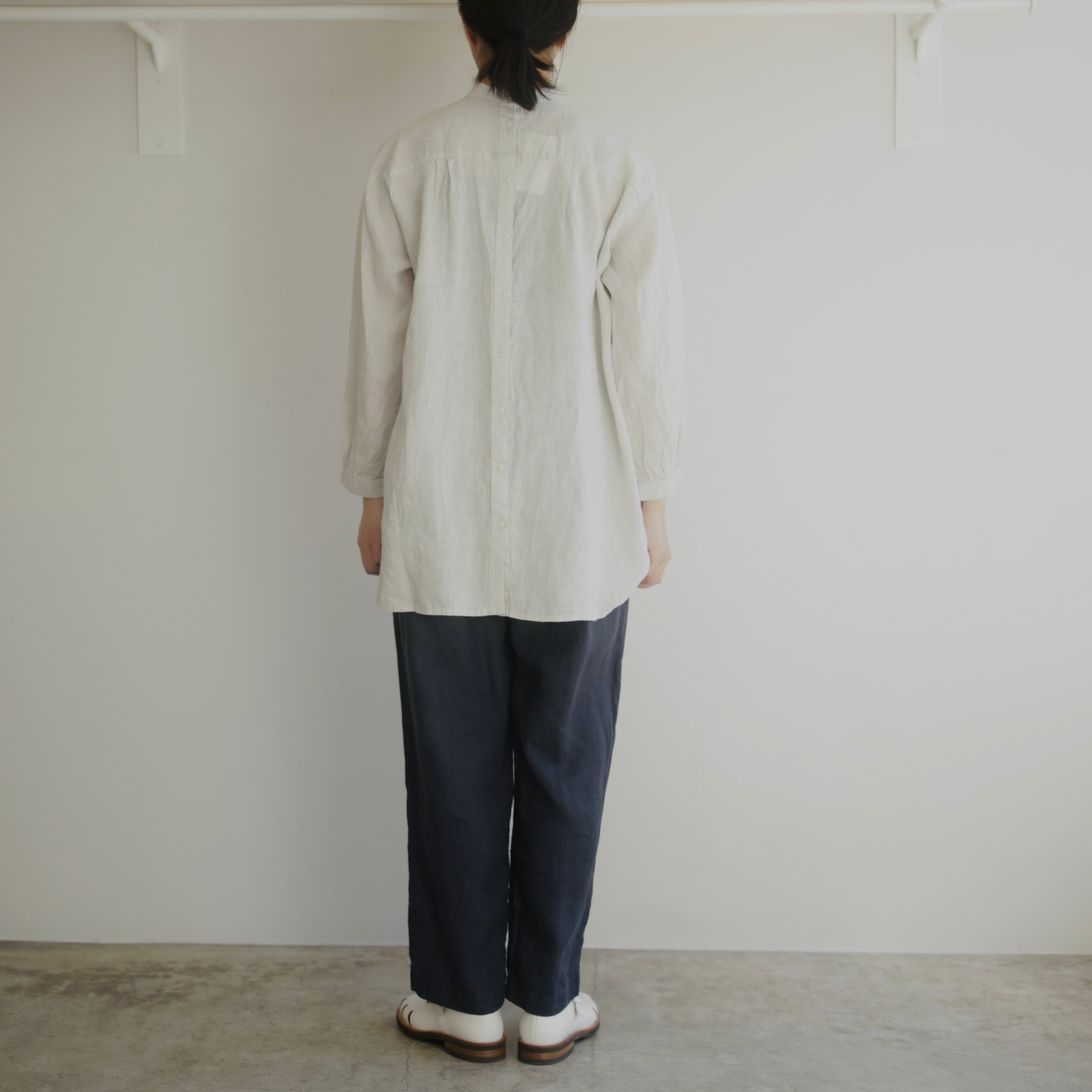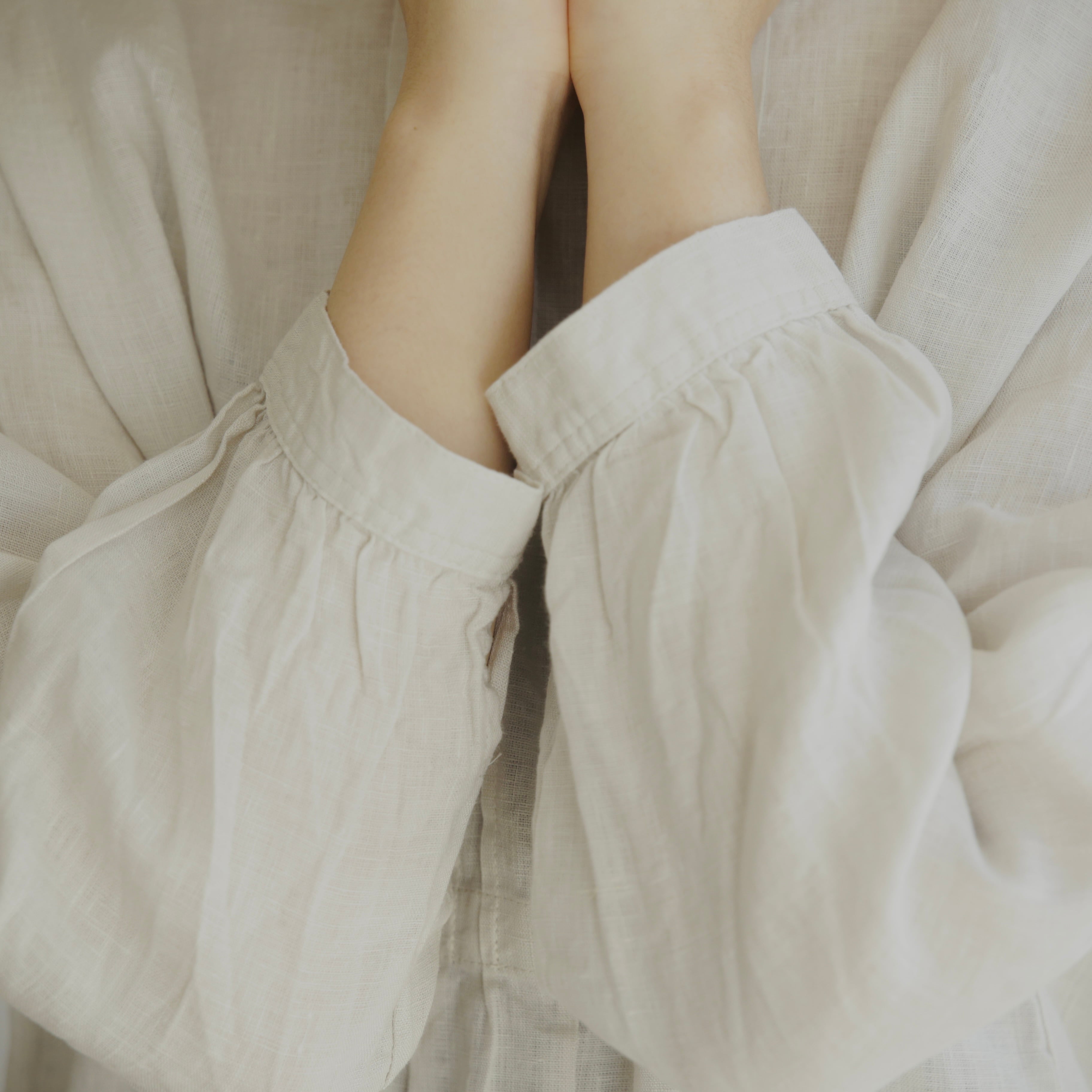 フォグリネンワークのリネンは、厳選されたリトアニア産の素材を使用。ご自宅で気負わずお洗濯ができ、洗うたびに少しずつ柔らかく、くたっと暮らしに馴染んでいきます。服と一緒に、日々の時間も重ねていけたら嬉しいブラウスです。