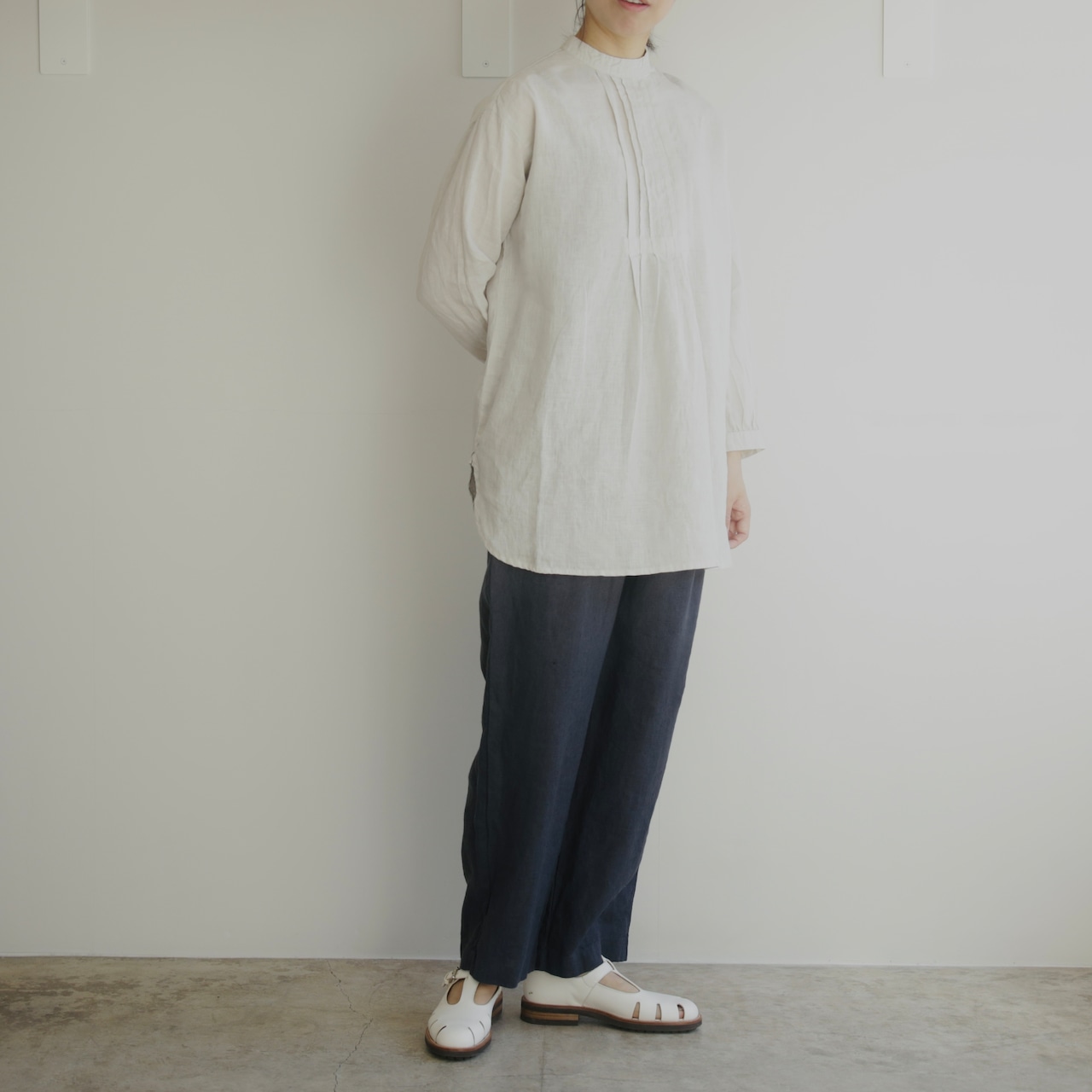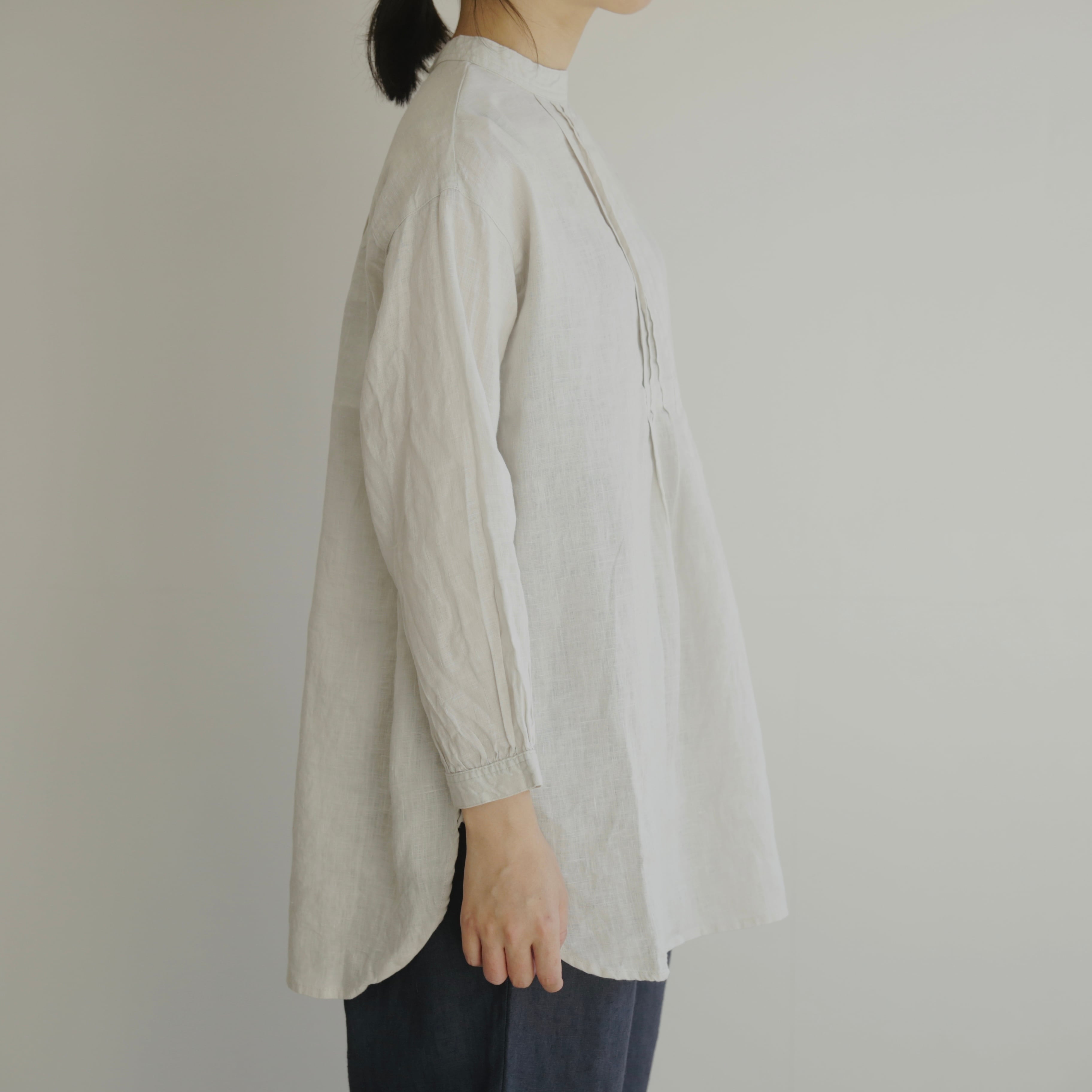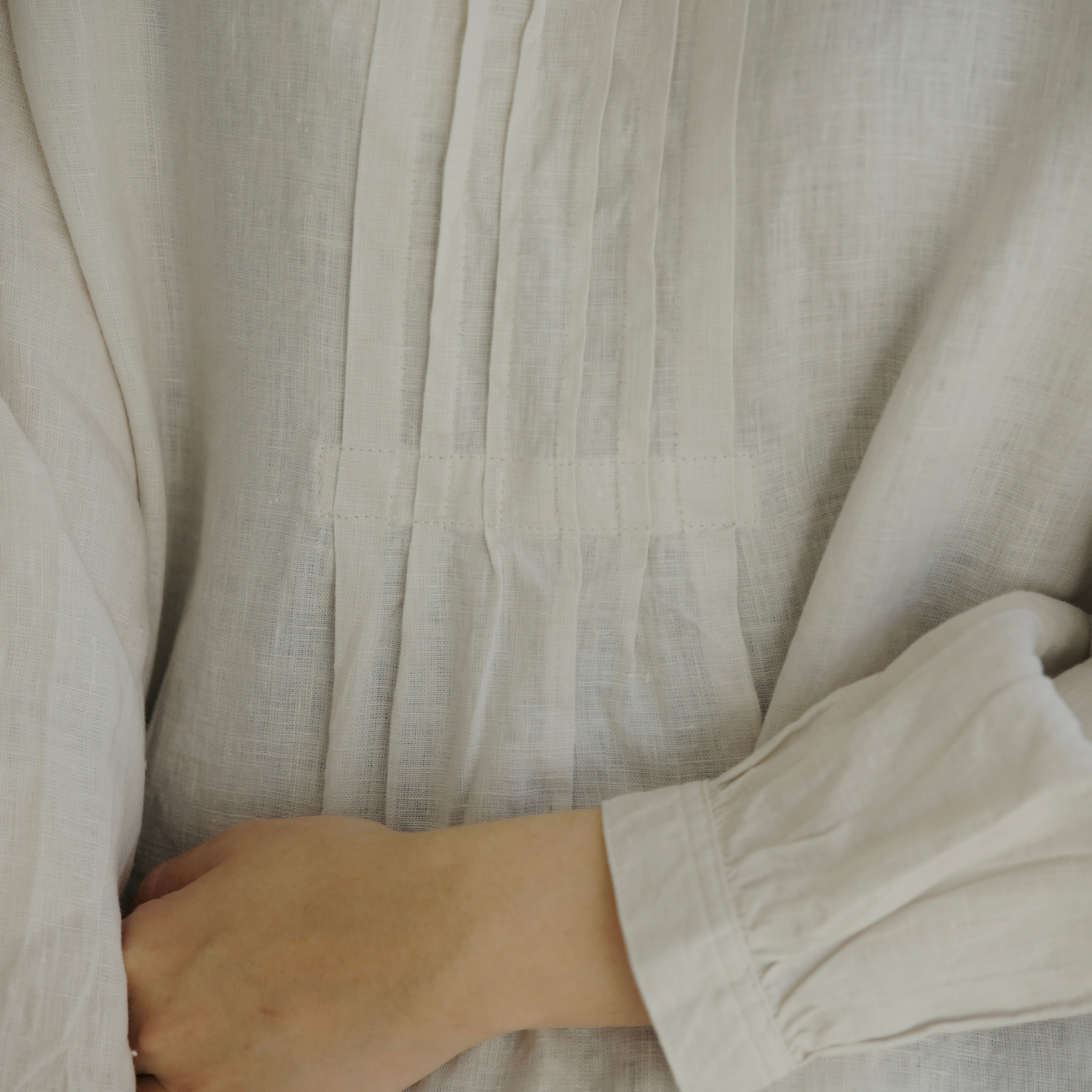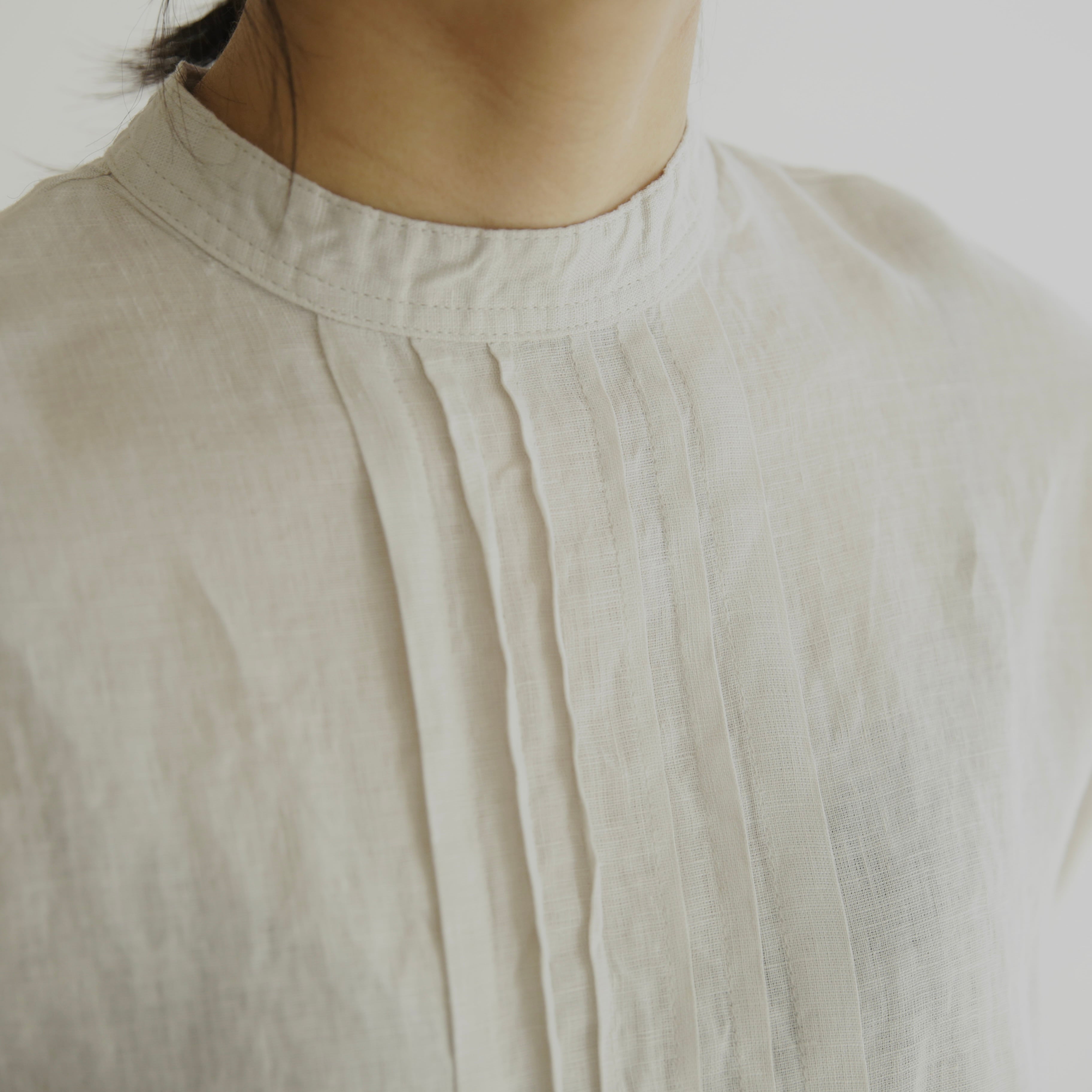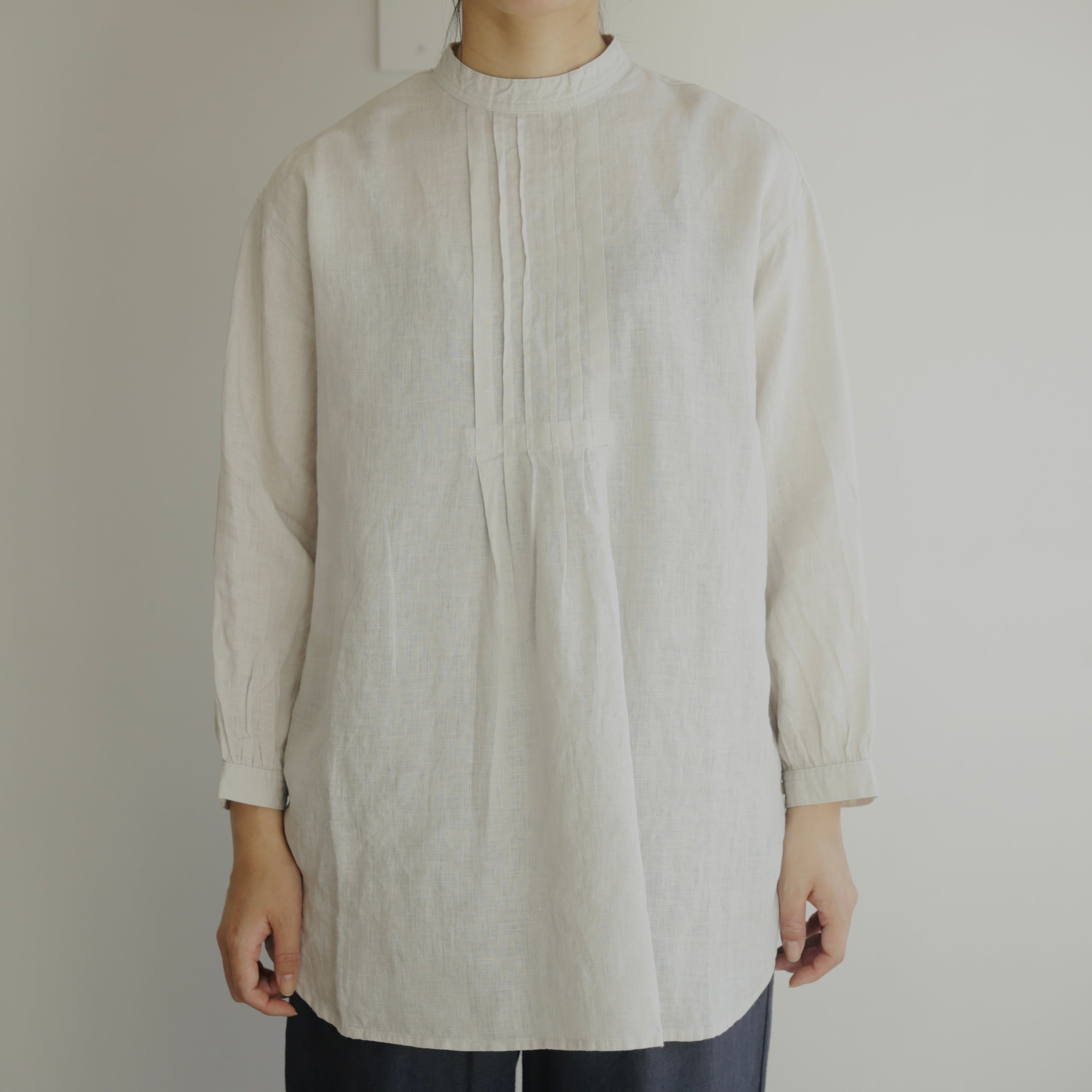 襟元に細やかなピンタックを施したチュニックは、クラシカルで品のよい佇まい。詰まった襟ぐりとカフスがきちんとした印象を添えながら、ドロップショルダーと裾の緩やかなカーブがほどよい抜け感をつくります。