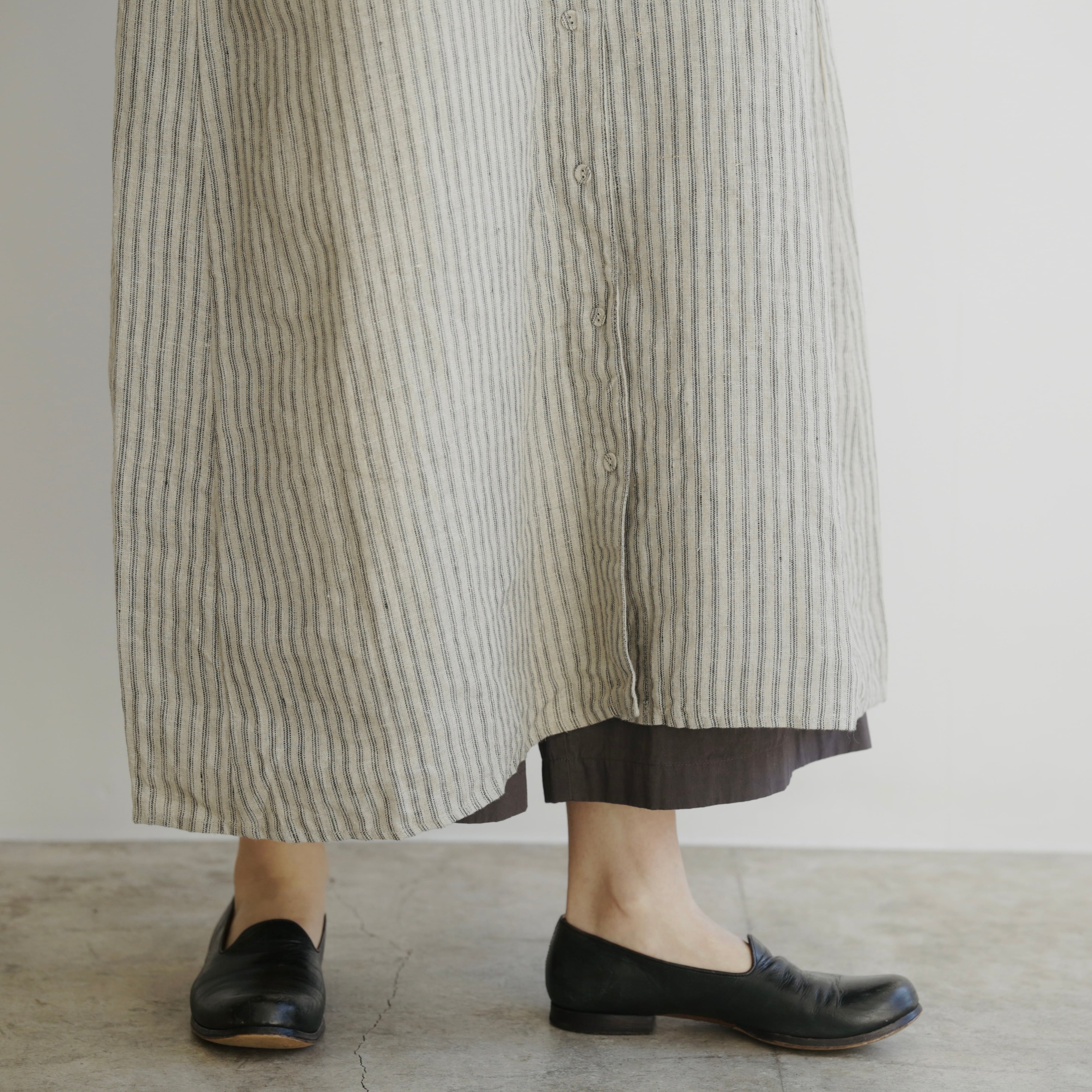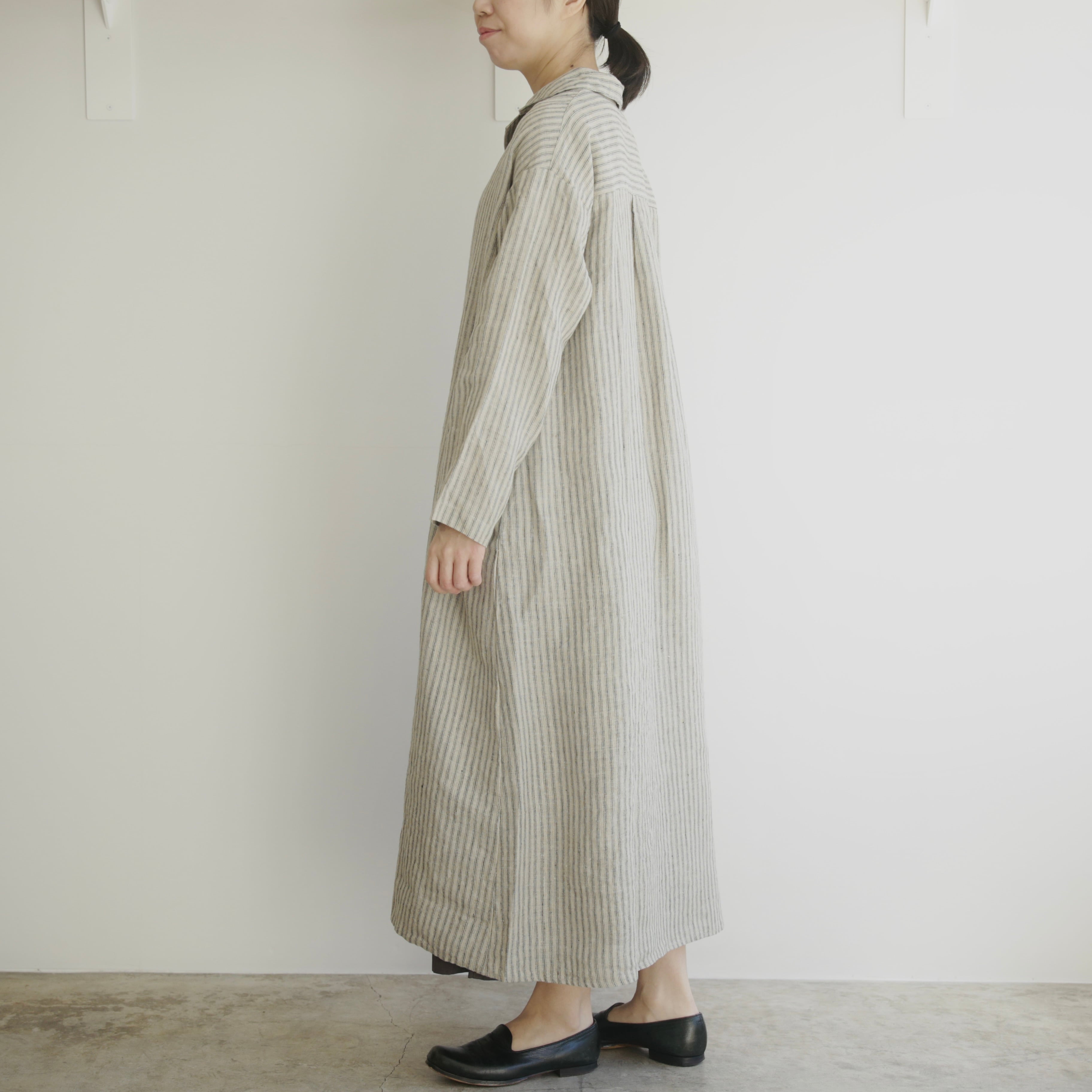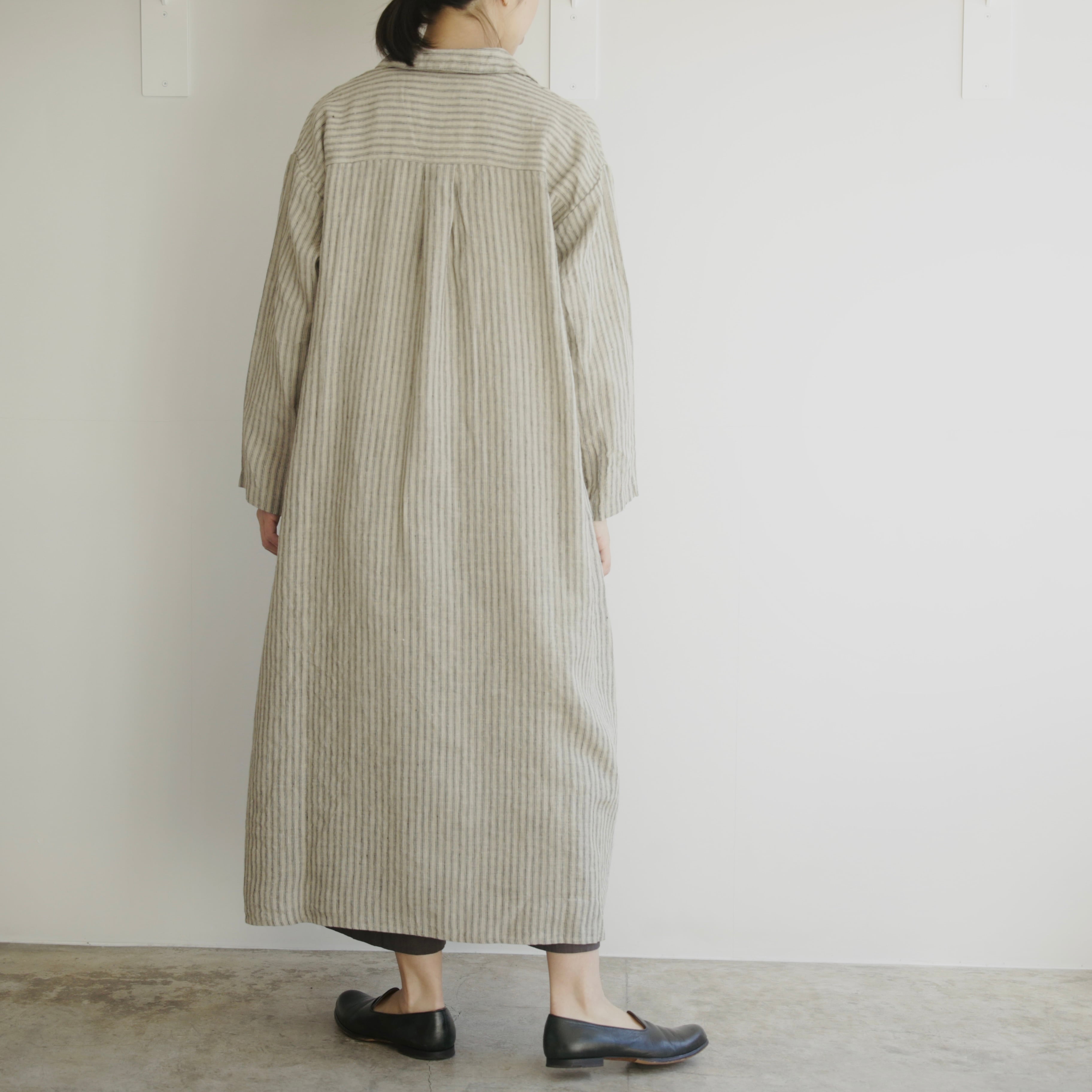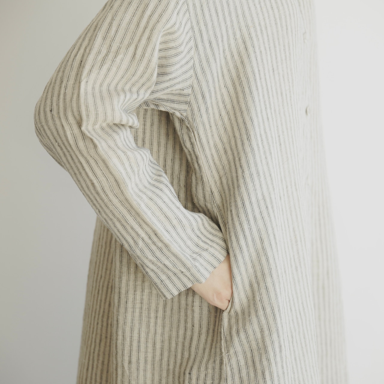新作のストライプ生地はぱっと目を惹く存在感がありながら、縦のラインがすっきりとした印象をつくり、しっかりとした丈感でも軽やかに着こなせます。