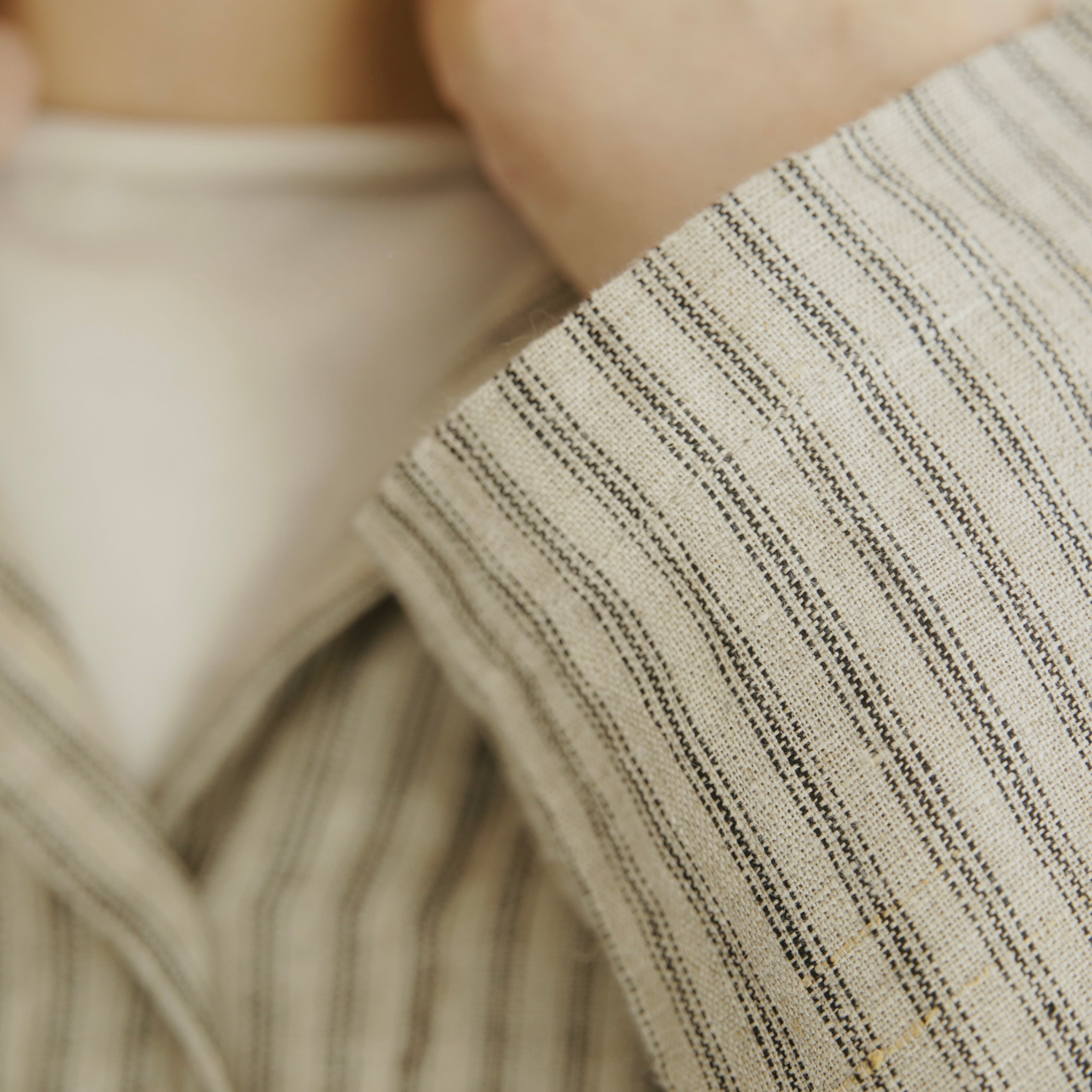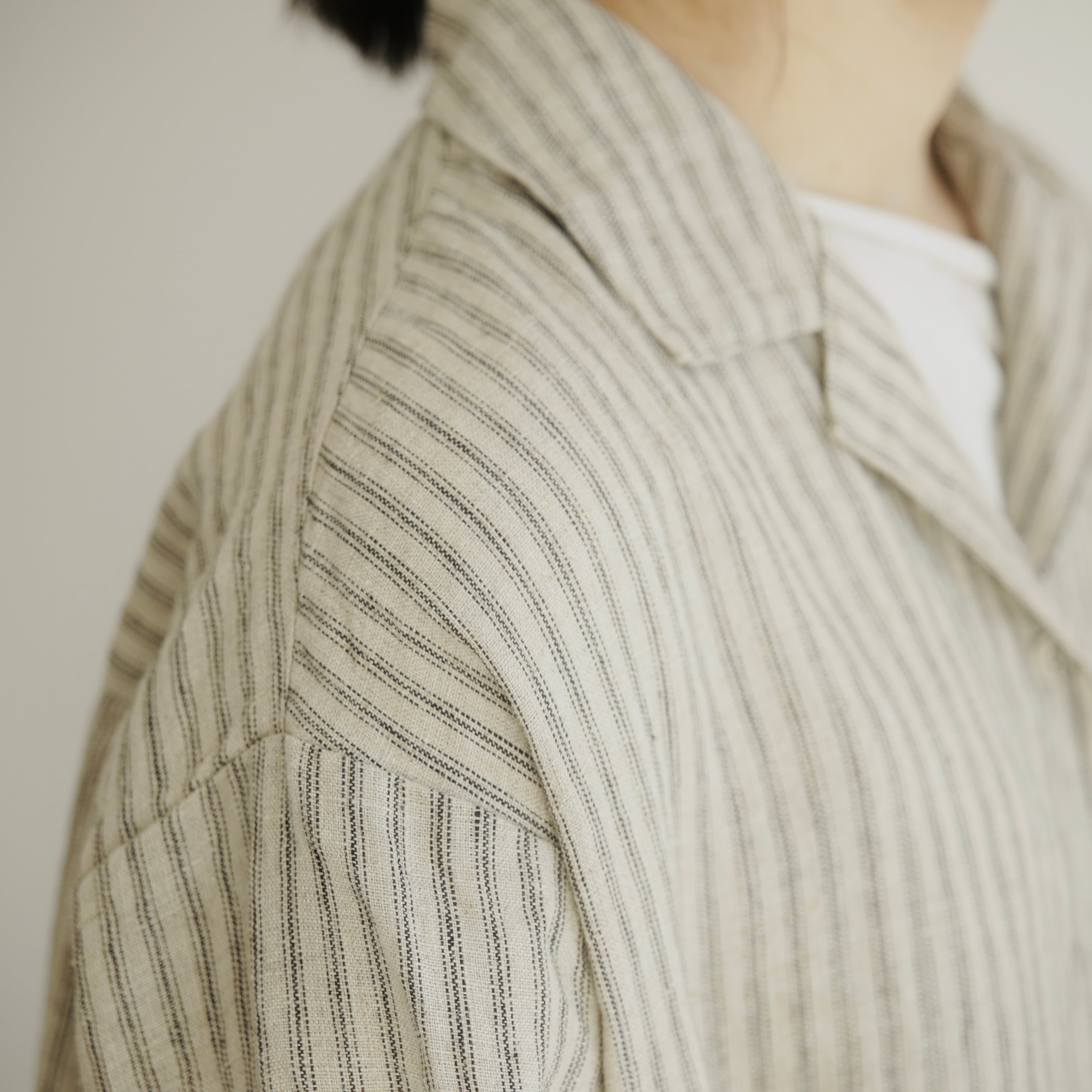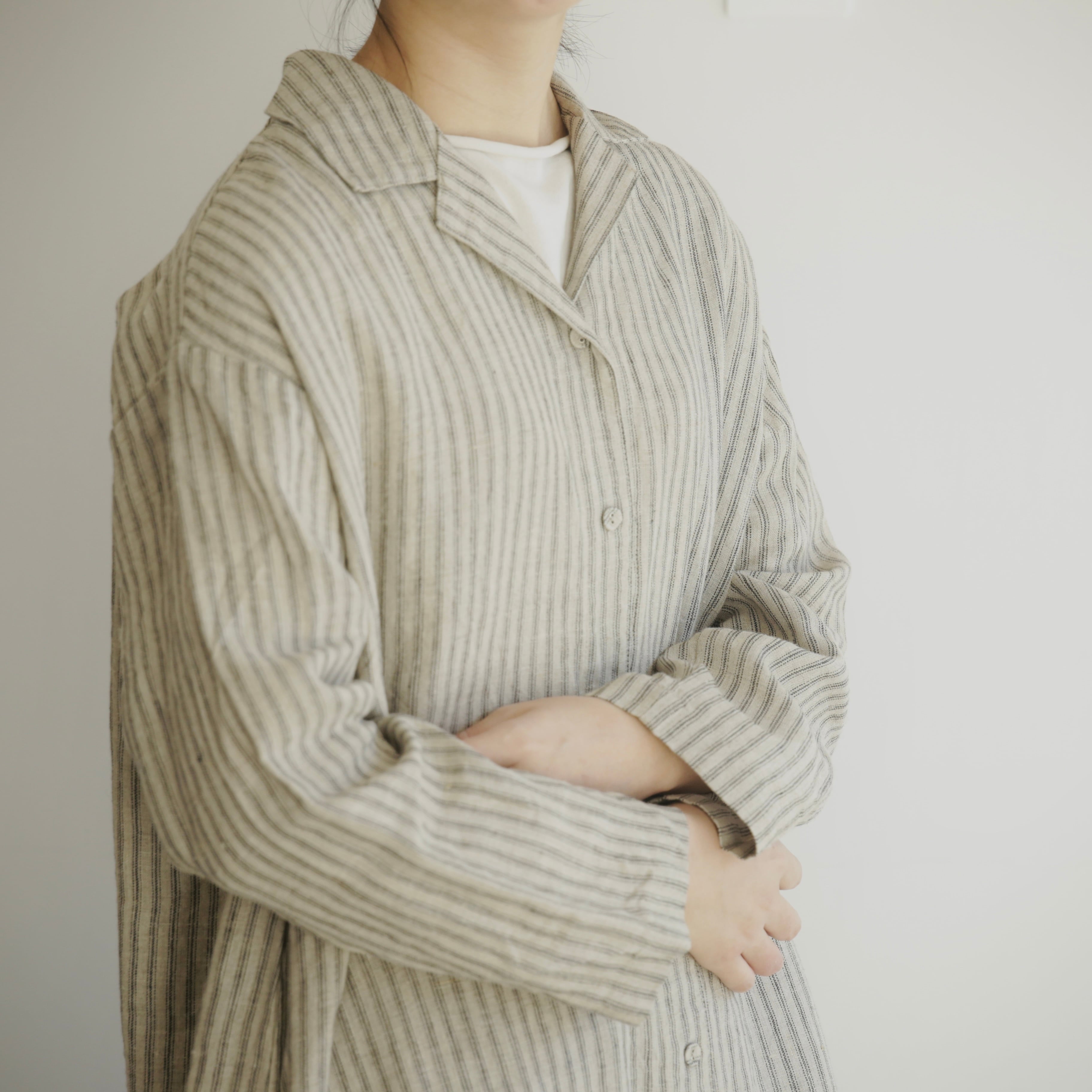 フォグリネンワークのリネンは、厳選されたリトアニア産の素材を使用。ご自宅で気負わずお洗濯ができ、洗うたびに少しずつ柔らかく、くたっと暮らしに馴染んでいきます。服と一緒に、日々の時間も重ねていけたら嬉しいブラウスです。