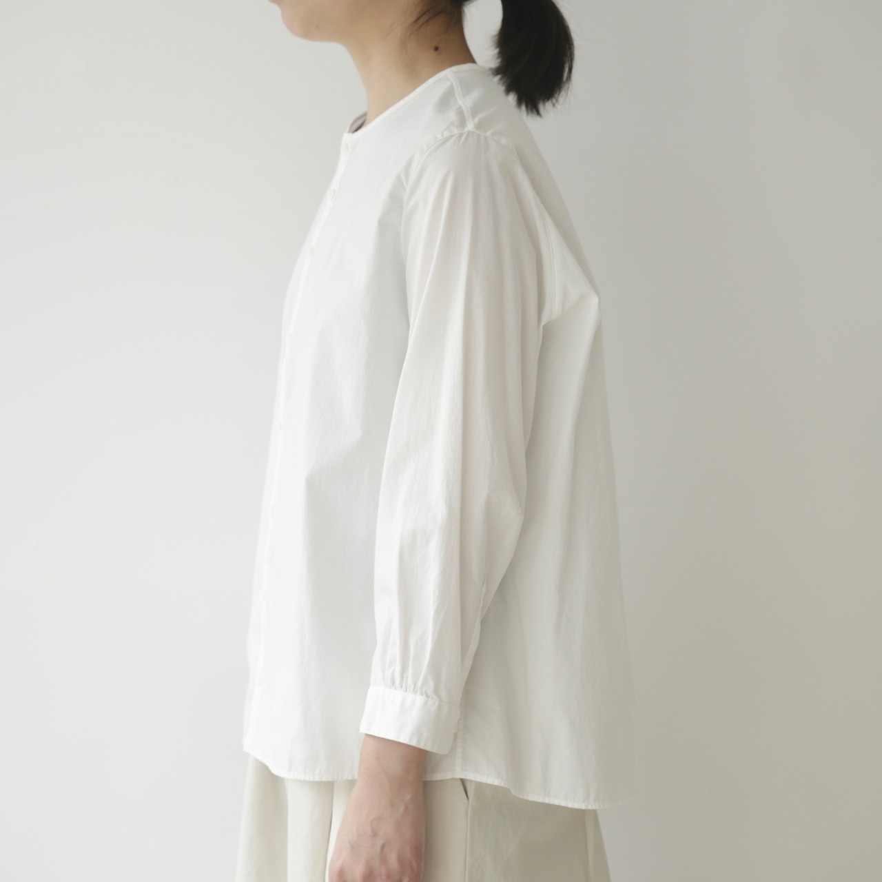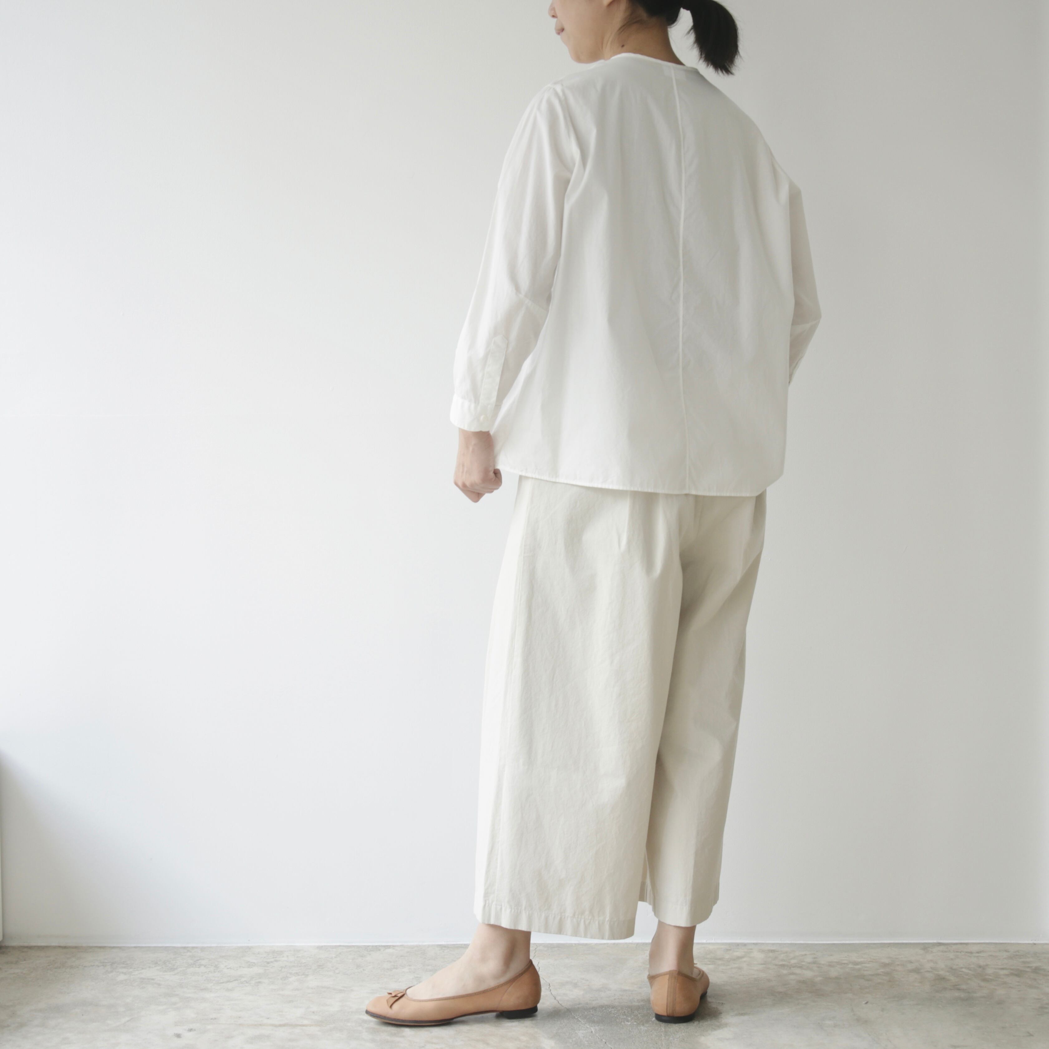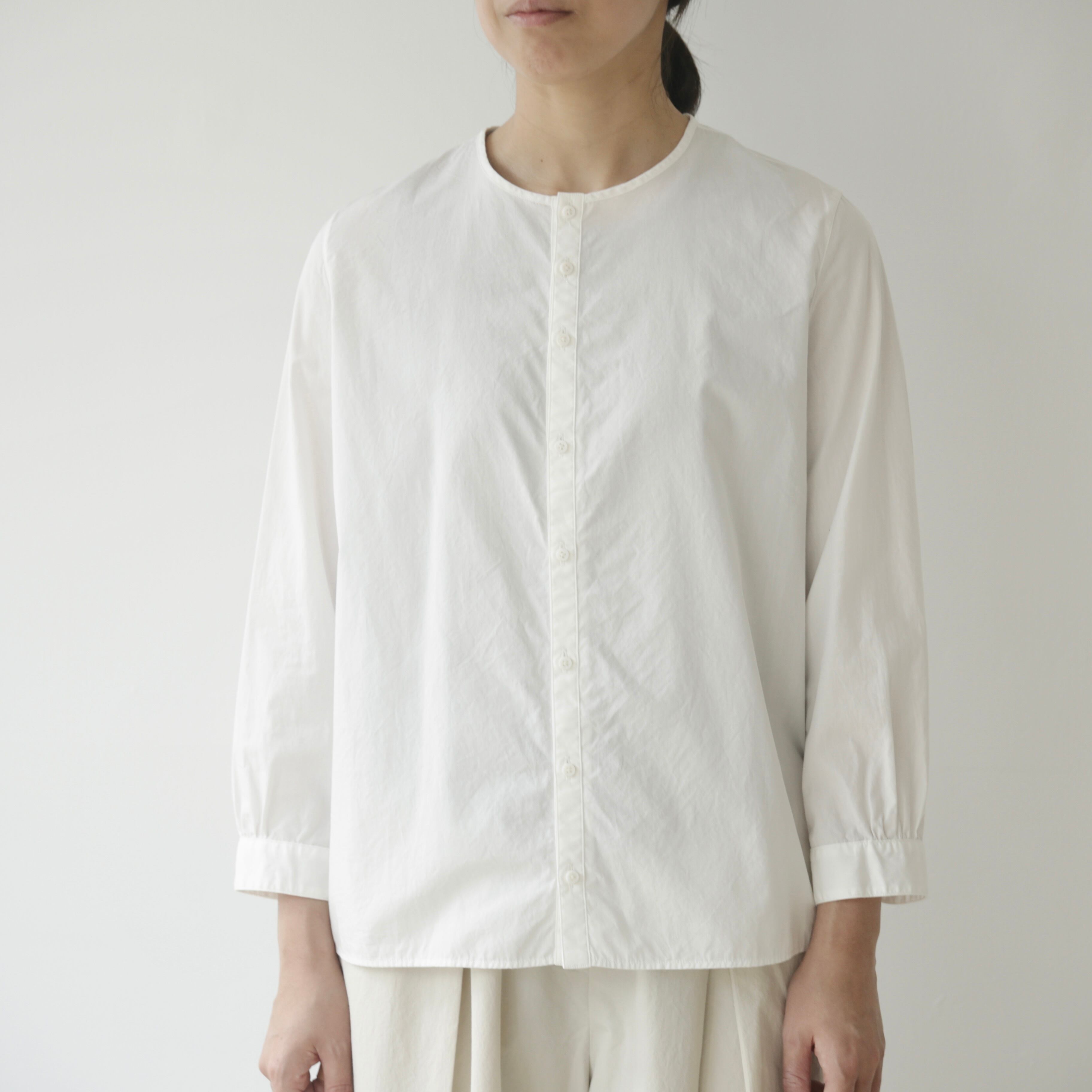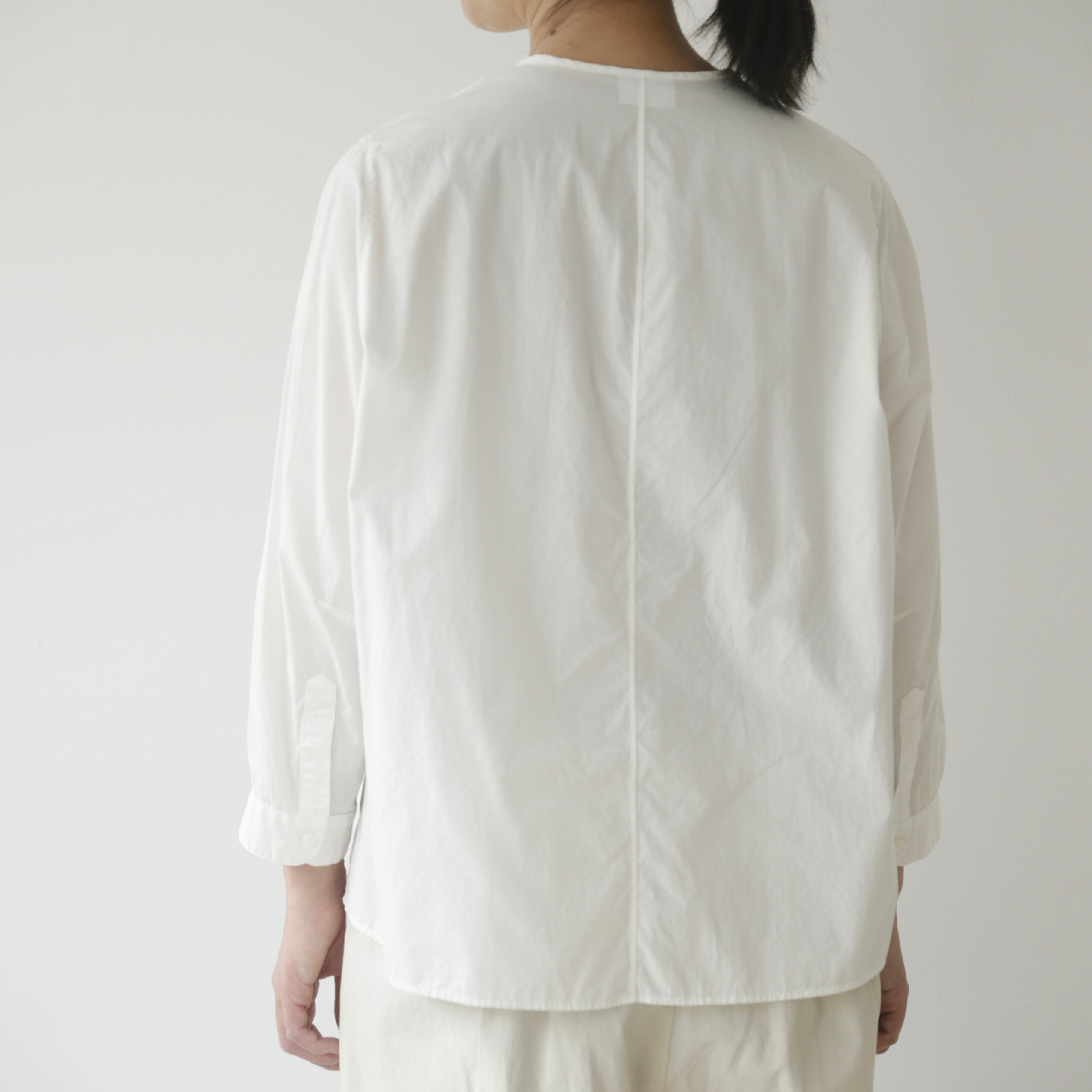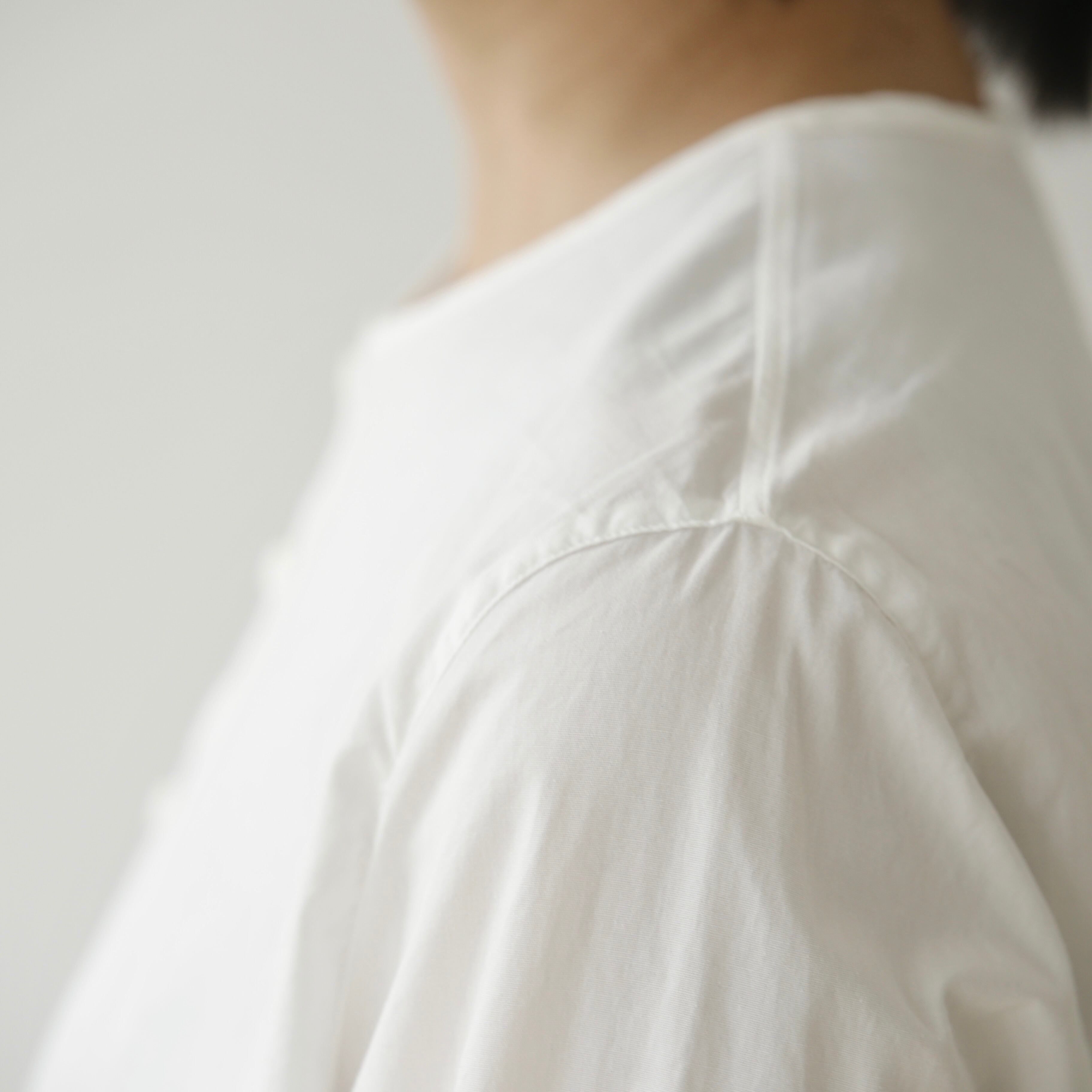 ノーコントロールエア定番のノーカラーシャツ。ベーシックでありながら細部にブランドらしさが宿る一枚です。体のラインを拾わないゆとりを持たせつつ肩幅はややコンパクトに整えることで全体を引き締め凛とした表情に導き、肘の切り替えや立体的なパターン、やや前振りに設計された袖など随所に細やかな工夫が凝らされており、着るだけで自然と品のある佇まいが生まれます。