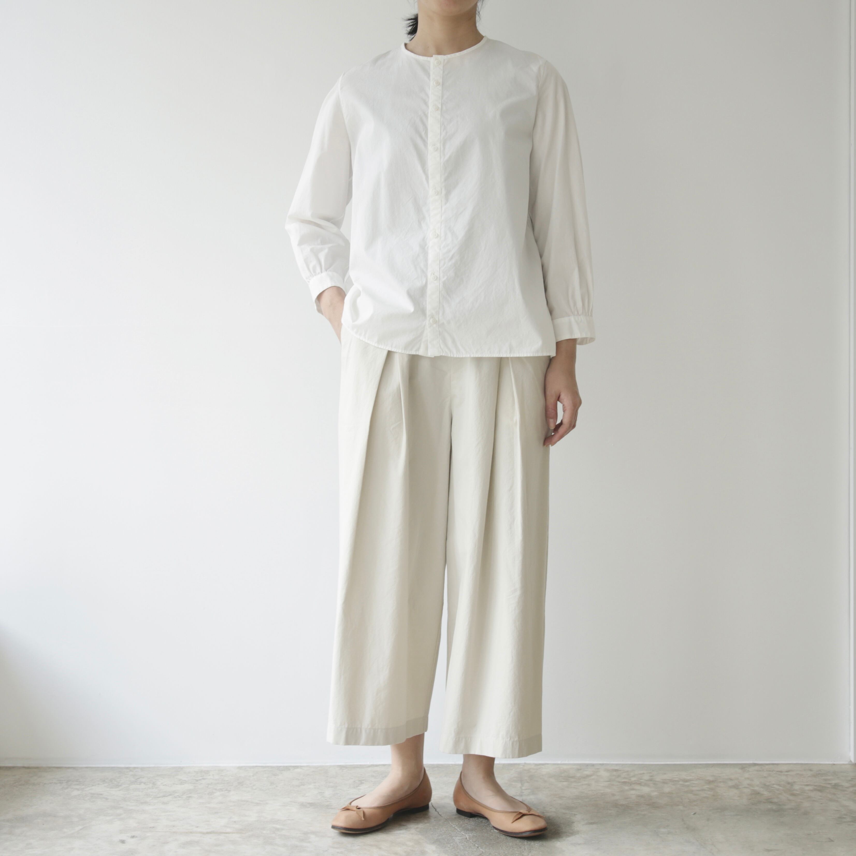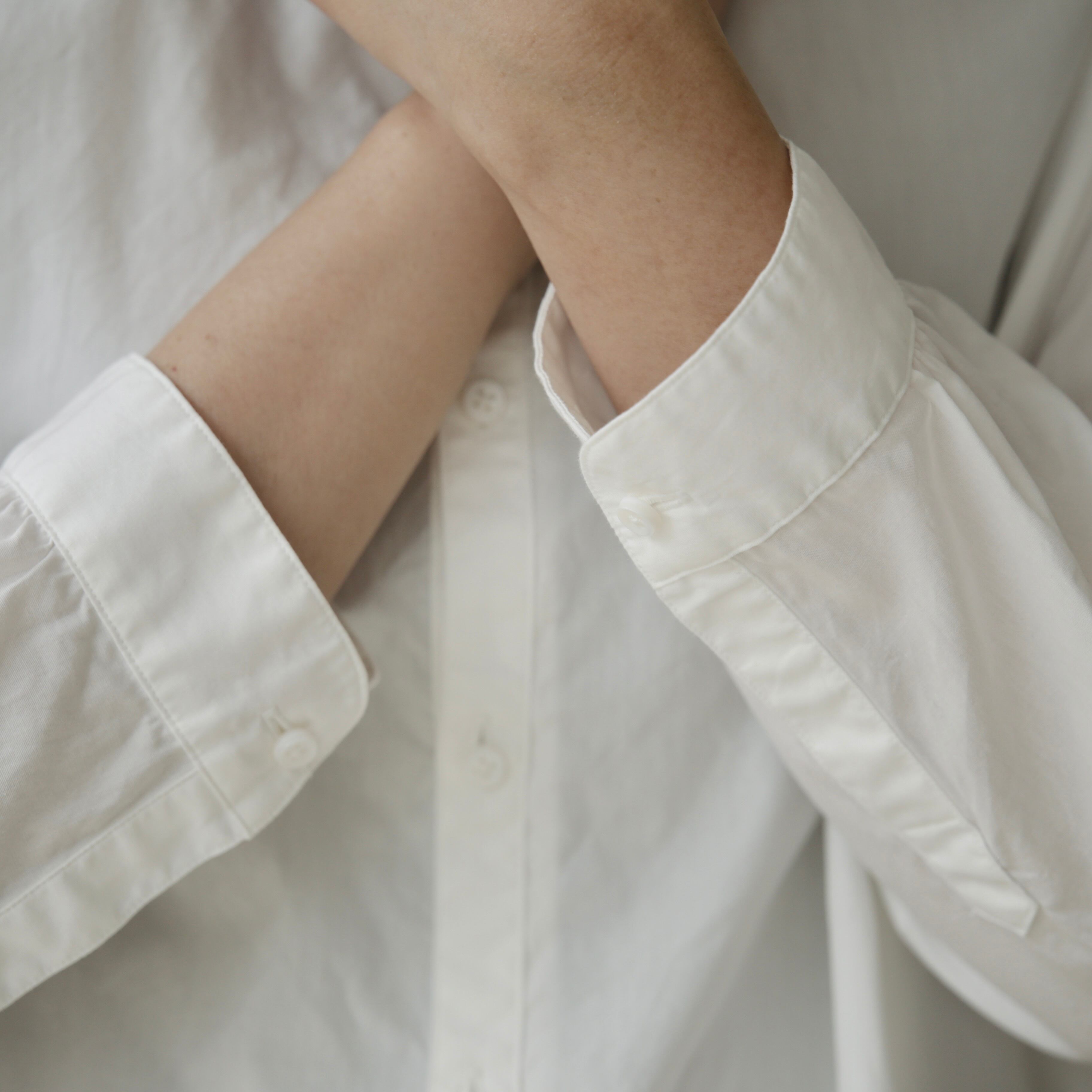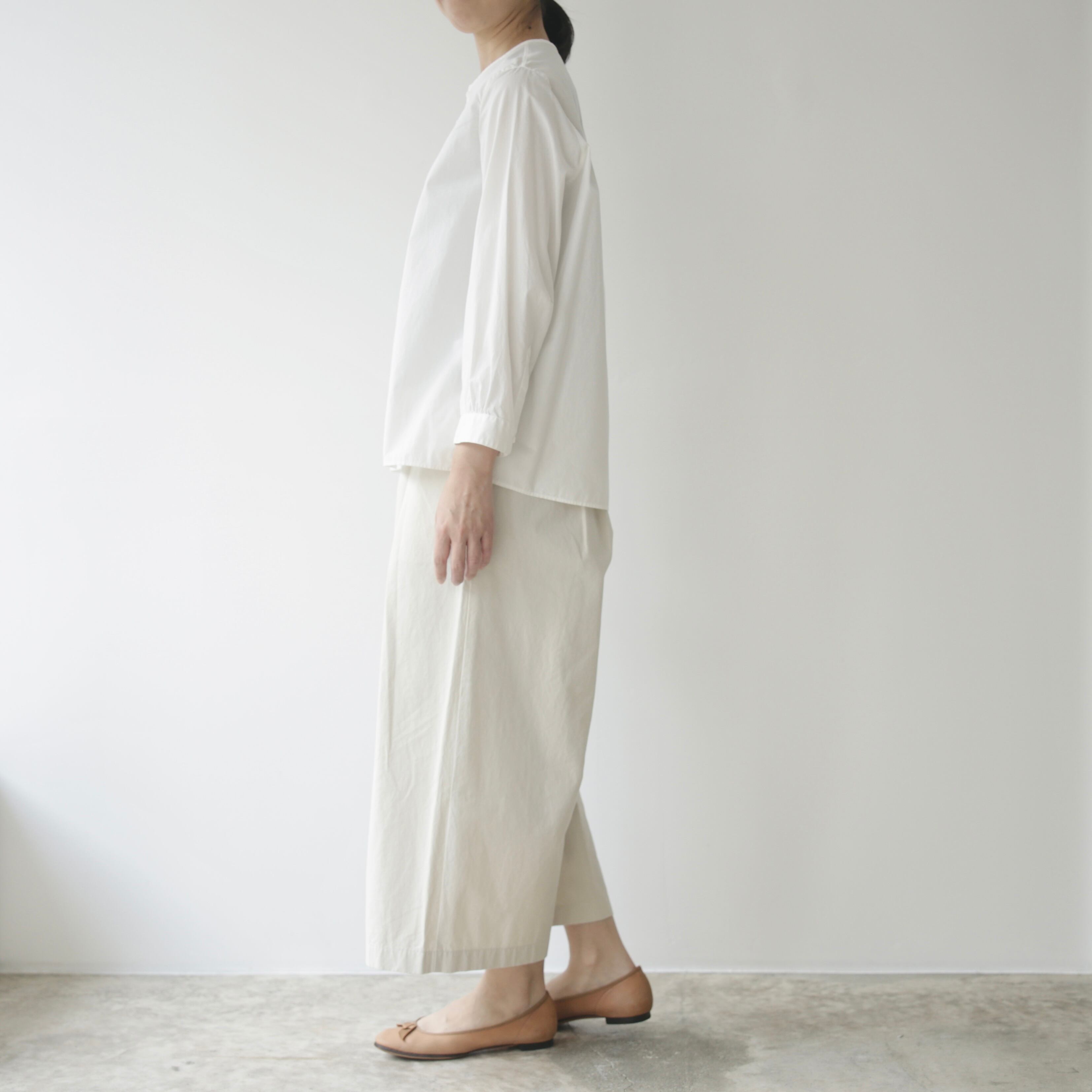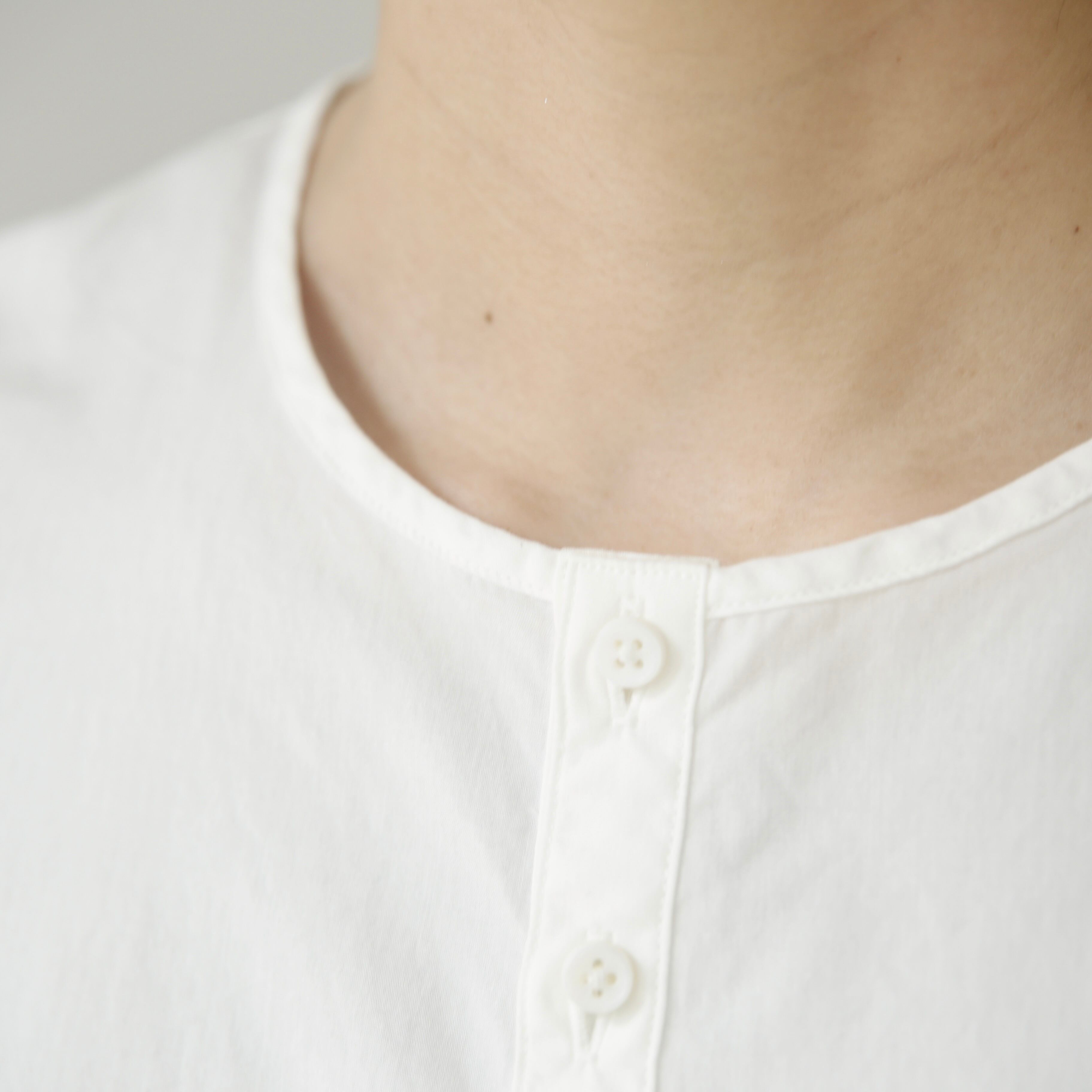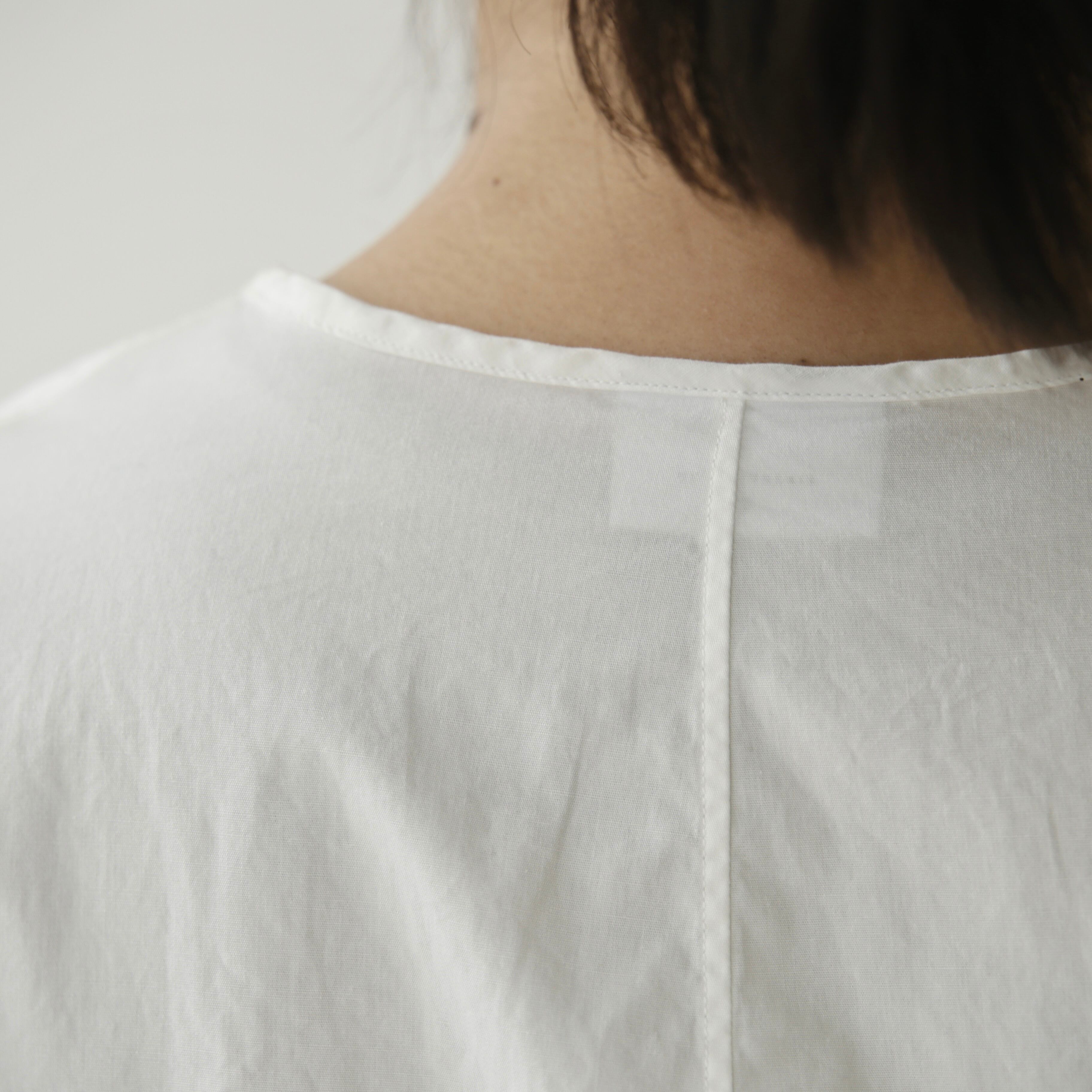 ノーコントロールエア定番のノーカラーシャツ。ベーシックでありながら細部にブランドらしさが宿る一枚です。体のラインを拾わないゆとりを持たせつつ肩幅はややコンパクトに整えることで全体を引き締め凛とした表情に導き、肘の切り替えや立体的なパターン、やや前振りに設計された袖など随所に細やかな工夫が凝らされており、着るだけで自然と品のある佇まいが生まれます。