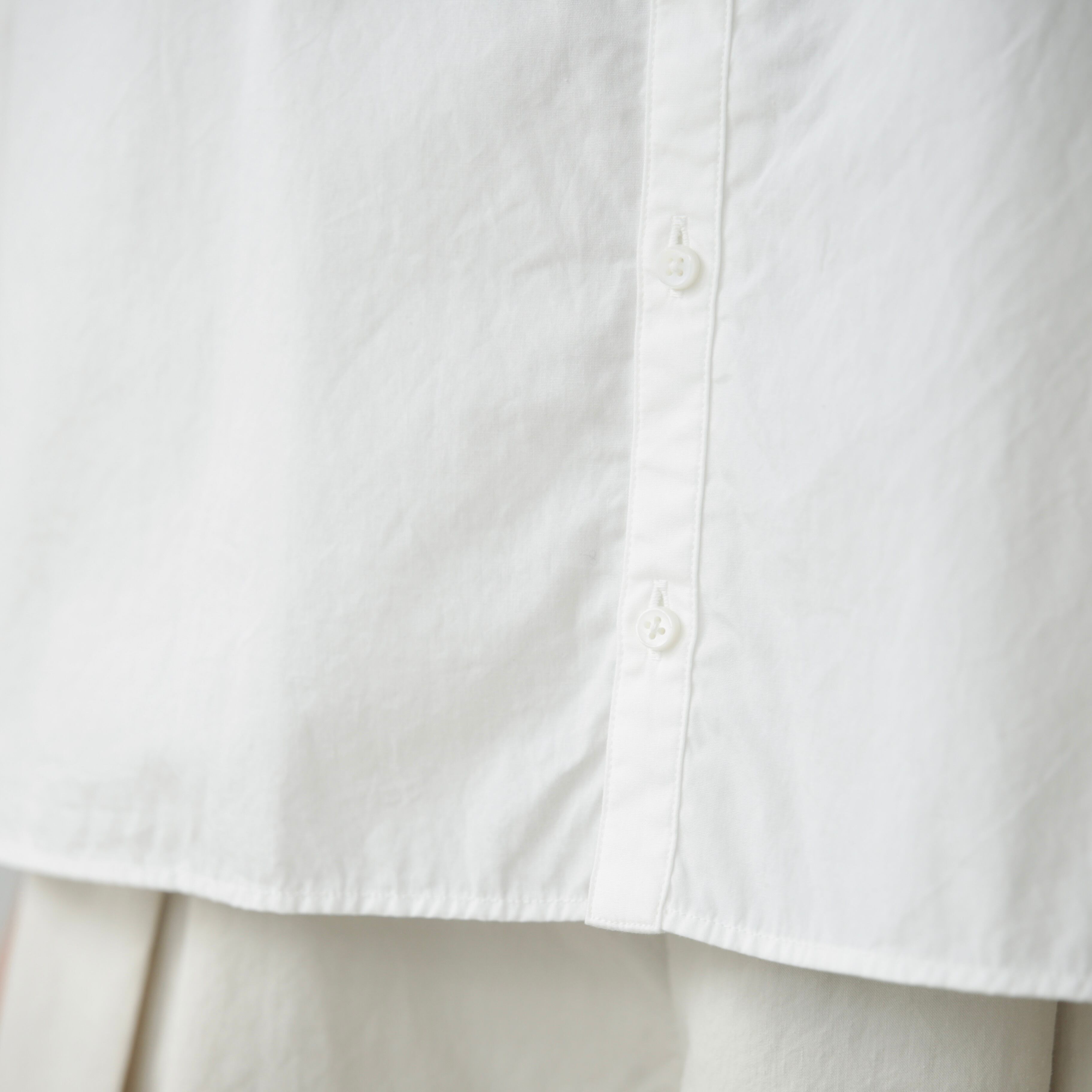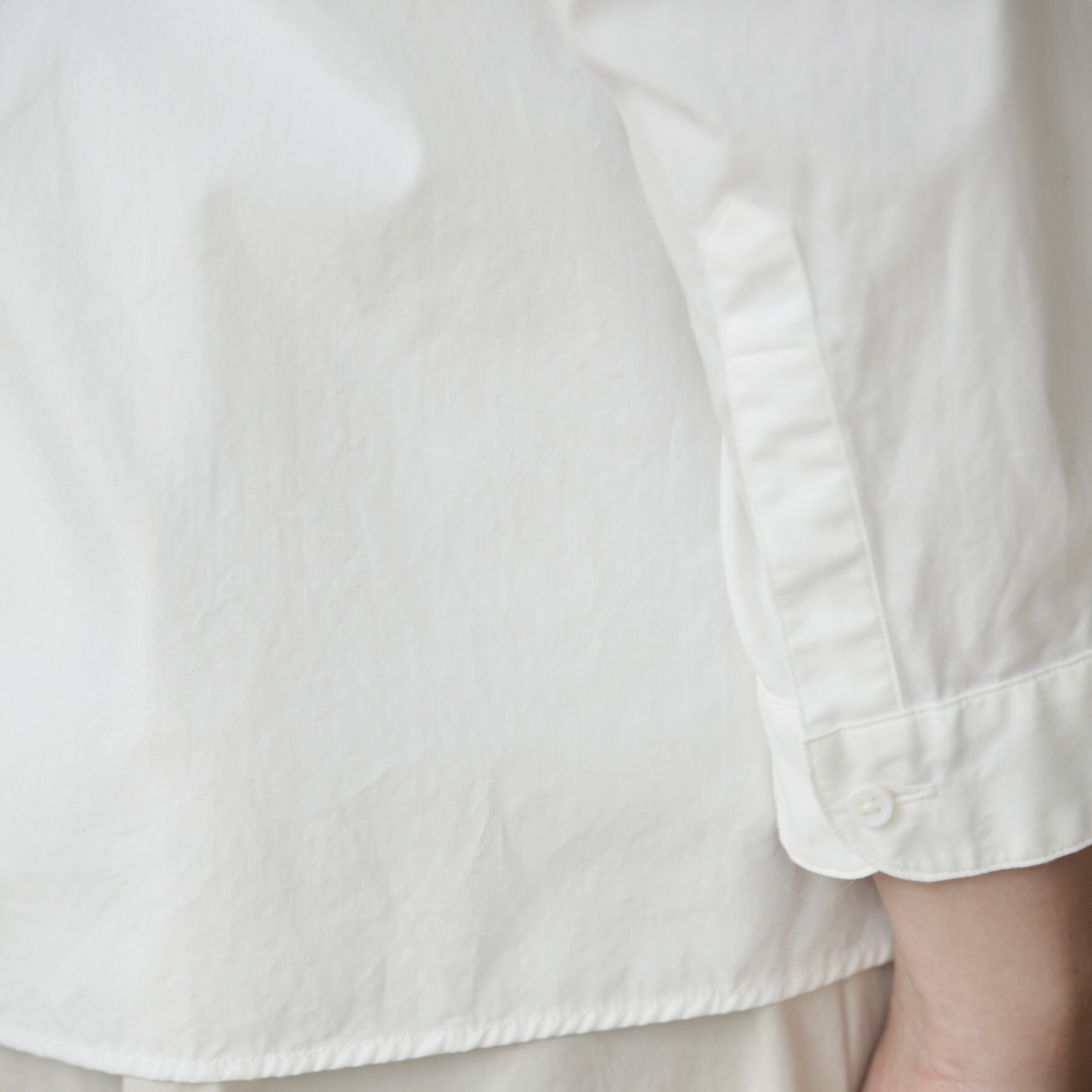 コーミングした綿を使用した生地はさらりとした肌触りでこれからの季節にも心地よく、製品洗いを施すことで縮みを抑えつつほどよくラフな表情に仕上げられており、デニムと合わせて軽やかに、スカートと合わせてやわらかな印象にも寄り添い、ボタンを外して羽織としても楽しめる着回しの効く1枚です。
