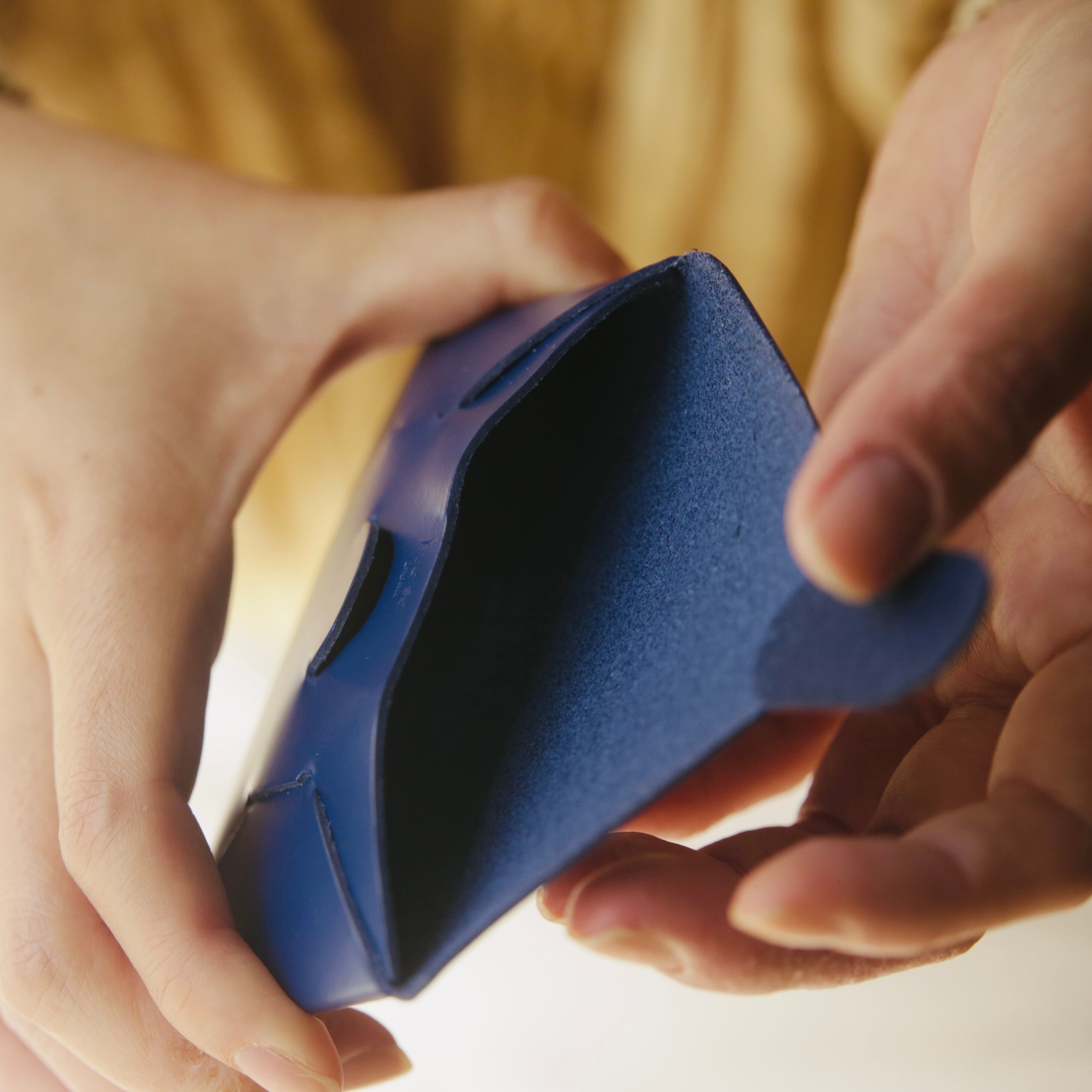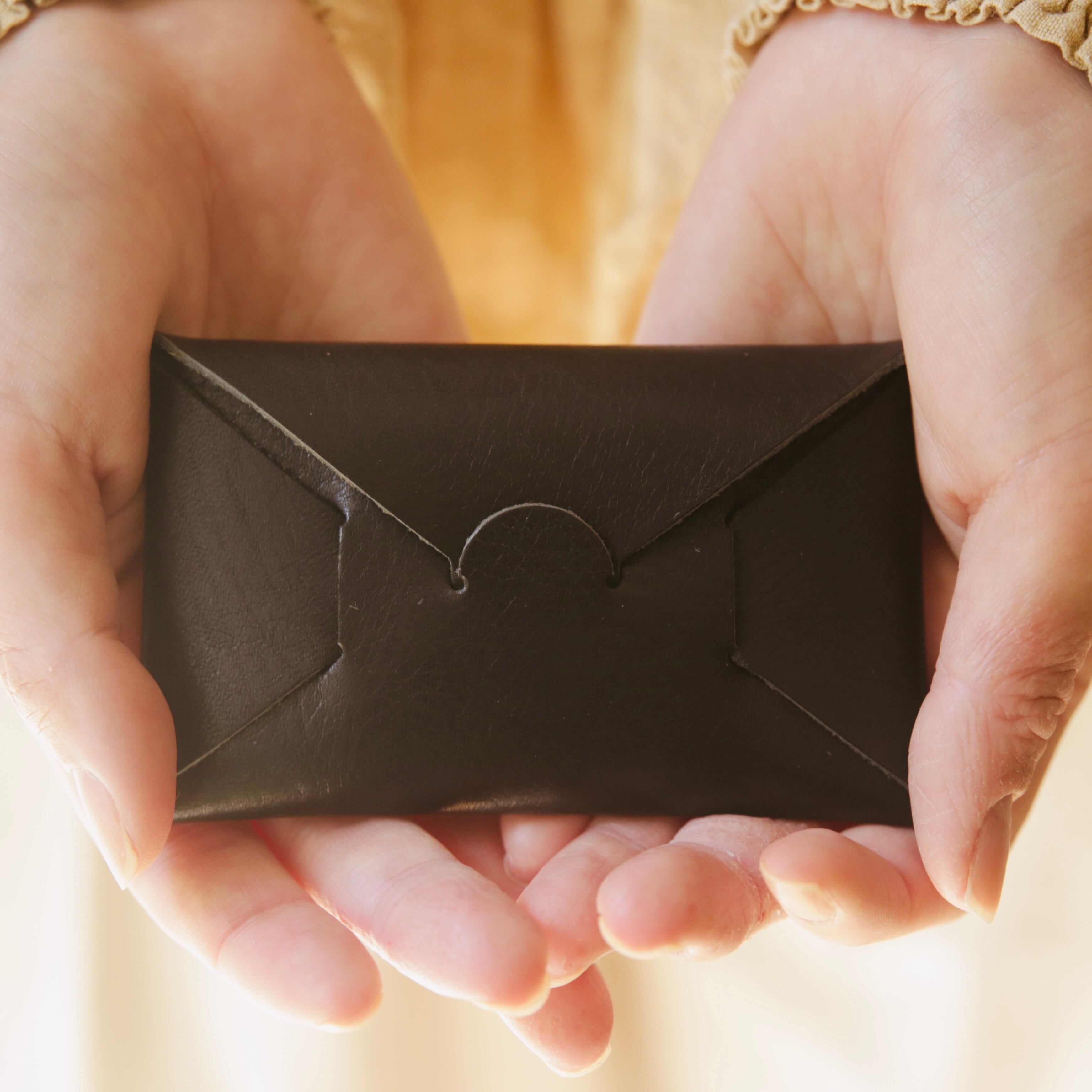 ブランドの哲学がそのまま宿った、定番のカードケースです。縫い目のないすっきりとしたフォルムは、折り紙を思わせるような潔さ。スリットにゆとりを持たせた設計により、カードの枚数に合わせて革が自然と馴染み、見た目以上の収納力を発揮します。