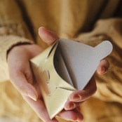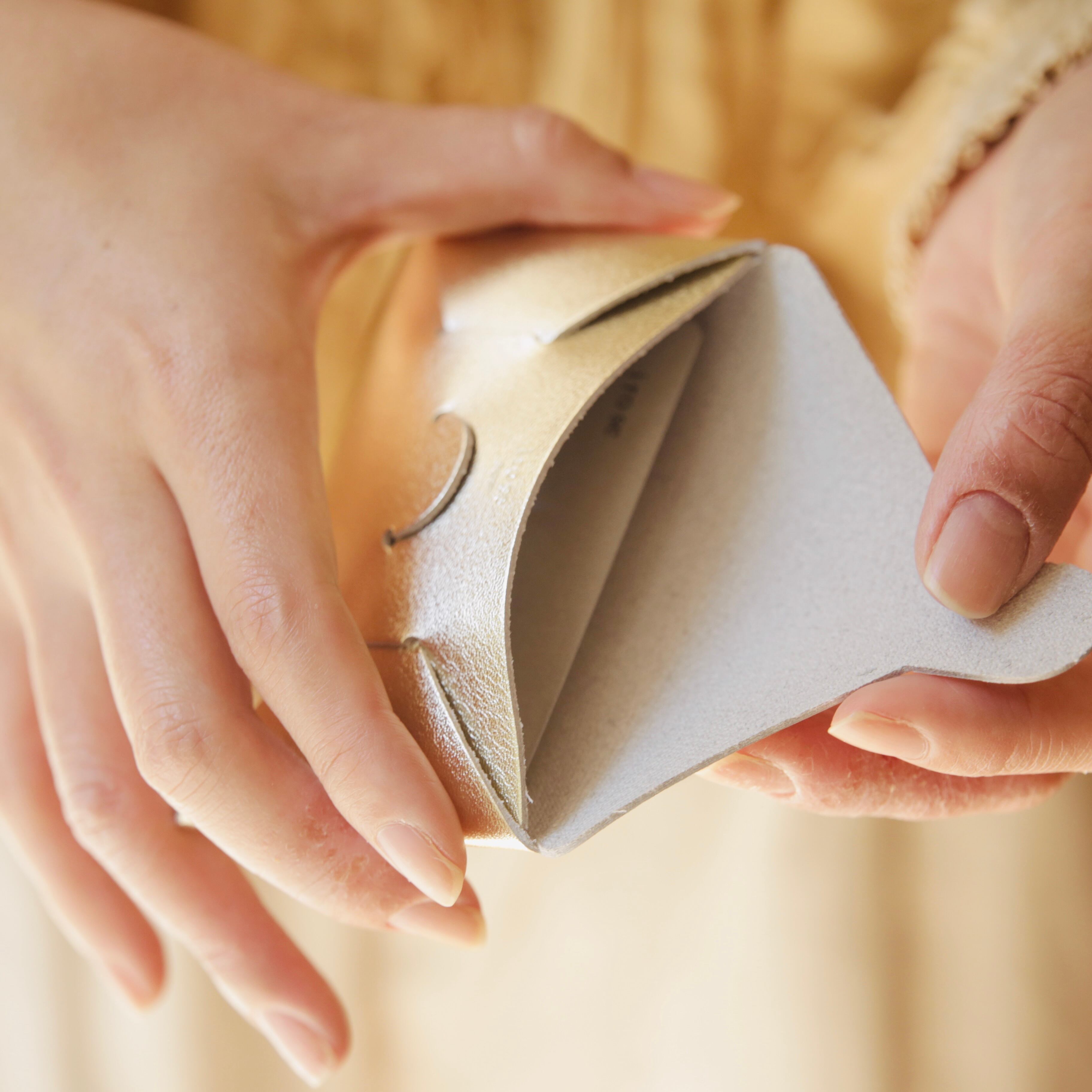 一枚の革を、縫わずに折り込み、組み立てる。
