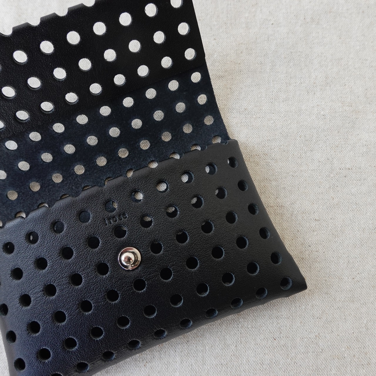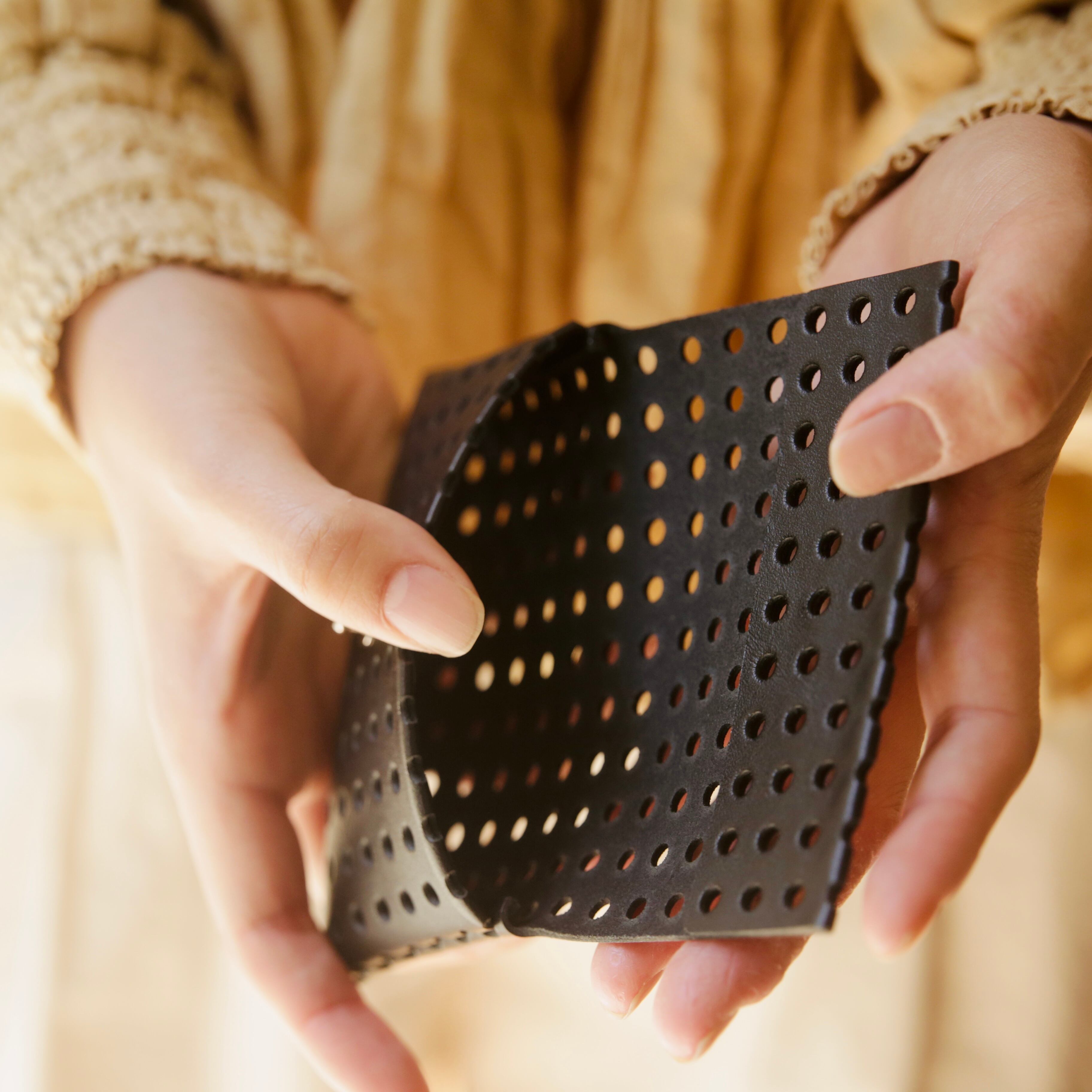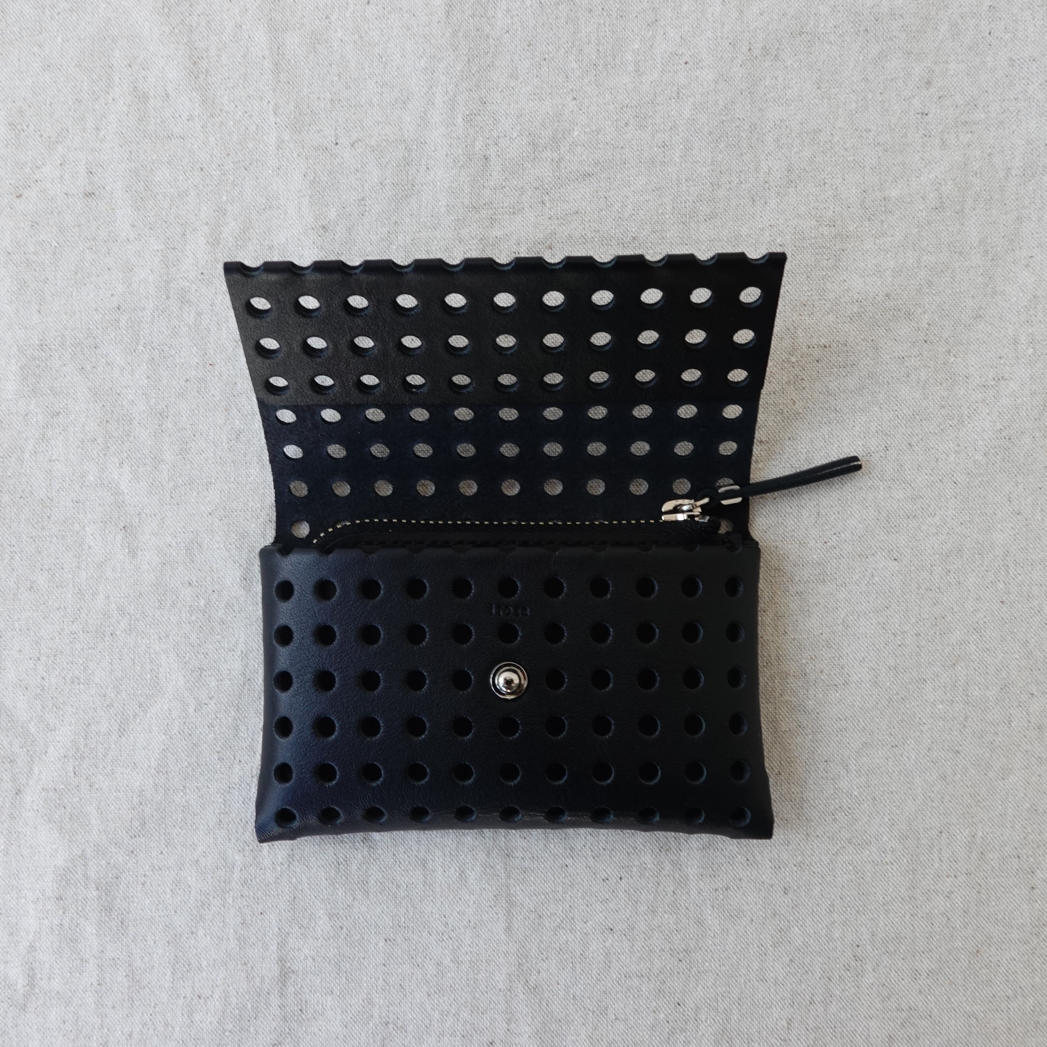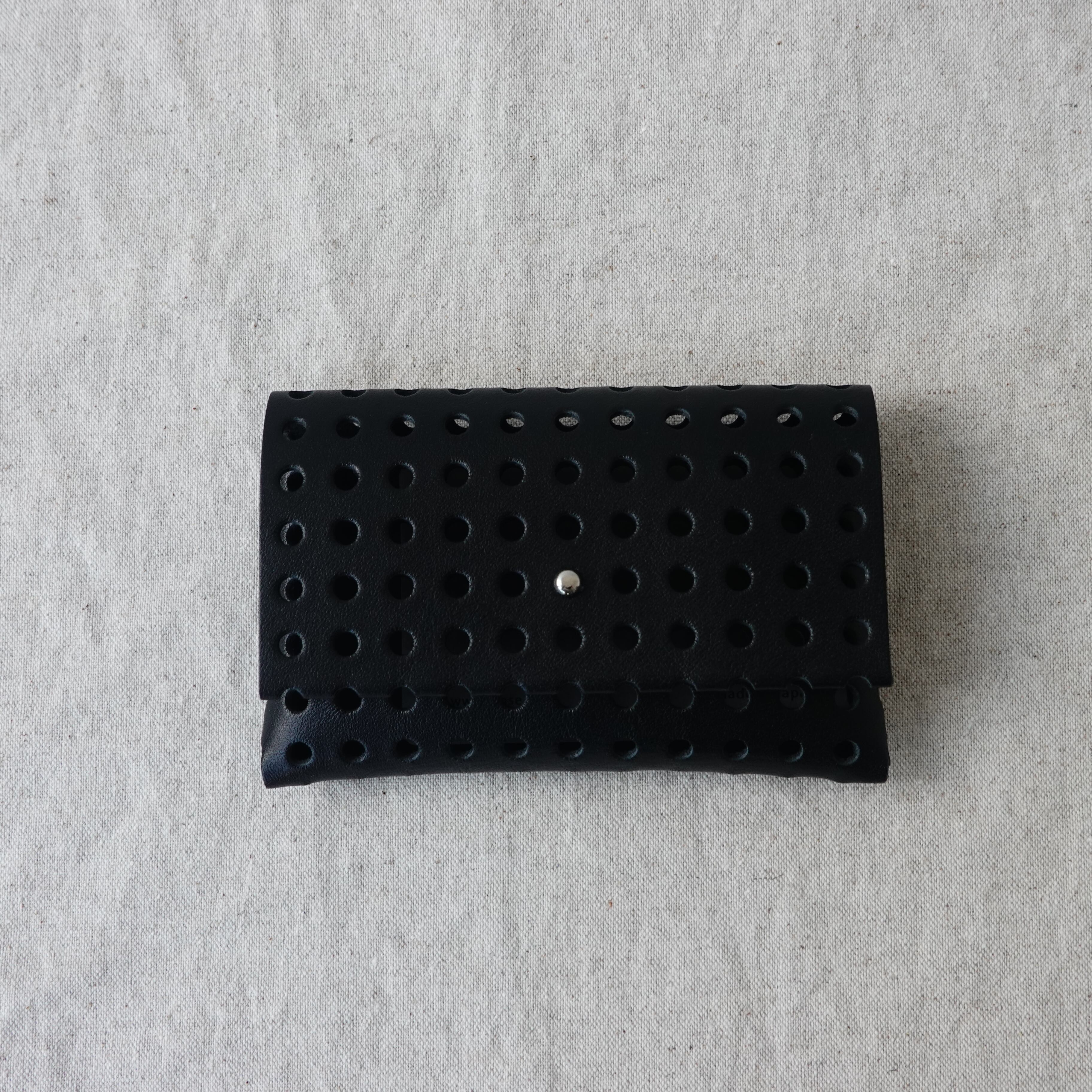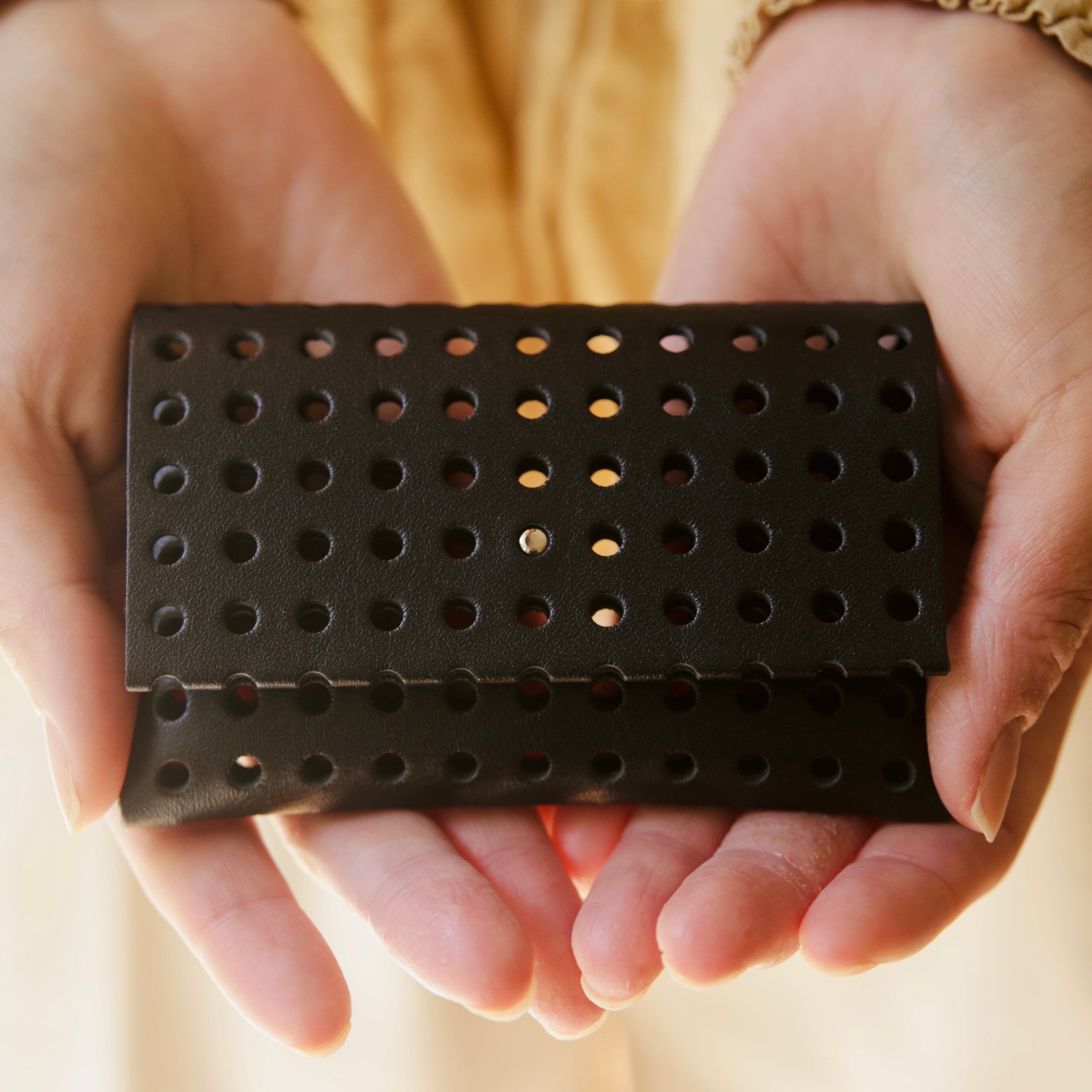 無数の穴が生み出す独特なフォルムは、小さなカードケースとは思えない存在感。手にすると自然と馴染み、遊び心と使いやすさが静かに共存しています。