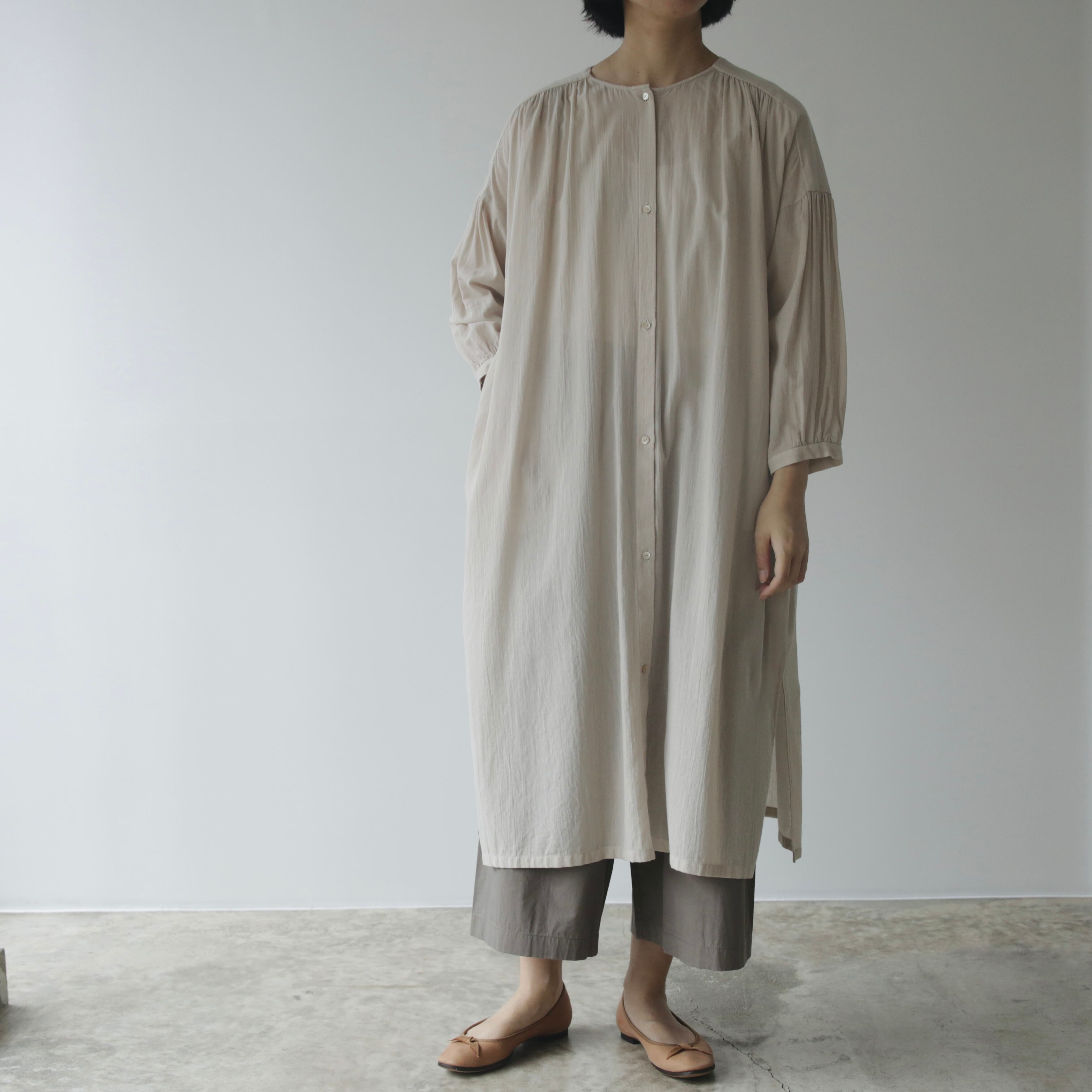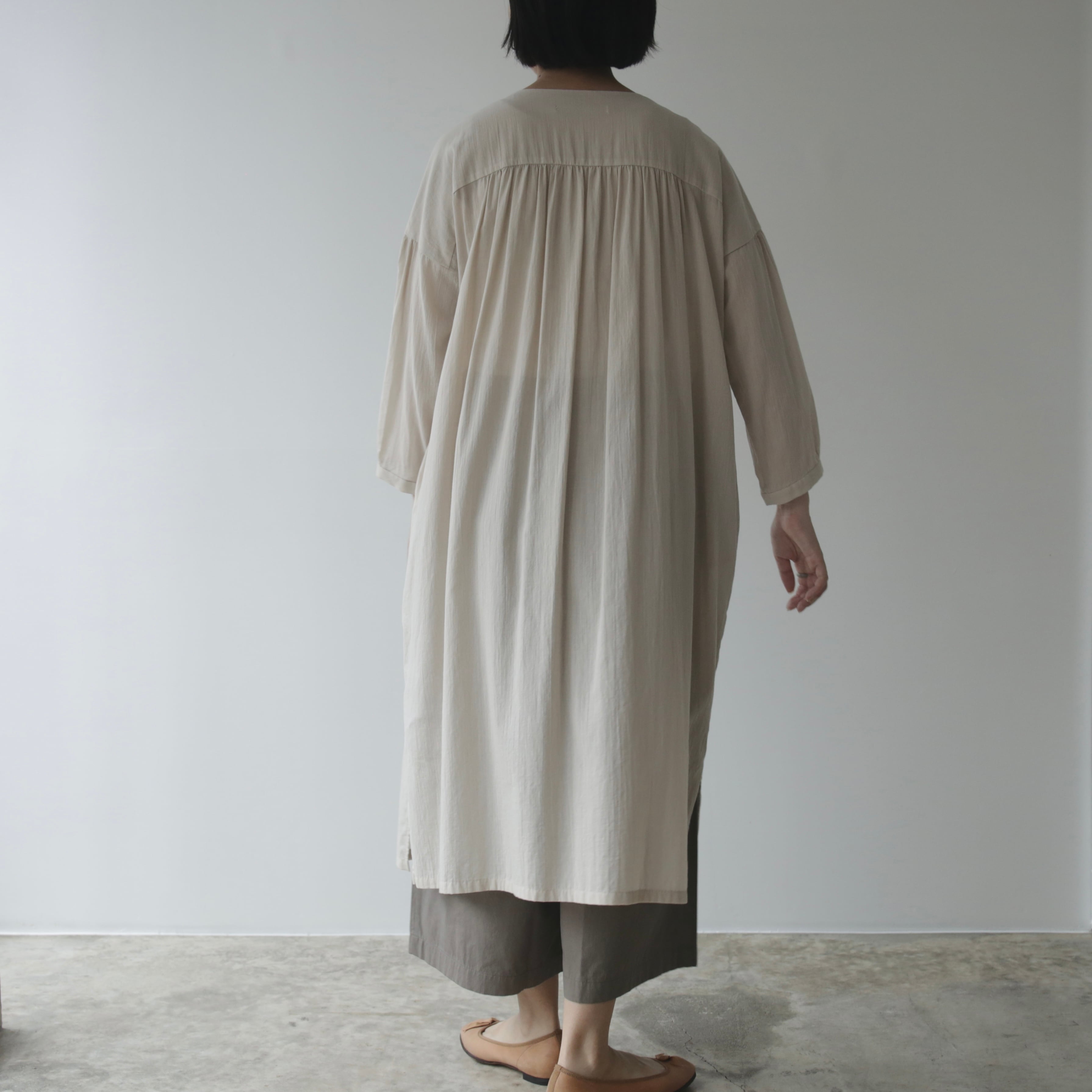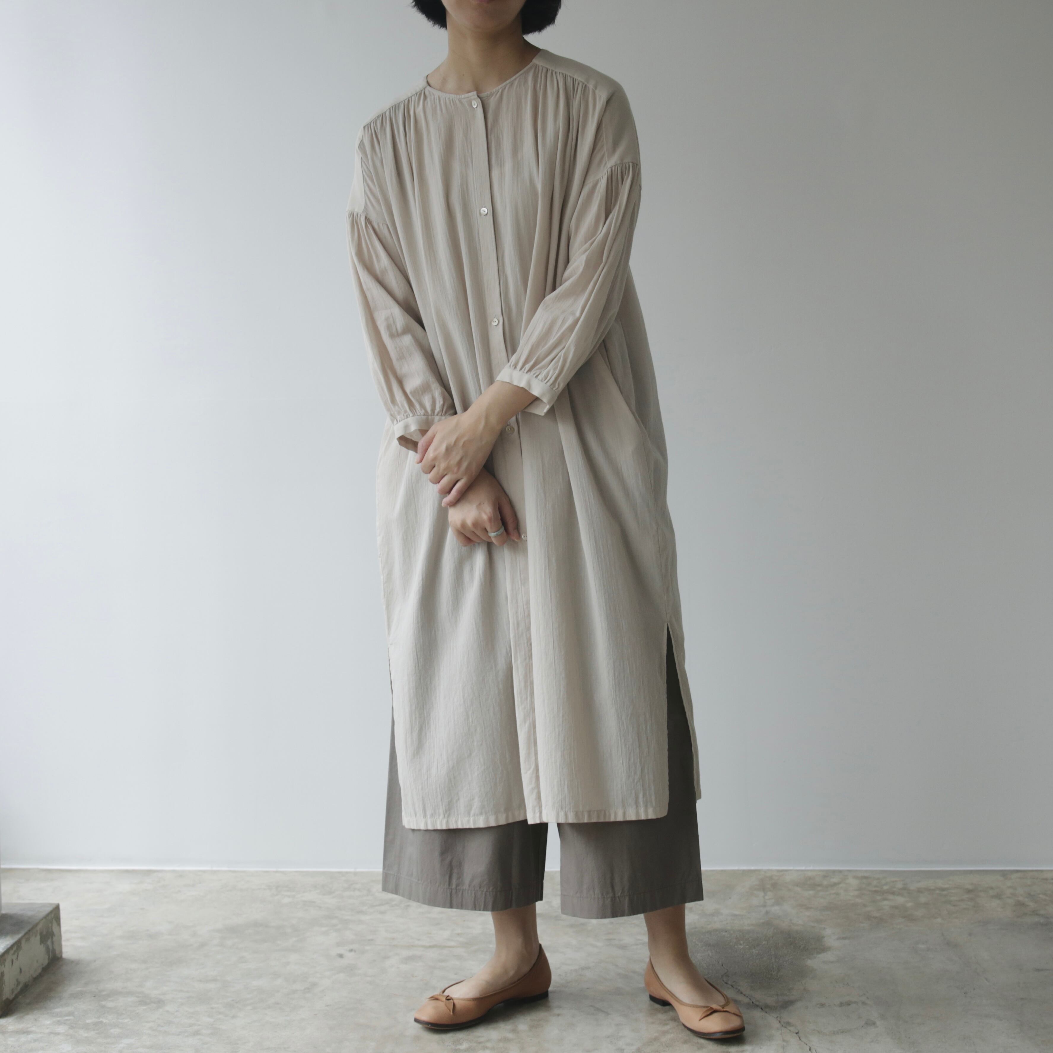 コットンの強燃糸を使用しているため、清涼感のある肌触りながらも、薄くやわらかな生地感です。生地に入ったしぼやギャザーによって、ふんわりとした表情が生まれ、風をまとうように軽やかな印象に仕上がっています。