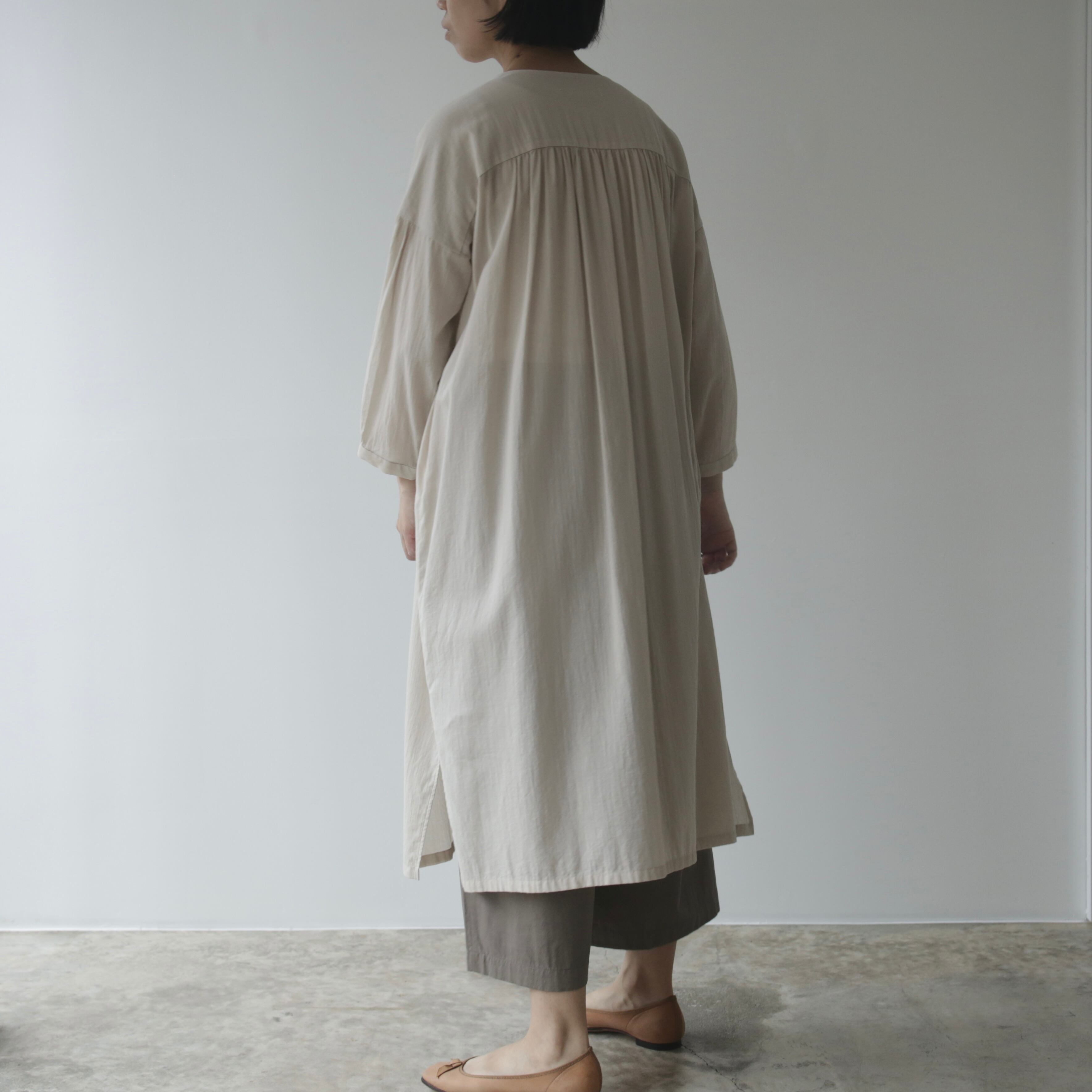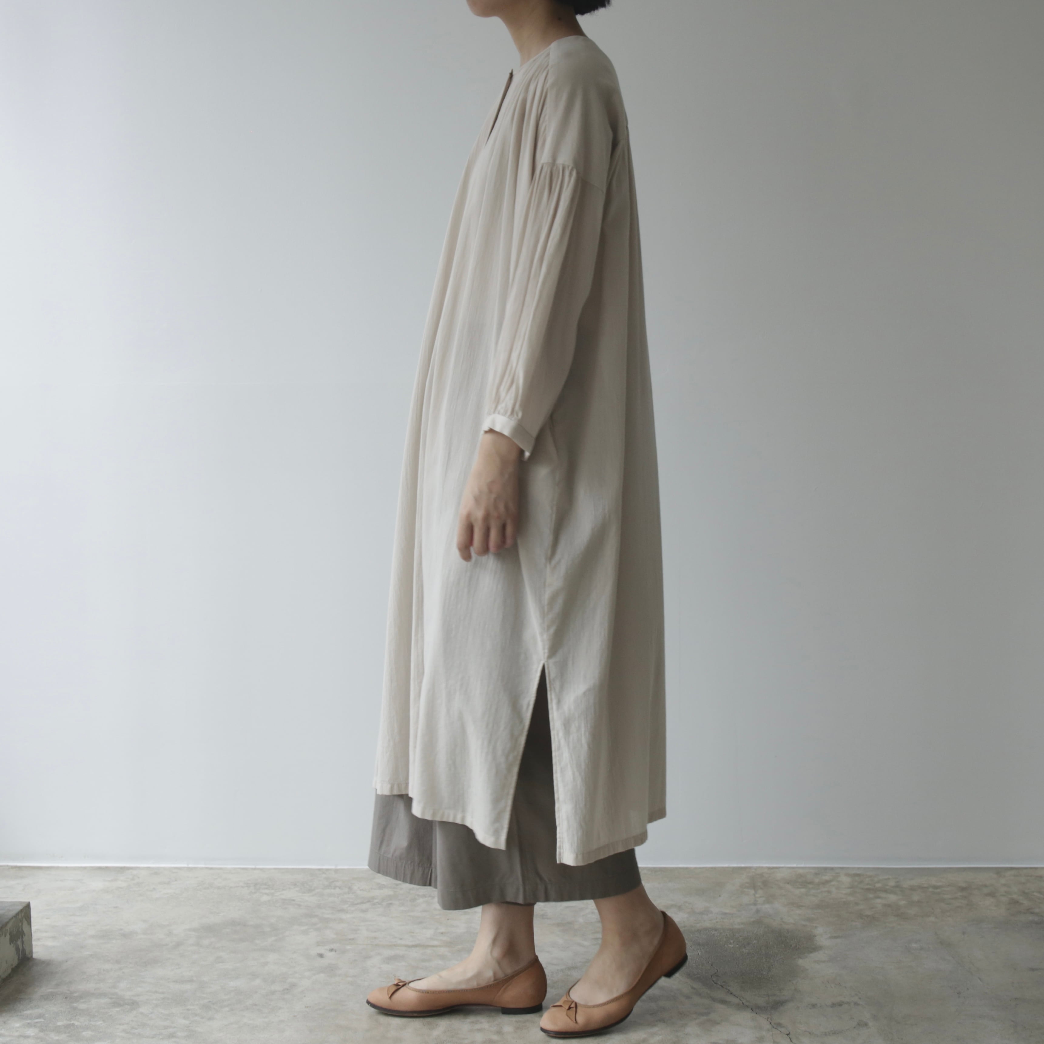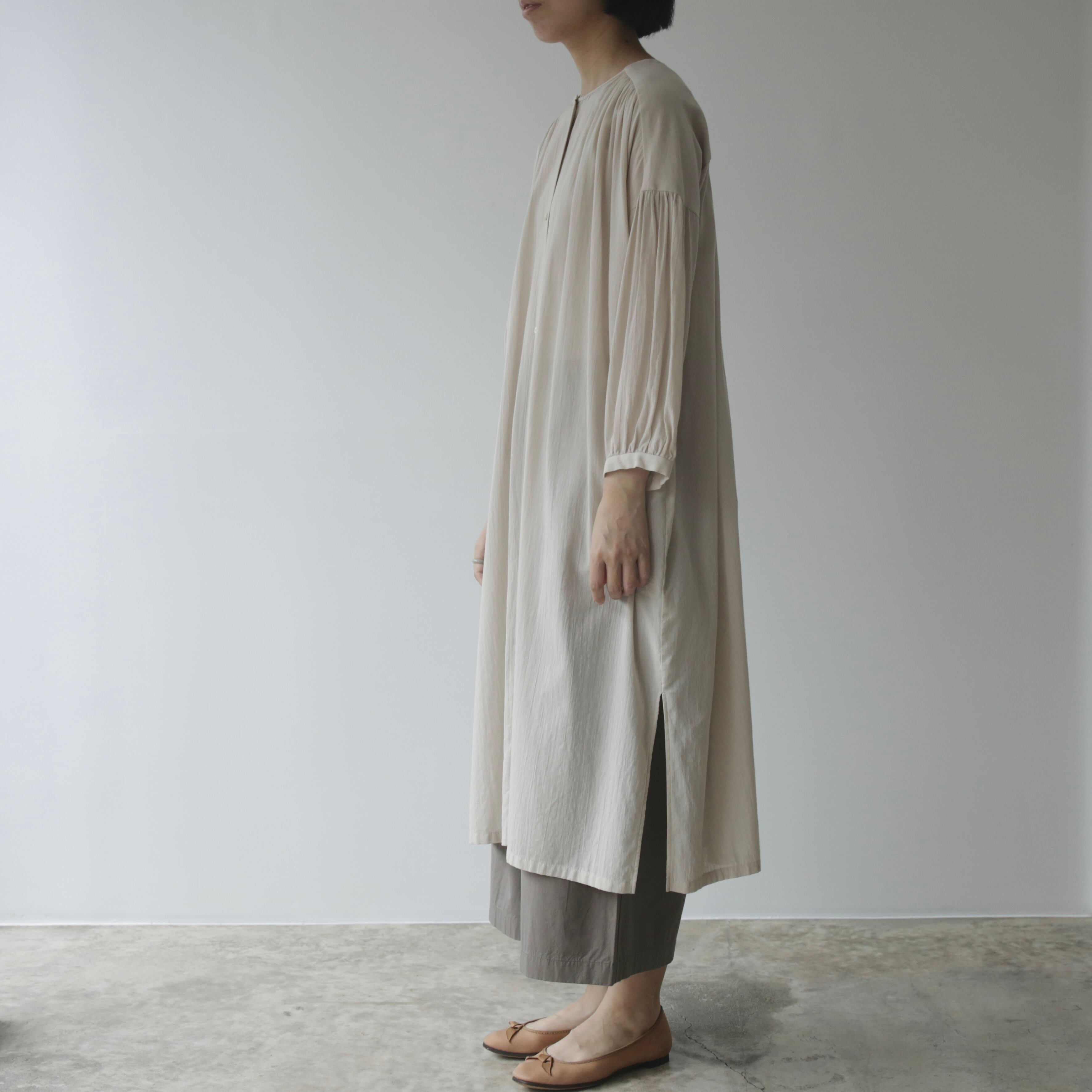 コットンの強燃糸を使用しているため、清涼感のある肌触りながらも、薄くやわらかな生地感です。生地に入ったしぼやギャザーによって、ふんわりとした表情が生まれ、風をまとうように軽やかな印象に仕上がっています。