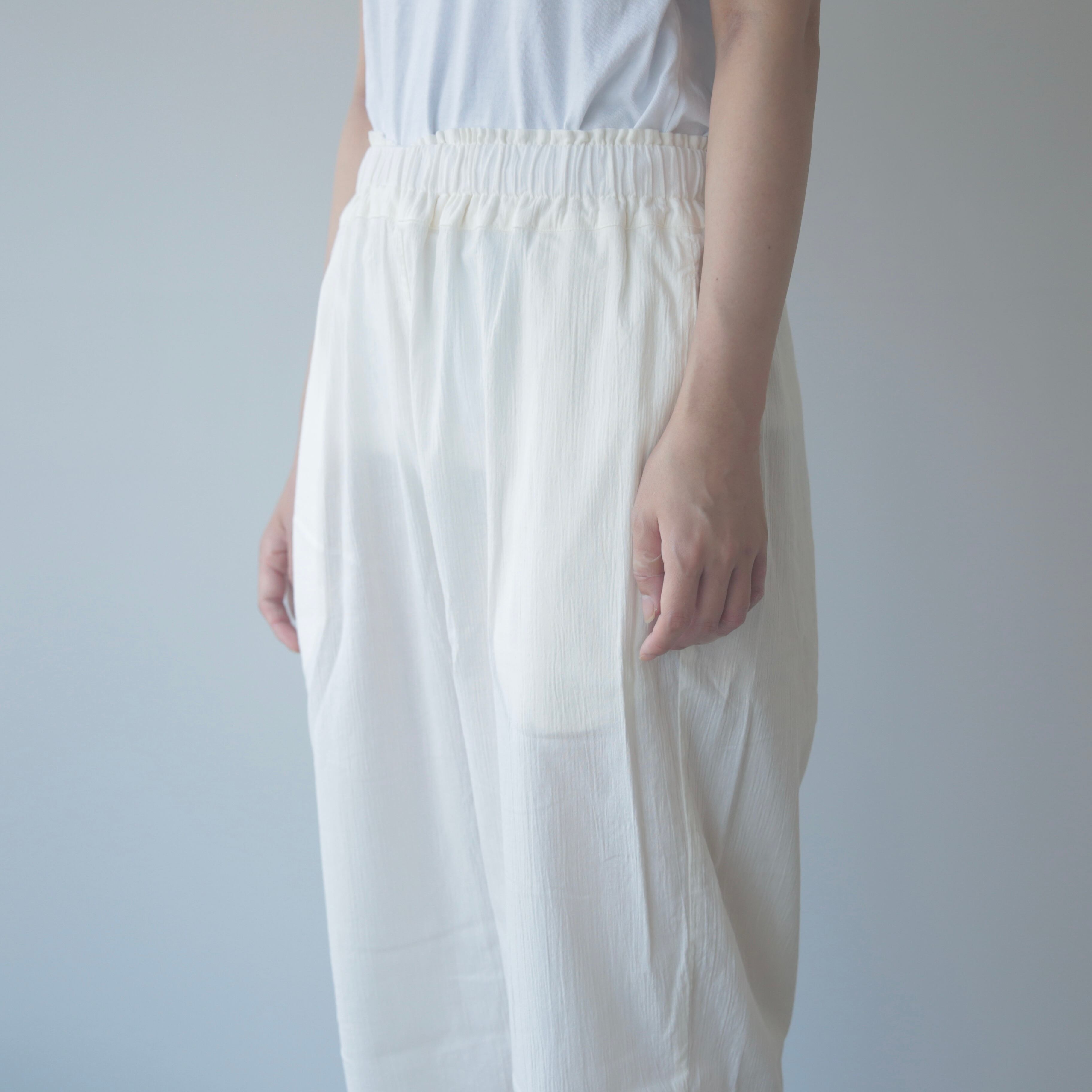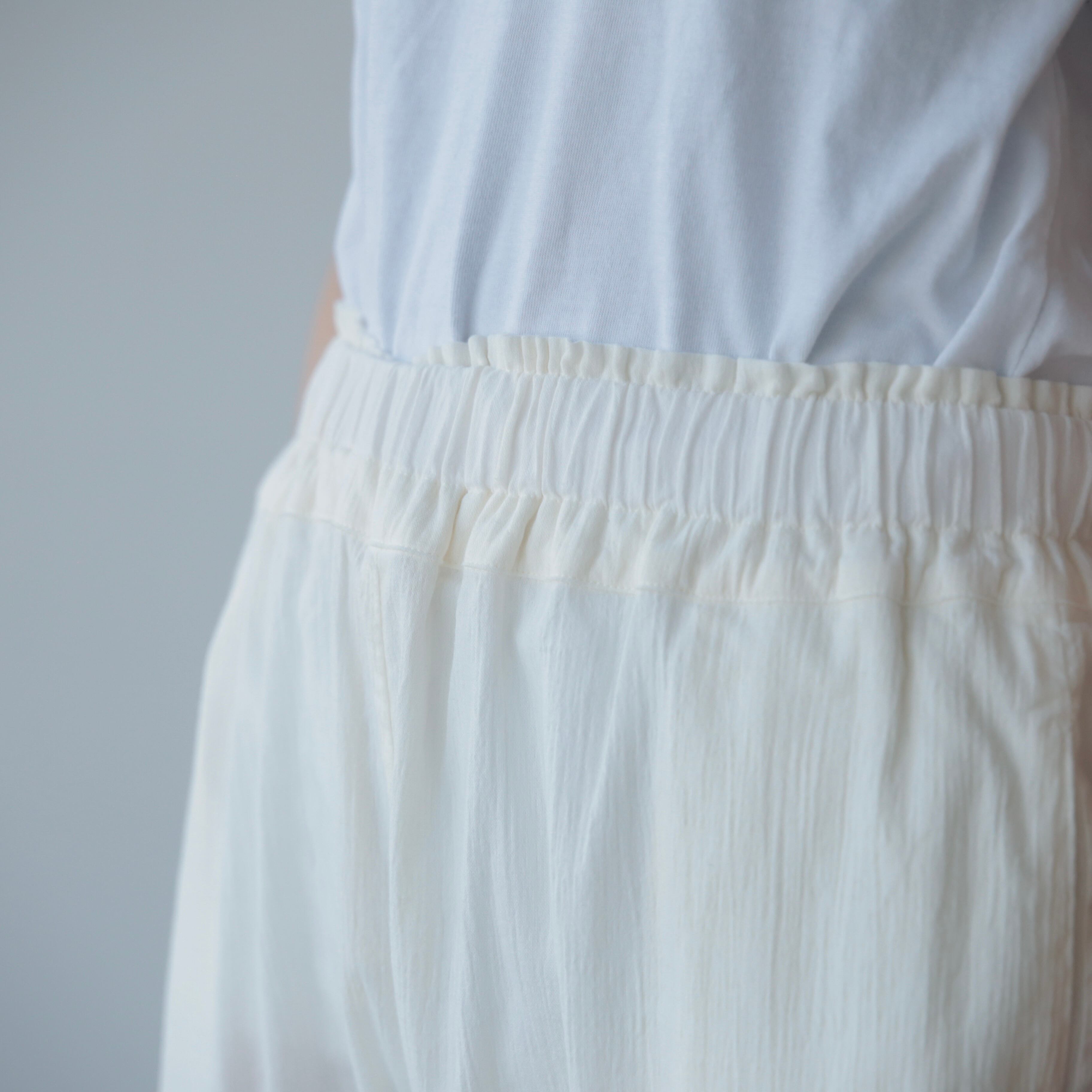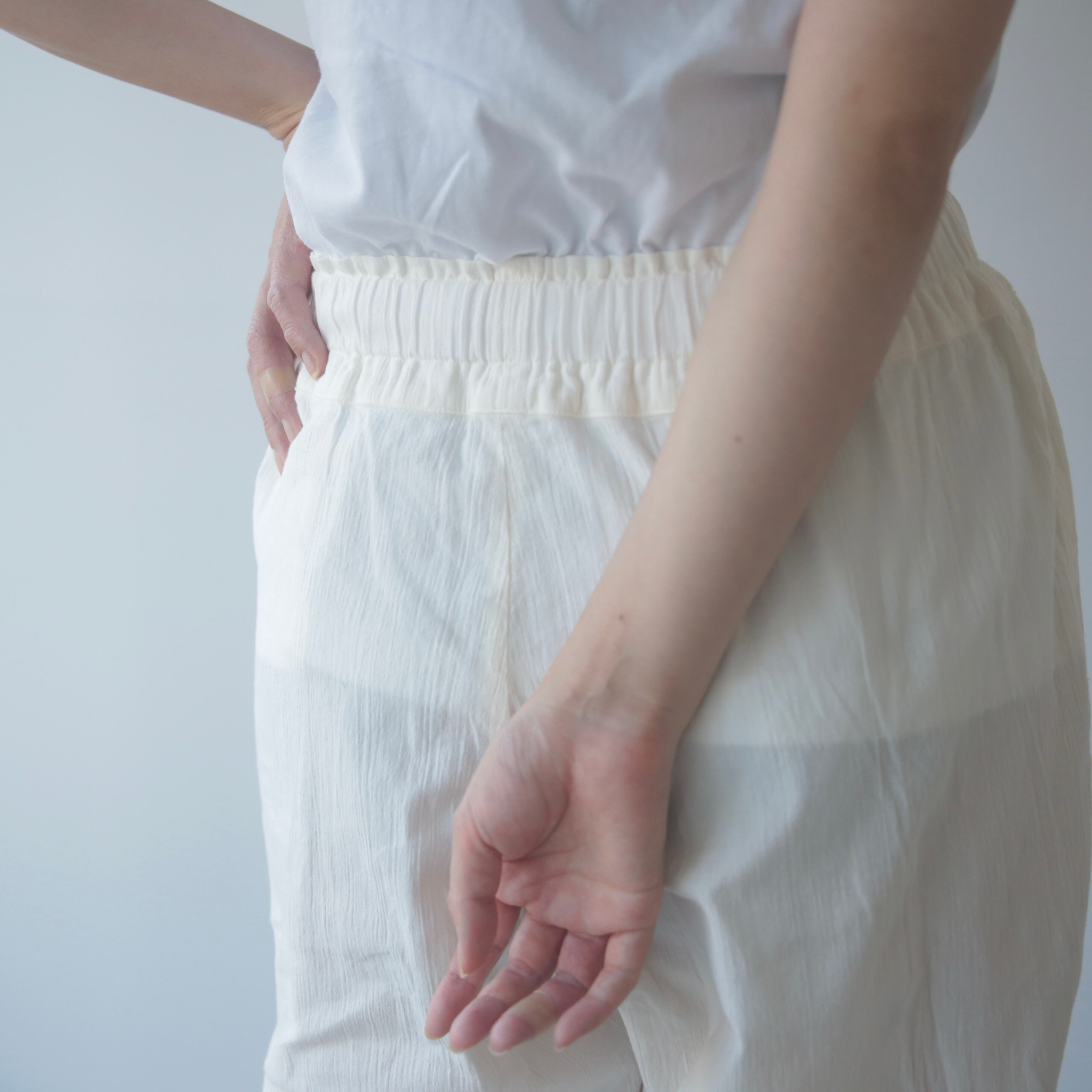 ウエストには太めのゴムを使用し、締めつけ感のないやさしいフィット感。さらっと柔らかな素材が肌に心地よく、思わず毎日手に取りたくなるような履き心地です