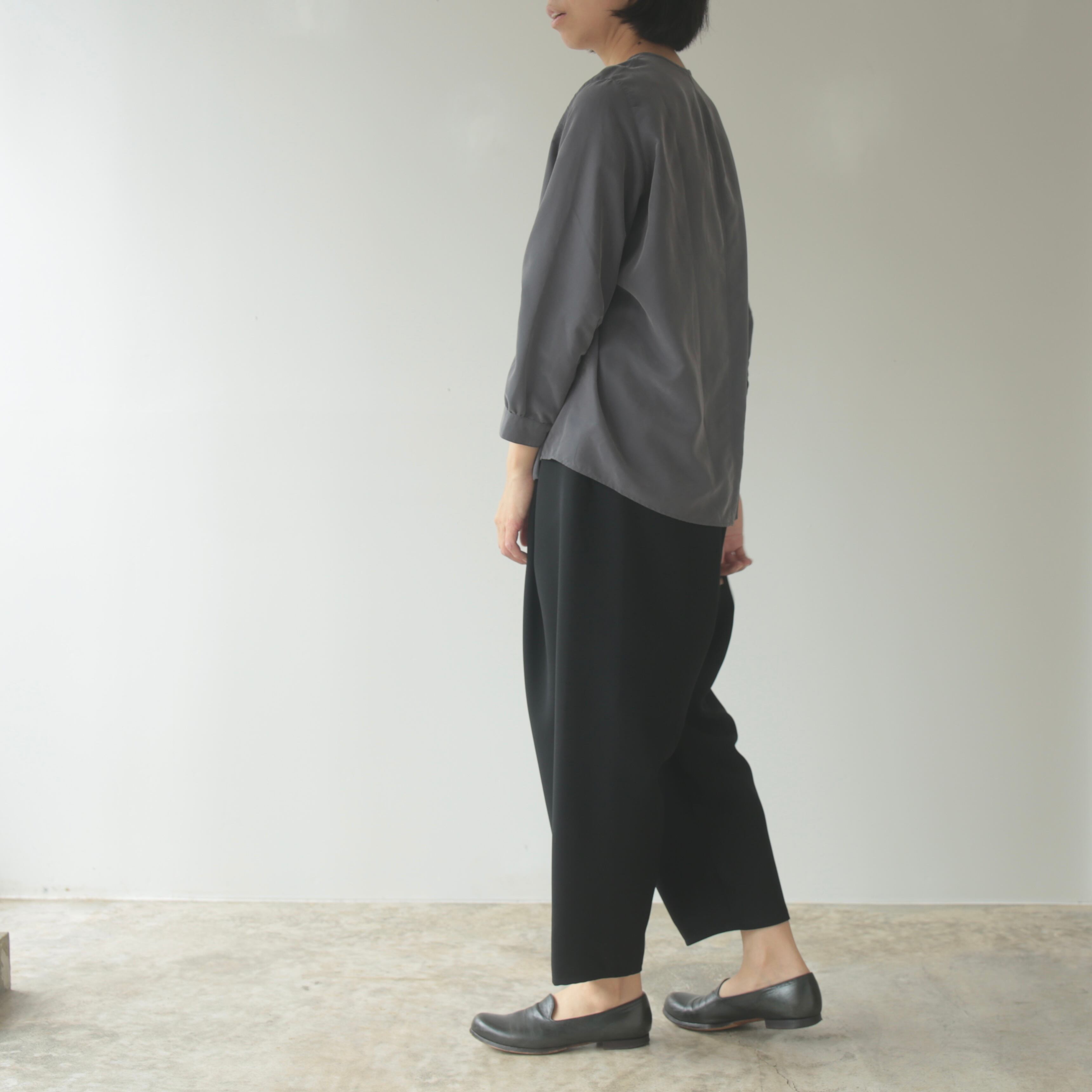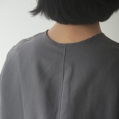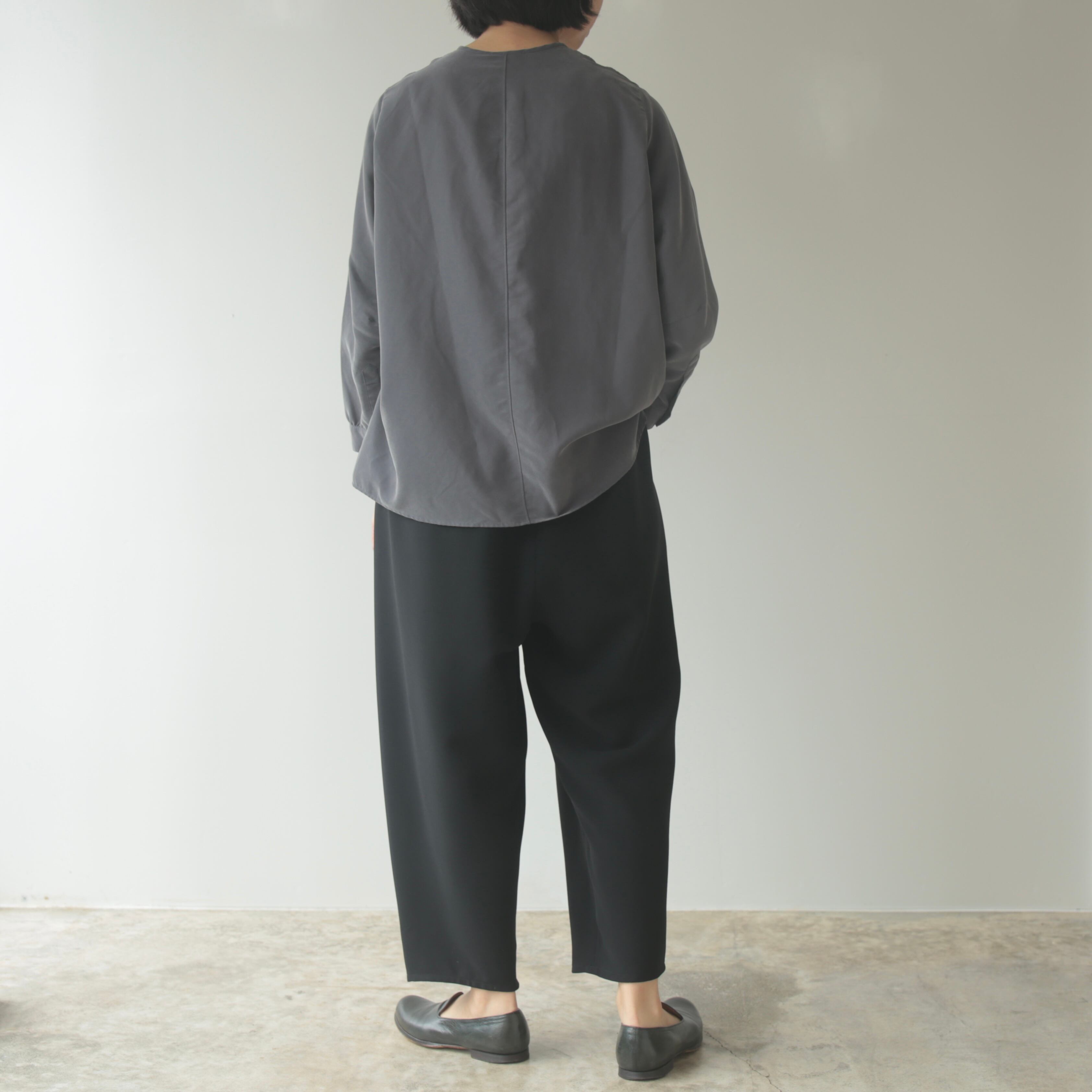 レーヨンにほんのりと毛羽立ちを加えたフィブレル加工の生地は、なめらかな肌触りと、わずかに光を含んだようなやさしい艶が魅力です。まるで赤ちゃんの肌に触れるようなやわらかさと、すとんと落ちる自然なドレープが、着る人の動きにしなやかに寄り添います。