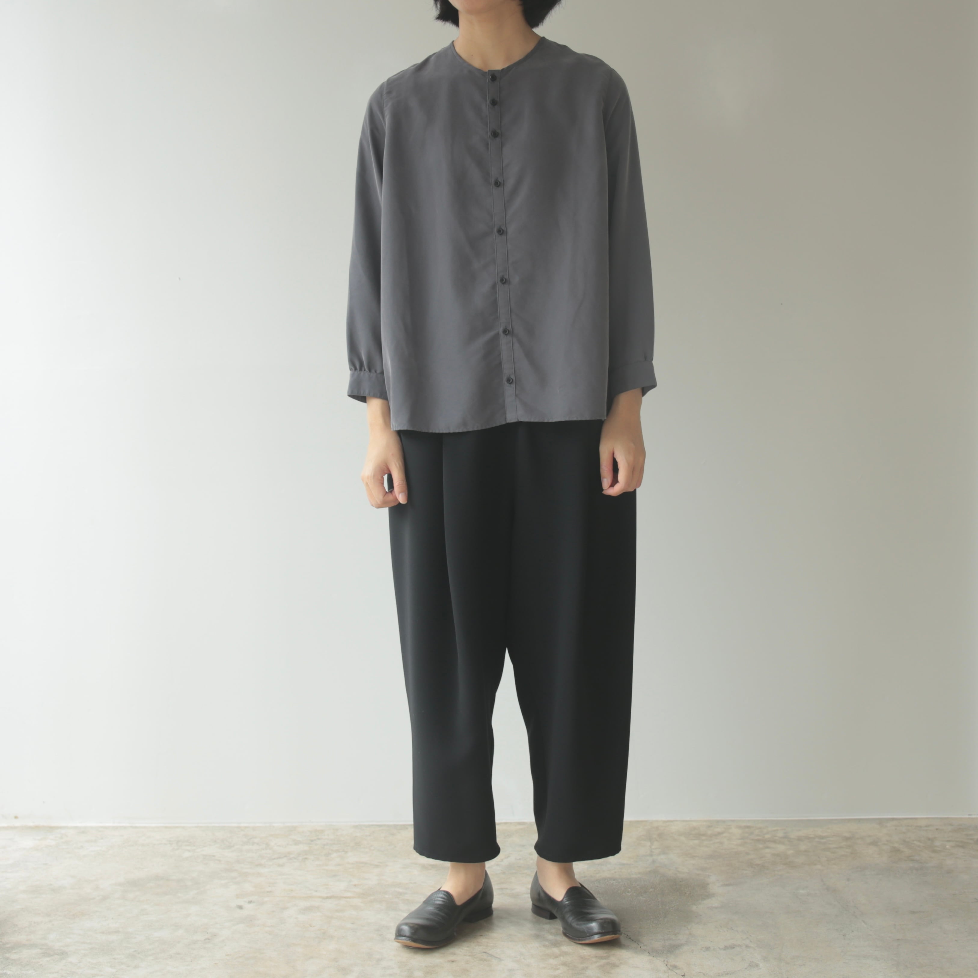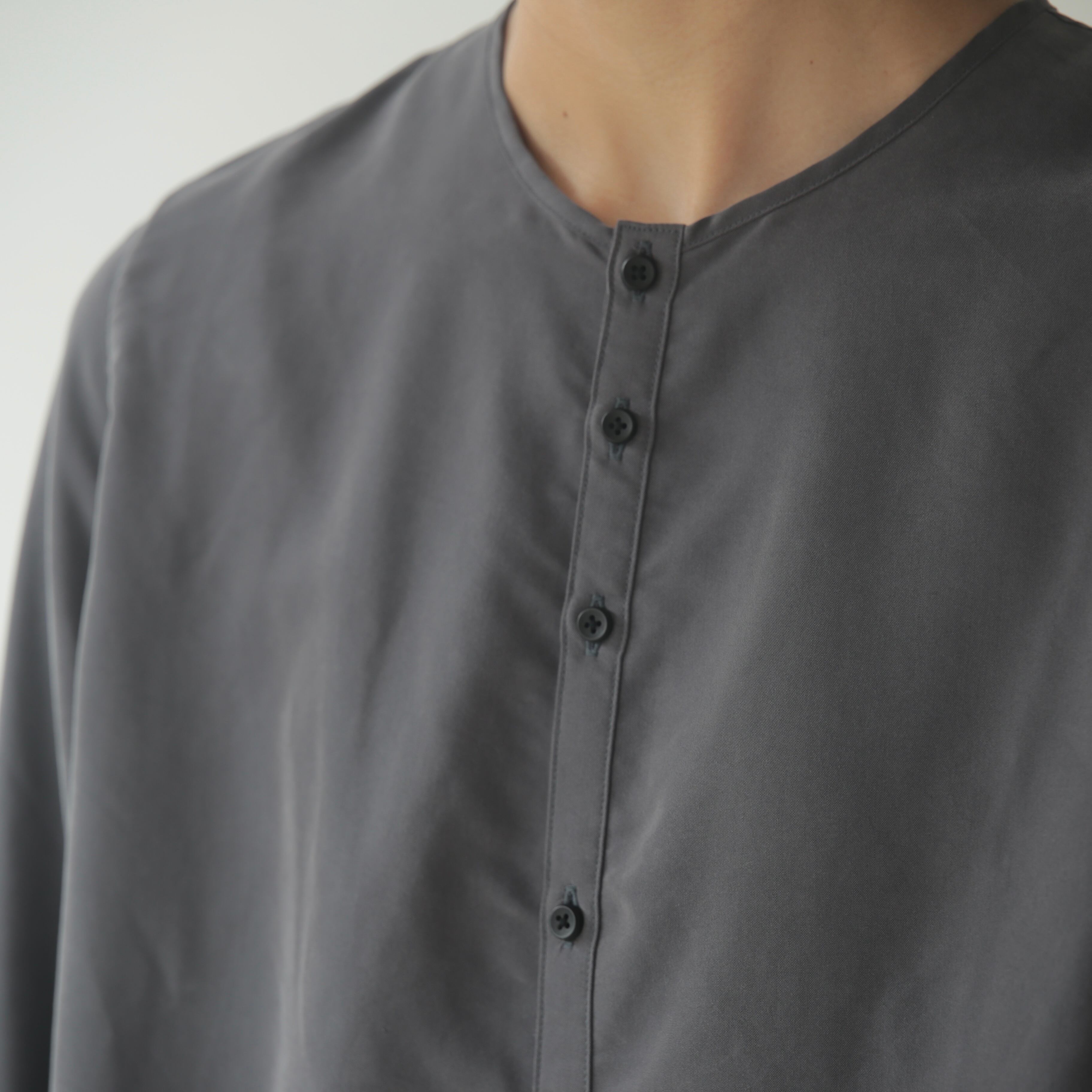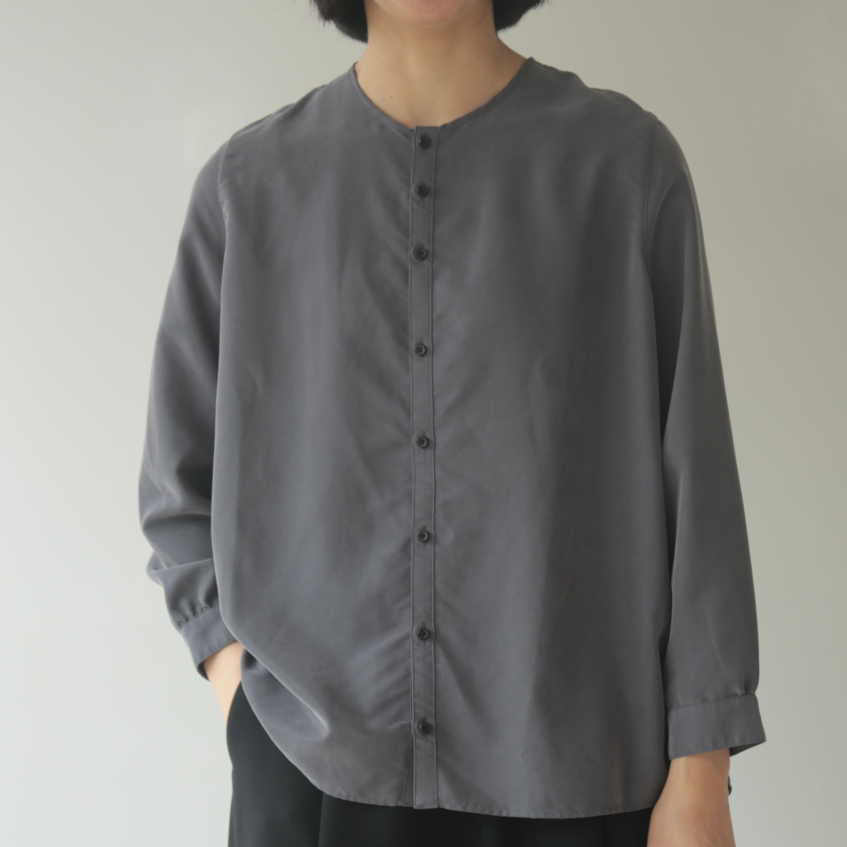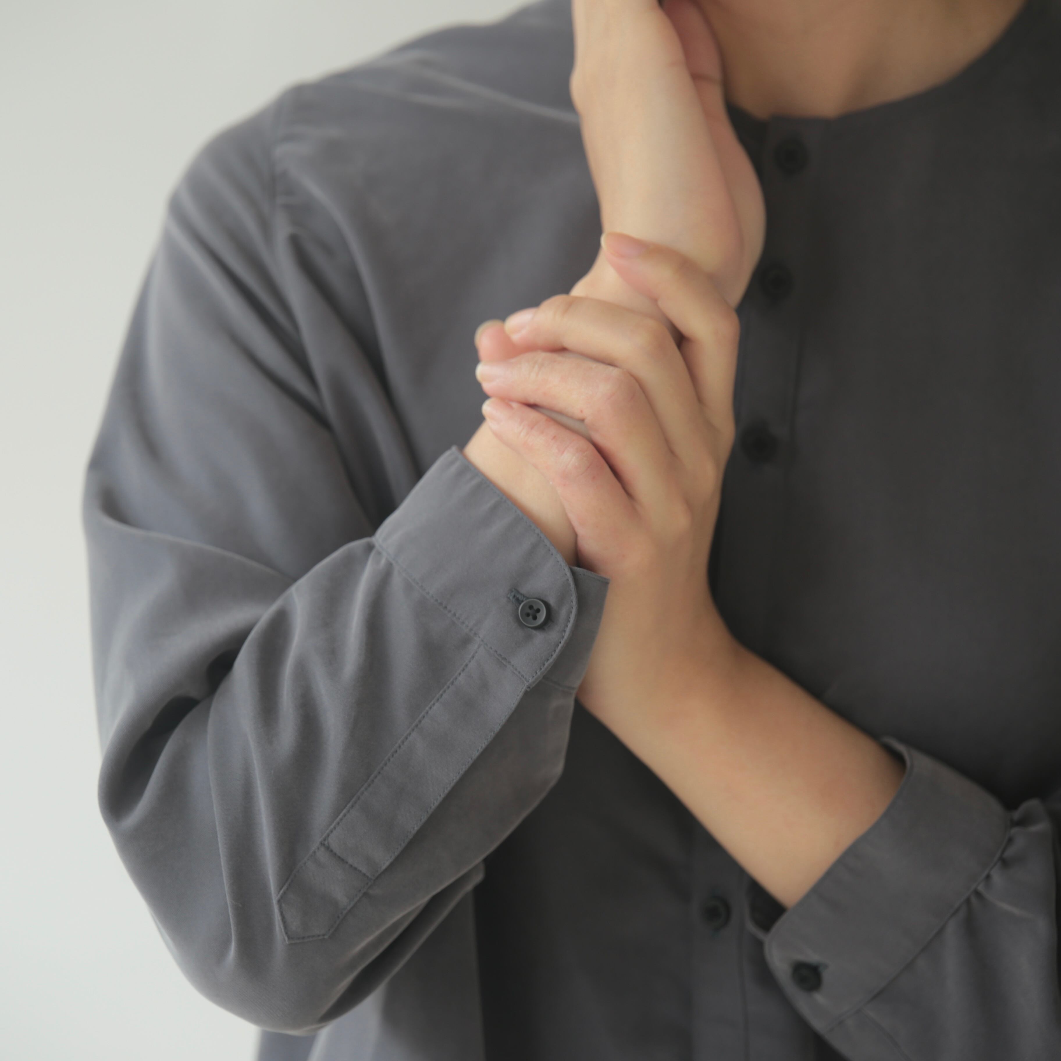 ポリエステルとの混紡により、扱いやすさやイージーケア性も兼ね備えており、毎日の装いに気負いなく取り入れていただける一枚です。身幅にはゆとりをもたせながらも、全体はすっきりとしたシルエットに。小さめの襟がほどよくアクセントになり、シャツ特有のかたさを感じさせません。