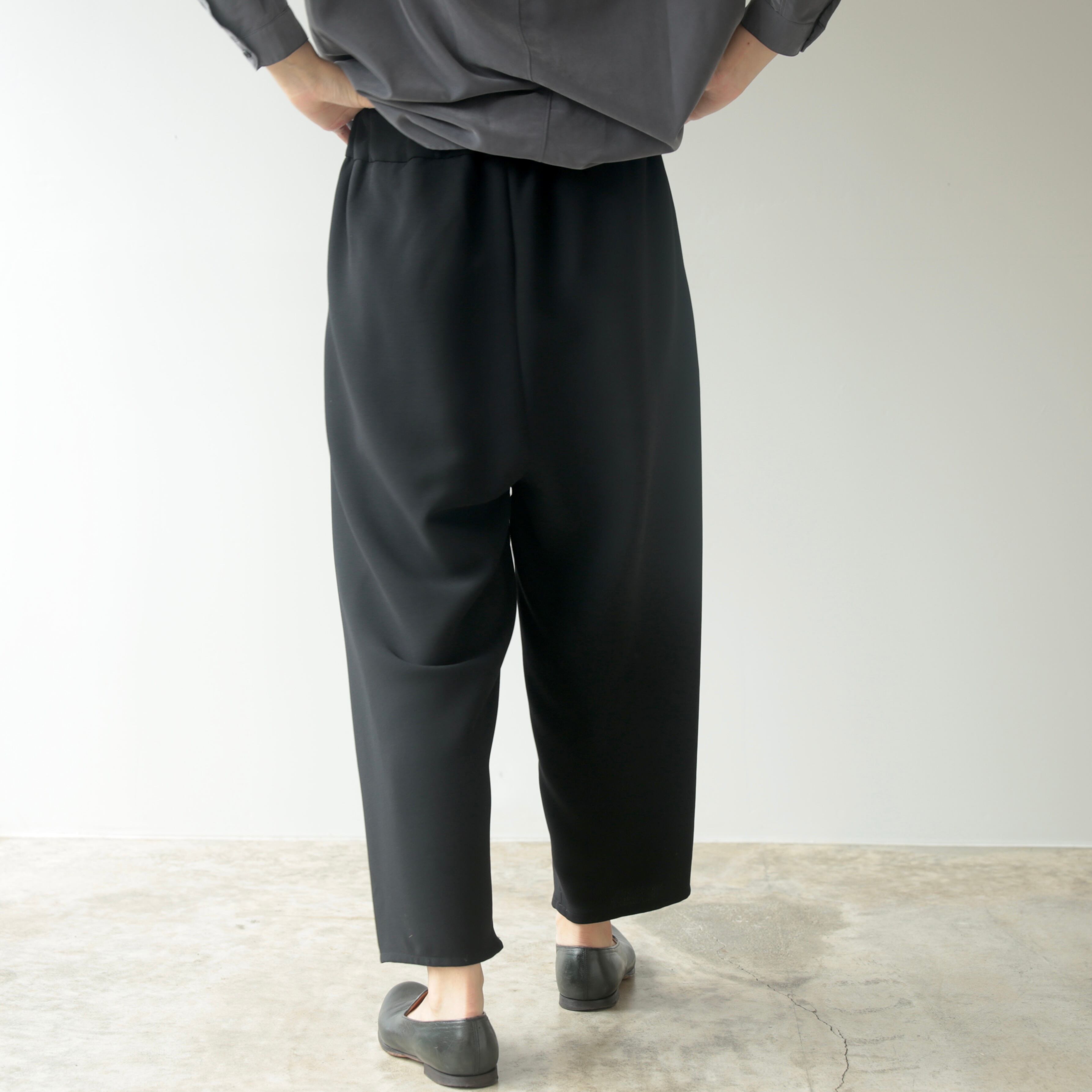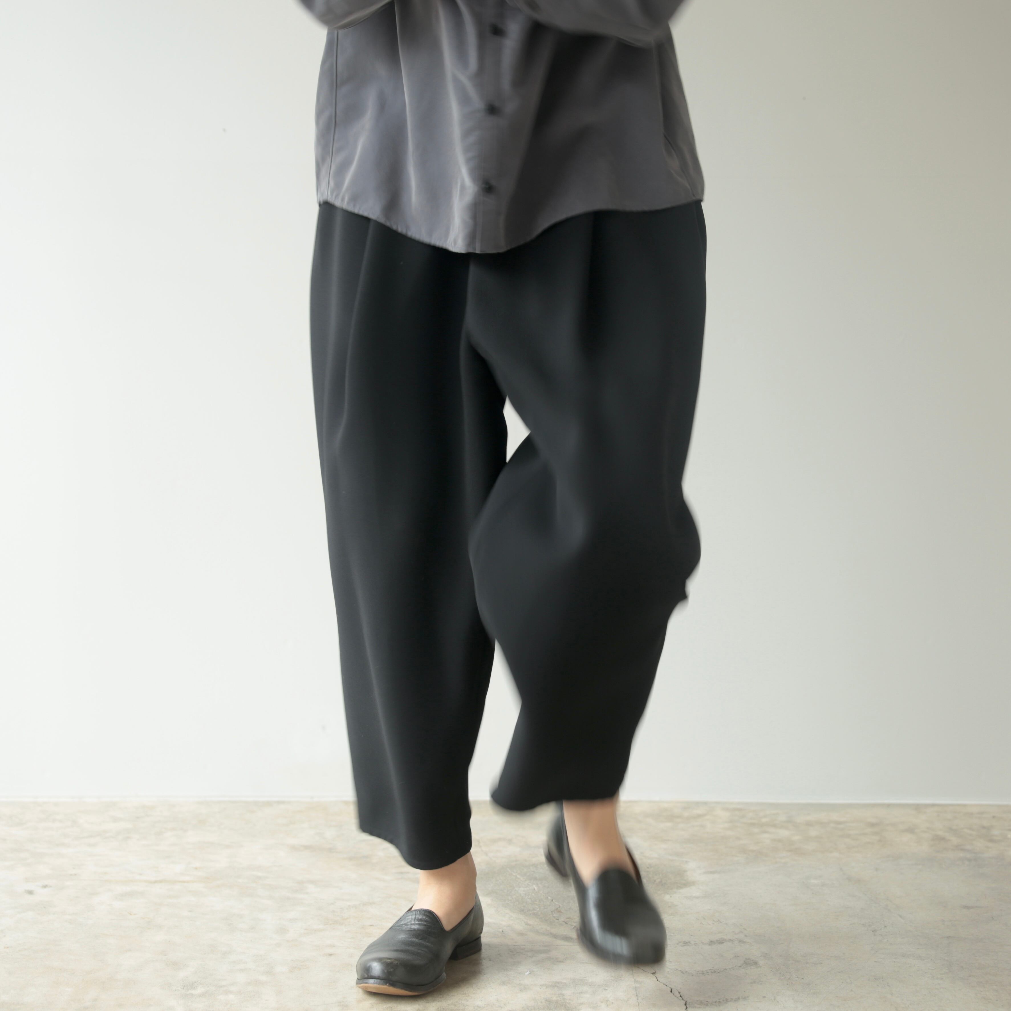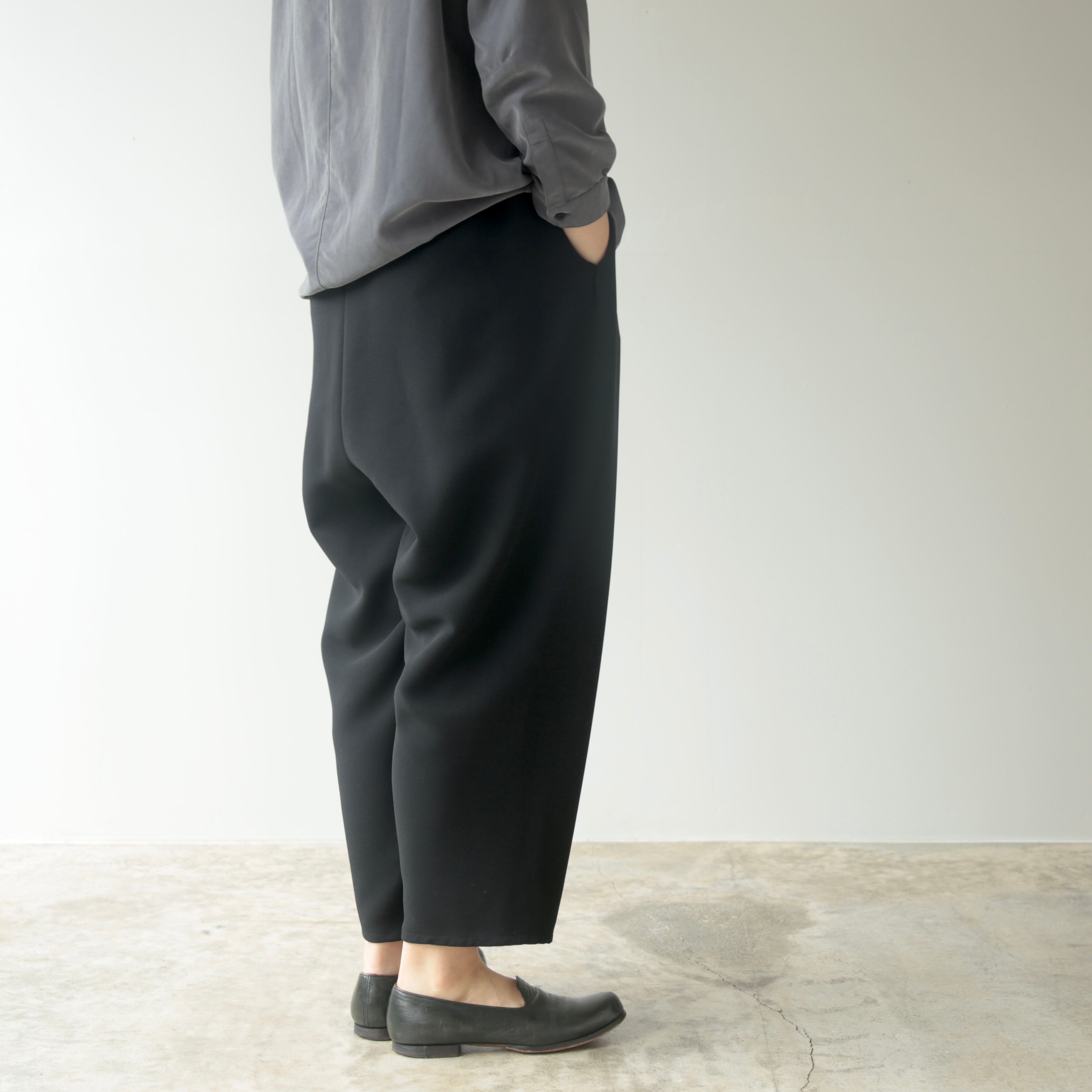 ストレッチ性とドライな肌ざわりを持つ強撚ポリエステルを使用した、二重織りのテーパードパンツ。適度な重厚感としっかりとした質感で、型崩れやしわがつきにくく、美しいシルエットを長く保ちます。
