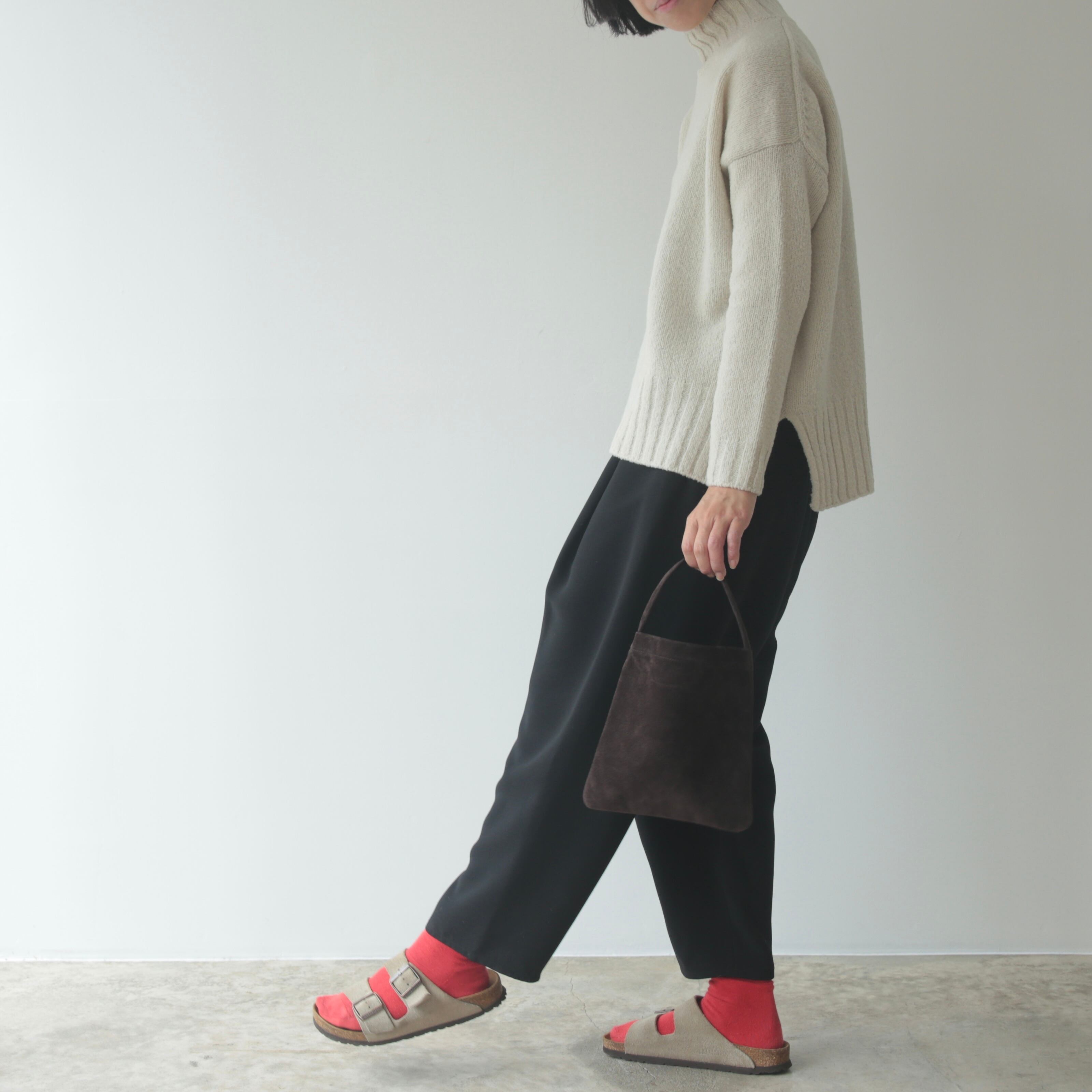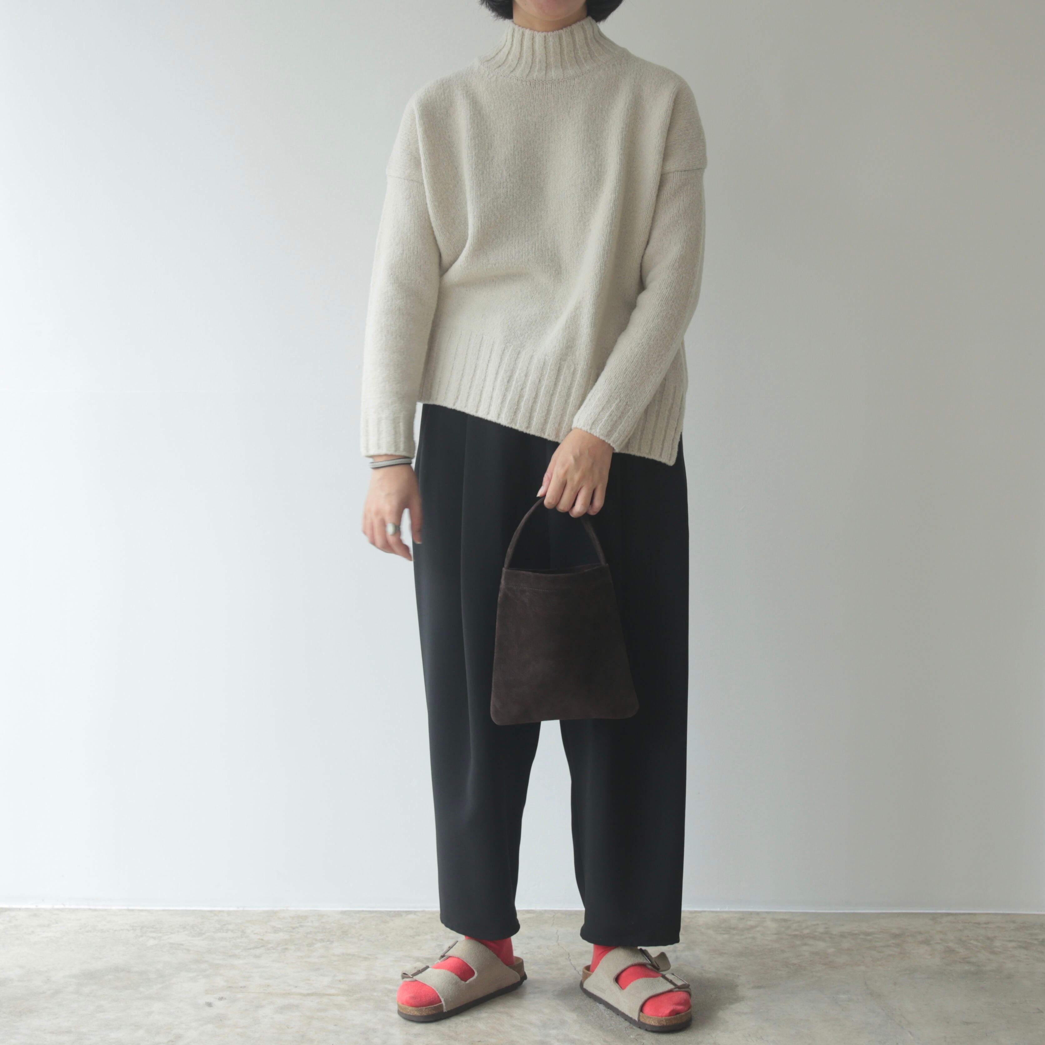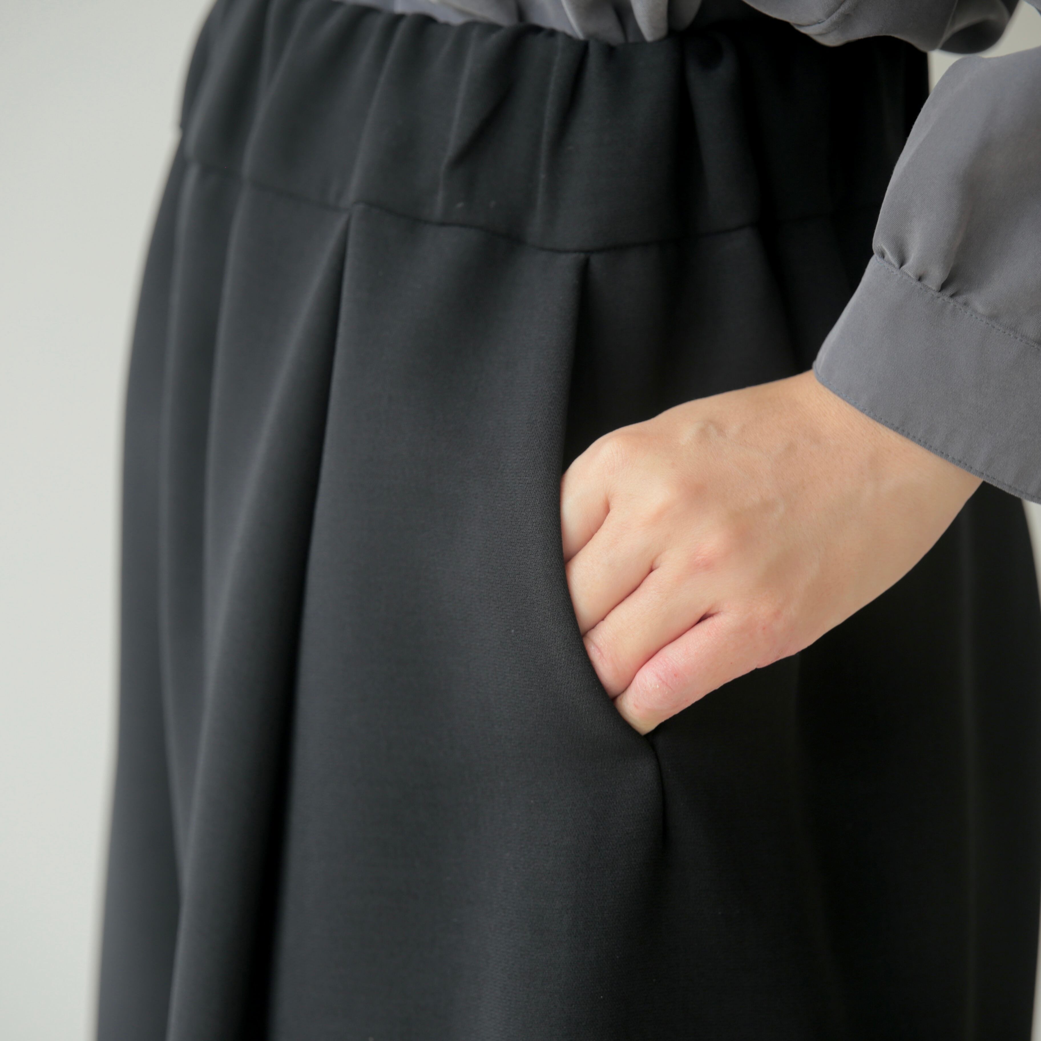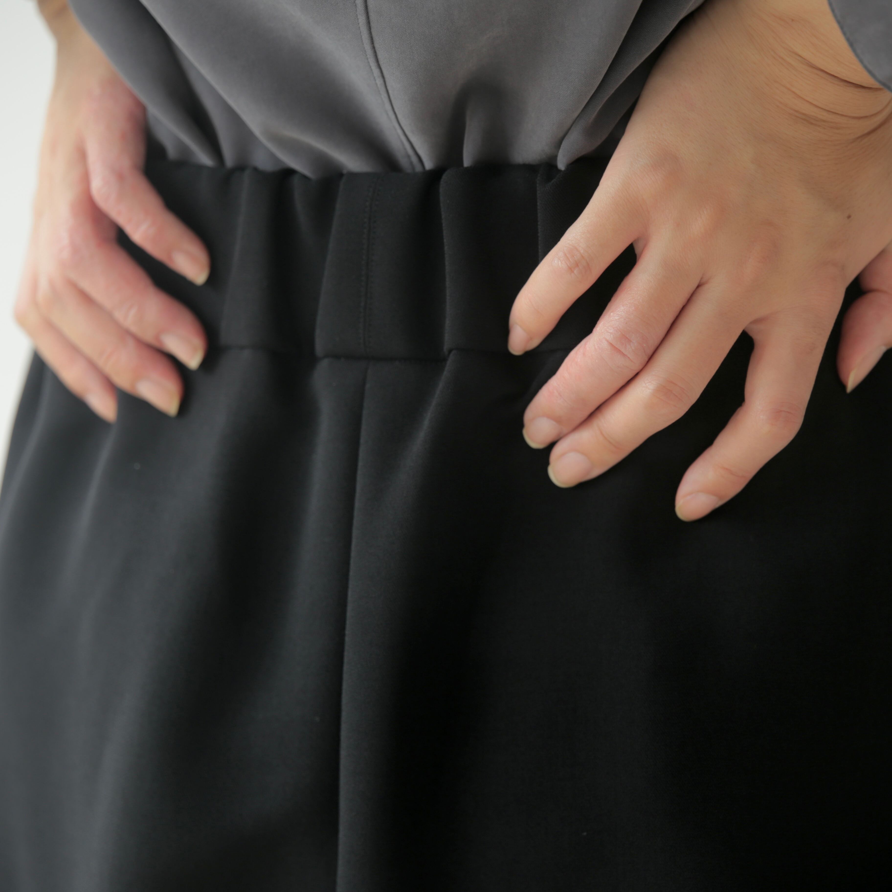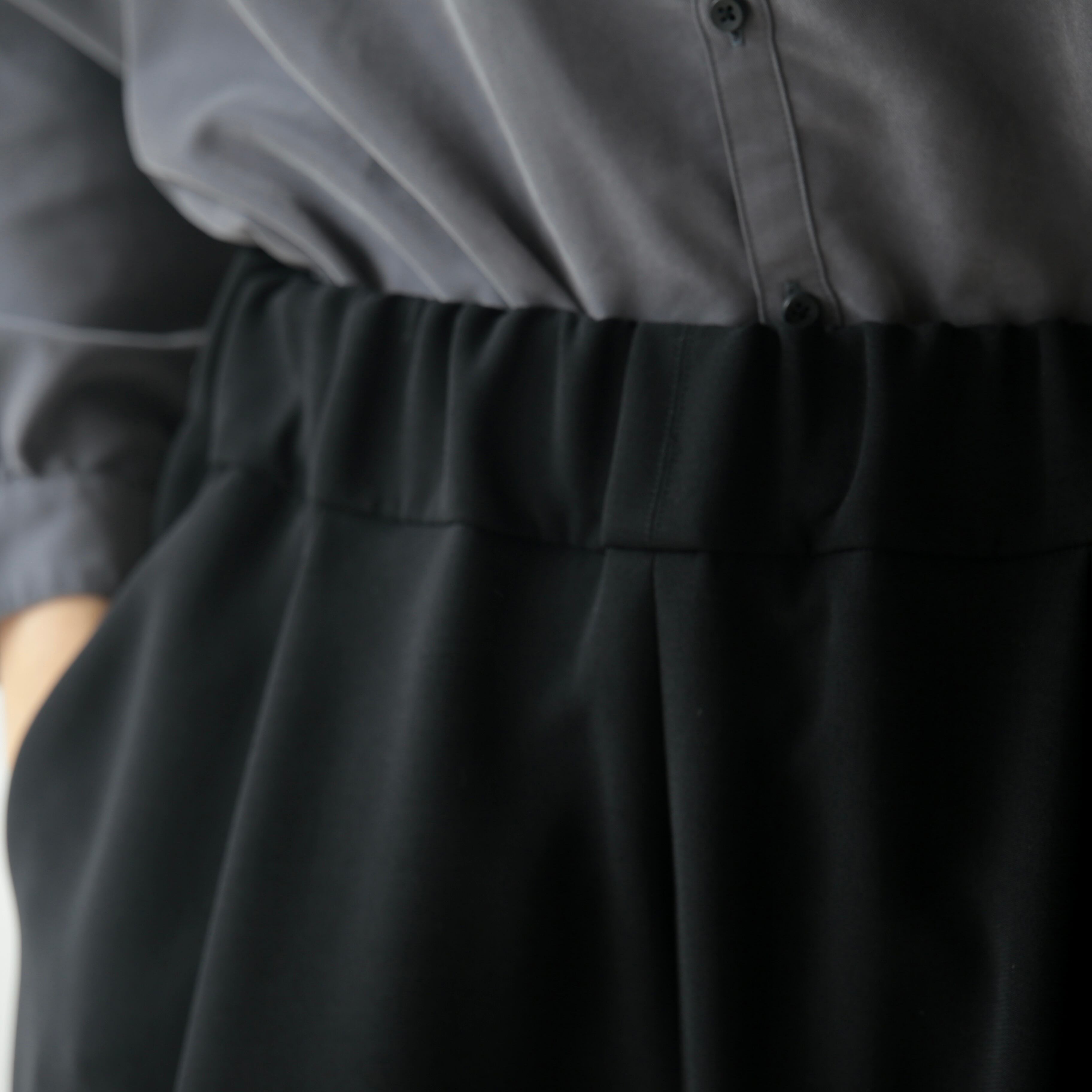脇に縫い目をなくし、贅沢に生地を使用することで、前からも横からも立体的なラインが足を綺麗に見せてくれます。厚めのウエストベルトは安定感があり、ゴムと紐仕様でリラックス感のある履き心地です。オンオフ問わず活躍する1本です。