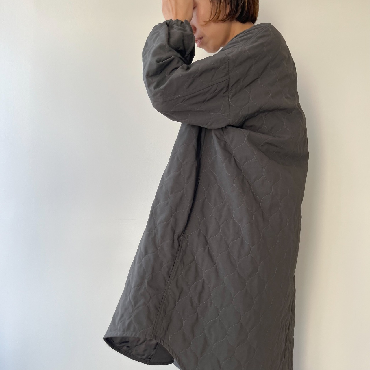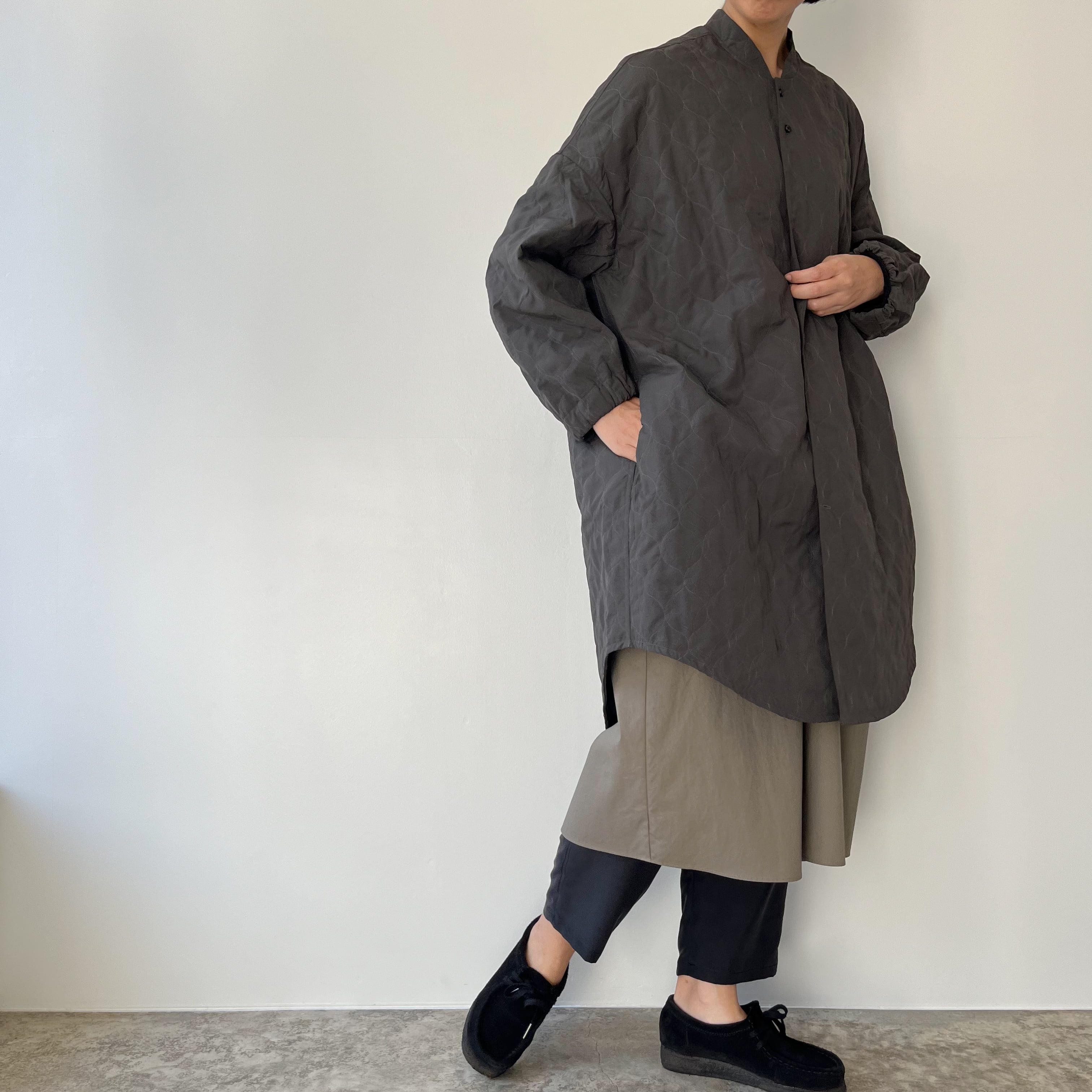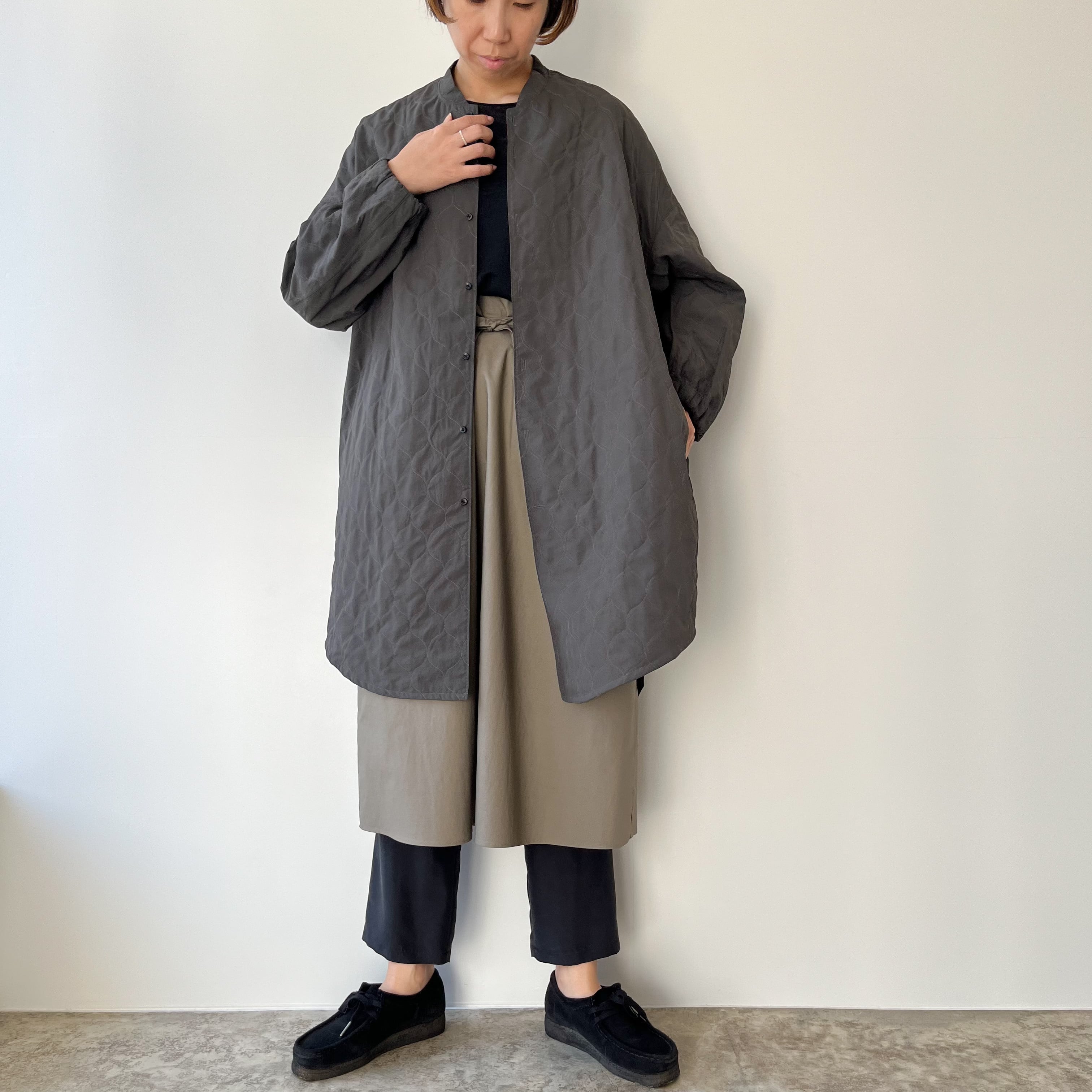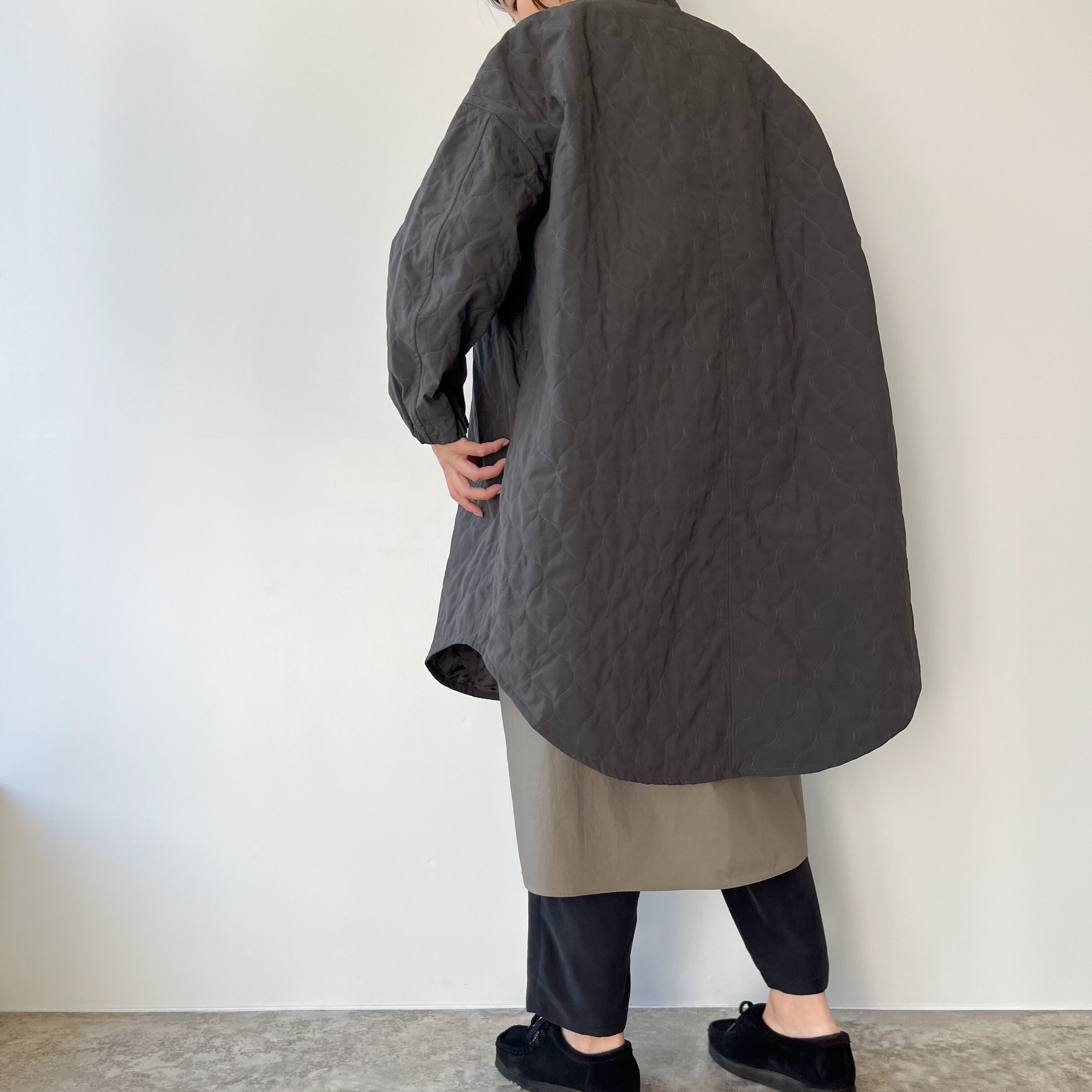 袖はカーブを描く立体的なパターンで腕のラインを自然に包み、袖口はゴム仕様に。さりげない可愛らしさと実用性が両立しているので、袖が長くて困る心配も少なく、動きやすさも確保されています。ニュアンスのあるグレーは、コートらしい落ち着きを残しつつ重たく見せない色味。ワンピースの上にも、厚手のニットの上にもすっと馴染み、季節の移ろいをやさしく受け止めてくれます。