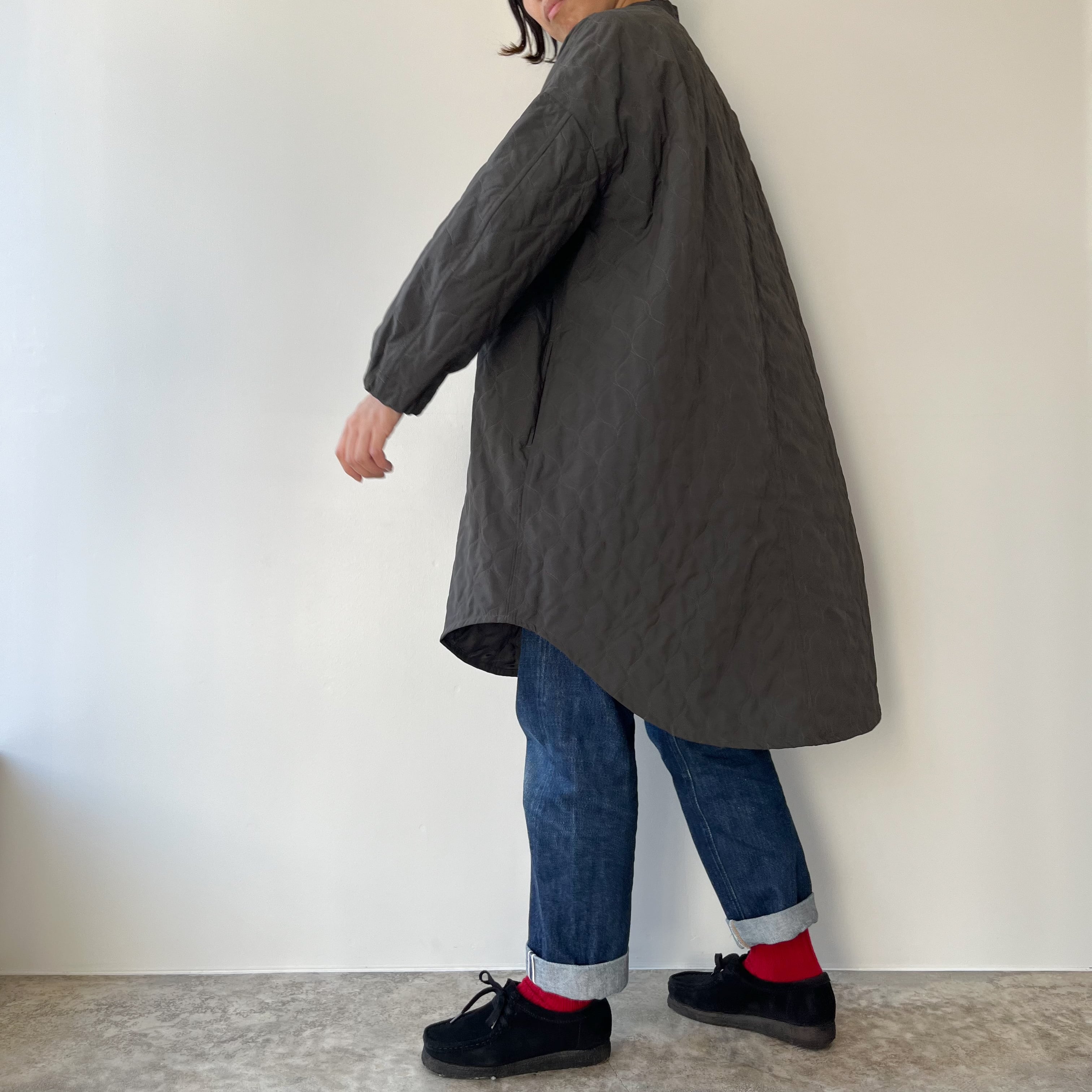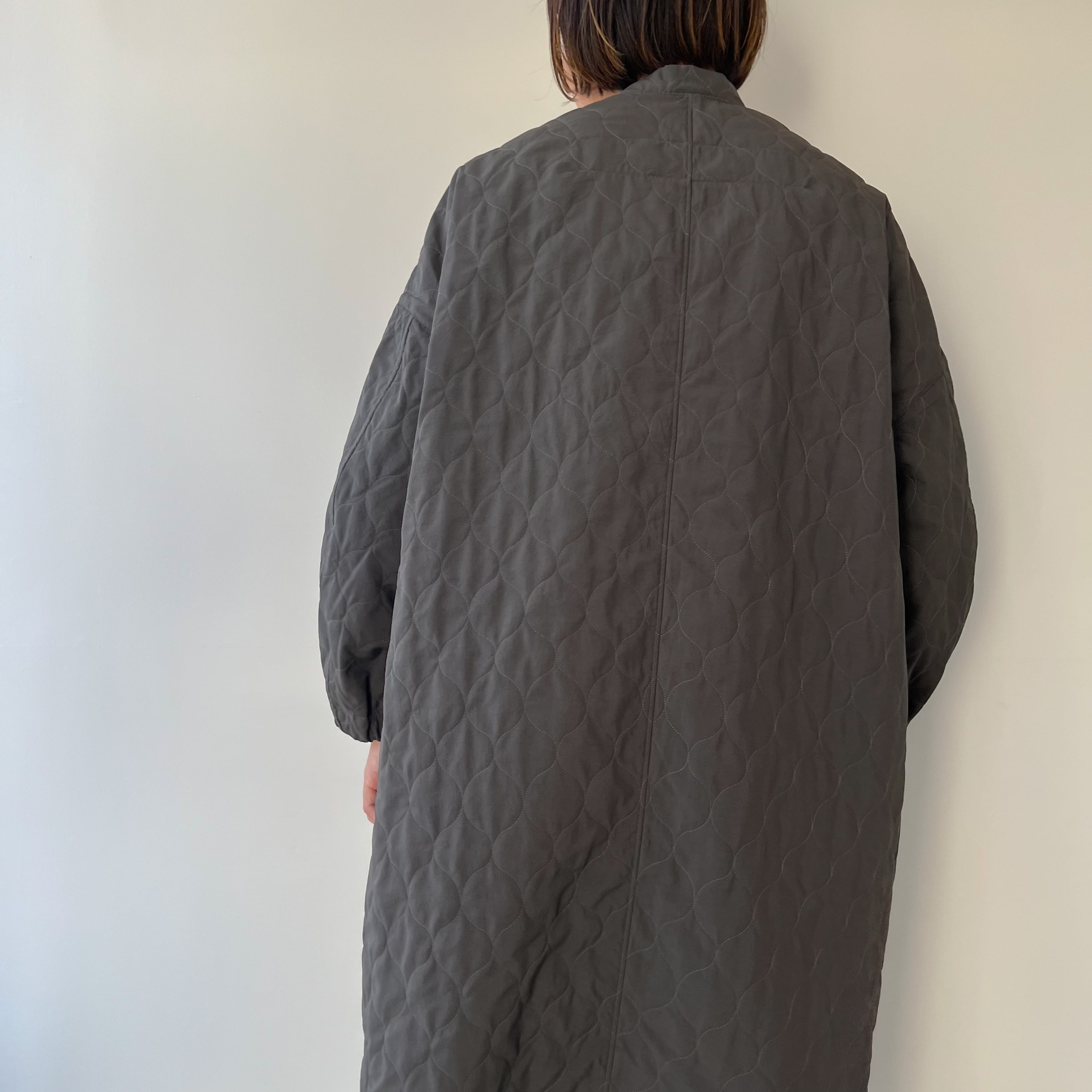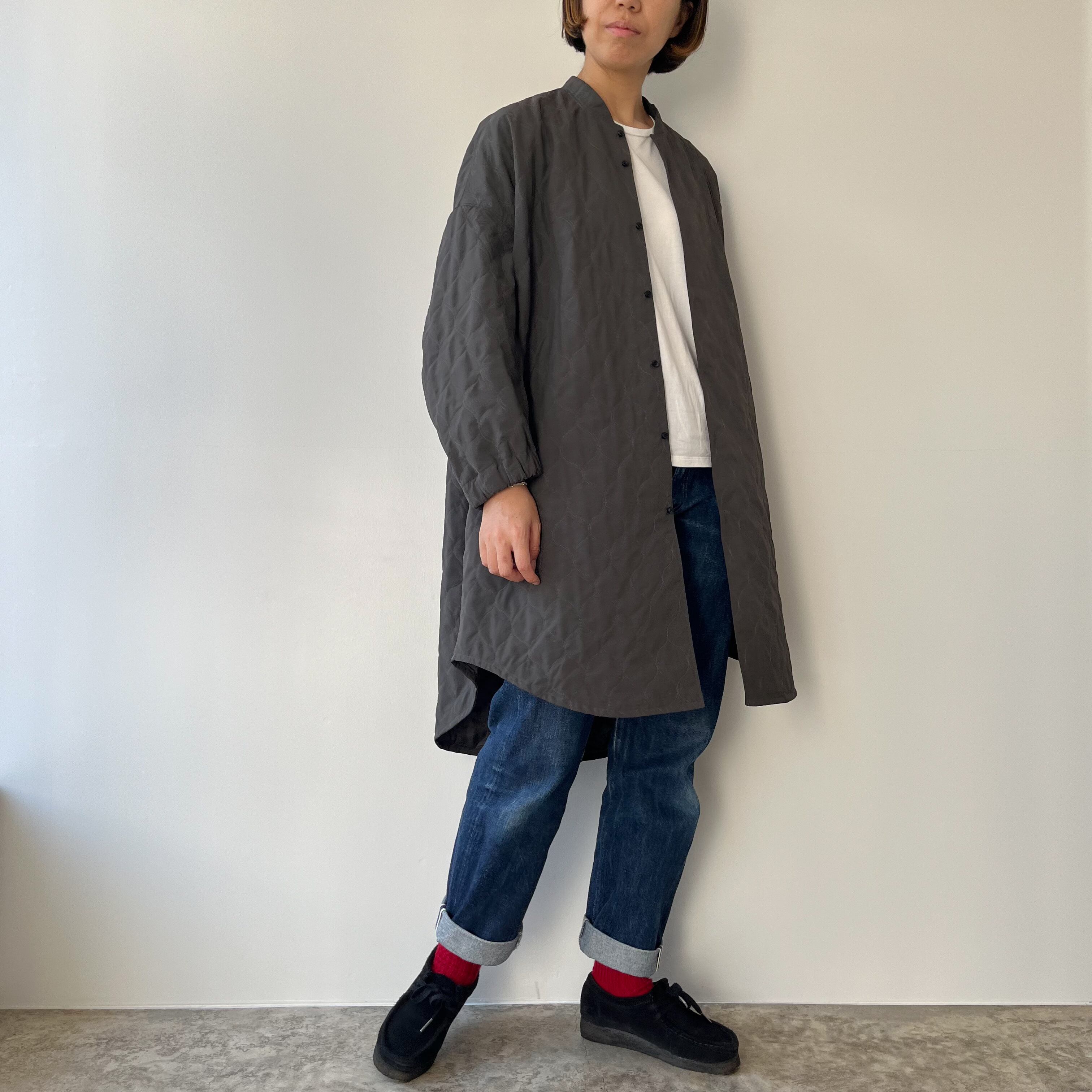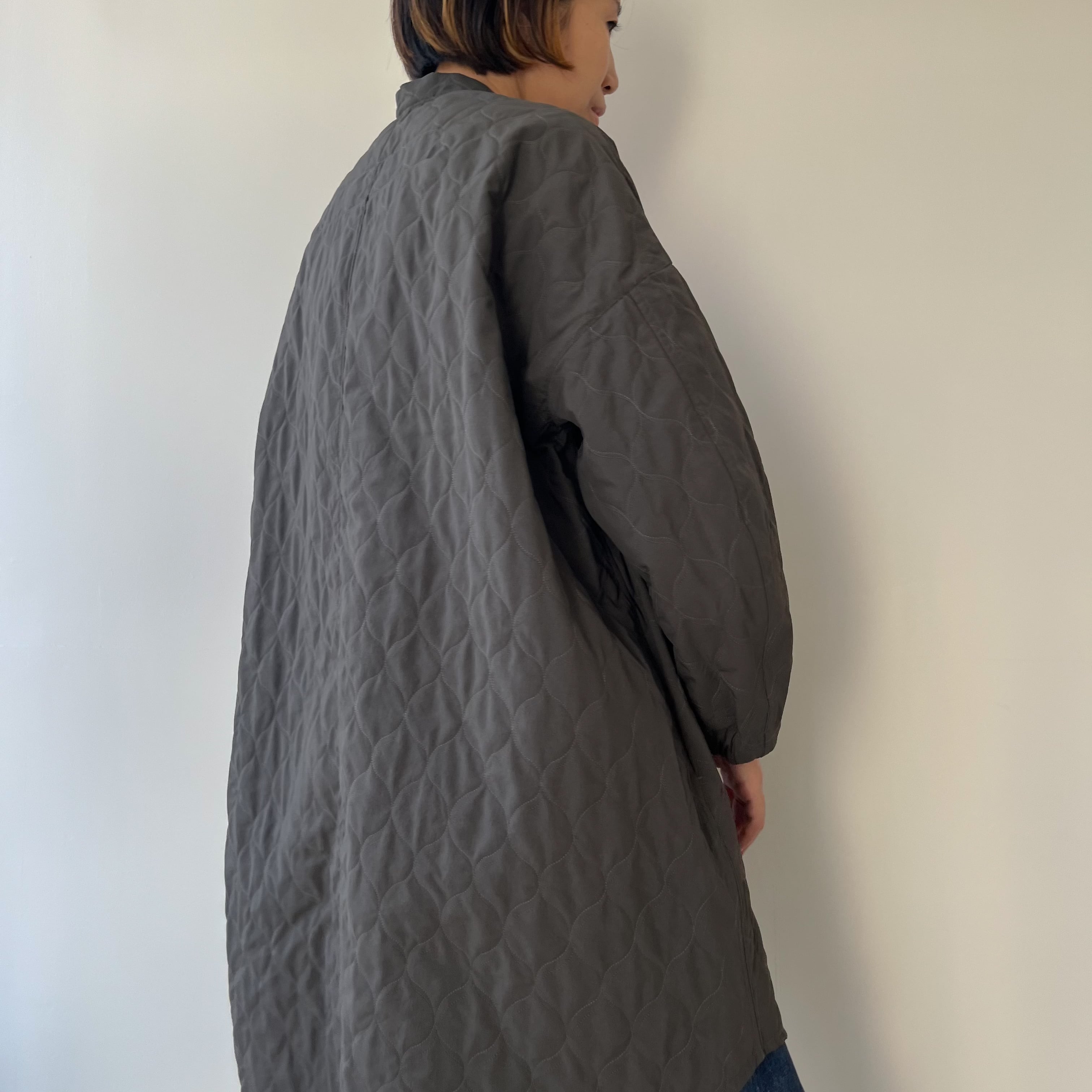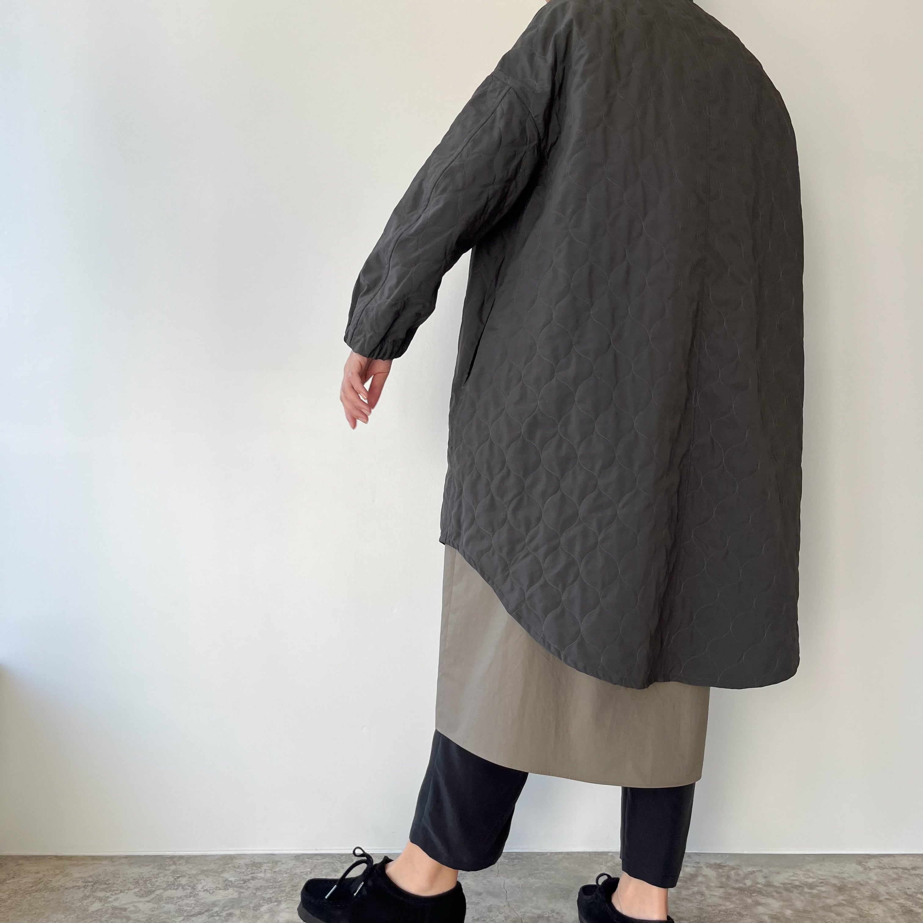 袖はカーブを描く立体的なパターンで腕のラインを自然に包み、袖口はゴム仕様に。さりげない可愛らしさと実用性が両立しているので、袖が長くて困る心配も少なく、動きやすさも確保されています。ニュアンスのあるグレーは、コートらしい落ち着きを残しつつ重たく見せない色味。ワンピースの上にも、厚手のニットの上にもすっと馴染み、季節の移ろいをやさしく受け止めてくれます。