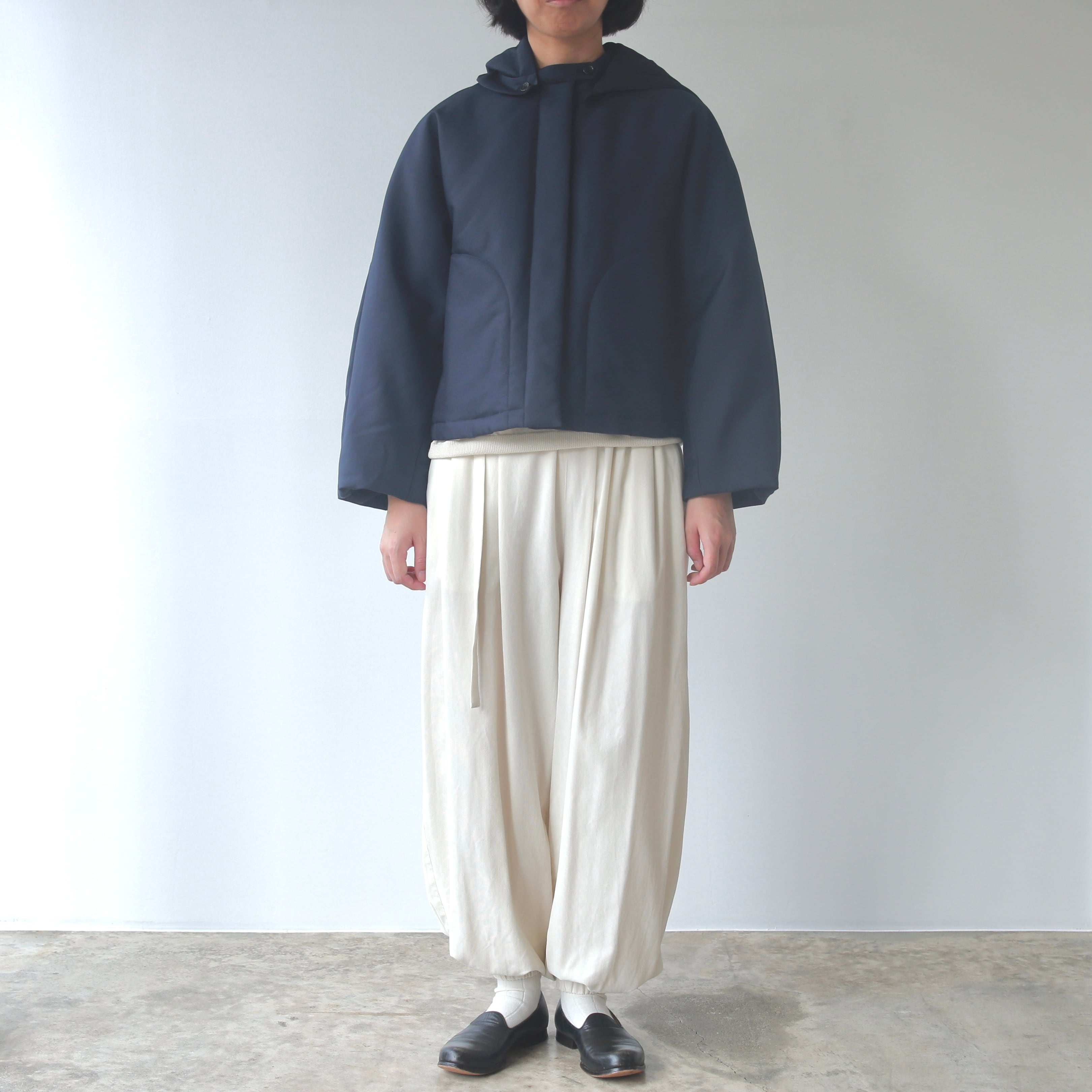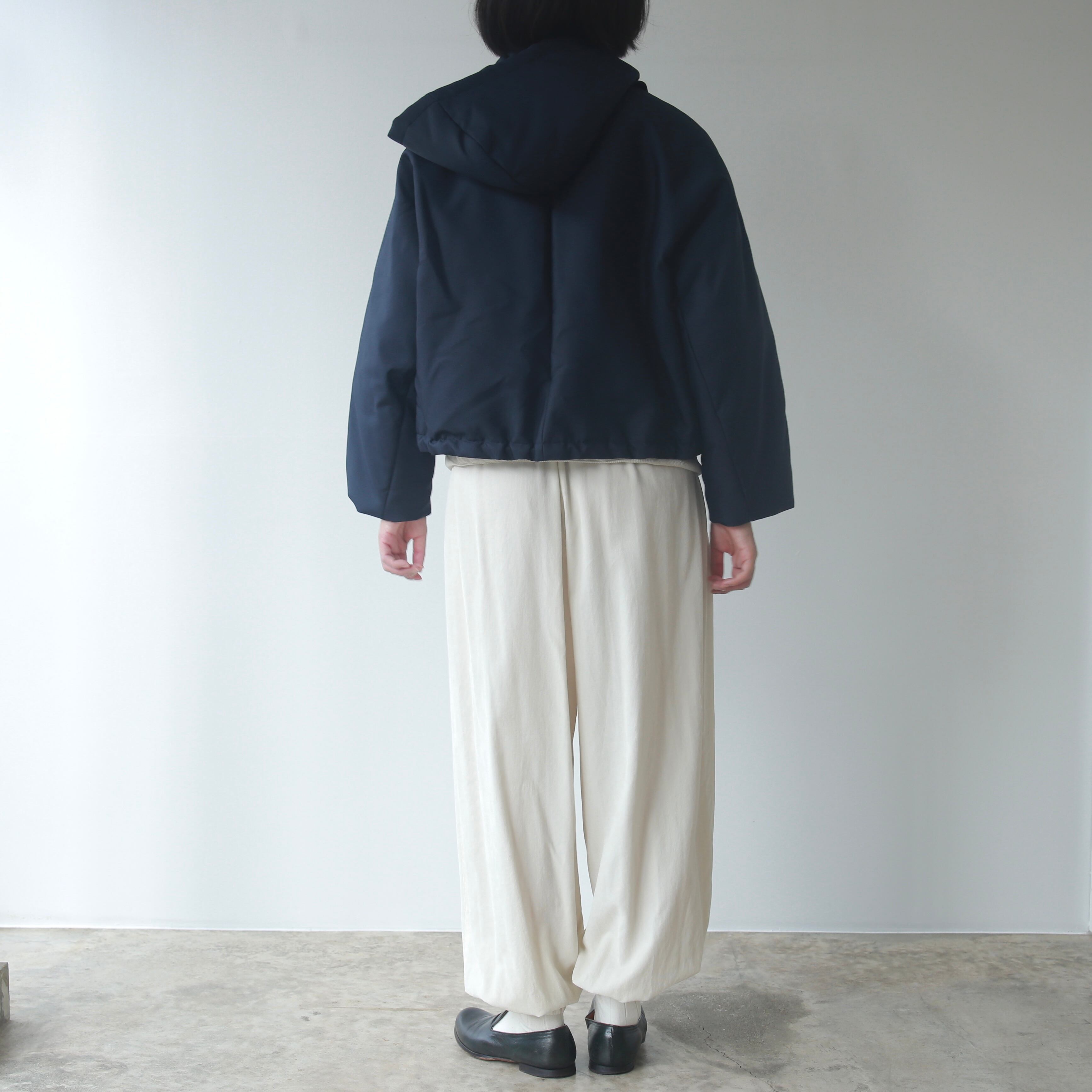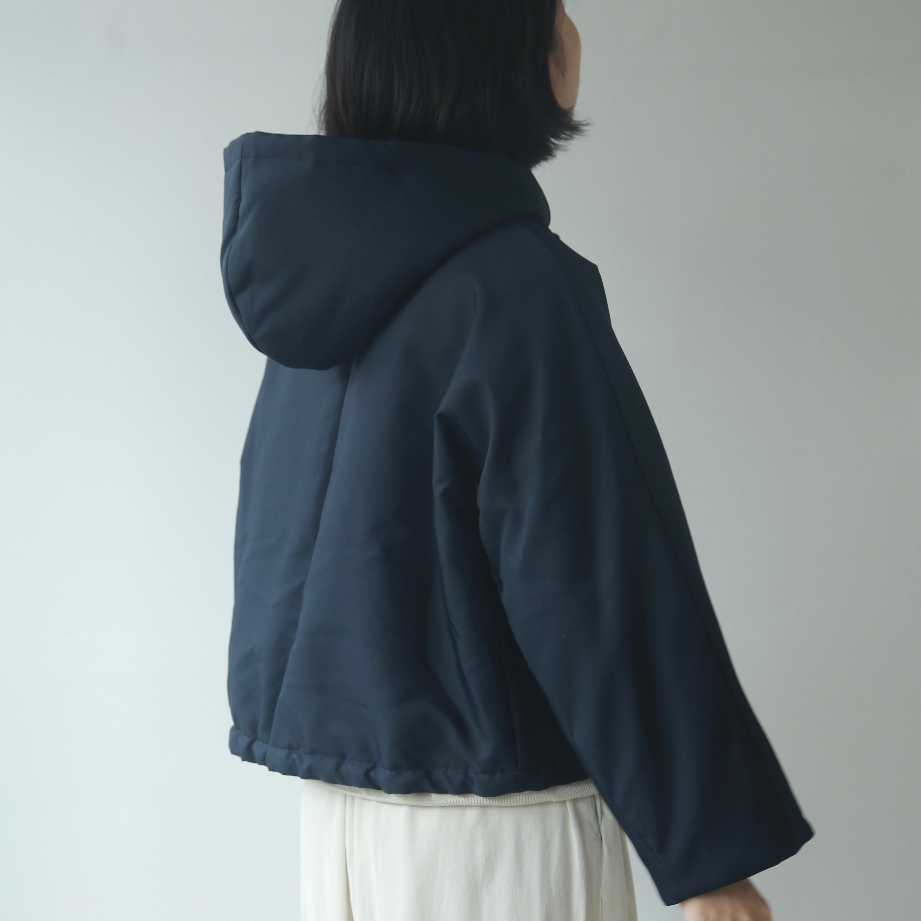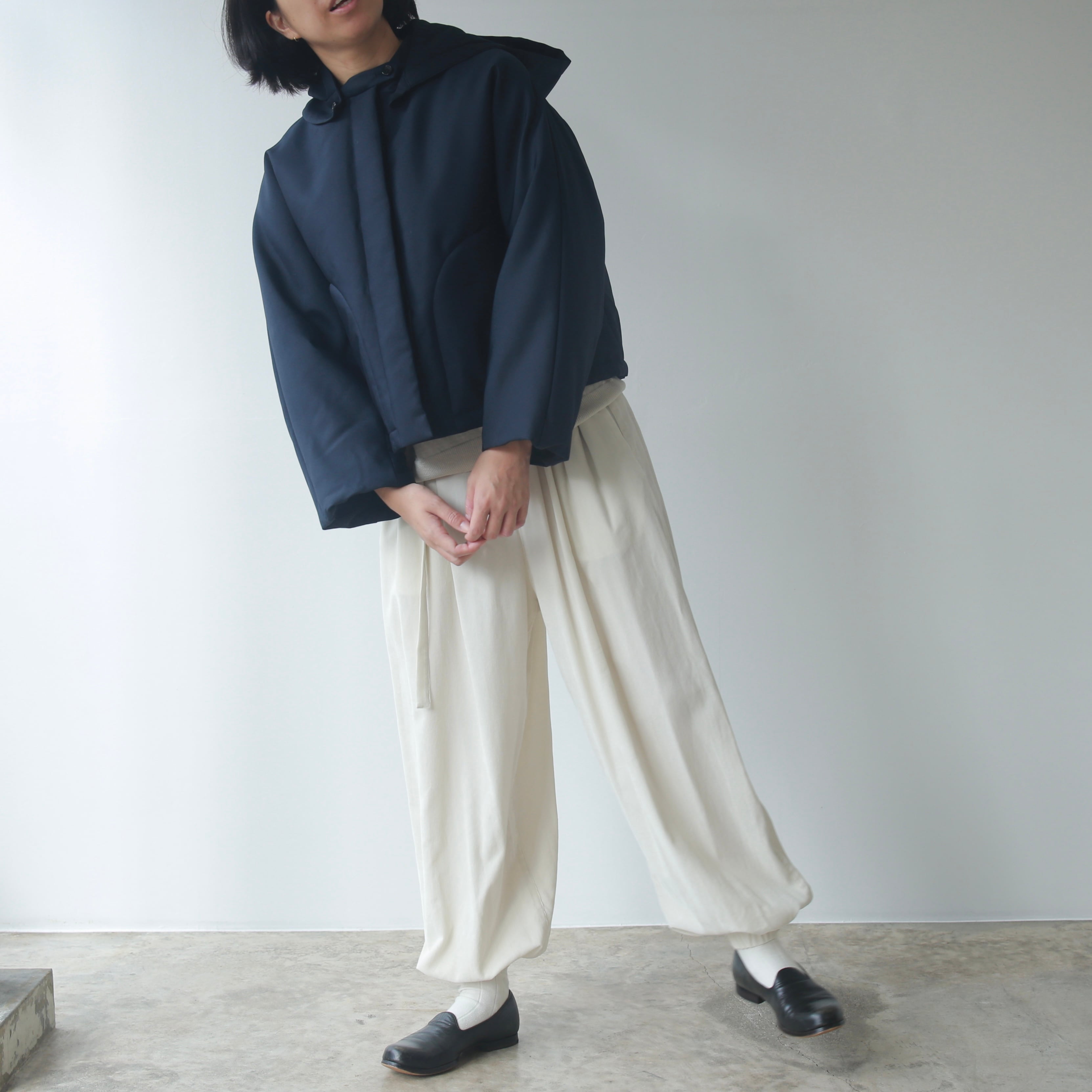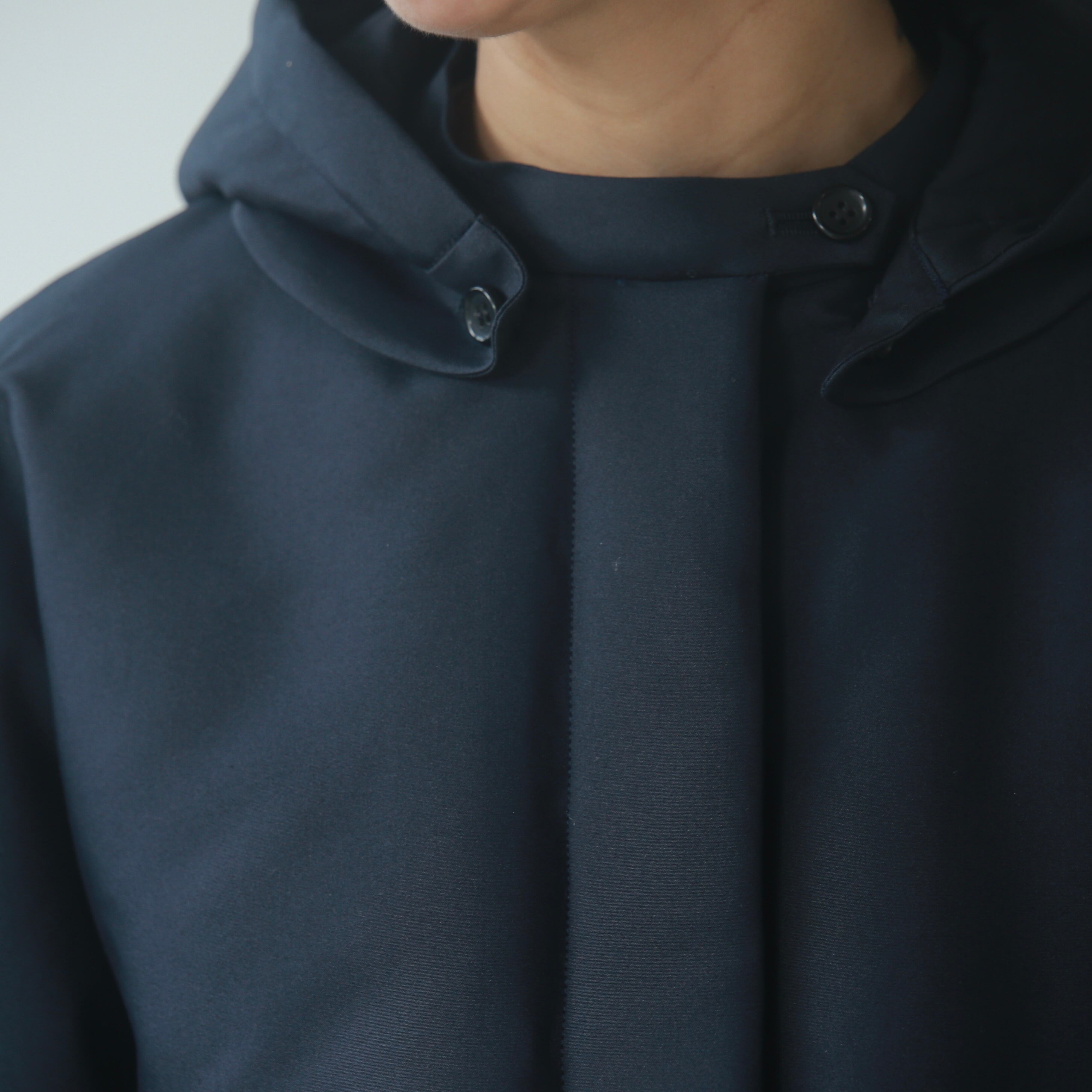 フードは取り外しが可能な仕様となっています。取り外しても残るボタンが良いアクセントとなっておりますが、立体的なフードの形がとてもきれいなので付けたまま着用して頂くのもオススメ。その日の気分や合わせるものによってアレンジを愉しめます。裾内側にコードがついているので着丈やシルエットも変えることが可能です。絞って頂くと丸みのあるより可愛らしいシルエットに。
