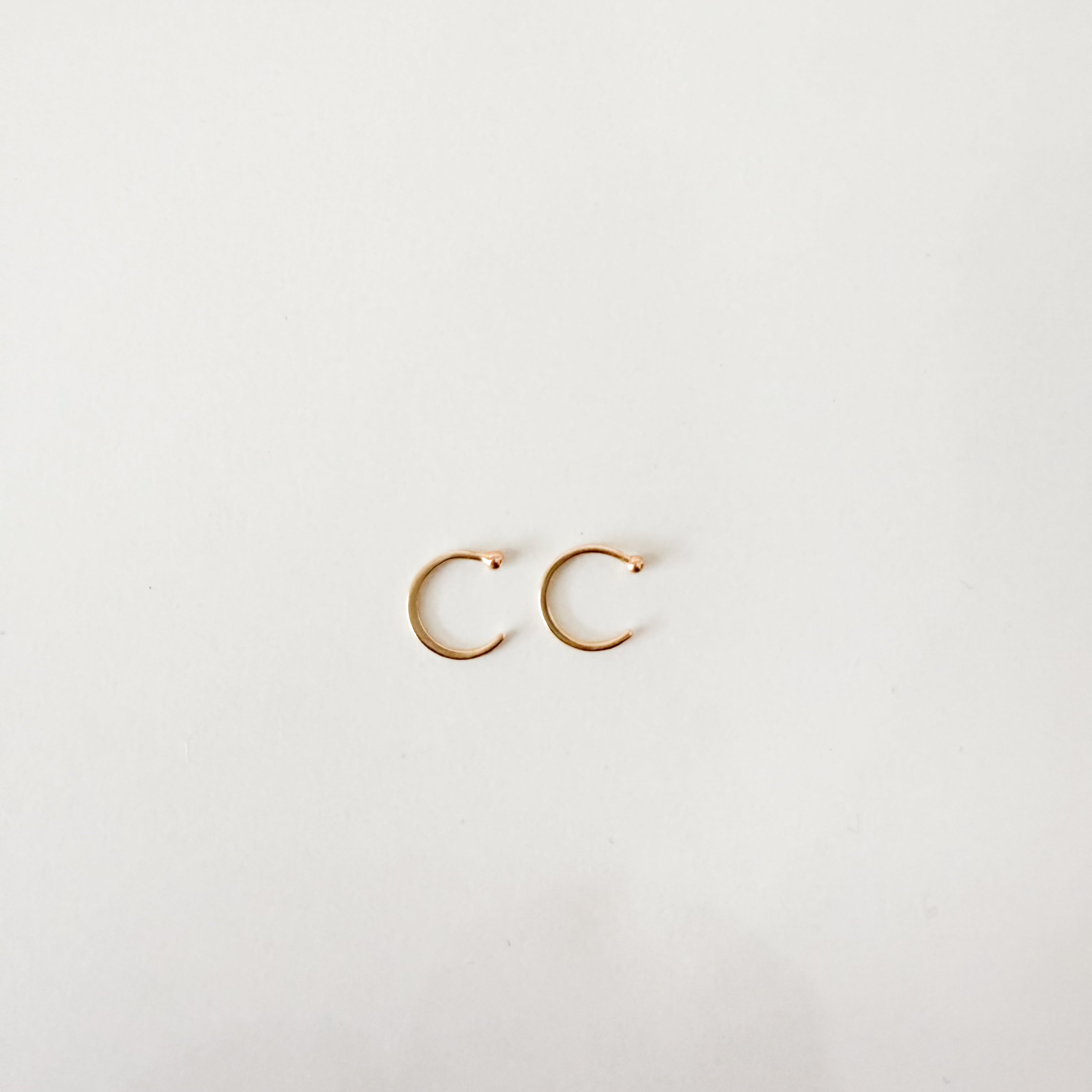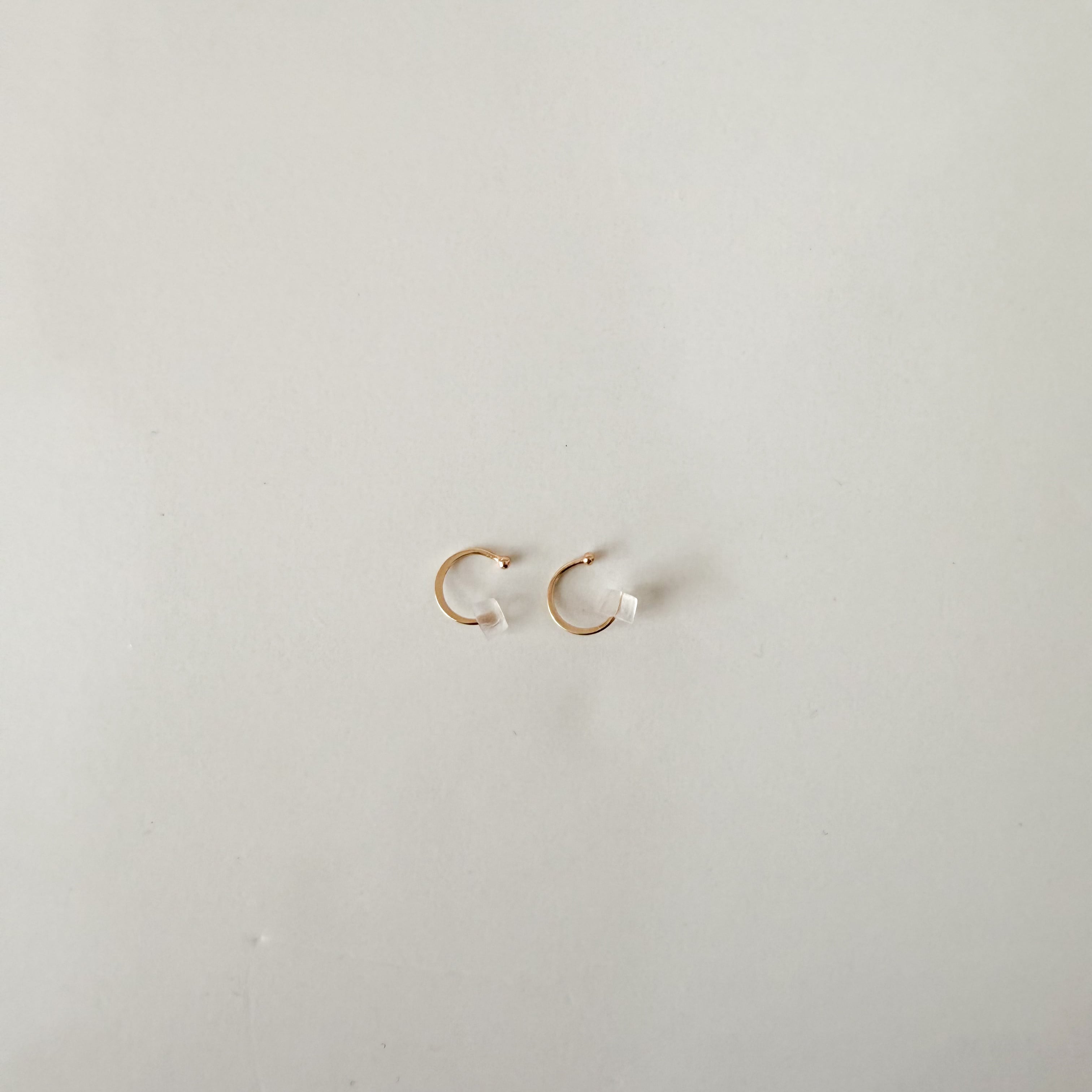 既製のパーツを使用することなく、ゴールドのワイヤーを用いて、ハンマーやローラーなどの原始的な道具を巧みに操りながら形作られています。ワイヤーのみで作られたピアスは余計なパーツがありまさん。軽いので日常的に使いやすいです。このままでも着用いただけますが、抜け落ちが心配な方は付属のシリコンキャッチをご利用ください。ちょこんと点が耳からのぞく姿がなんとも愛らしいピアスです。