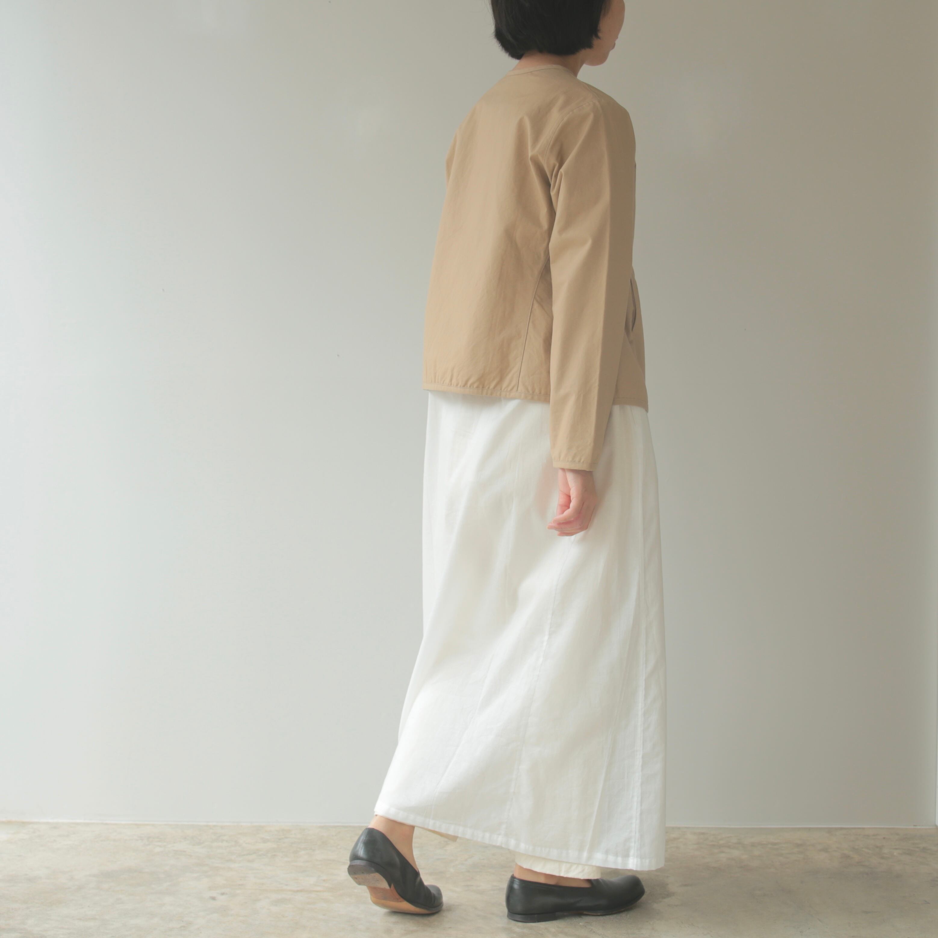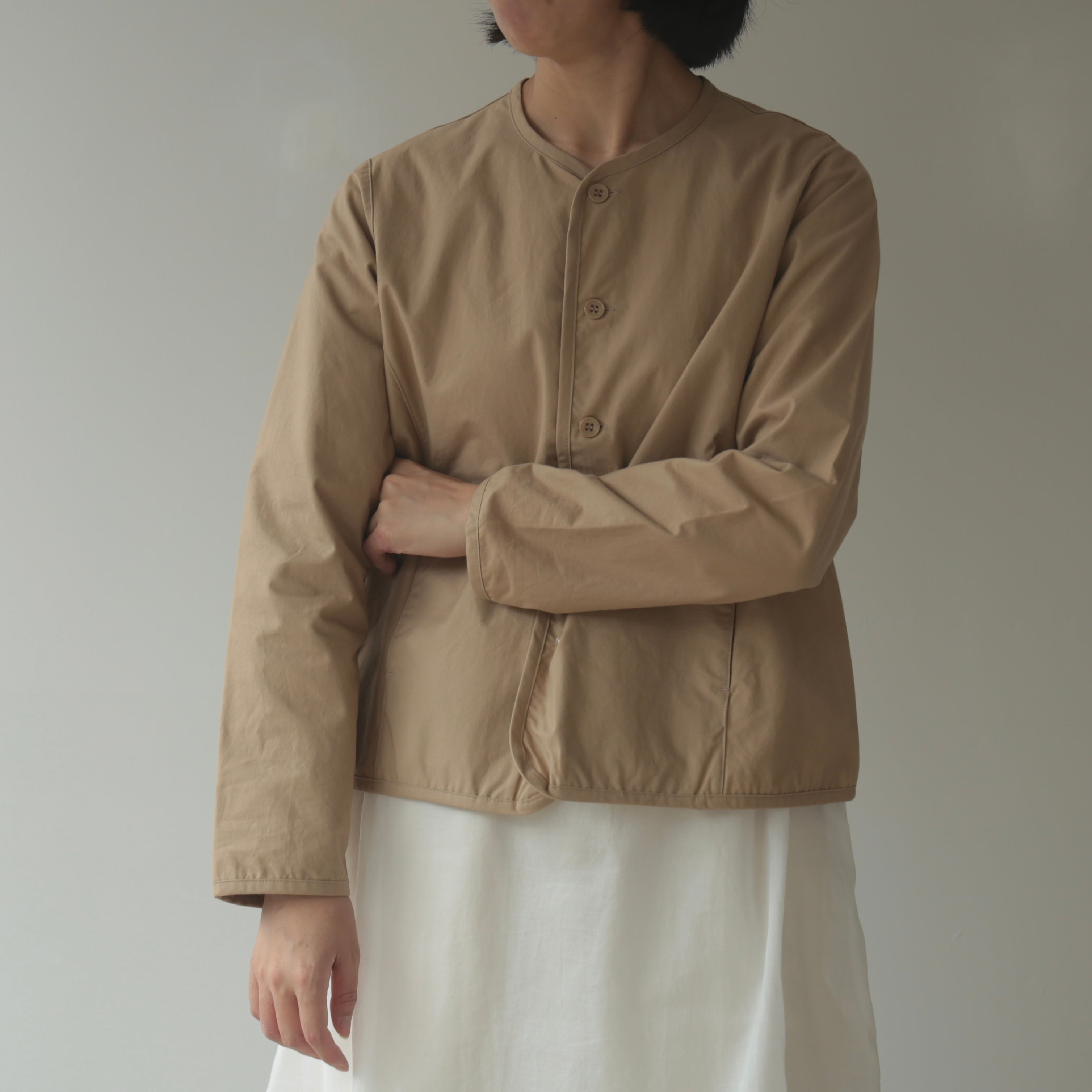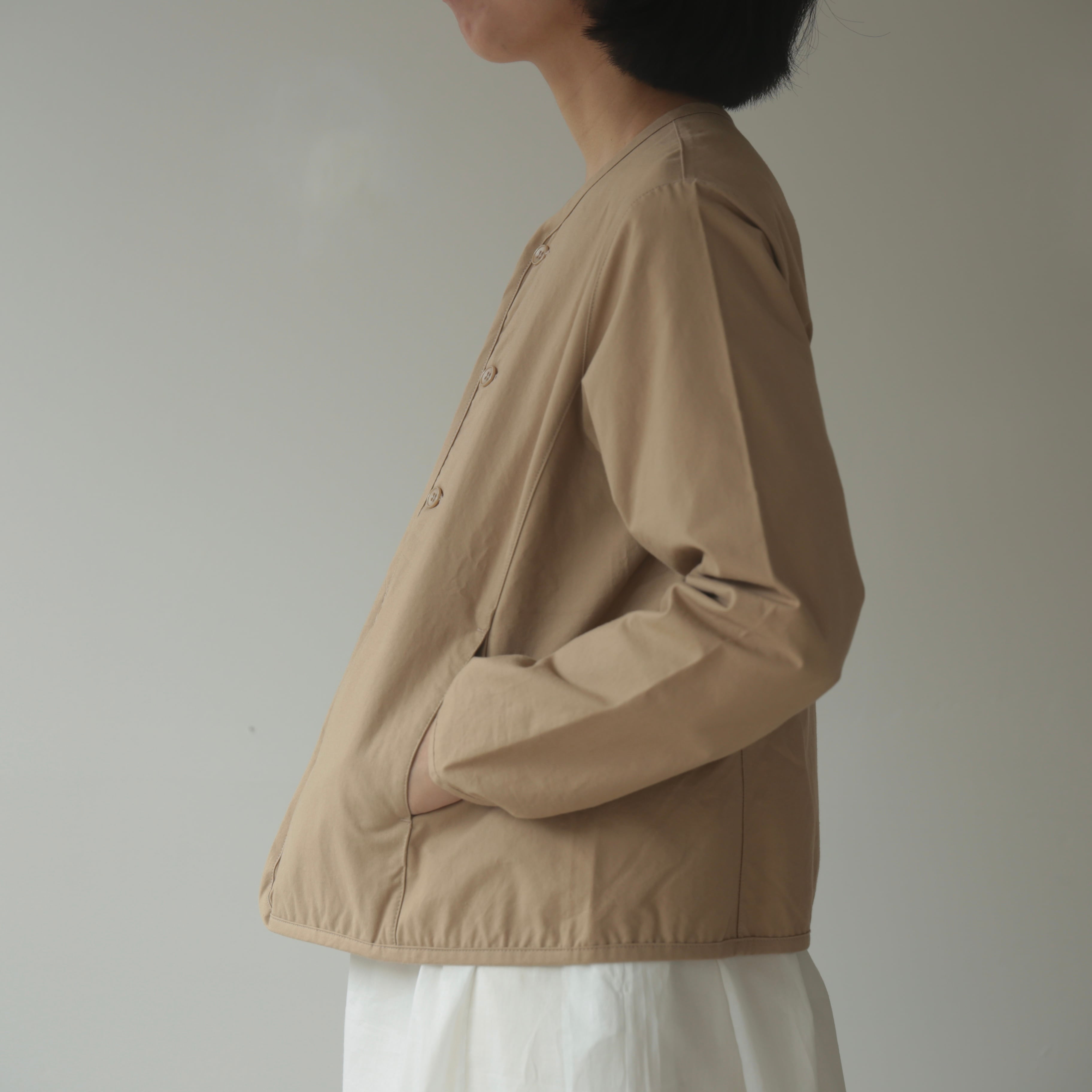 春や秋はワンピースにさらりとカーディガンのように羽織れます。ノーカラージャケットは甘過ぎずかっこよくもなり過ぎずどんな装いにも合わせやすいです。シンプルながらもパイピングが効いているそんなジャケット。