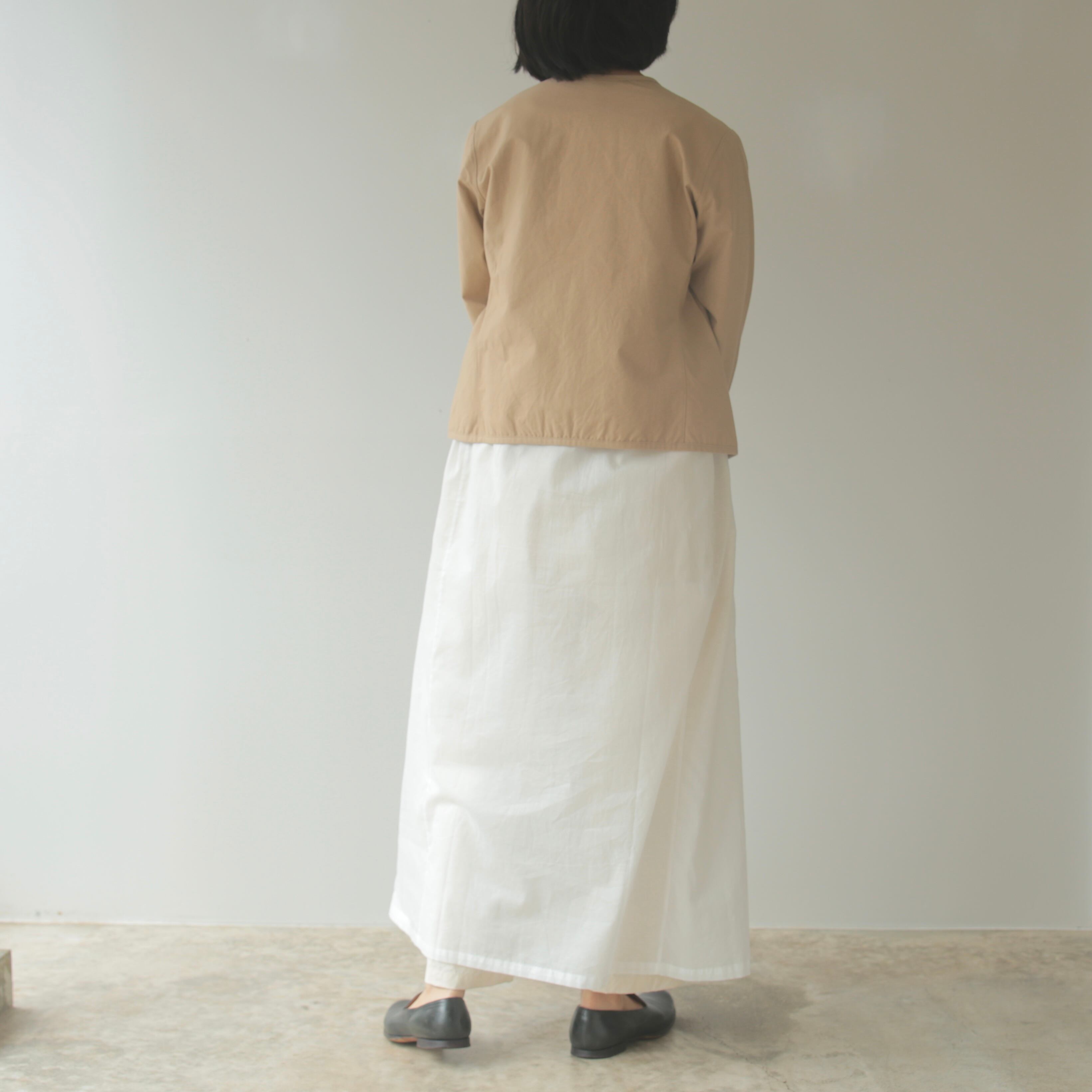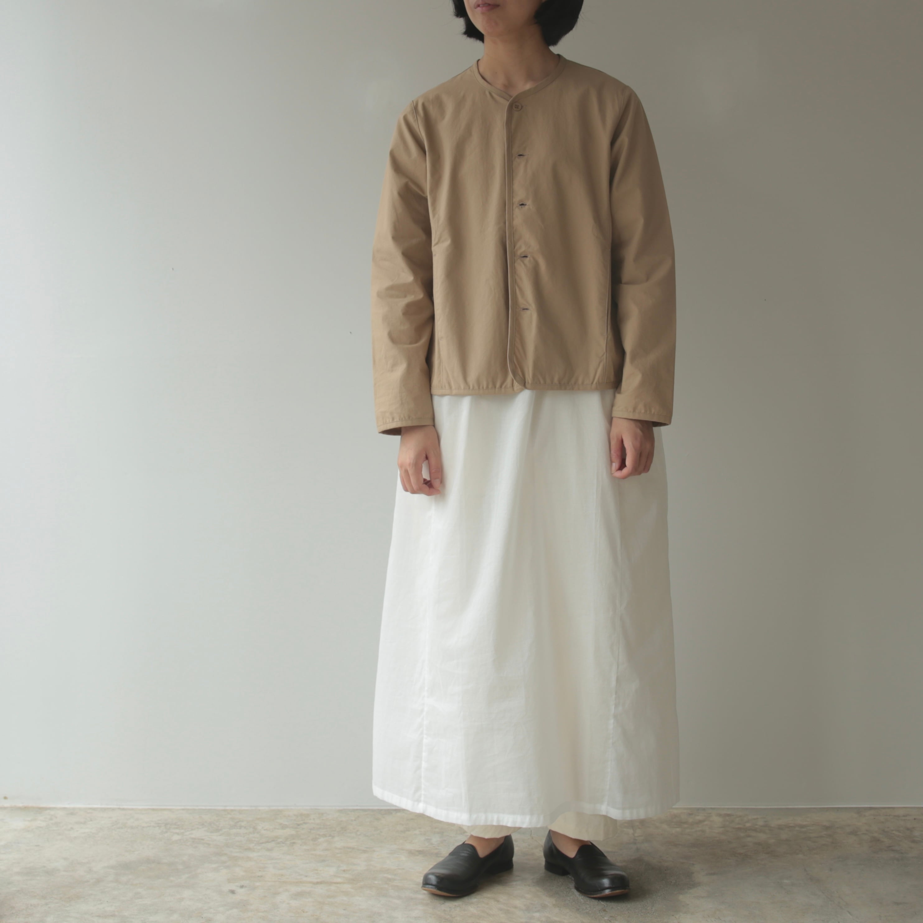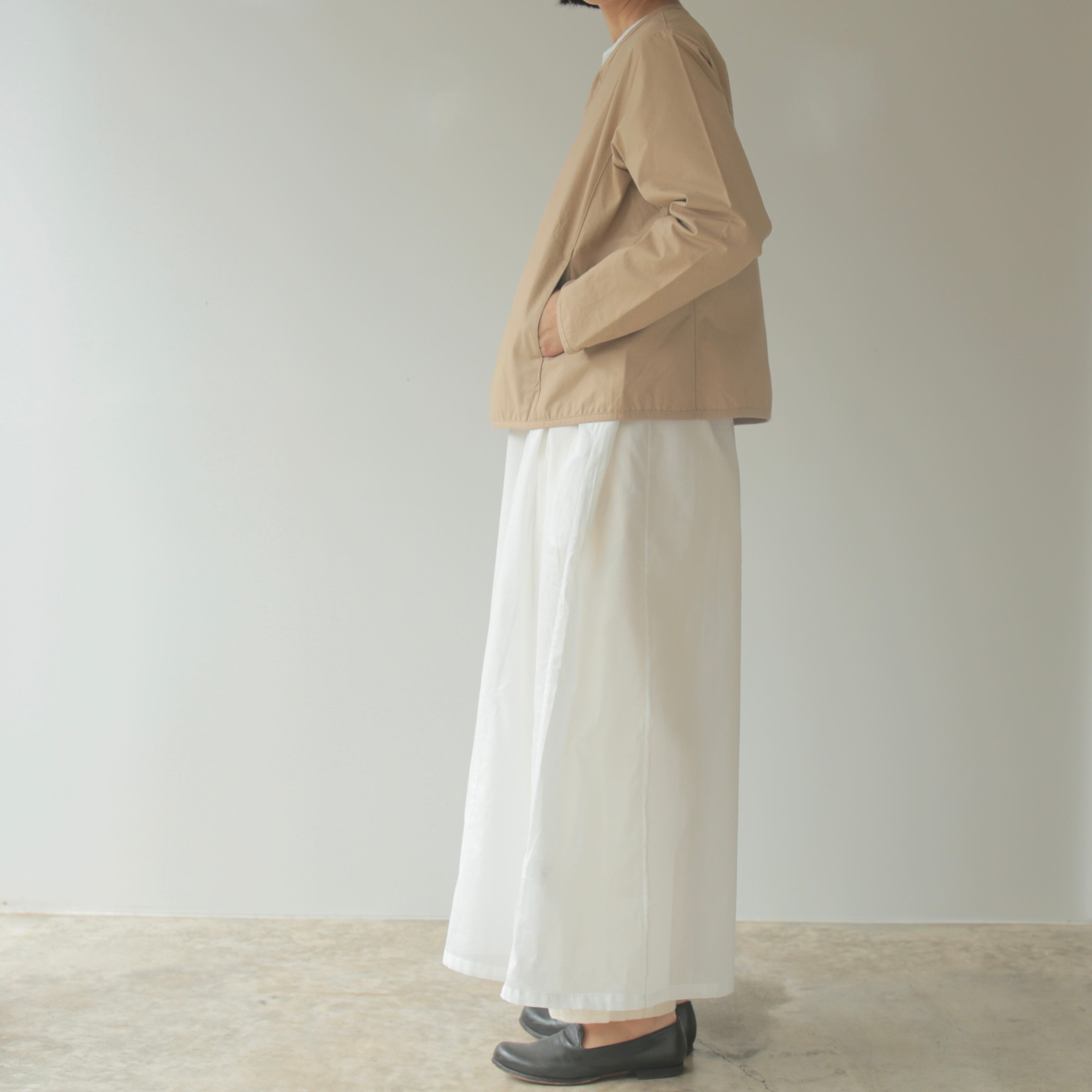 春や秋はワンピースにさらりとカーディガンのように羽織れます。ノーカラージャケットは甘過ぎずかっこよくもなり過ぎずどんな装いにも合わせやすいです。シンプルながらもパイピングが効いているそんなジャケット。