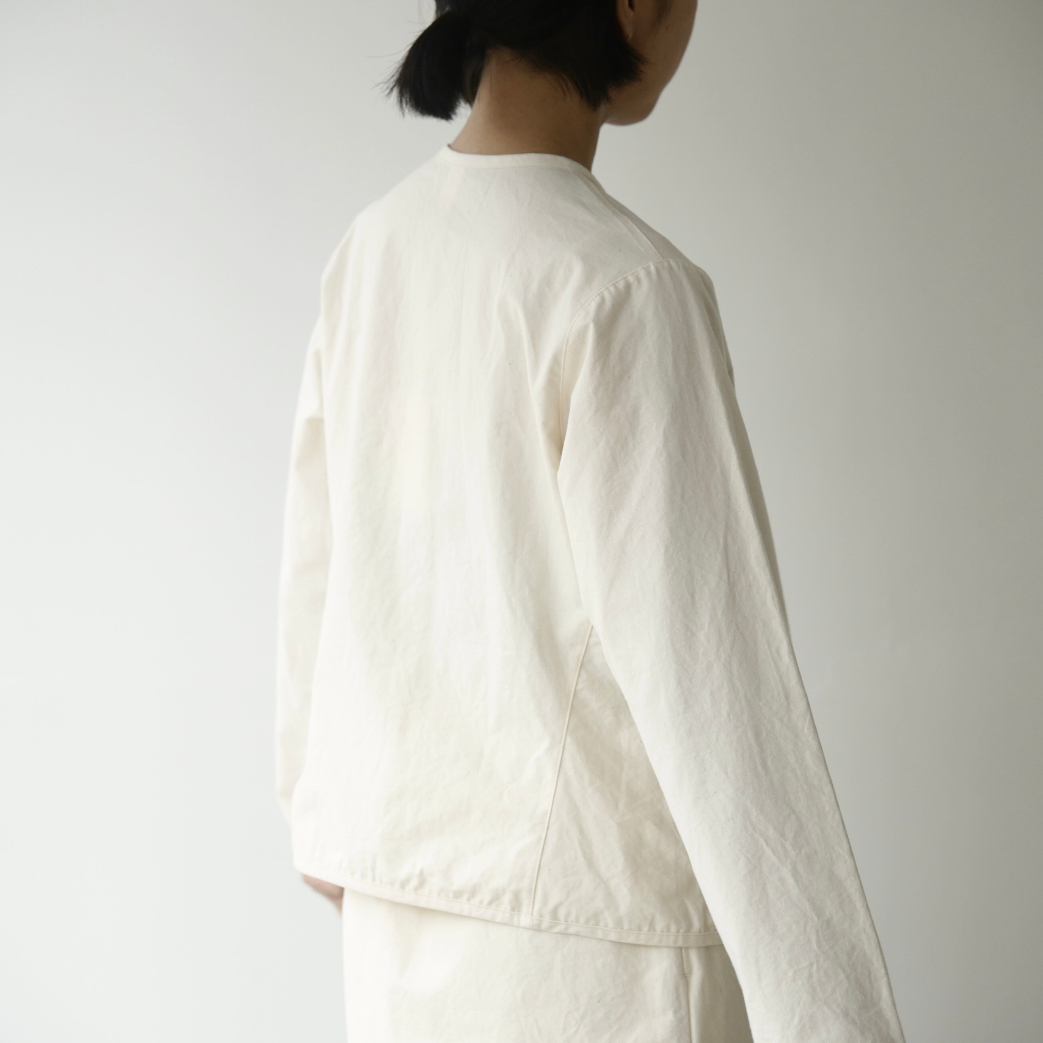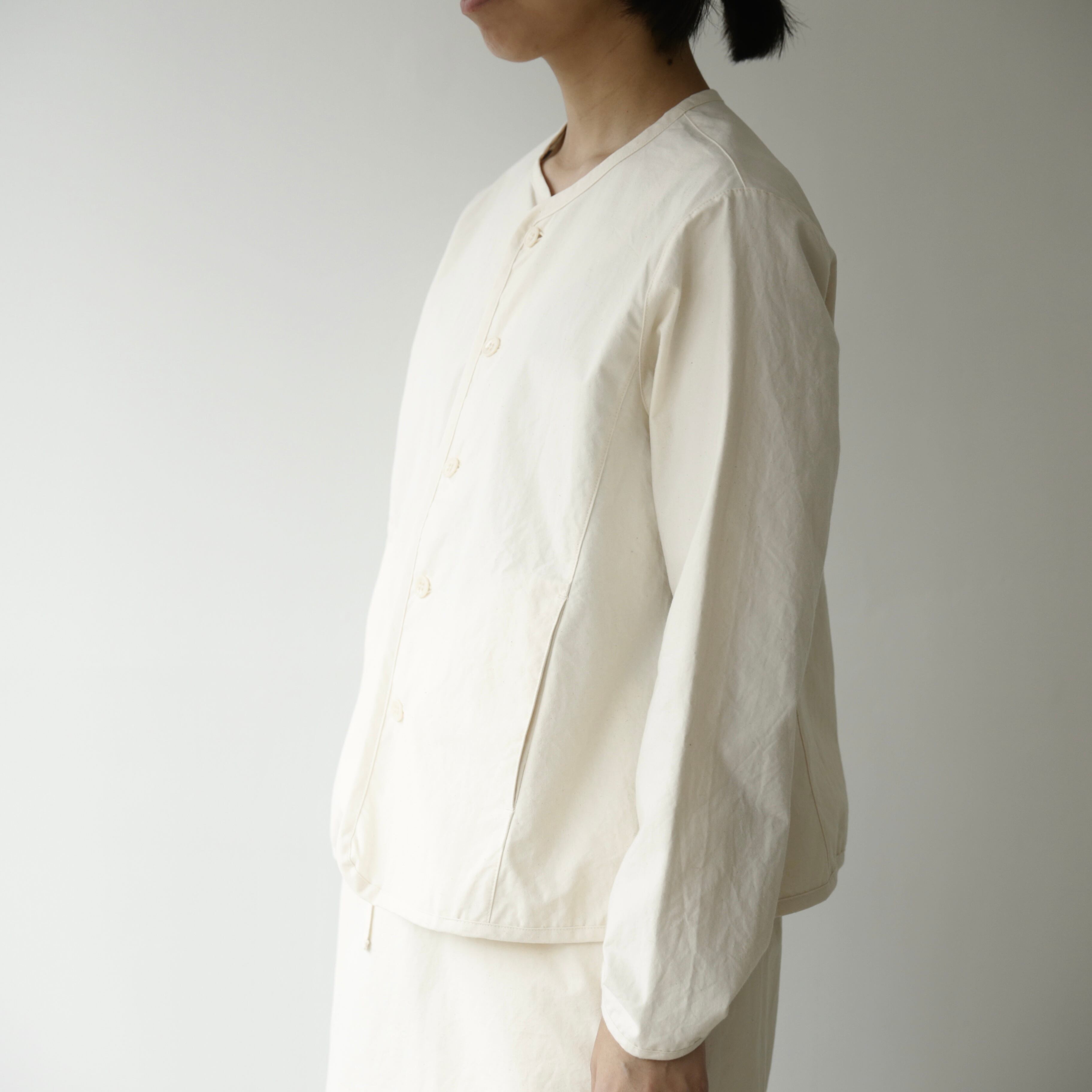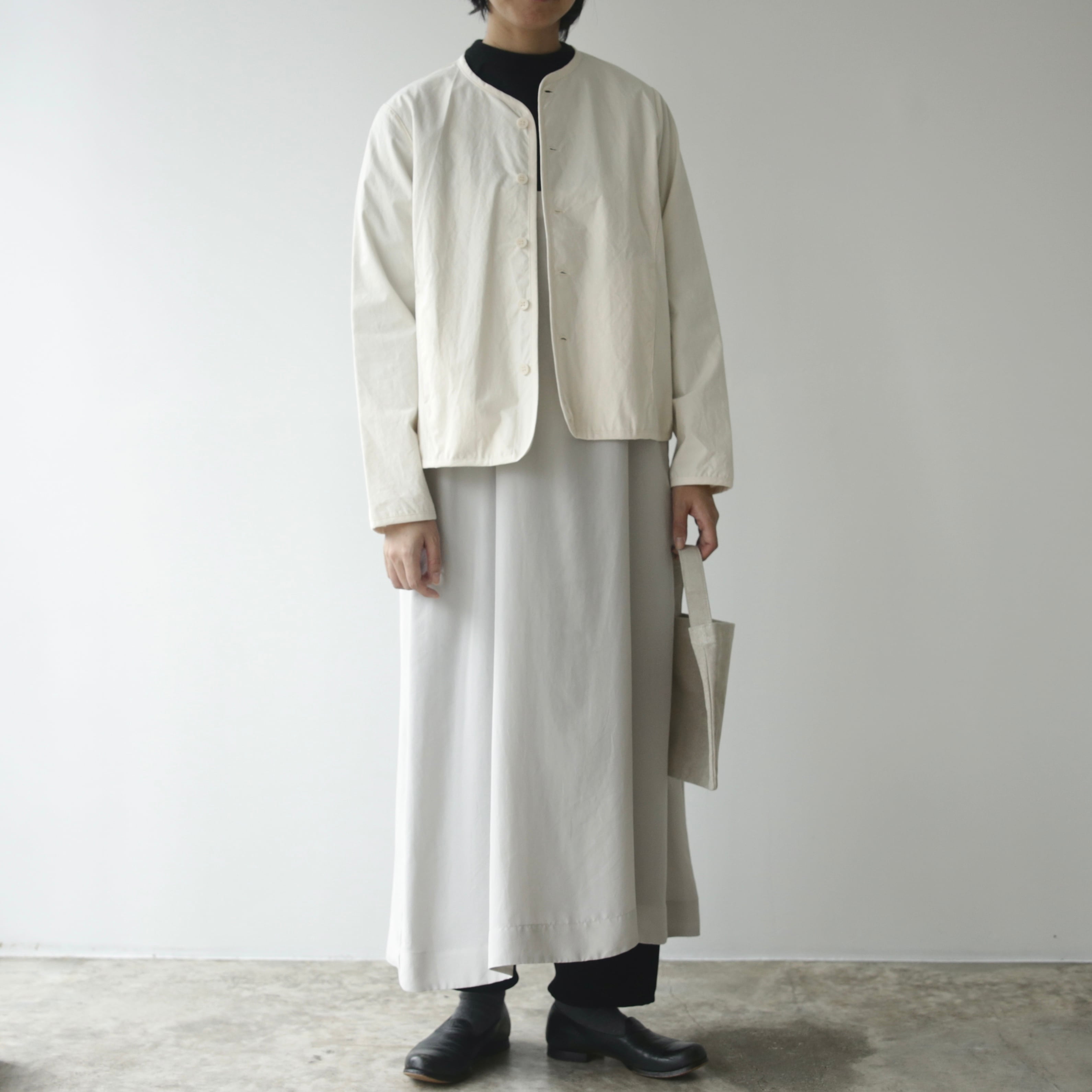 程よいハリのあるしっかりとした馬布のジャケットは着れば着るほどに風合いが増してきます。春や秋はワンピースにさらりとカーディガンのように羽織れます。ノーカラージャケットは甘過ぎずかっこよくもなり過ぎずどんな装いにも合わせやすいです。シンプルながらもパイピングが効いているそんなジャケット。