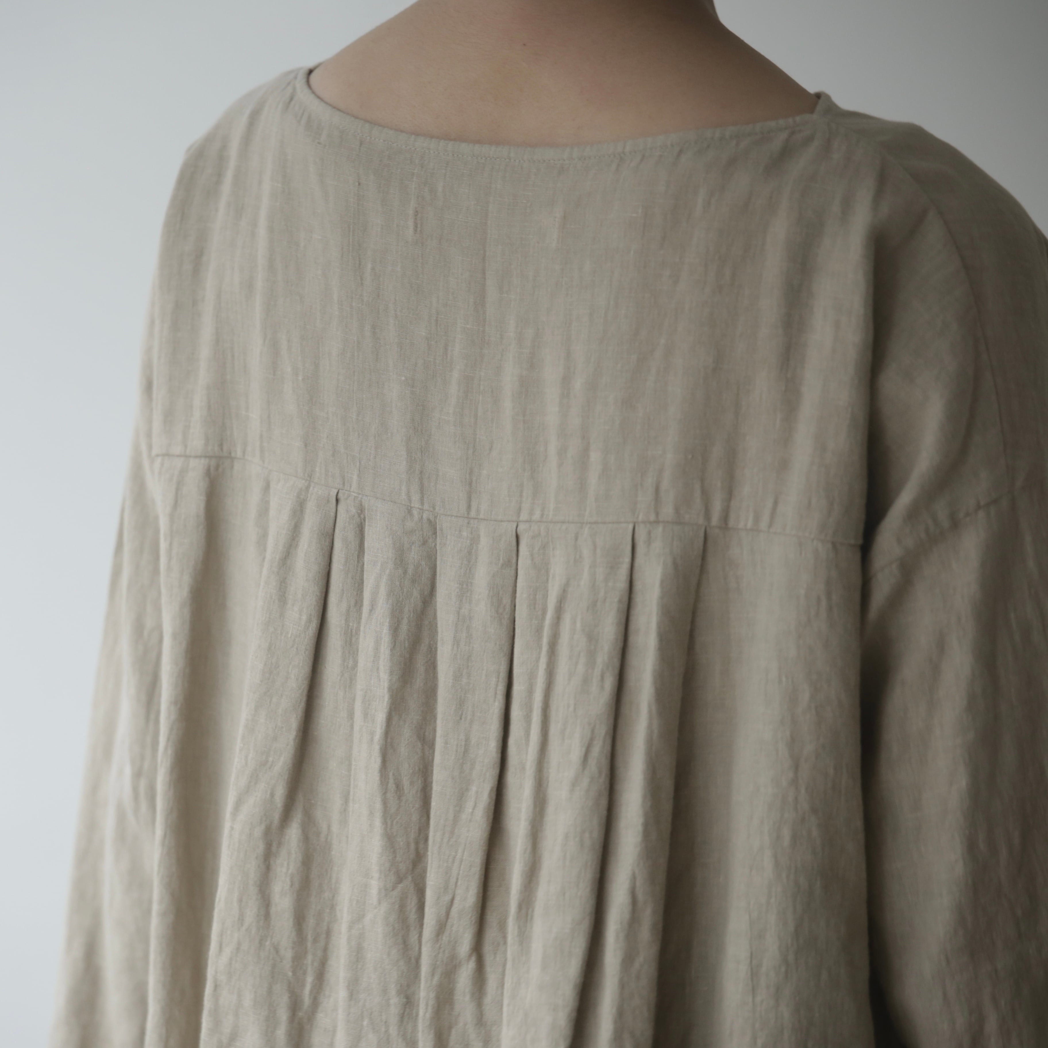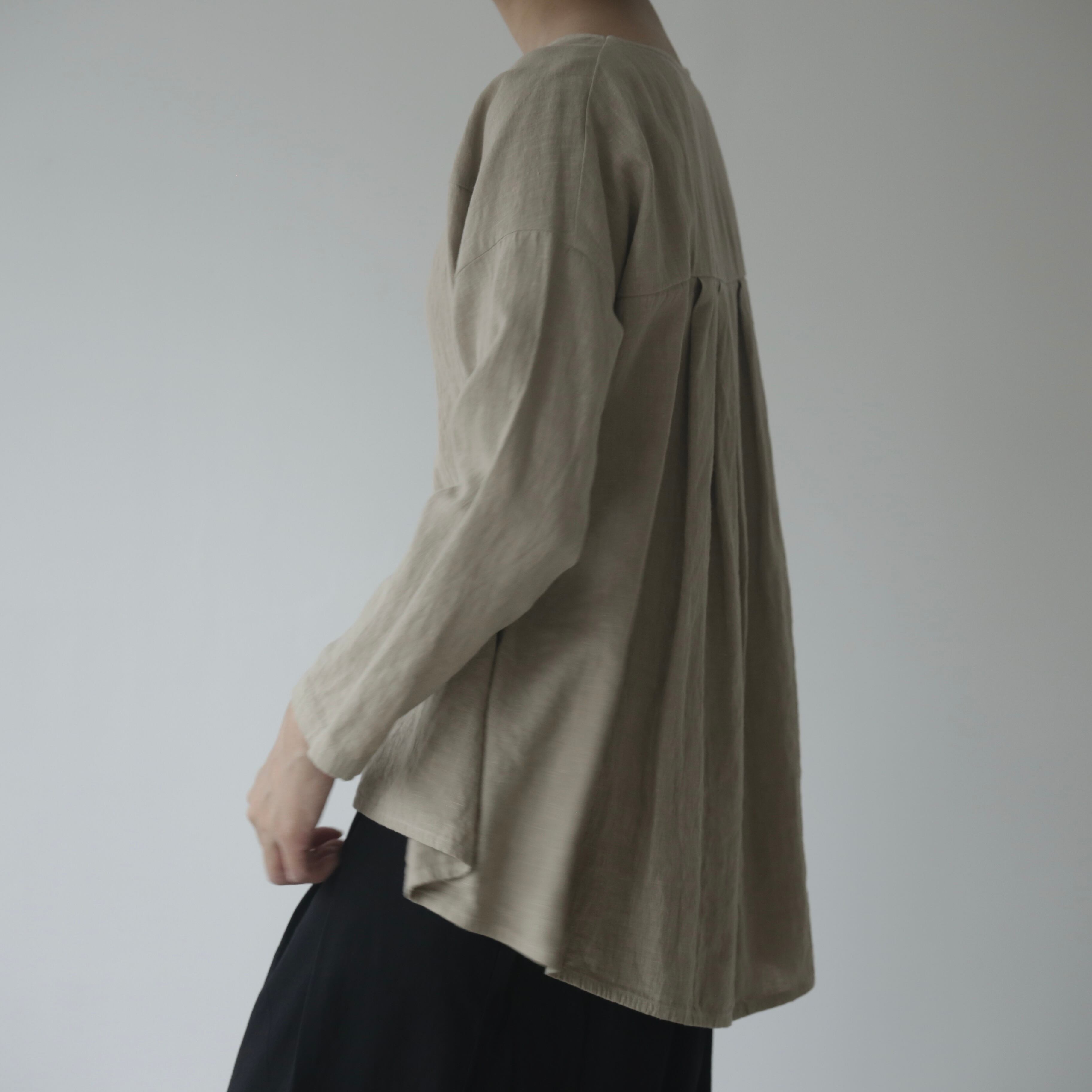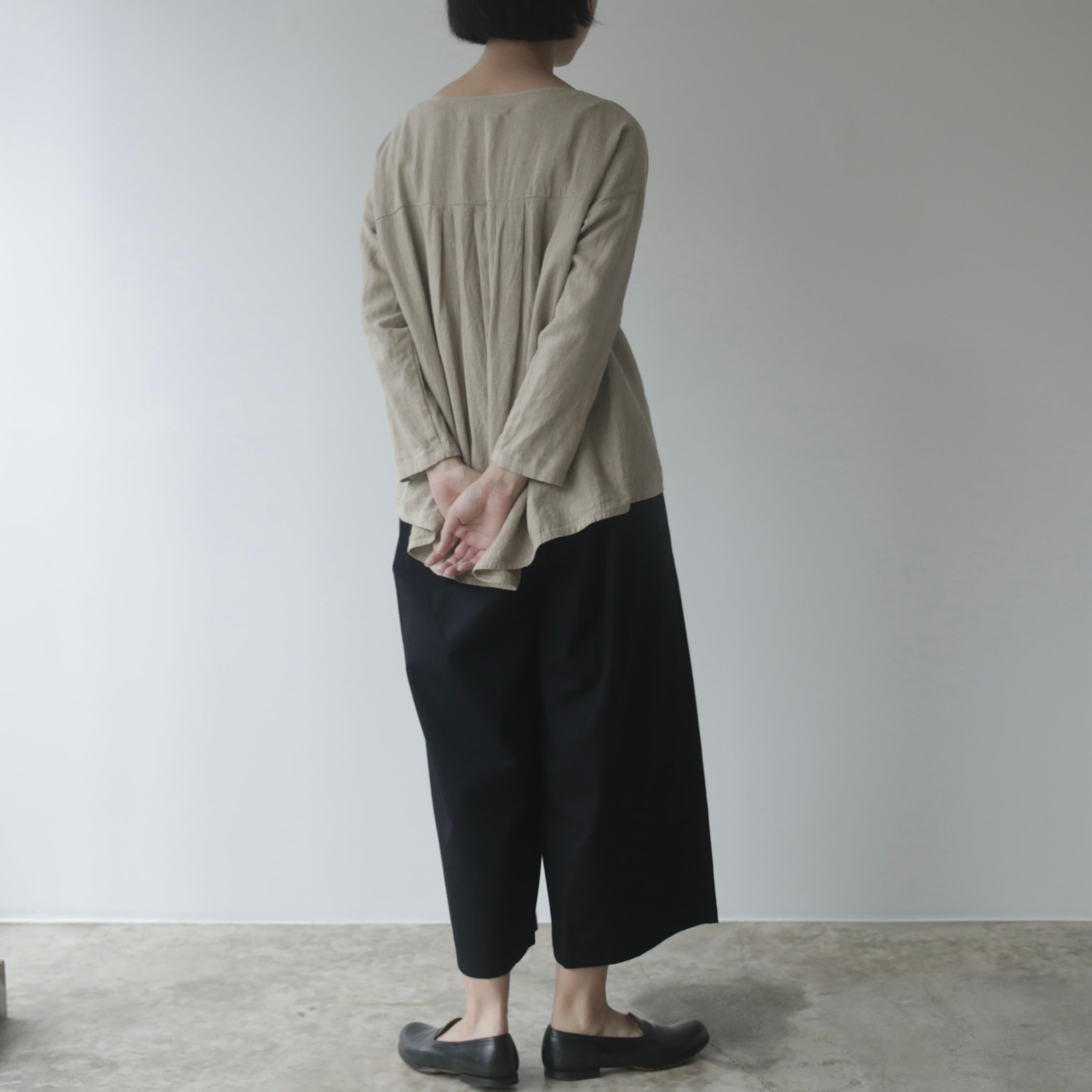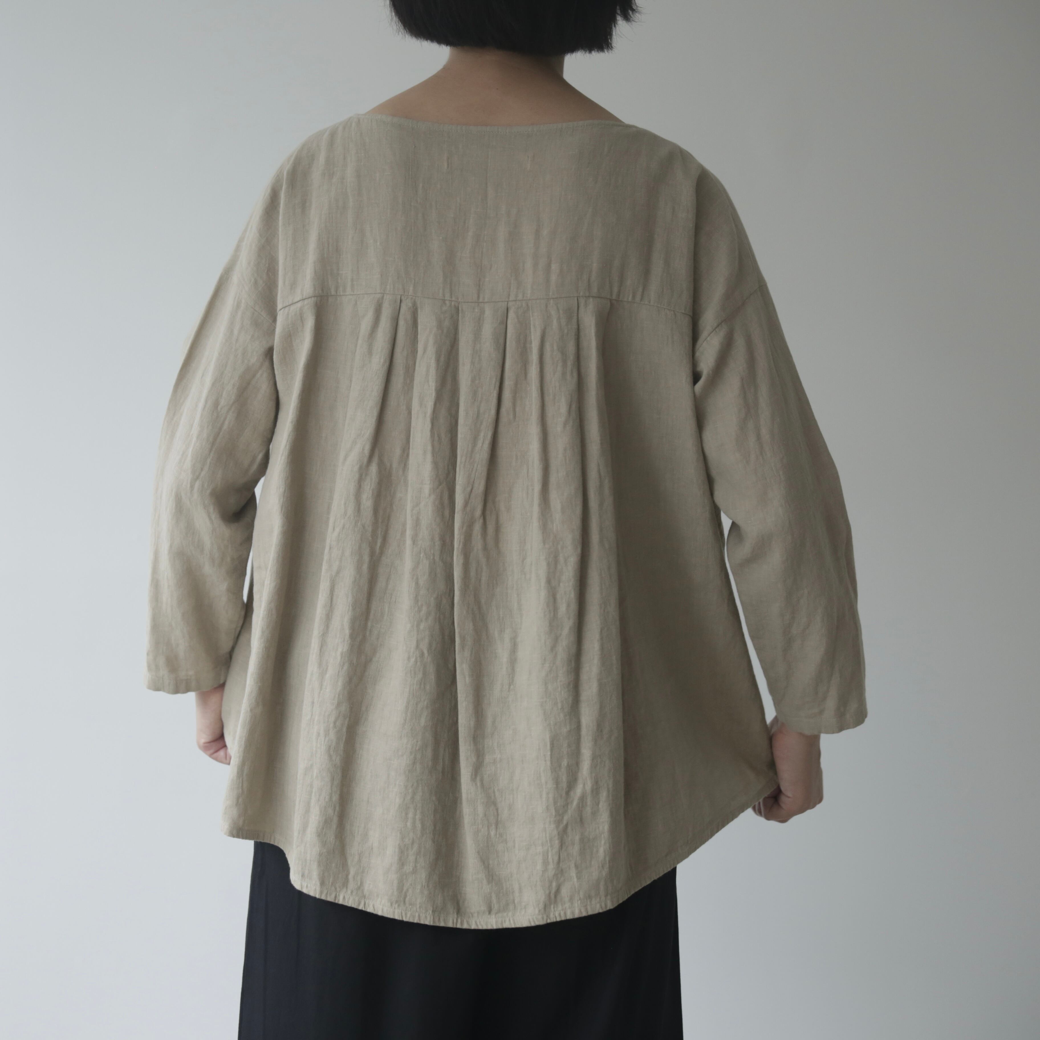 身幅・肩幅ともにゆったりとしたサイズ感で、涼しくリラックスして着ていただけます。シンプルなプルオーバーながら、後ろ身頃に施したタックが大人っぽさと可愛らしさを添えてくれます。後ろ丈は少し長めで、横から見たときに流れるようなラインを描くのも魅力。ヒップが隠れる安心感のある着丈です。