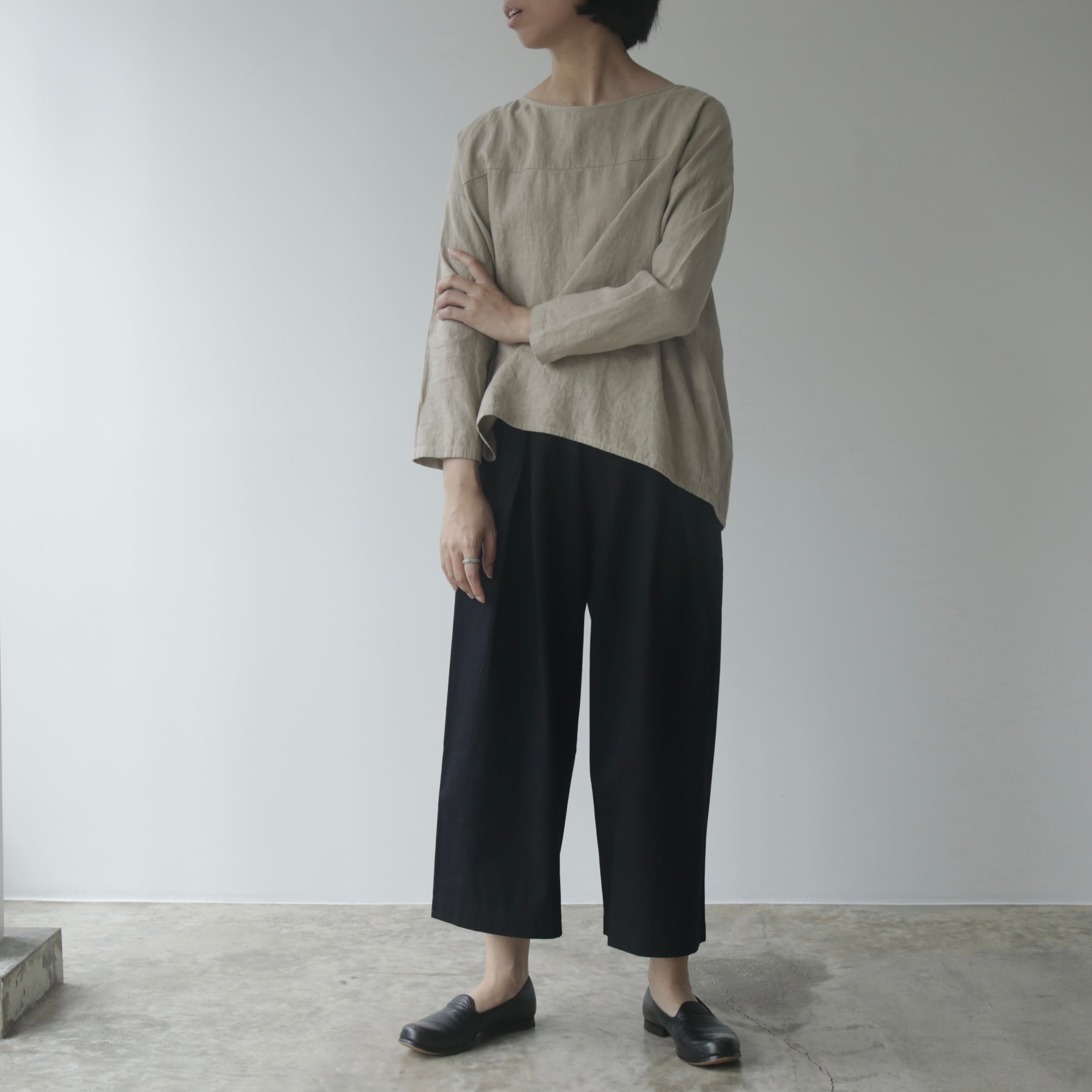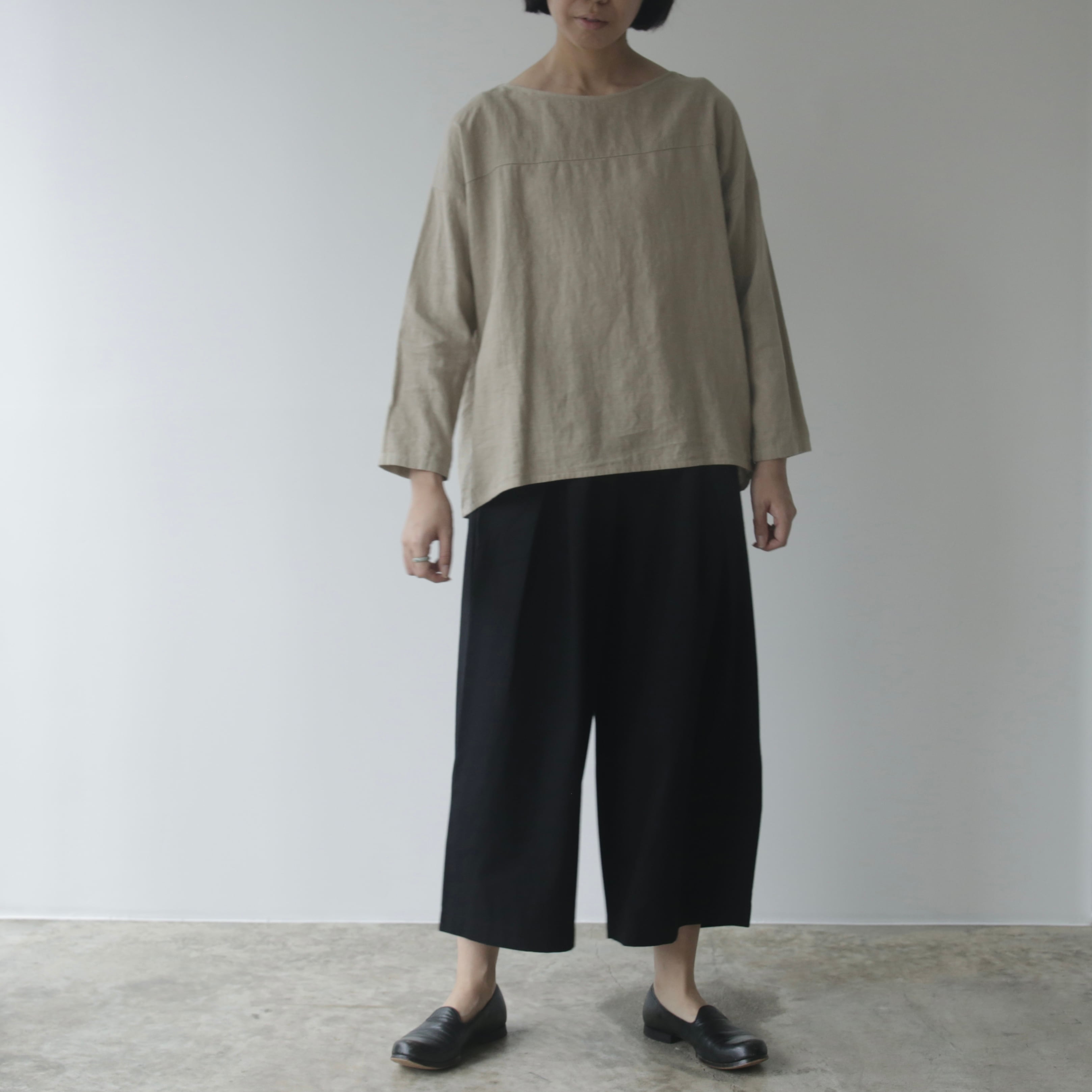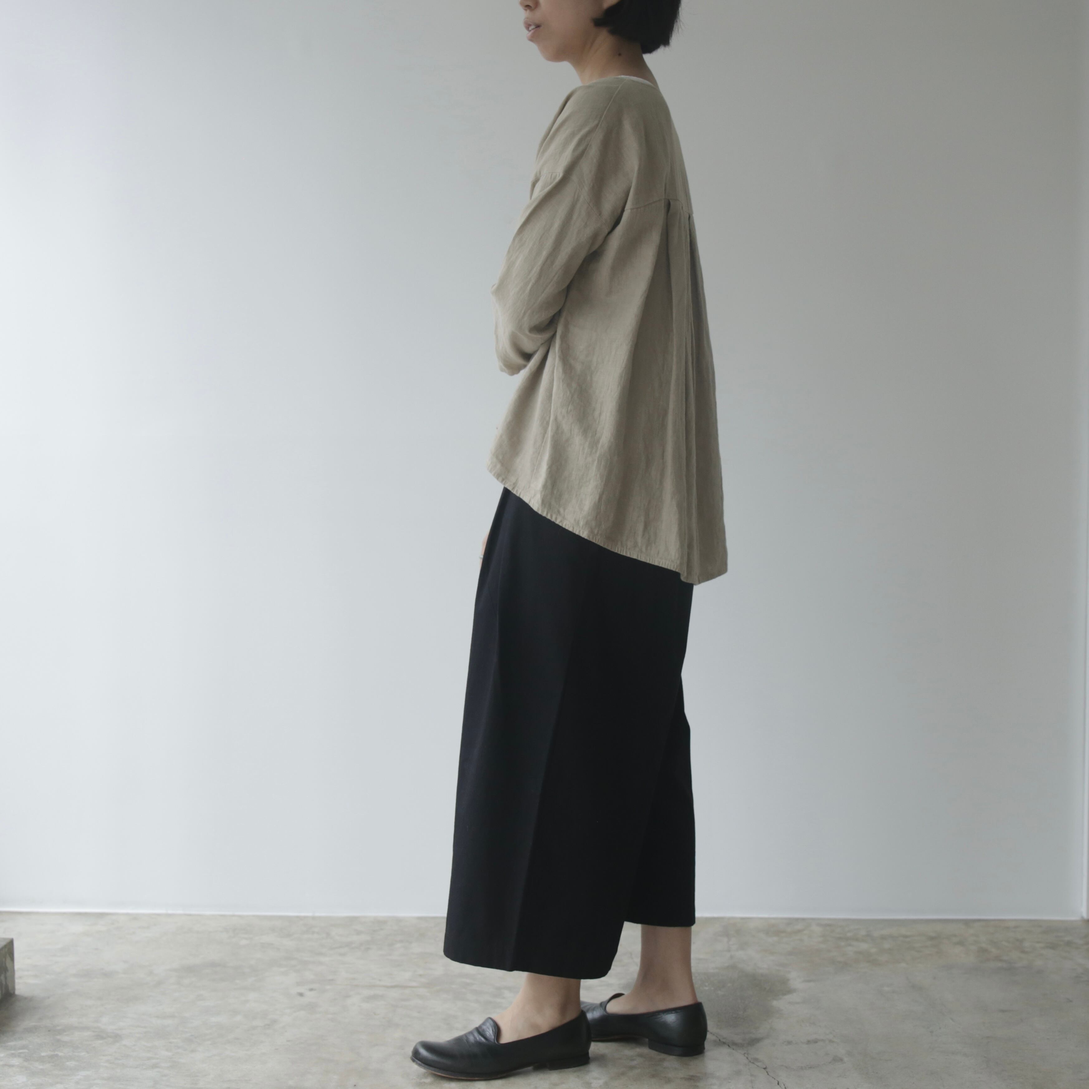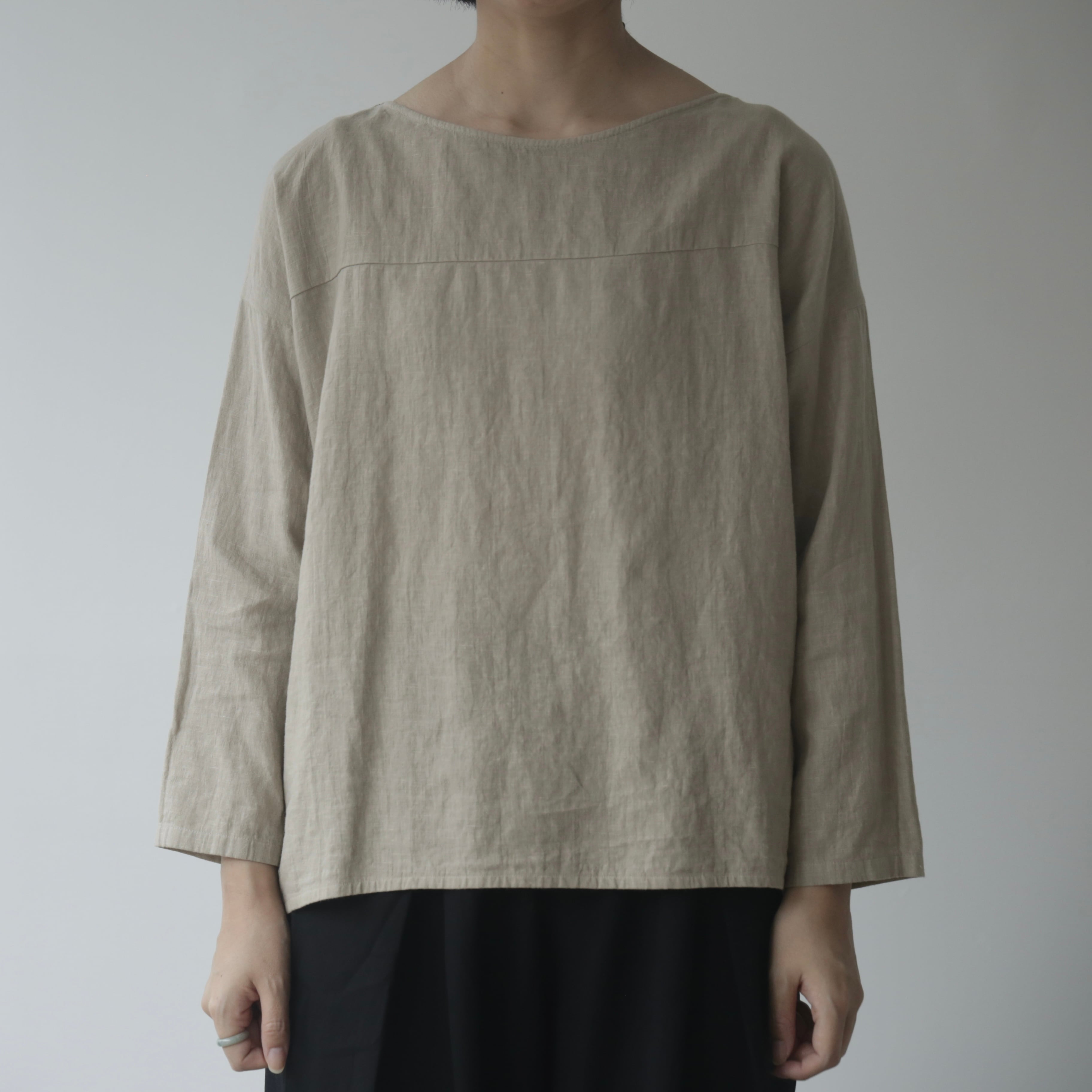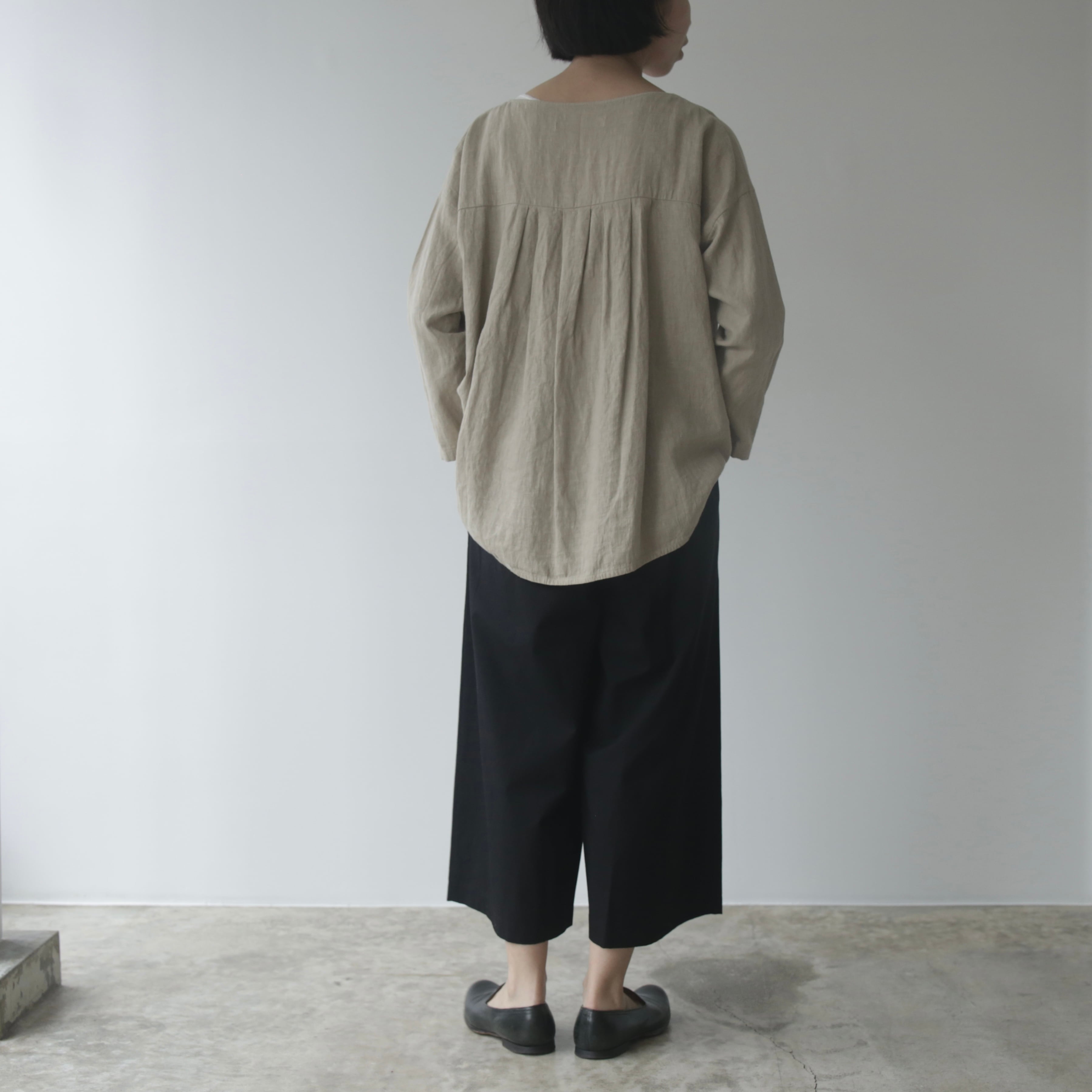 身幅・肩幅ともにゆったりとしたサイズ感で、涼しくリラックスして着ていただけます。シンプルなプルオーバーながら、後ろ身頃に施したタックが大人っぽさと可愛らしさを添えてくれます。後ろ丈は少し長めで、横から見たときに流れるようなラインを描くのも魅力。ヒップが隠れる安心感のある着丈です。