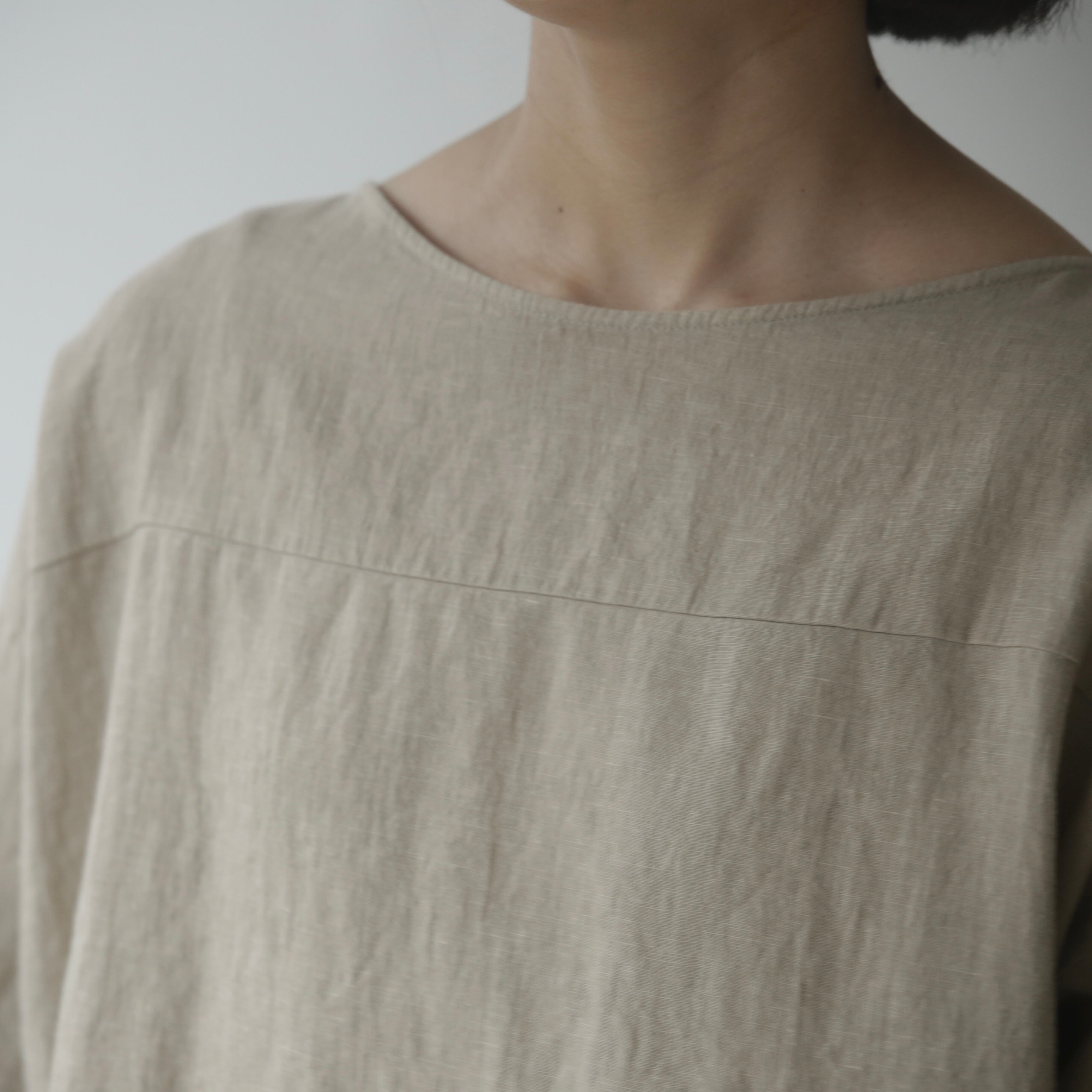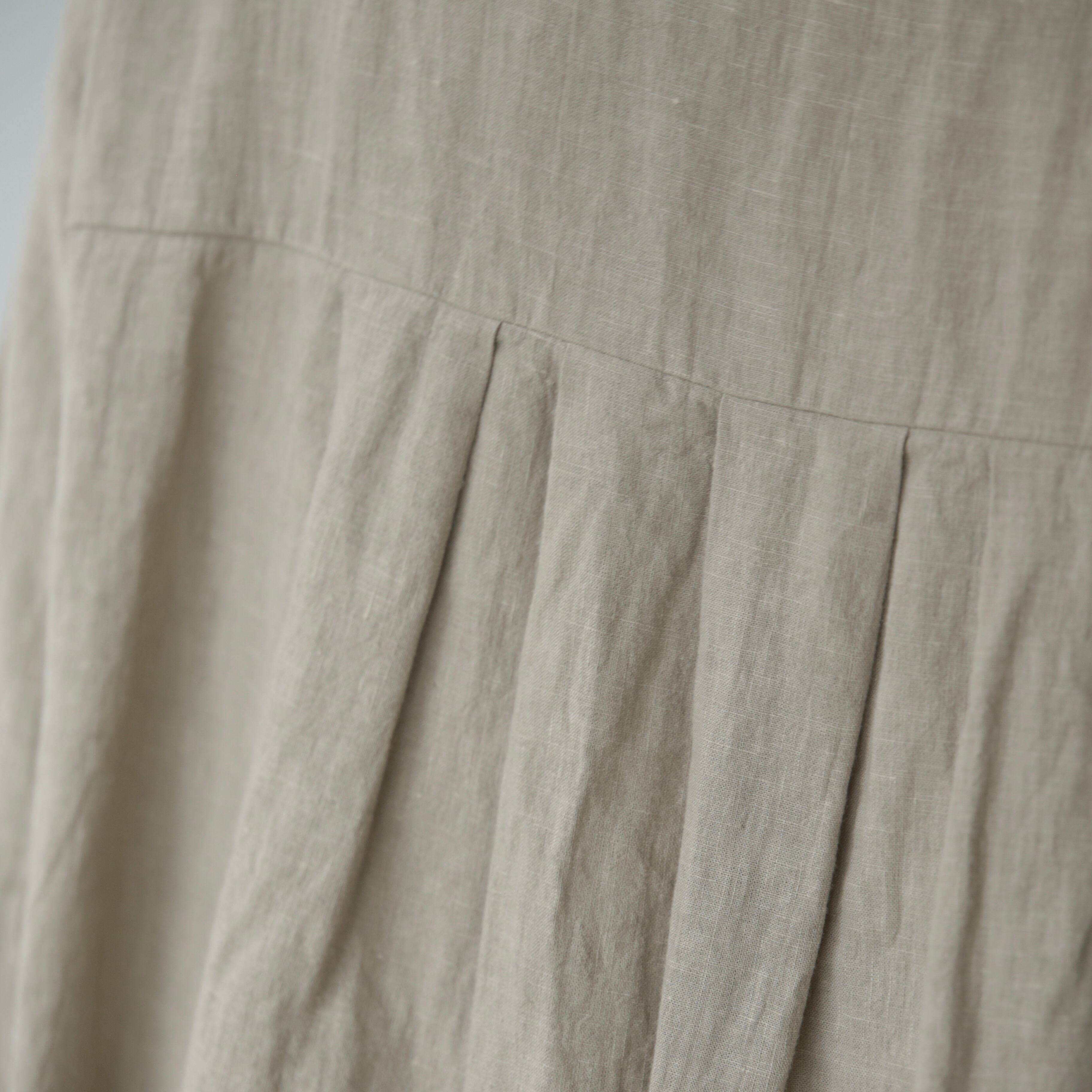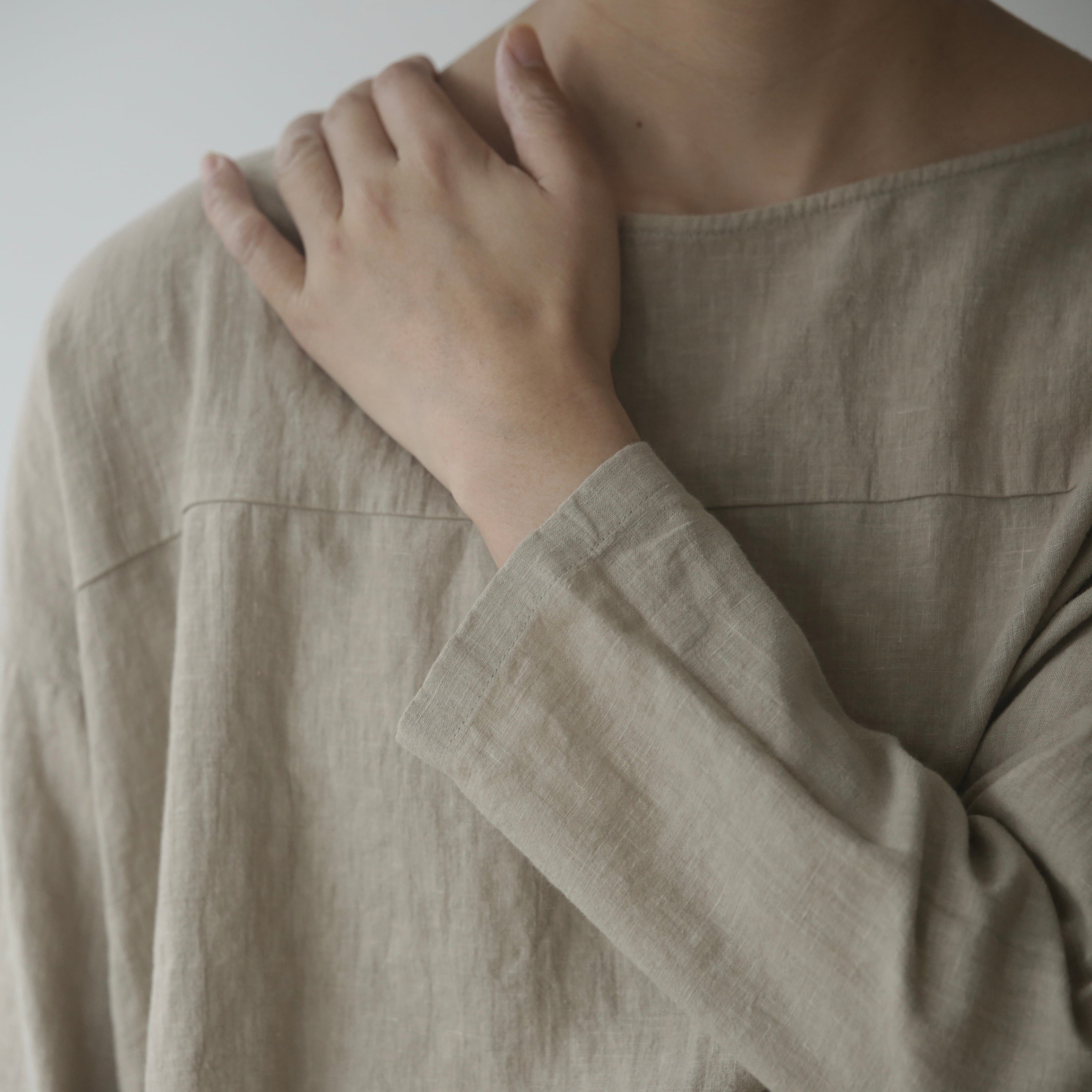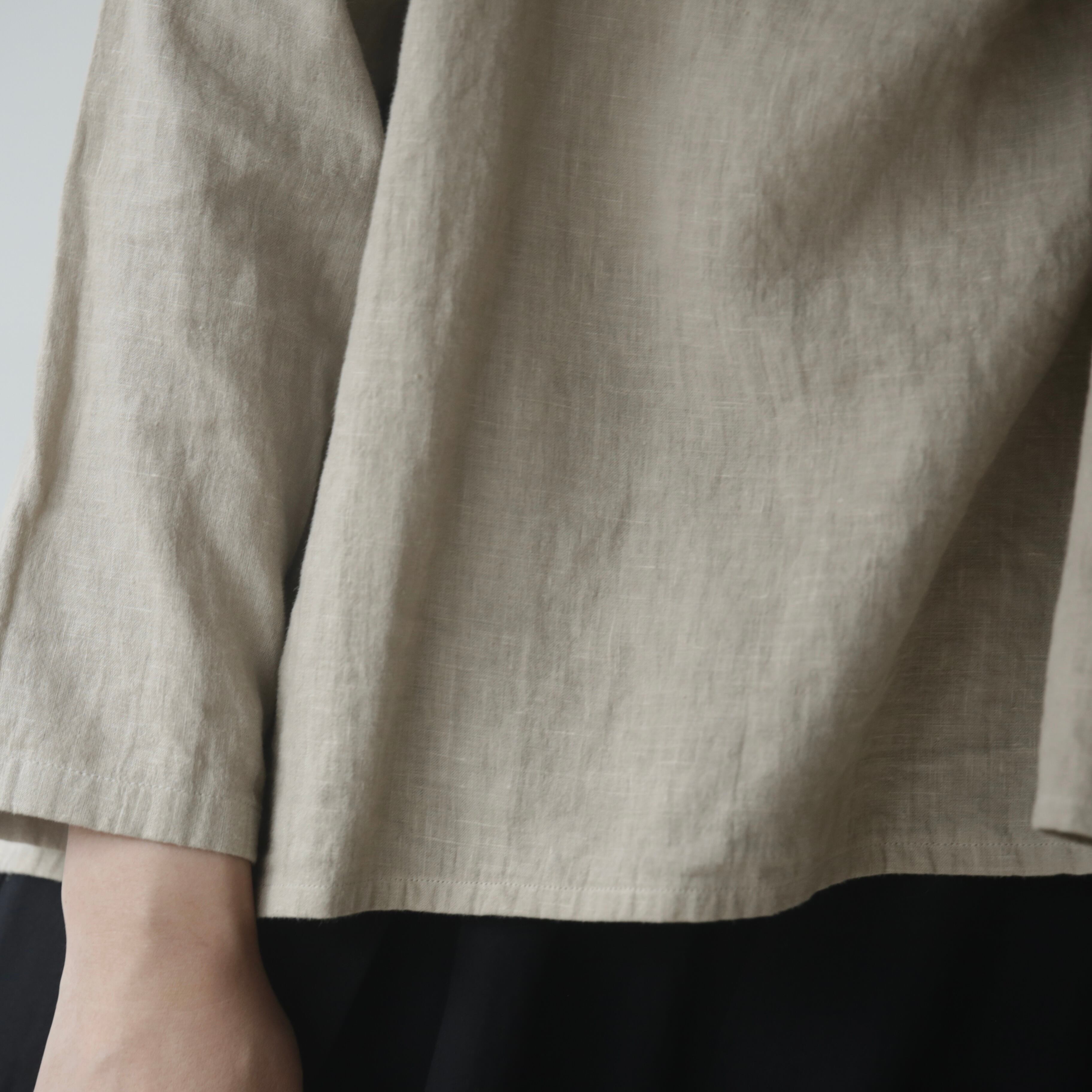 こちらの生地はevamevaでオールシーズン、定番で取り扱いのあるウォーターリネンという生地を使用しています。水撚りという特殊な技法で糸を撚ることで生まれた生地。一般的なリネンよりも繊維が傷みにくく、着るほどにほぐれ、柔らかく、肌へと馴染んでいきます。時間とともに豊かさを増していく風合いが楽しみな一枚です。
